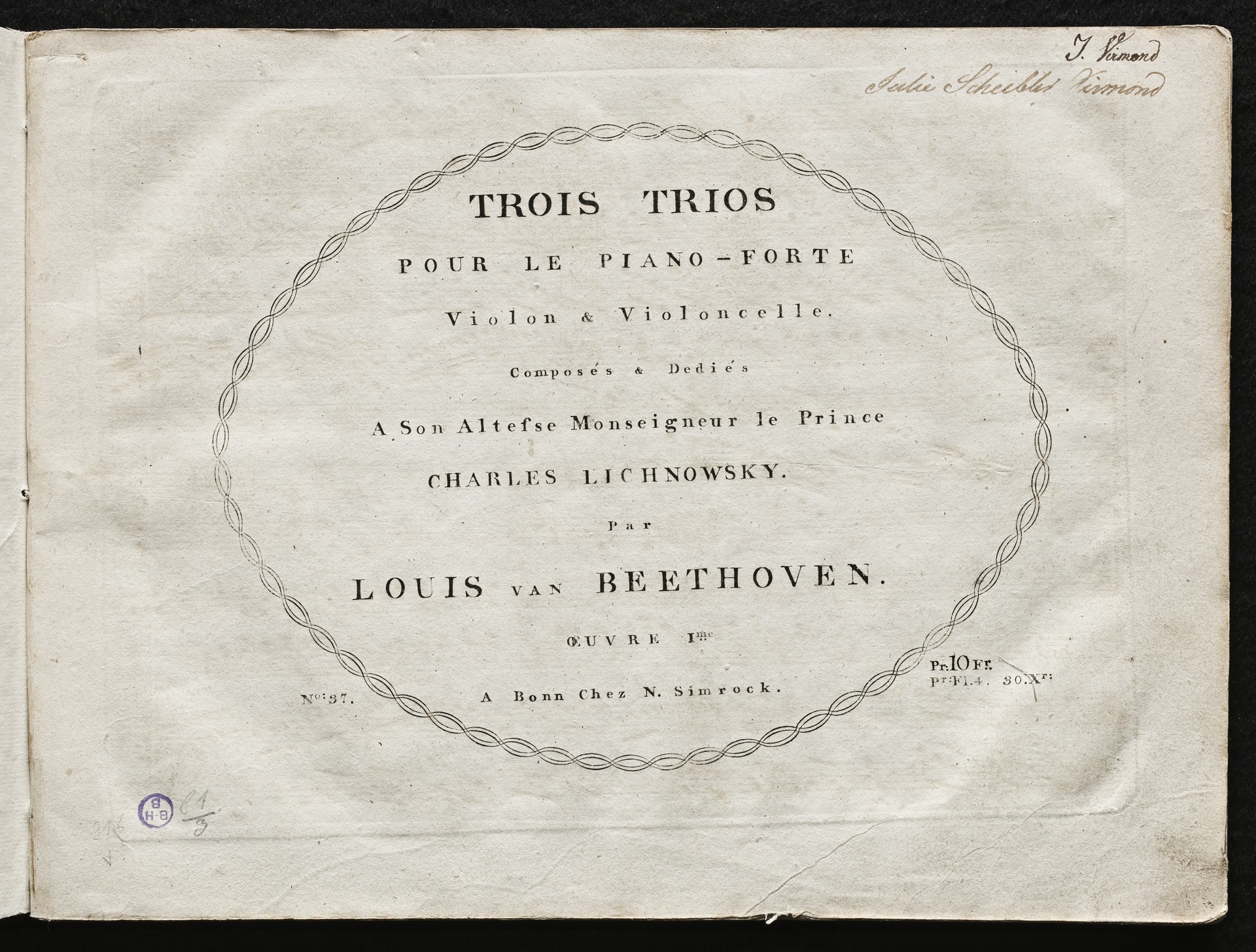 Ludwig van Beethoven, Trios für Klavier, Violine, Violoncello (Es-Dur, G-Dur, c-Moll) op. 1, 1-3, Stimmen, Simrock, 37
