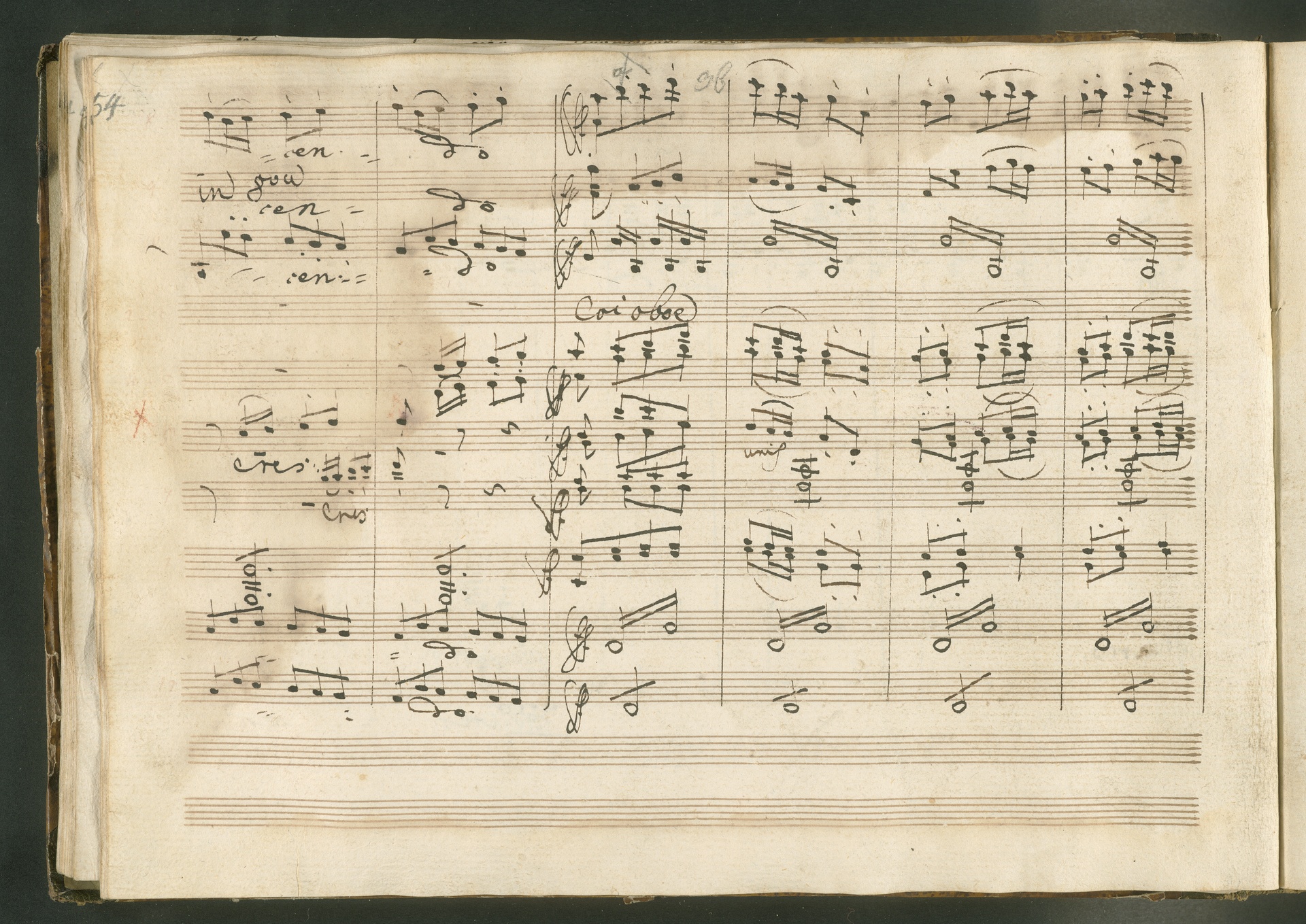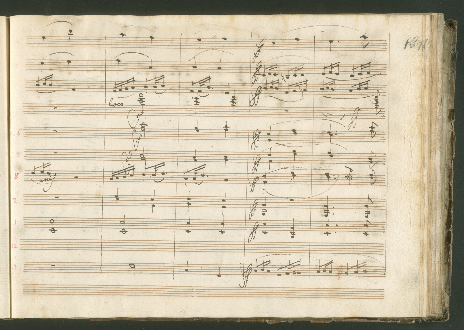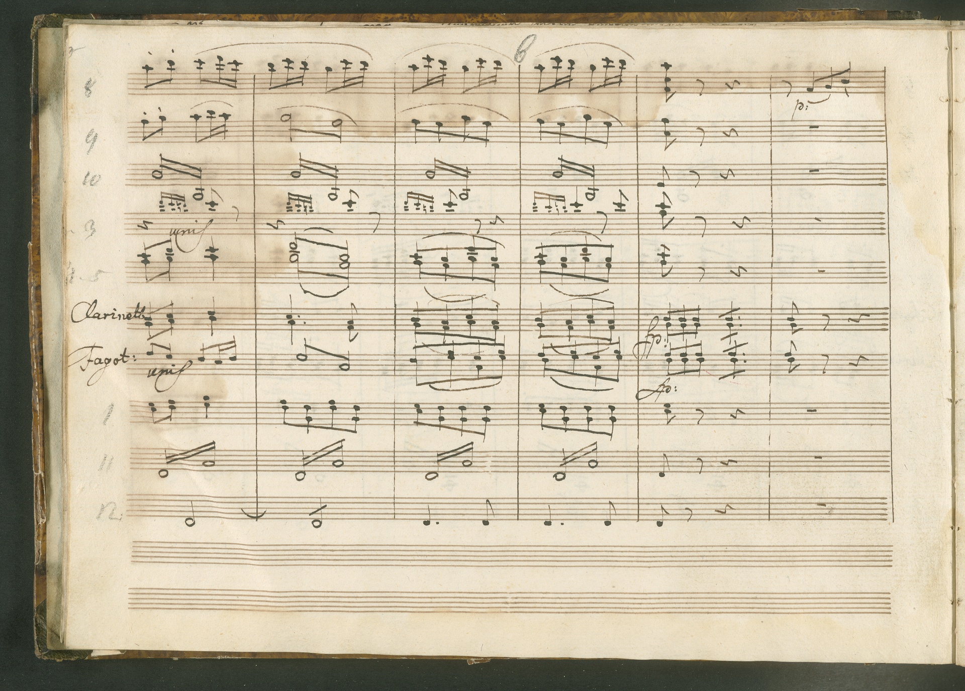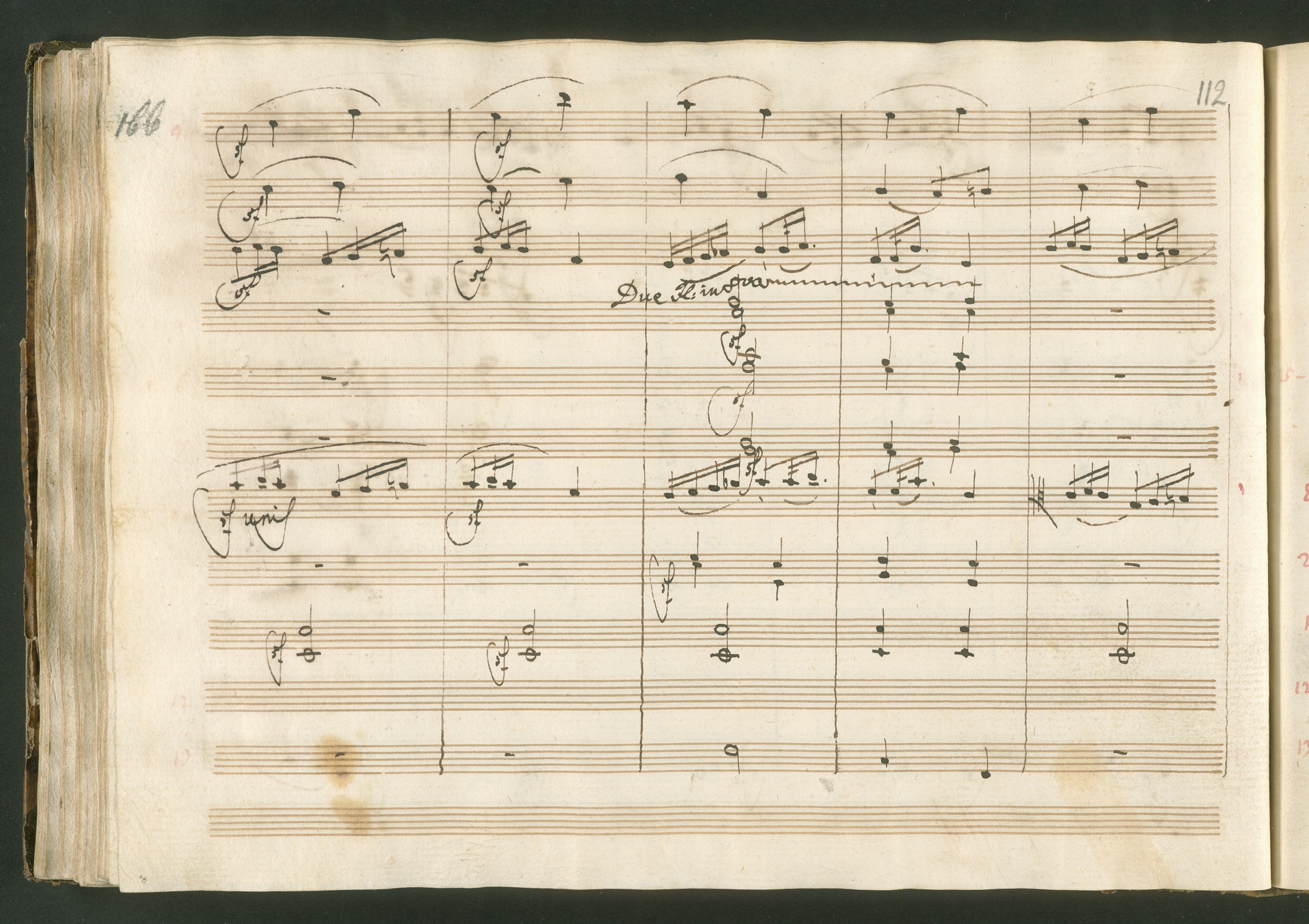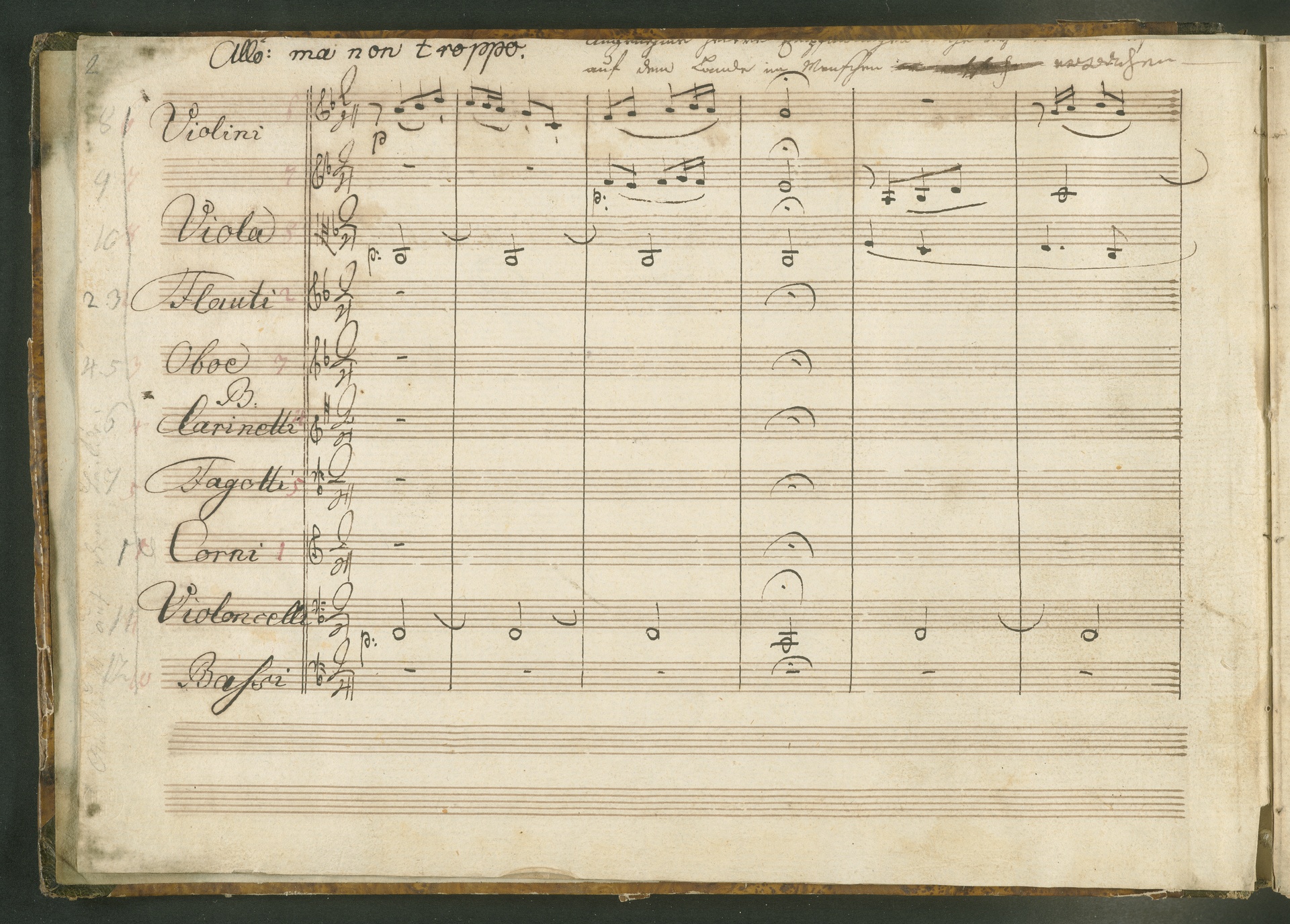 The manuscript shown here is a corrected copy of the Sixth Symphony, the "Pastoral". Beethoven sold the publisher Gottfried Christoph Härtel his Fifth and Sixth Symphonies (op. 67 und 68) in September 1808 on his visit to Vienna. The surviving correspondence shows that Beethoven did not give Härtel autograph scores but corrected copies as engraver's models for the original edition