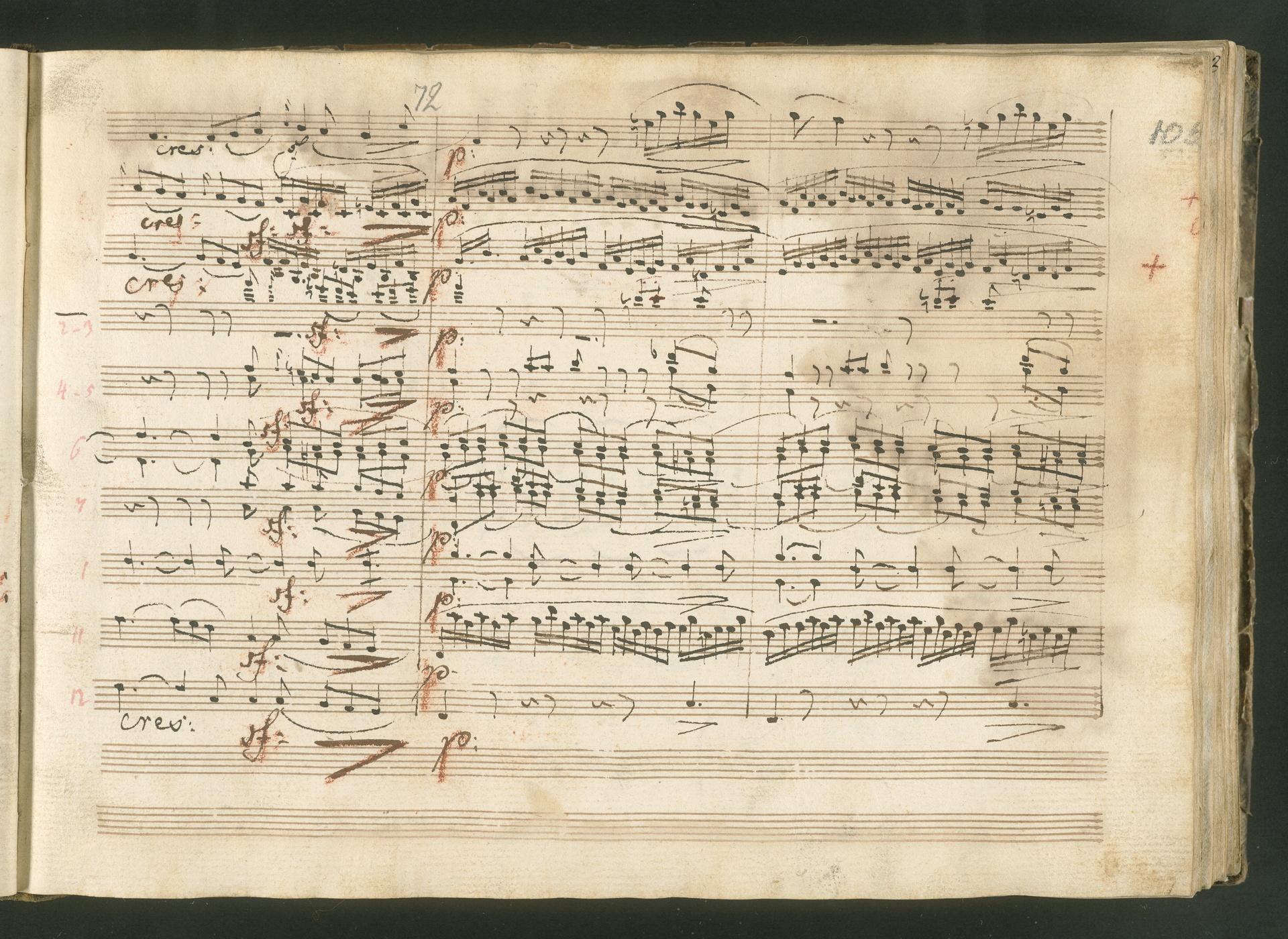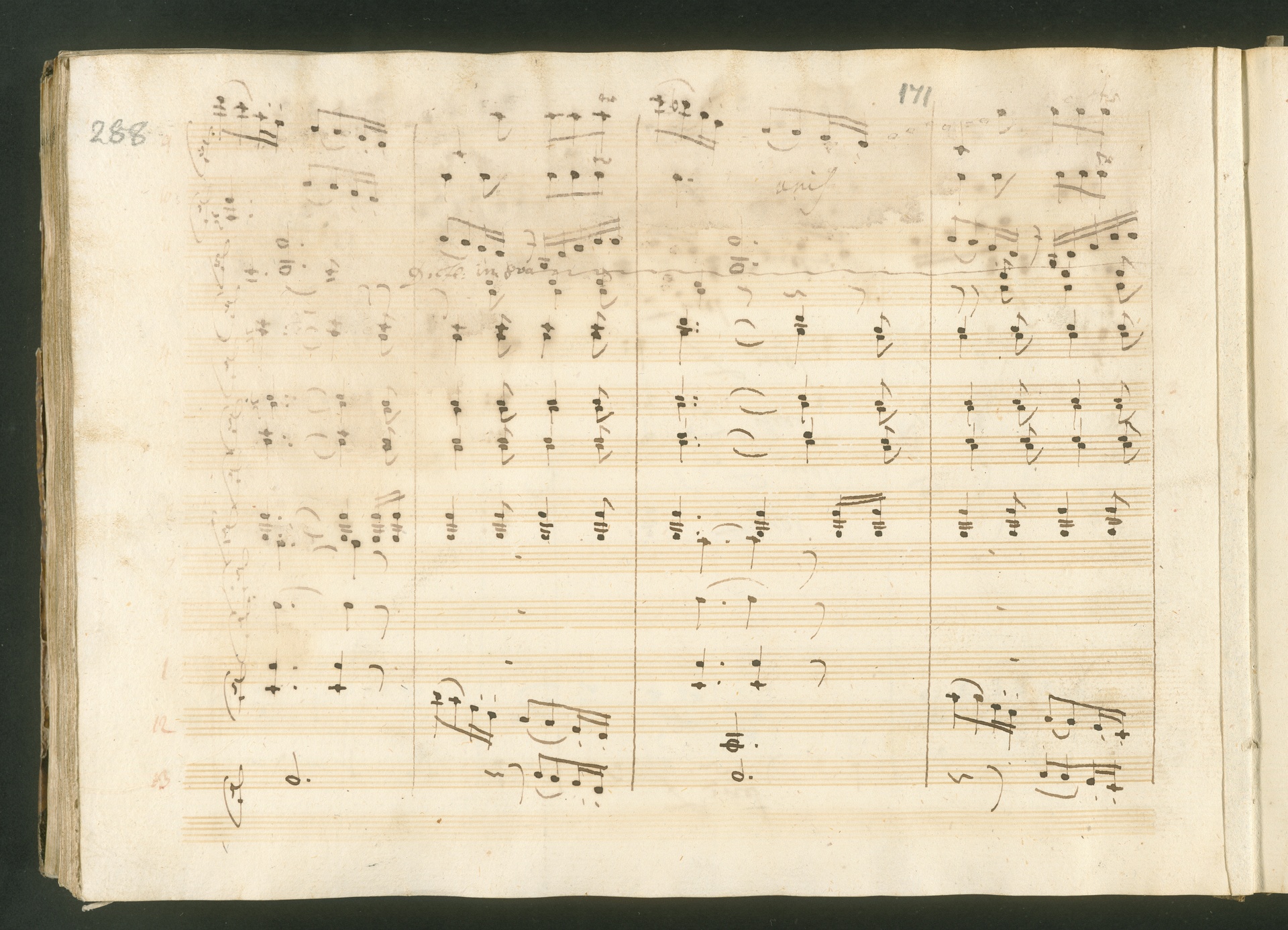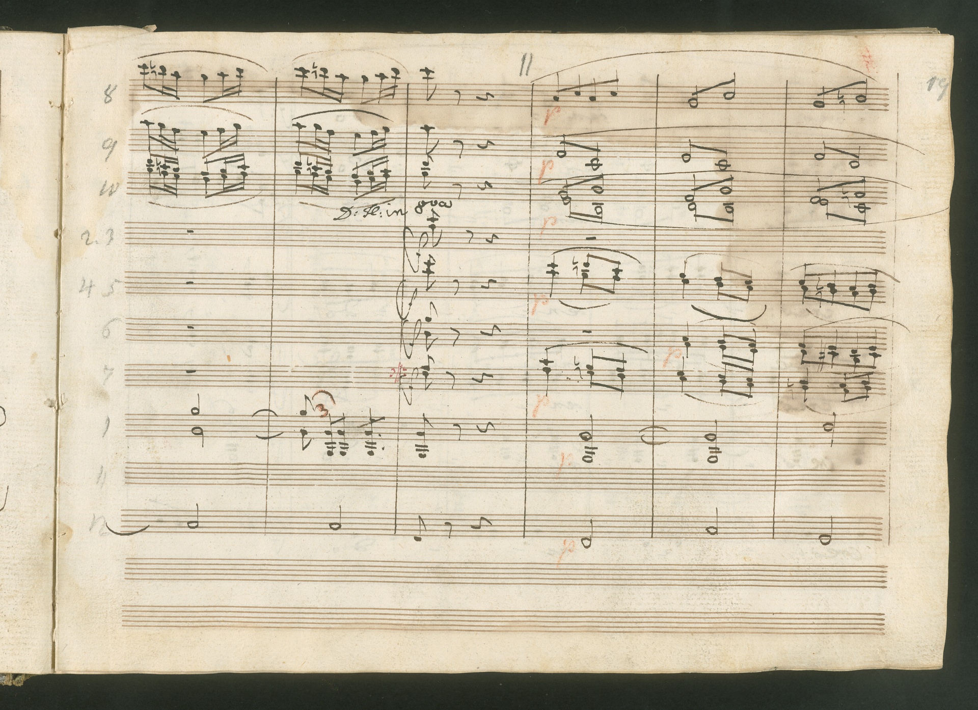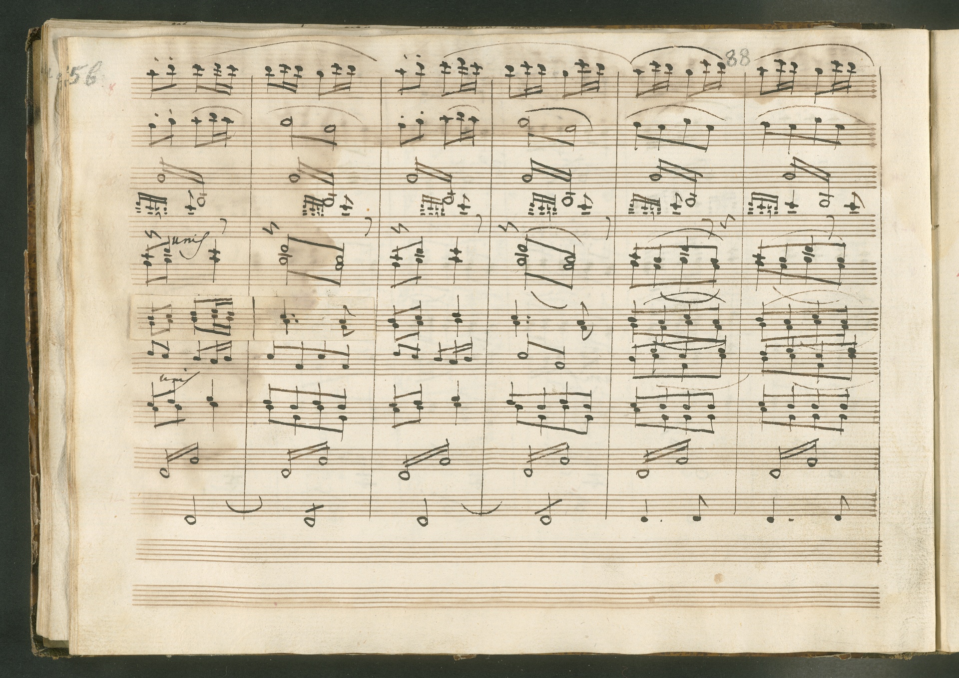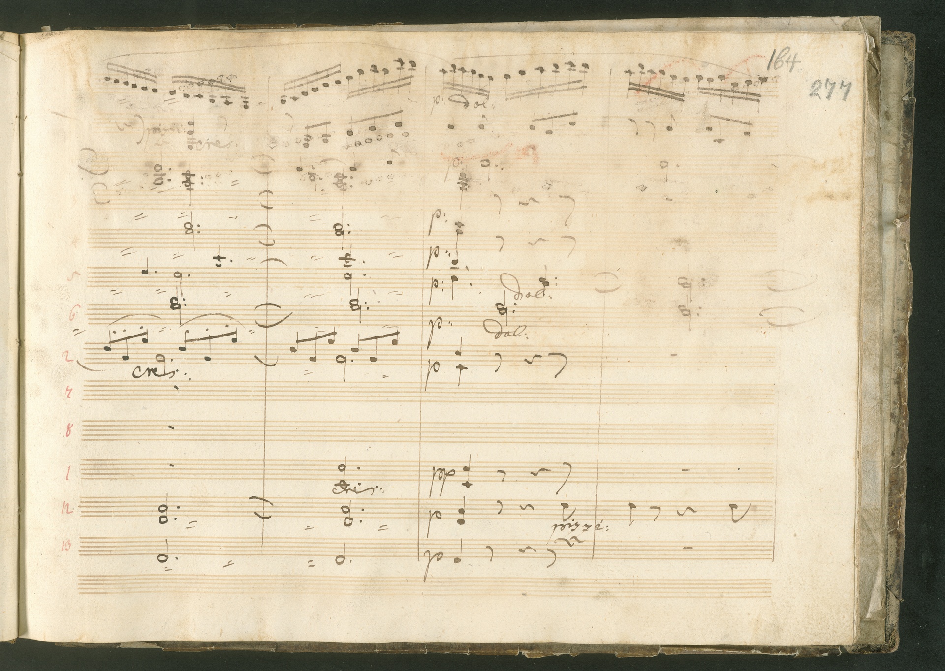 The manuscript shown here is a corrected copy of the Sixth Symphony, the "Pastoral". Beethoven sold the publisher Gottfried Christoph Härtel his Fifth and Sixth Symphonies (op. 67 und 68) in September 1808 on his visit to Vienna. The surviving correspondence shows that Beethoven did not give Härtel autograph scores but corrected copies as engraver's models for the original edition