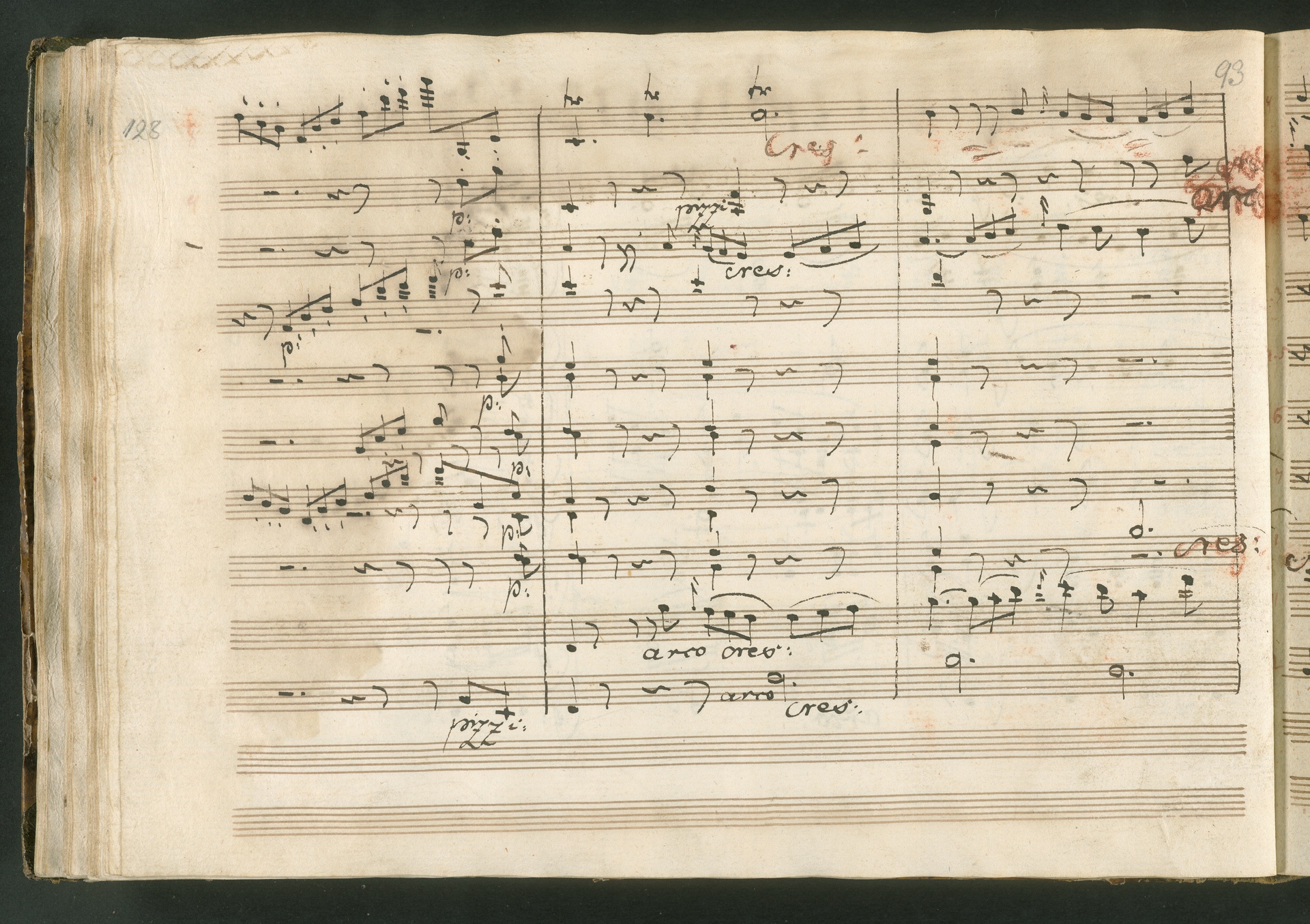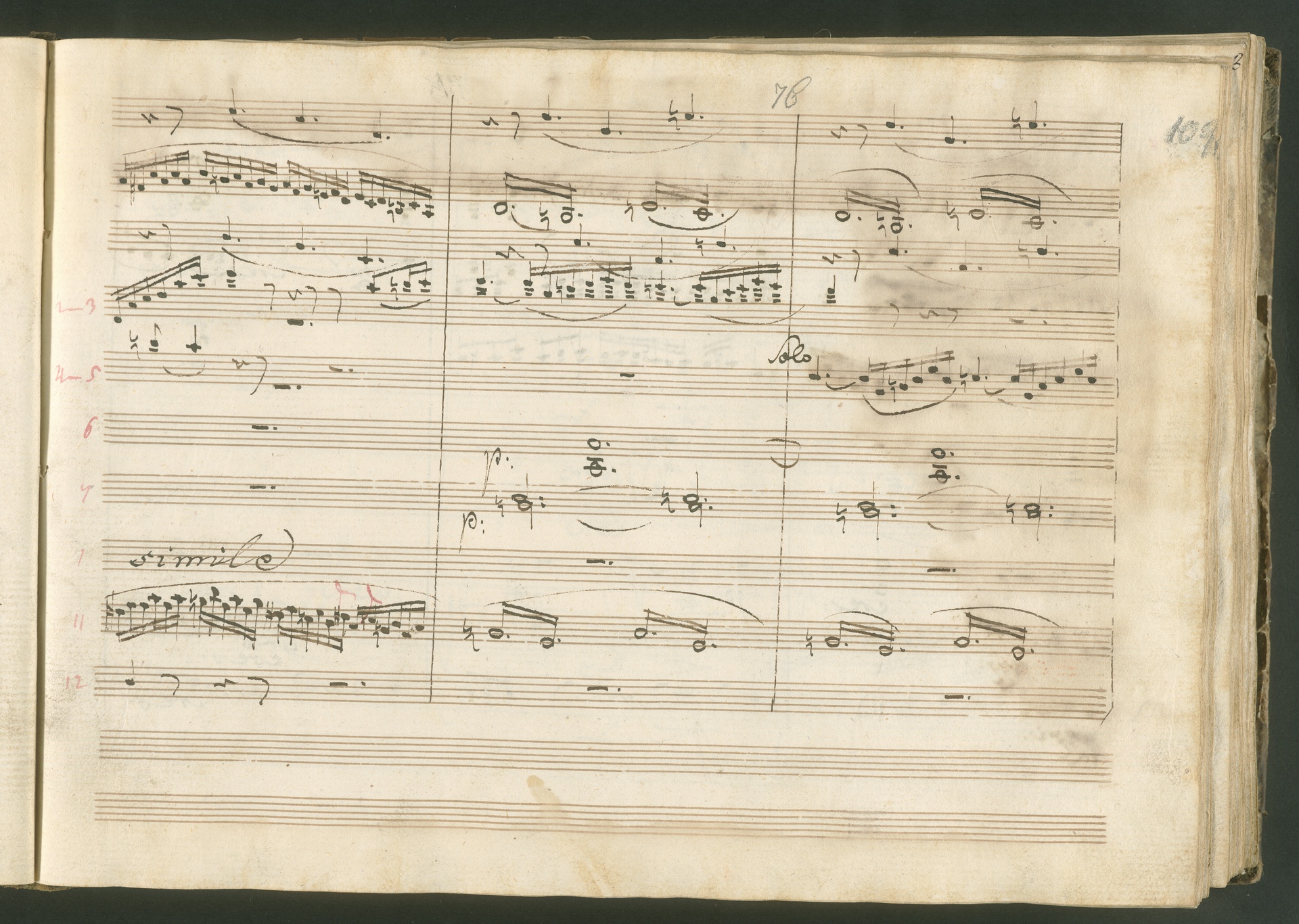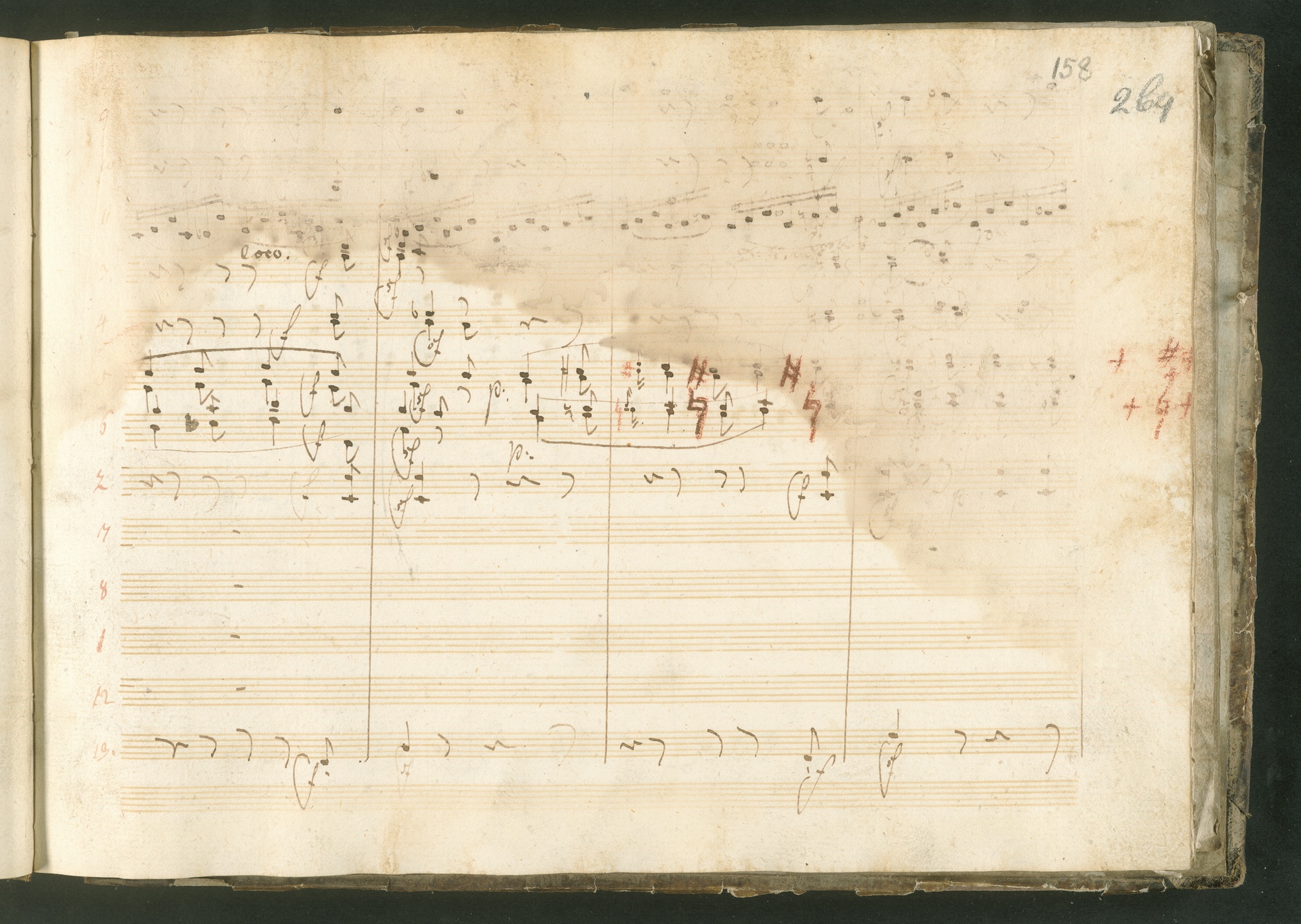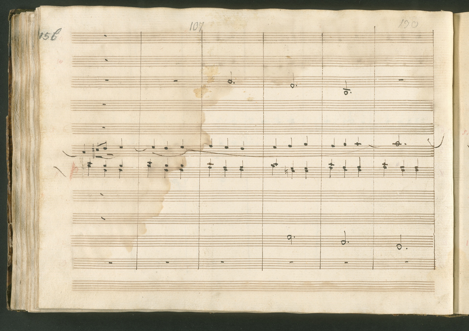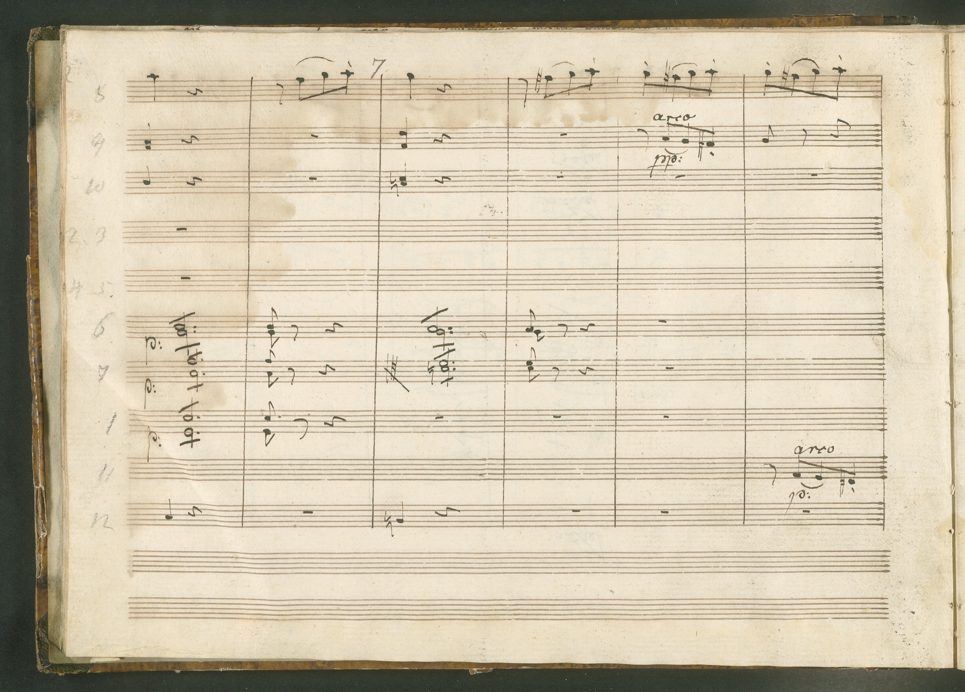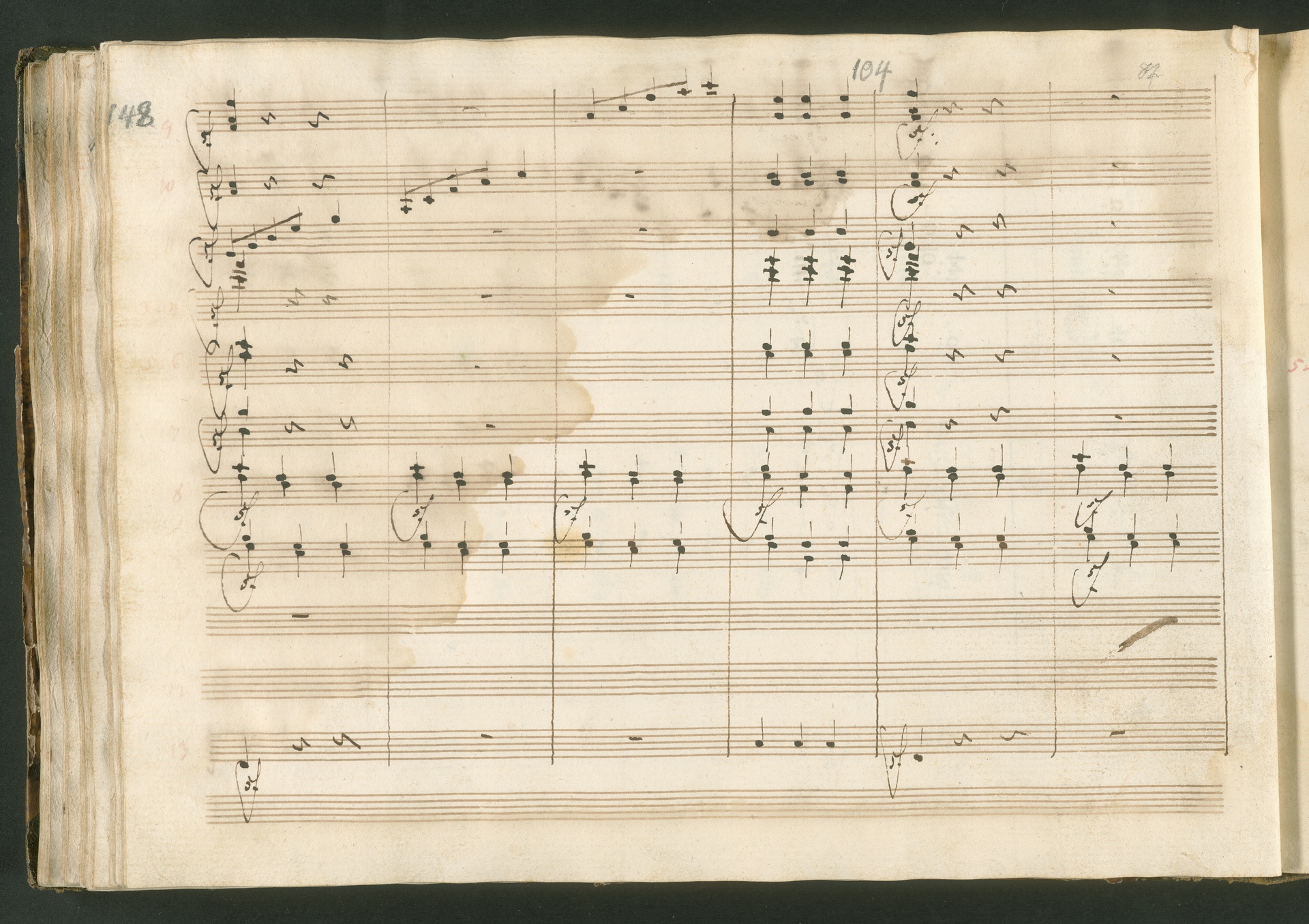 The manuscript shown here is a corrected copy of the Sixth Symphony, the "Pastoral". Beethoven sold the publisher Gottfried Christoph Härtel his Fifth and Sixth Symphonies (op. 67 und 68) in September 1808 on his visit to Vienna. The surviving correspondence shows that Beethoven did not give Härtel autograph scores but corrected copies as engraver's models for the original edition