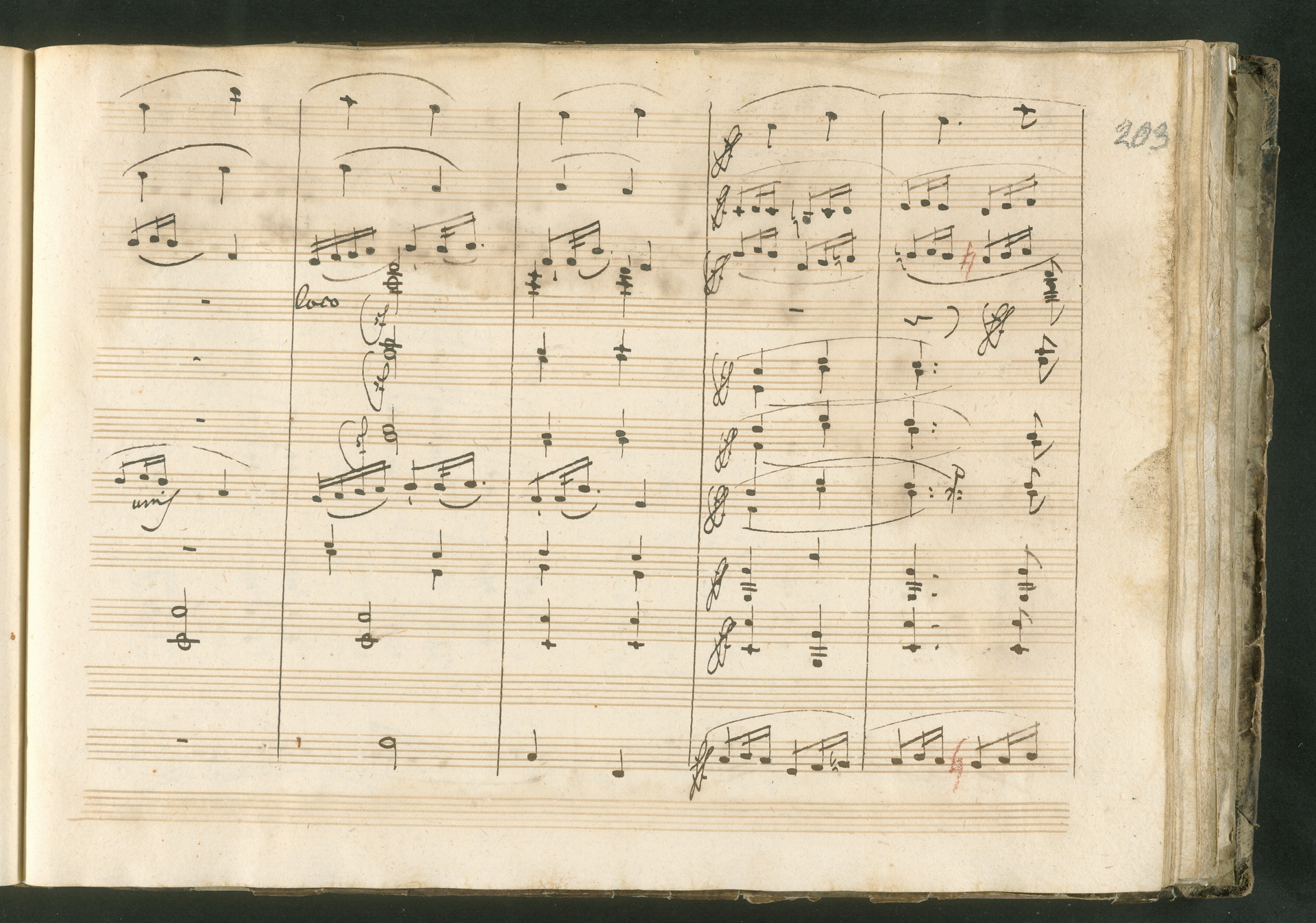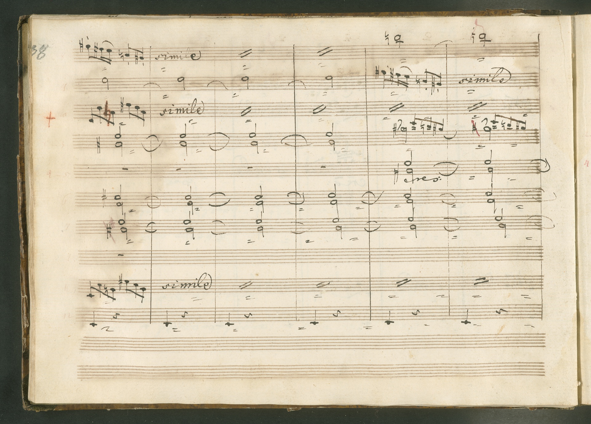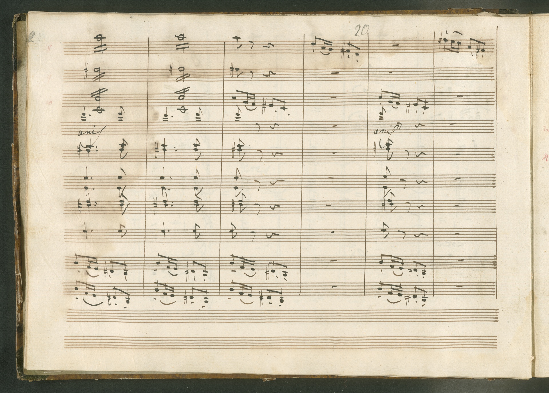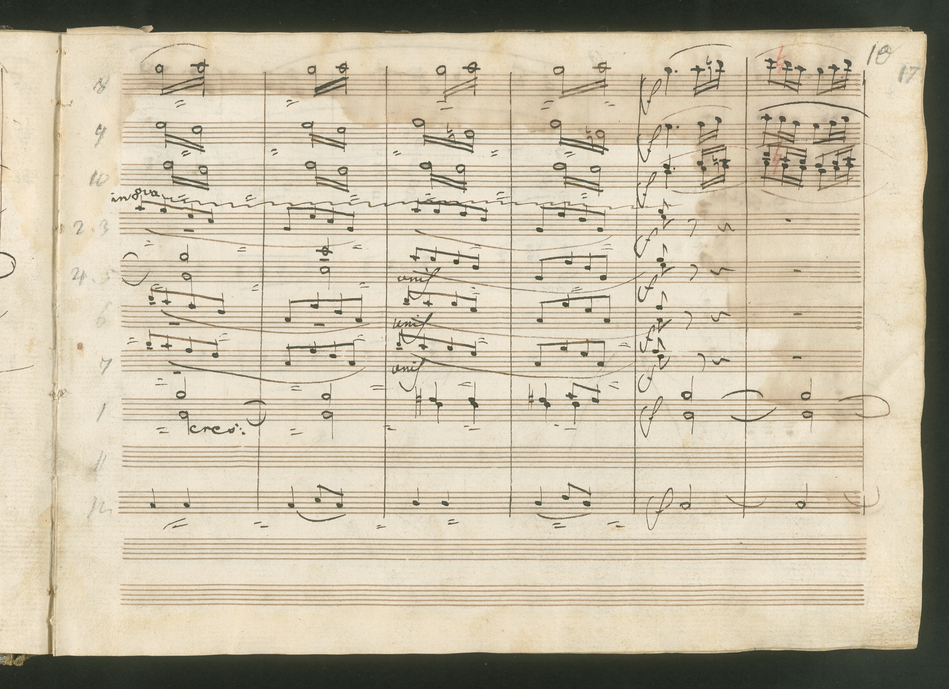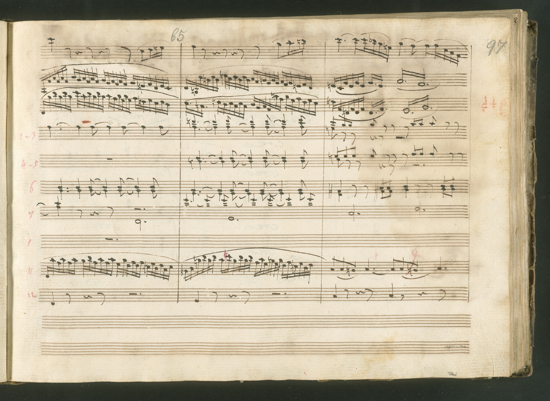 The manuscript shown here is a corrected copy of the Sixth Symphony, the "Pastoral". Beethoven sold the publisher Gottfried Christoph Härtel his Fifth and Sixth Symphonies (op. 67 und 68) in September 1808 on his visit to Vienna. The surviving correspondence shows that Beethoven did not give Härtel autograph scores but corrected copies as engraver's models for the original edition
