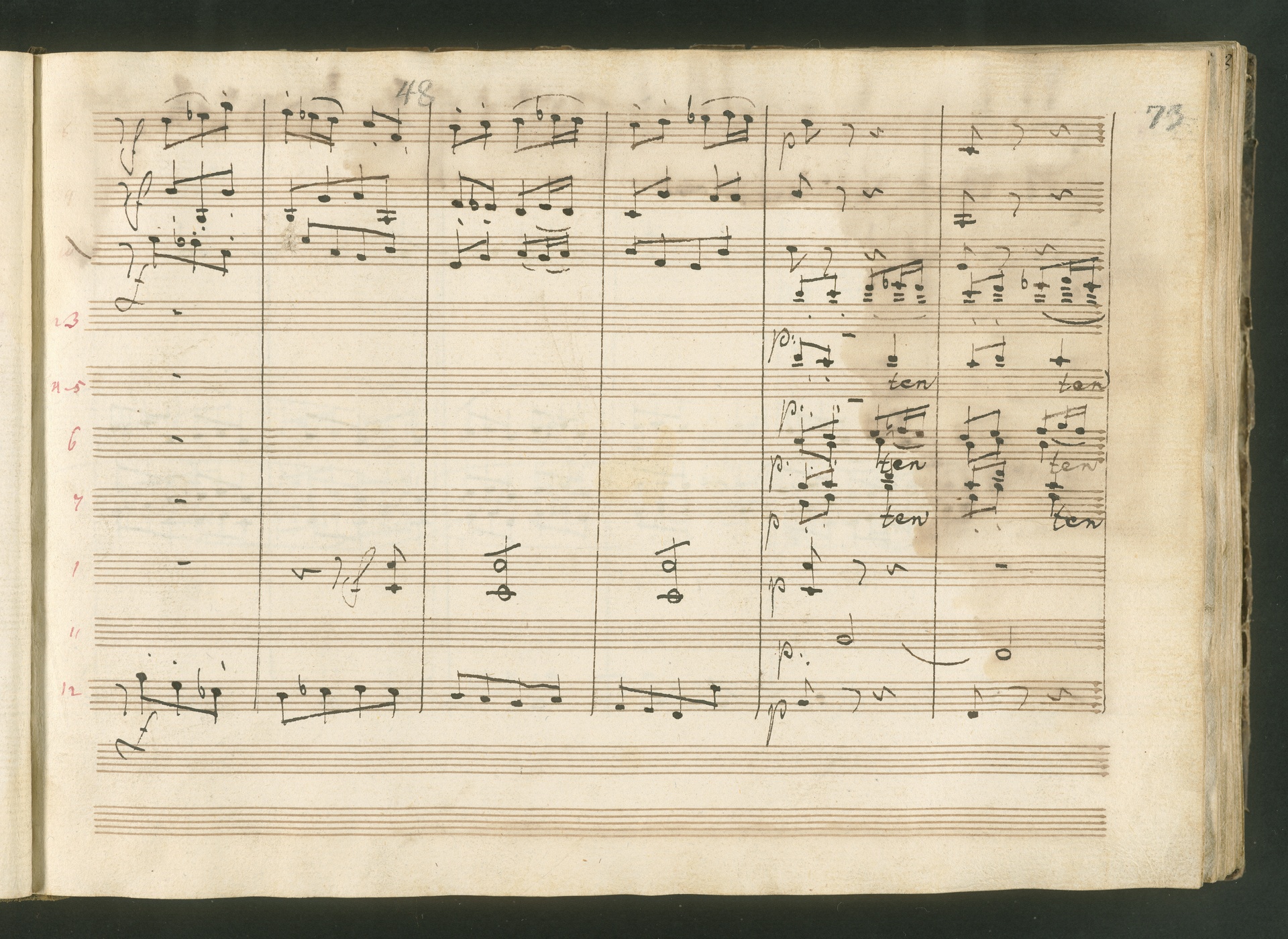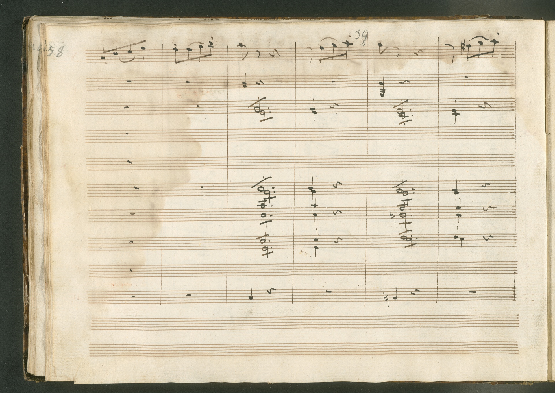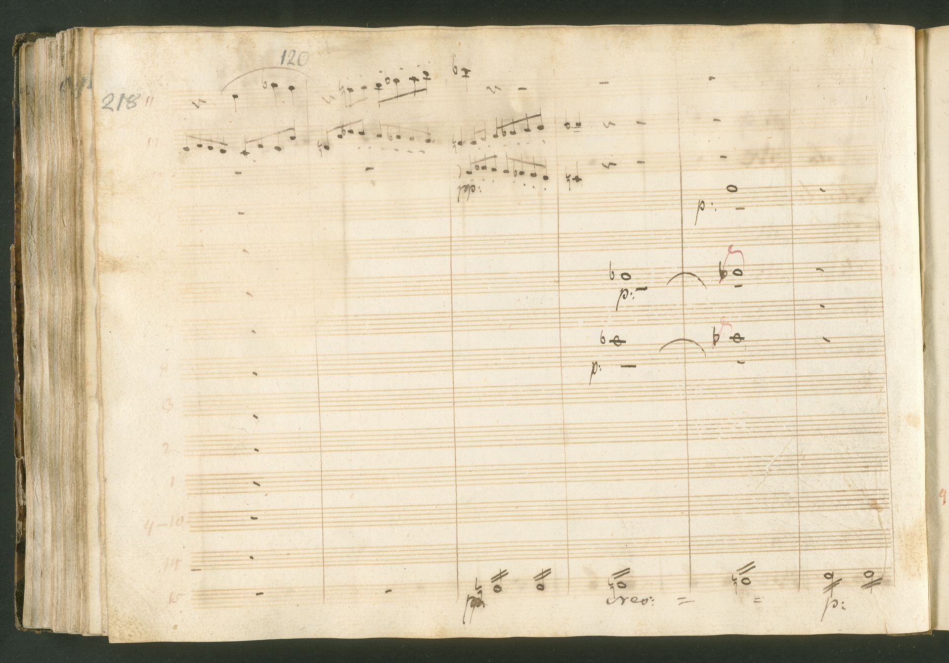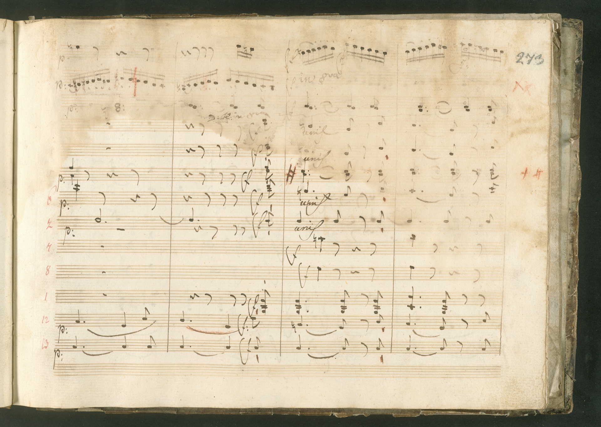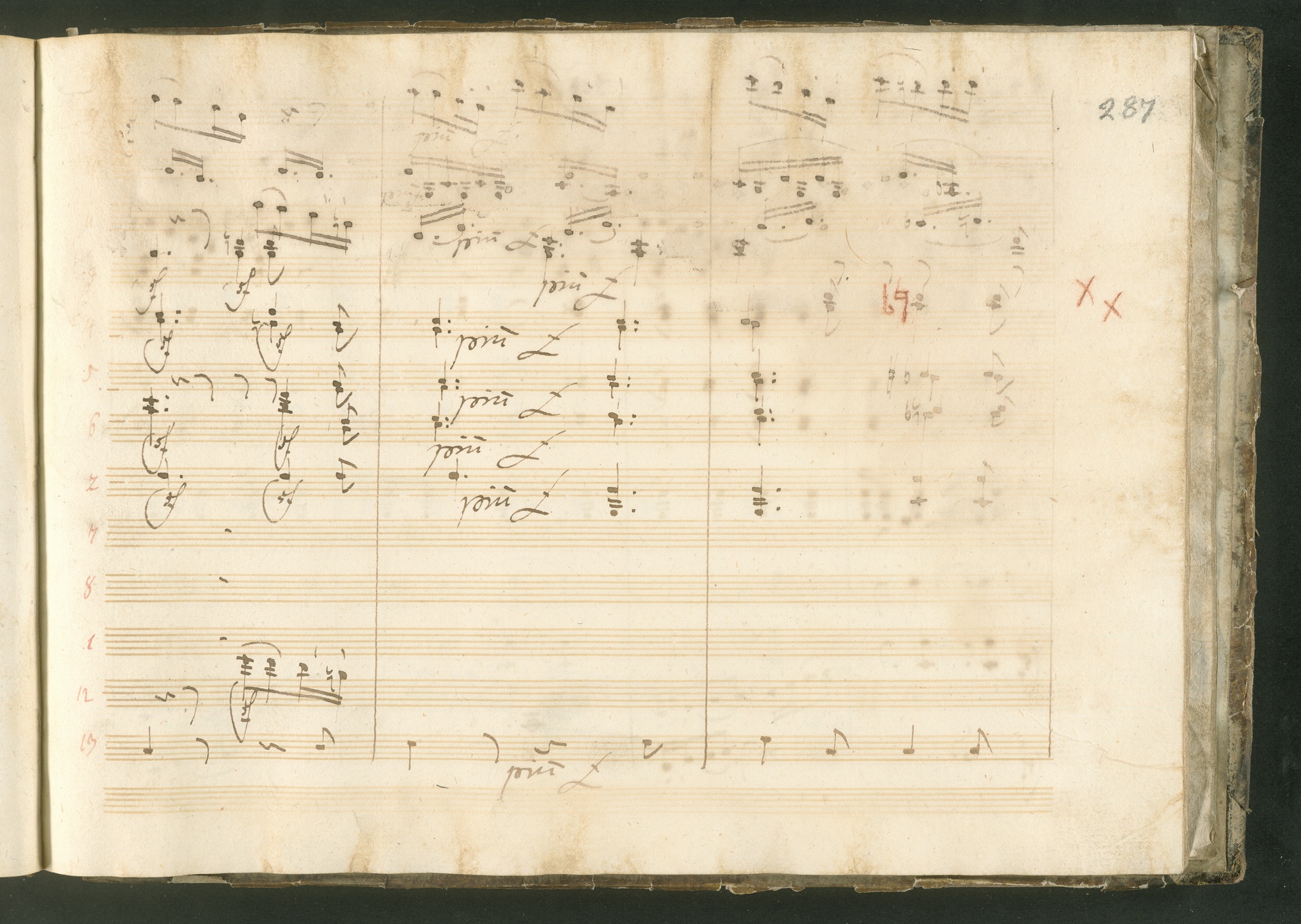 The manuscript shown here is a corrected copy of the Sixth Symphony, the "Pastoral". Beethoven sold the publisher Gottfried Christoph Härtel his Fifth and Sixth Symphonies (op. 67 und 68) in September 1808 on his visit to Vienna. The surviving correspondence shows that Beethoven did not give Härtel autograph scores but corrected copies as engraver's models for the original edition