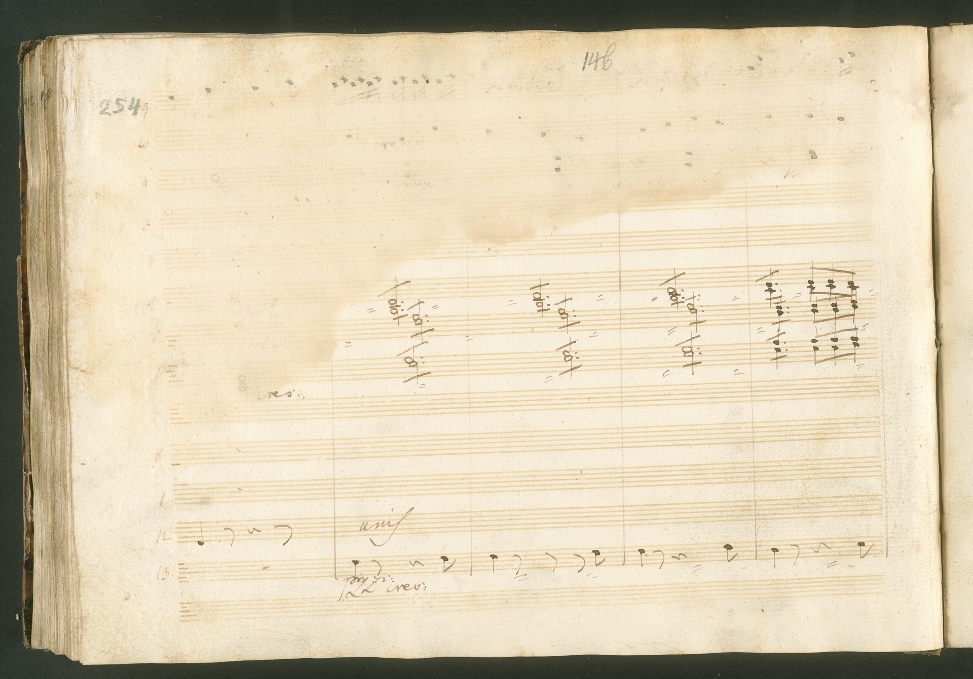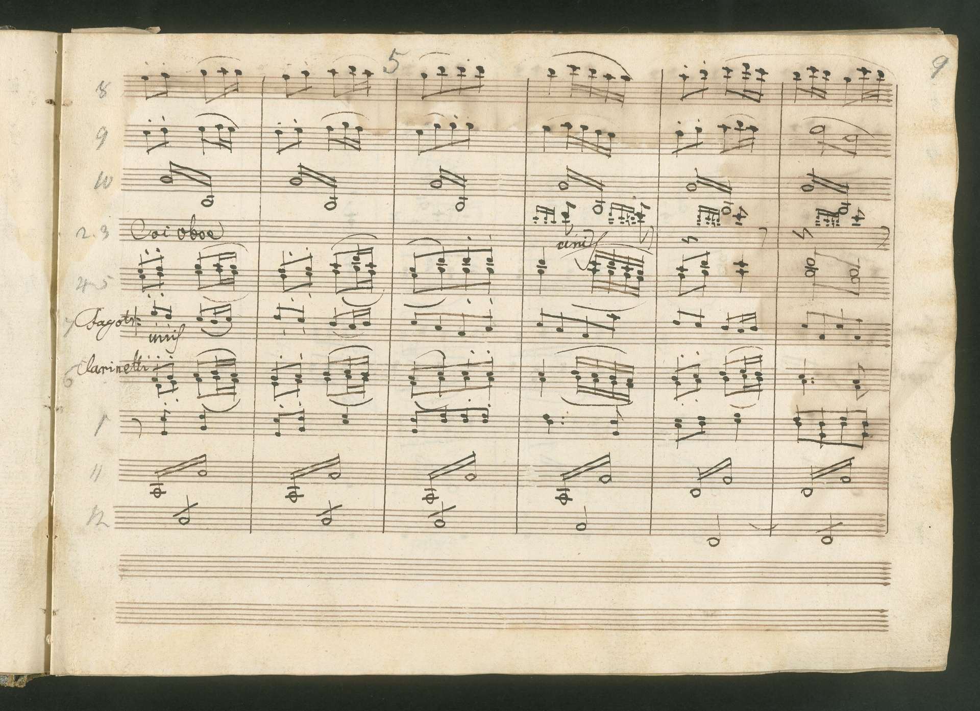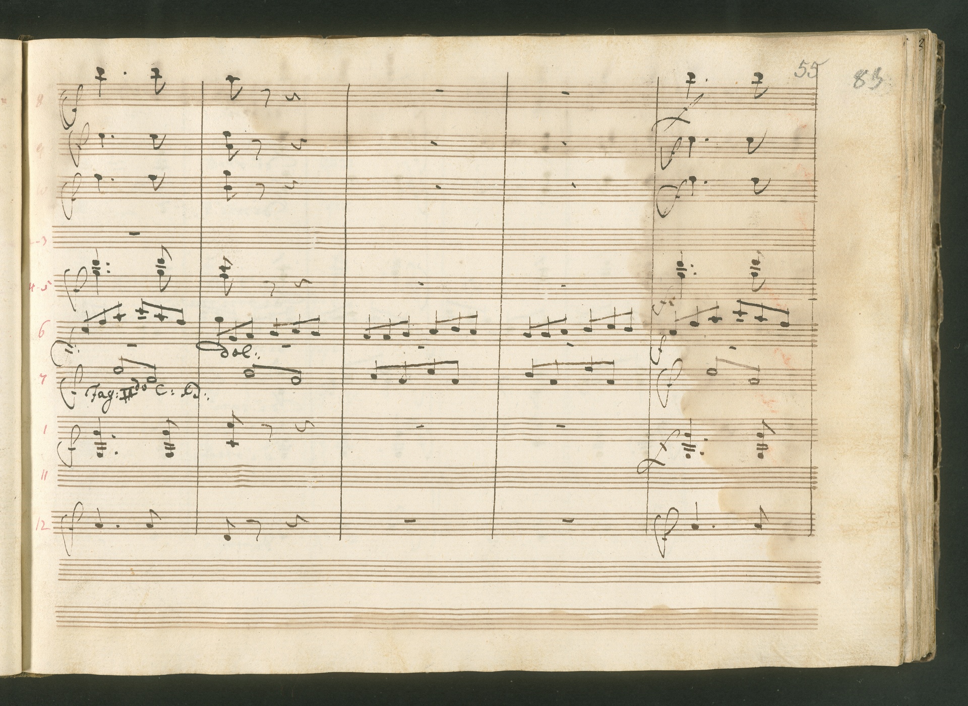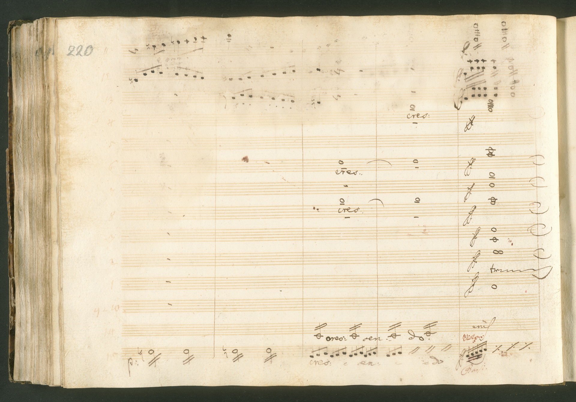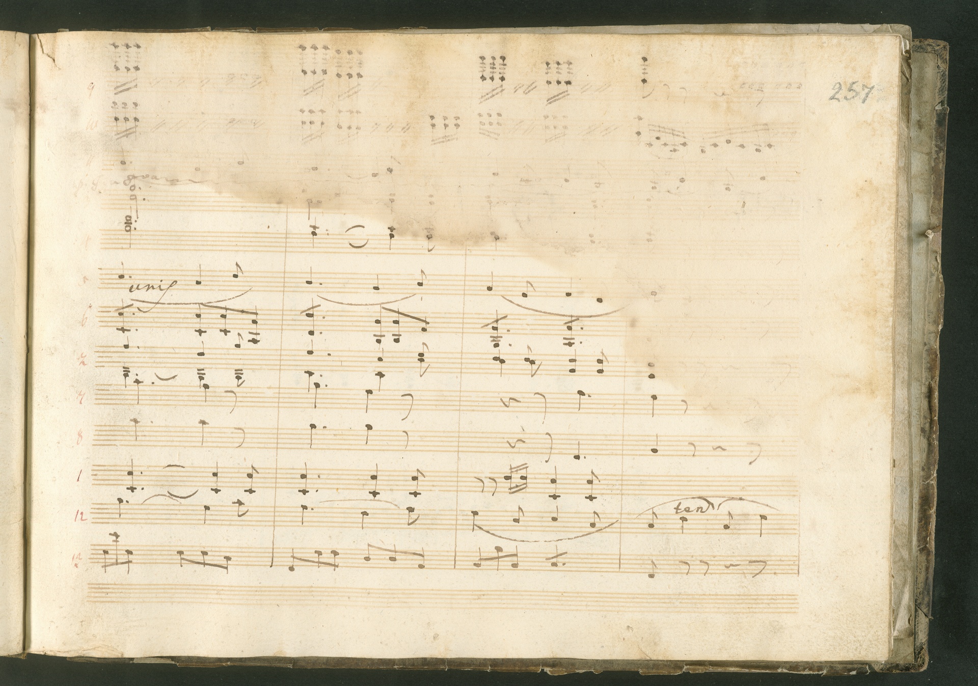 The manuscript shown here is a corrected copy of the Sixth Symphony, the "Pastoral". Beethoven sold the publisher Gottfried Christoph Härtel his Fifth and Sixth Symphonies (op. 67 und 68) in September 1808 on his visit to Vienna. The surviving correspondence shows that Beethoven did not give Härtel autograph scores but corrected copies as engraver's models for the original edition