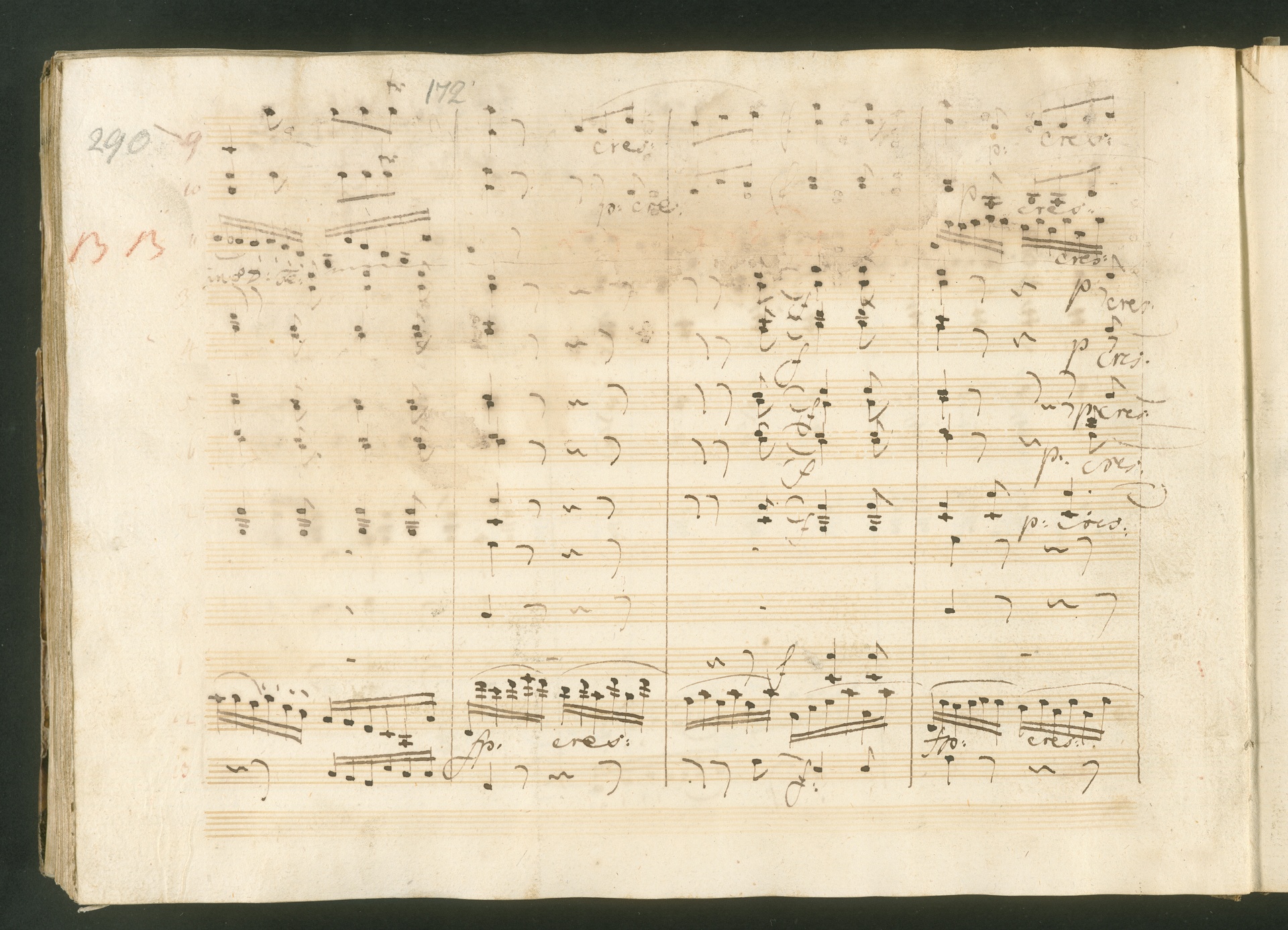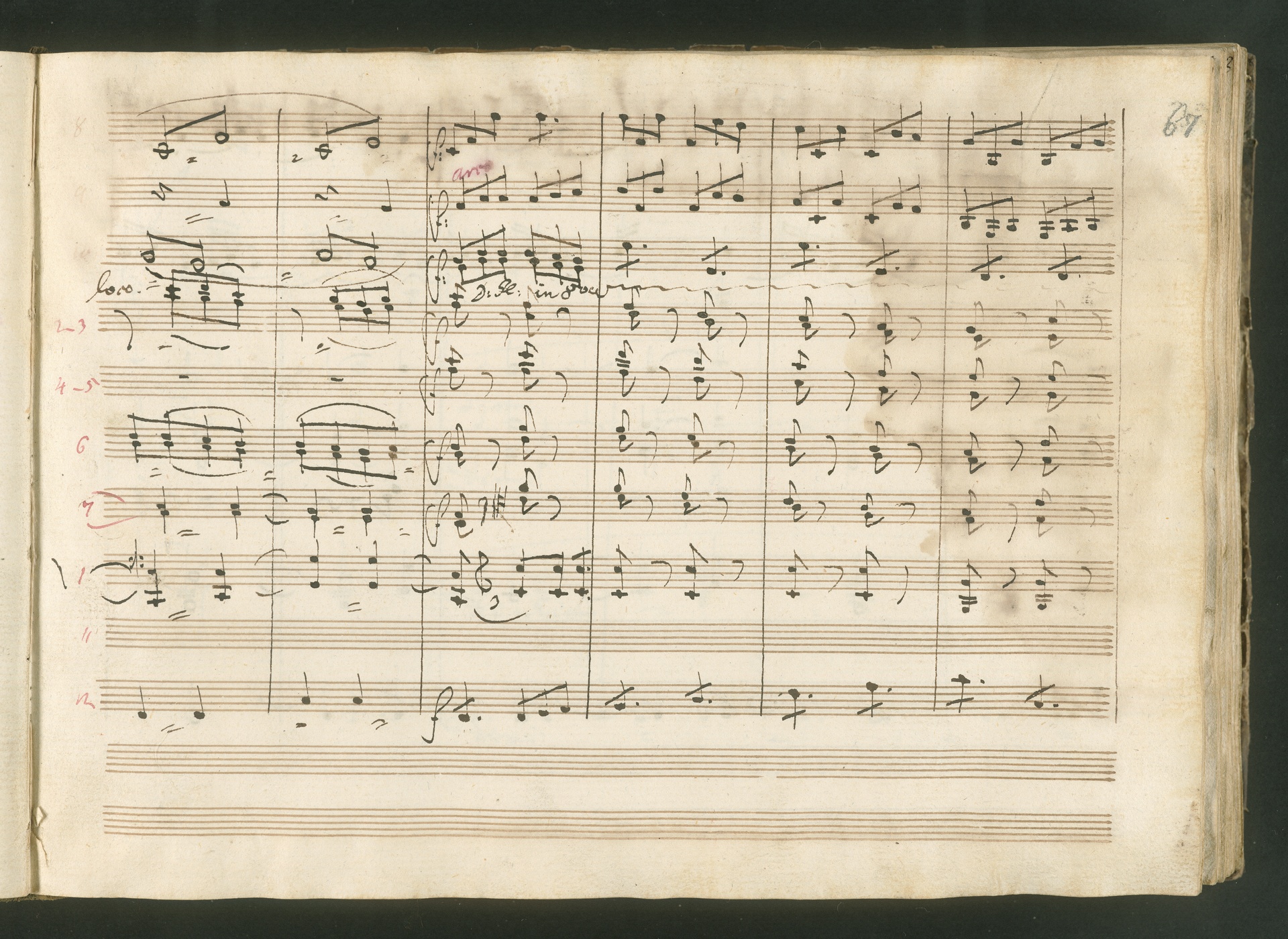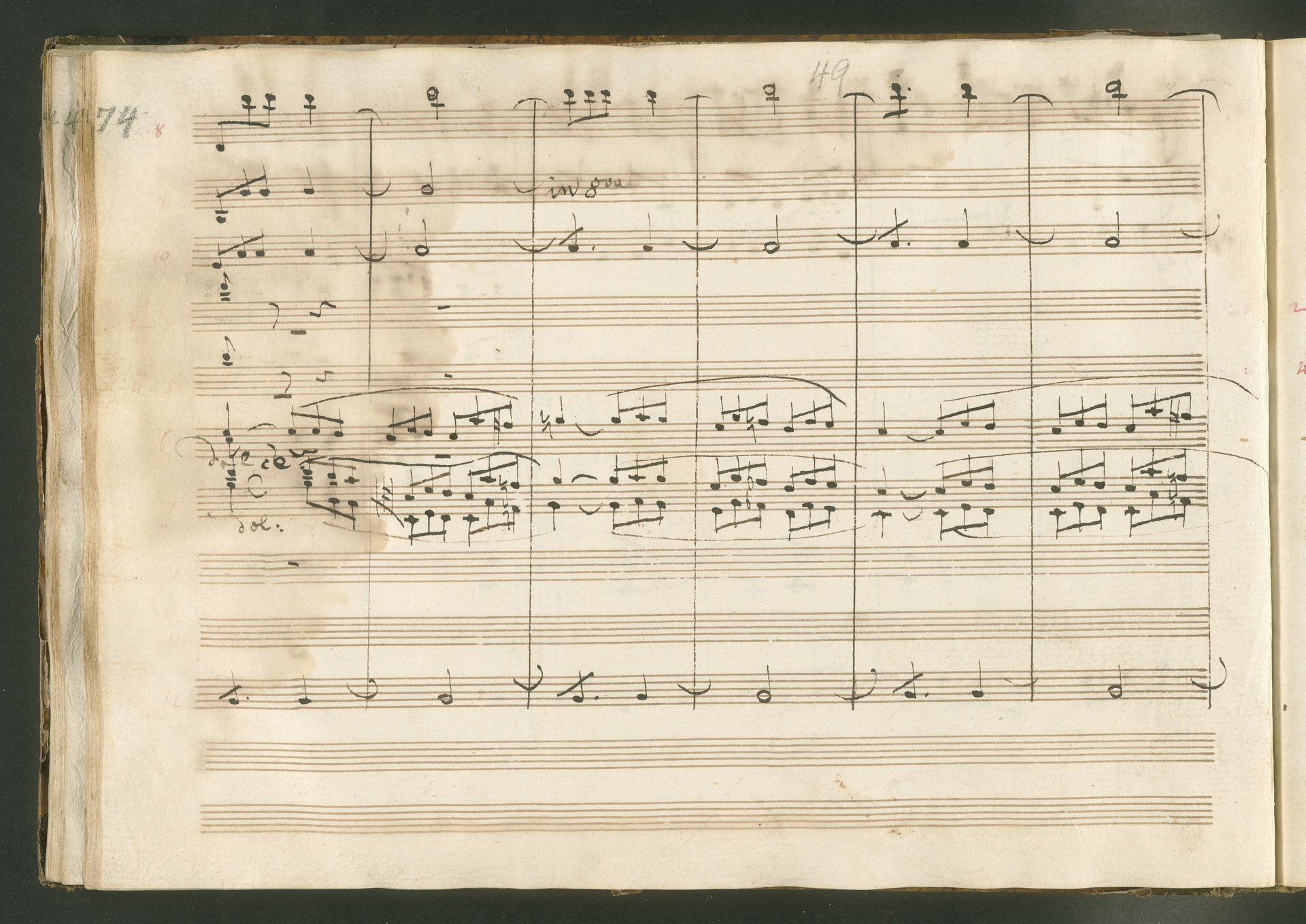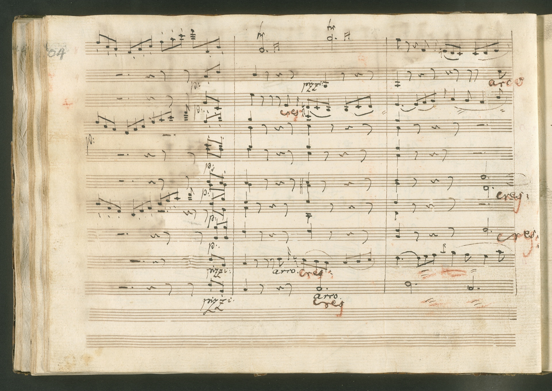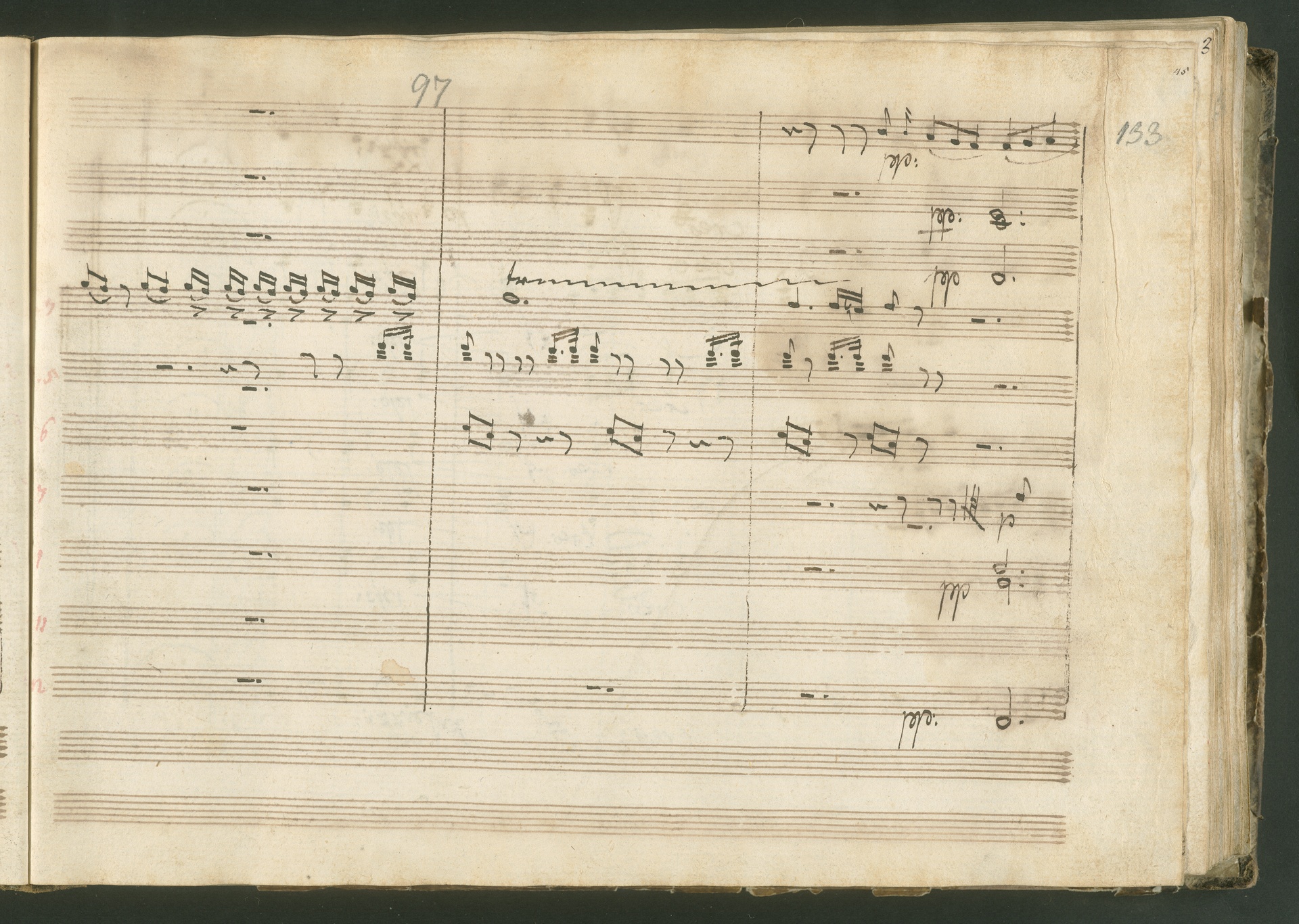 The manuscript shown here is a corrected copy of the Sixth Symphony, the "Pastoral". Beethoven sold the publisher Gottfried Christoph Härtel his Fifth and Sixth Symphonies (op. 67 und 68) in September 1808 on his visit to Vienna. The surviving correspondence shows that Beethoven did not give Härtel autograph scores but corrected copies as engraver's models for the original edition
