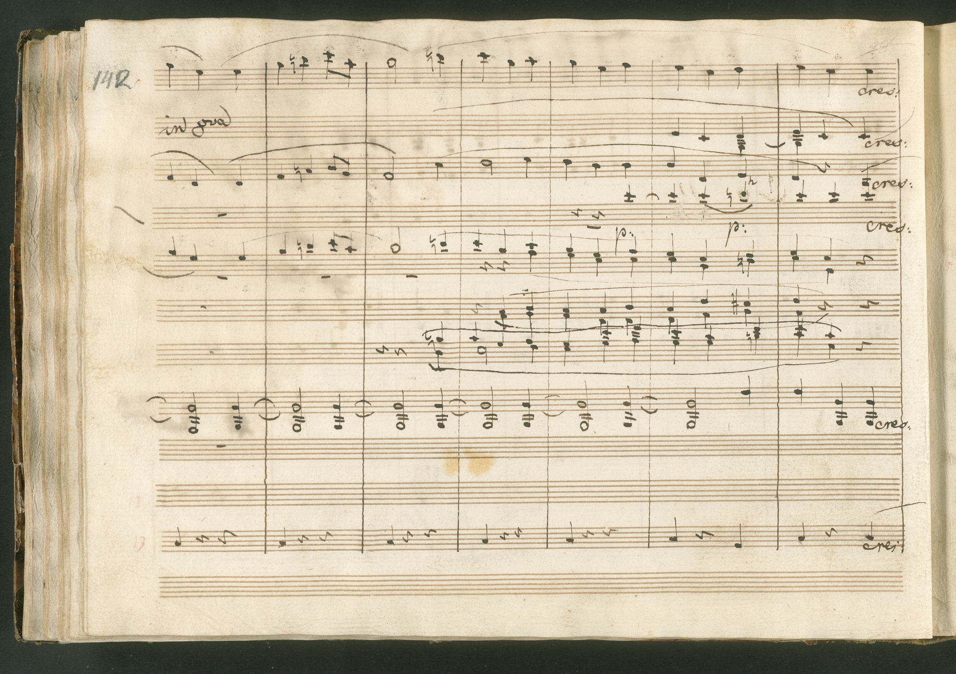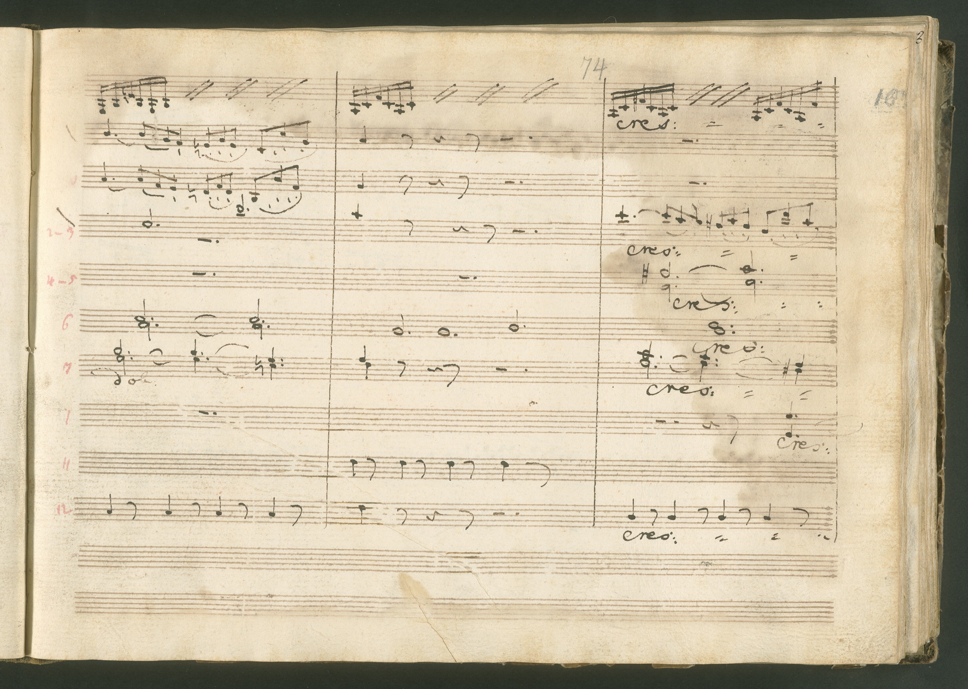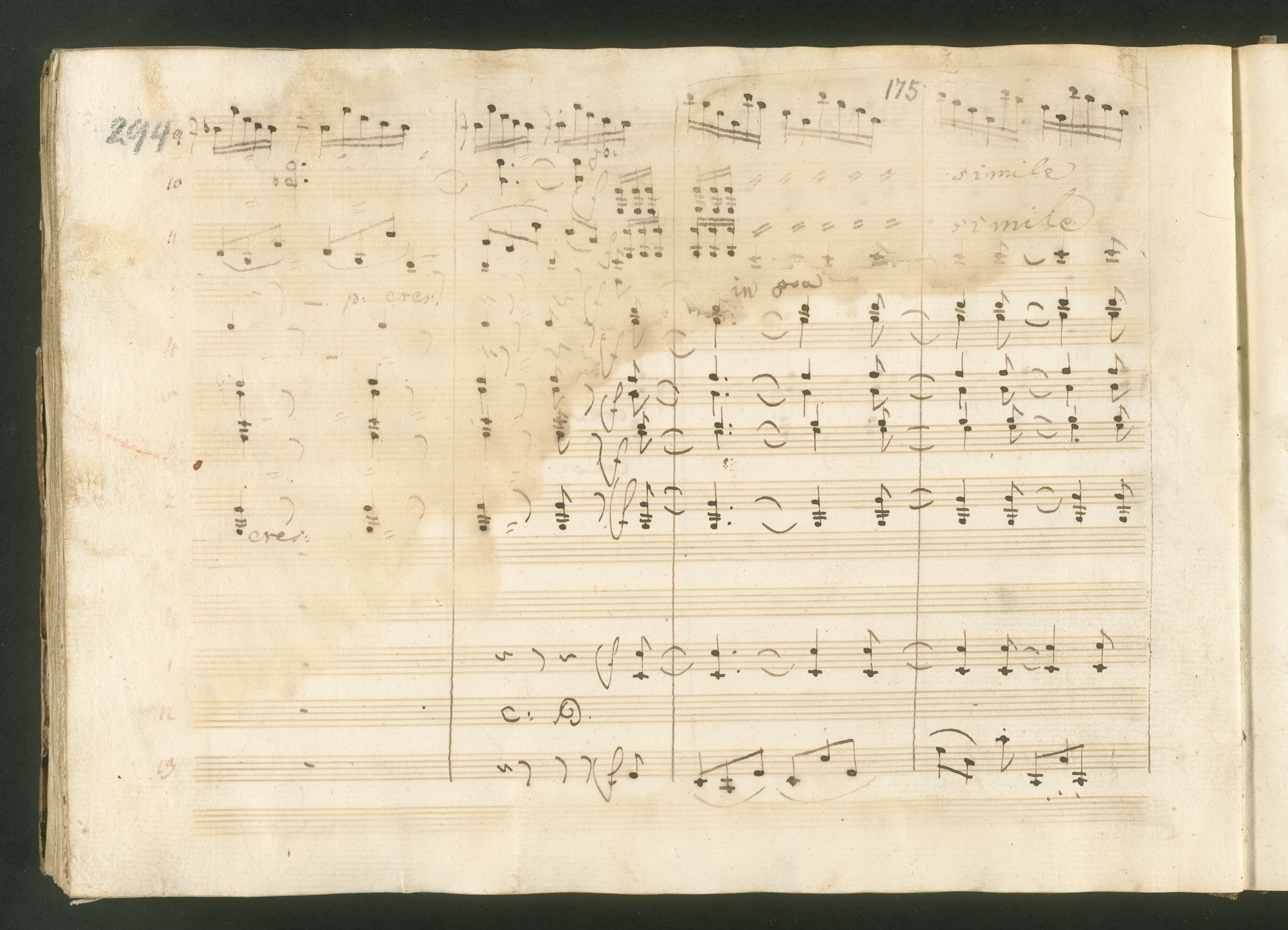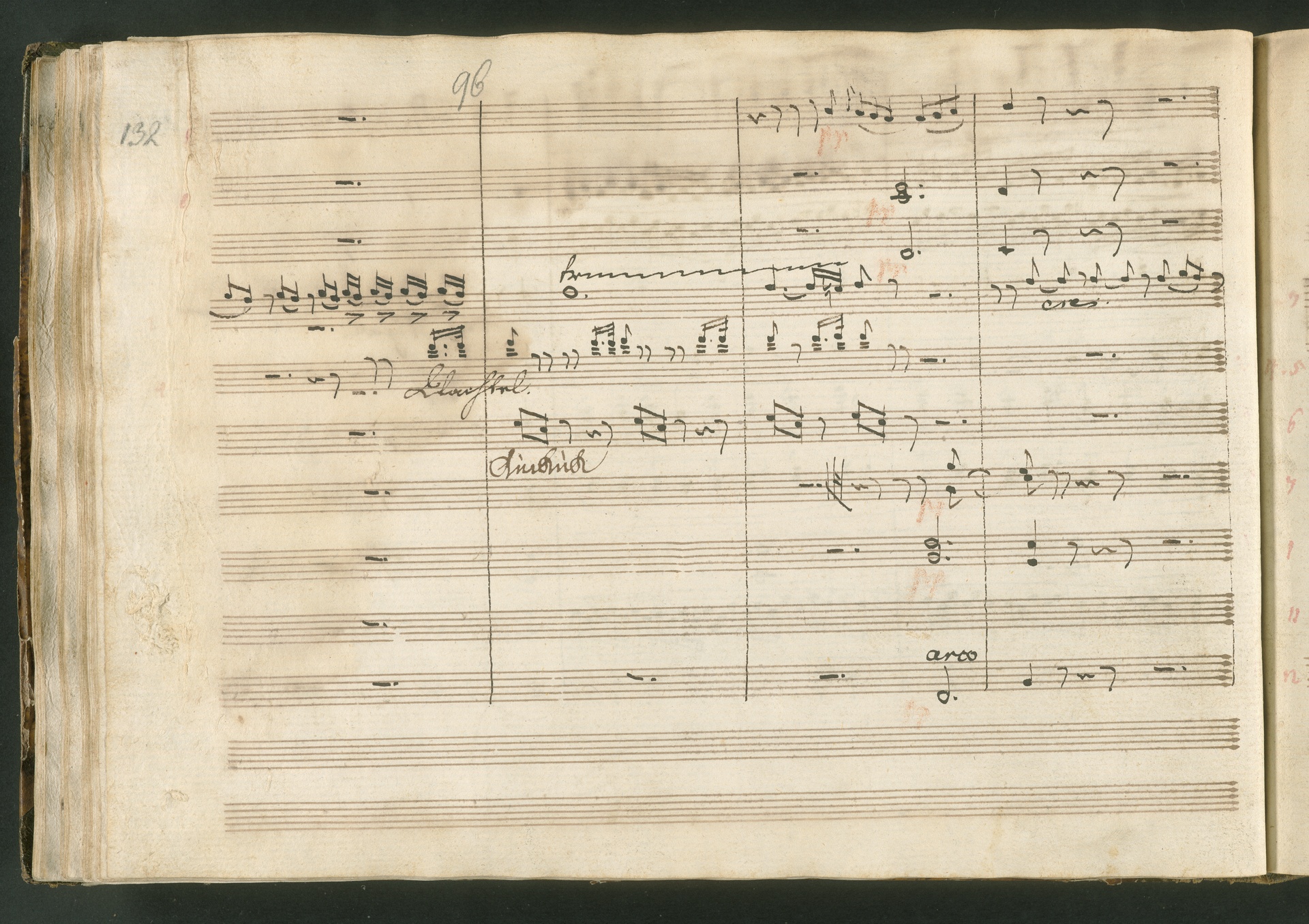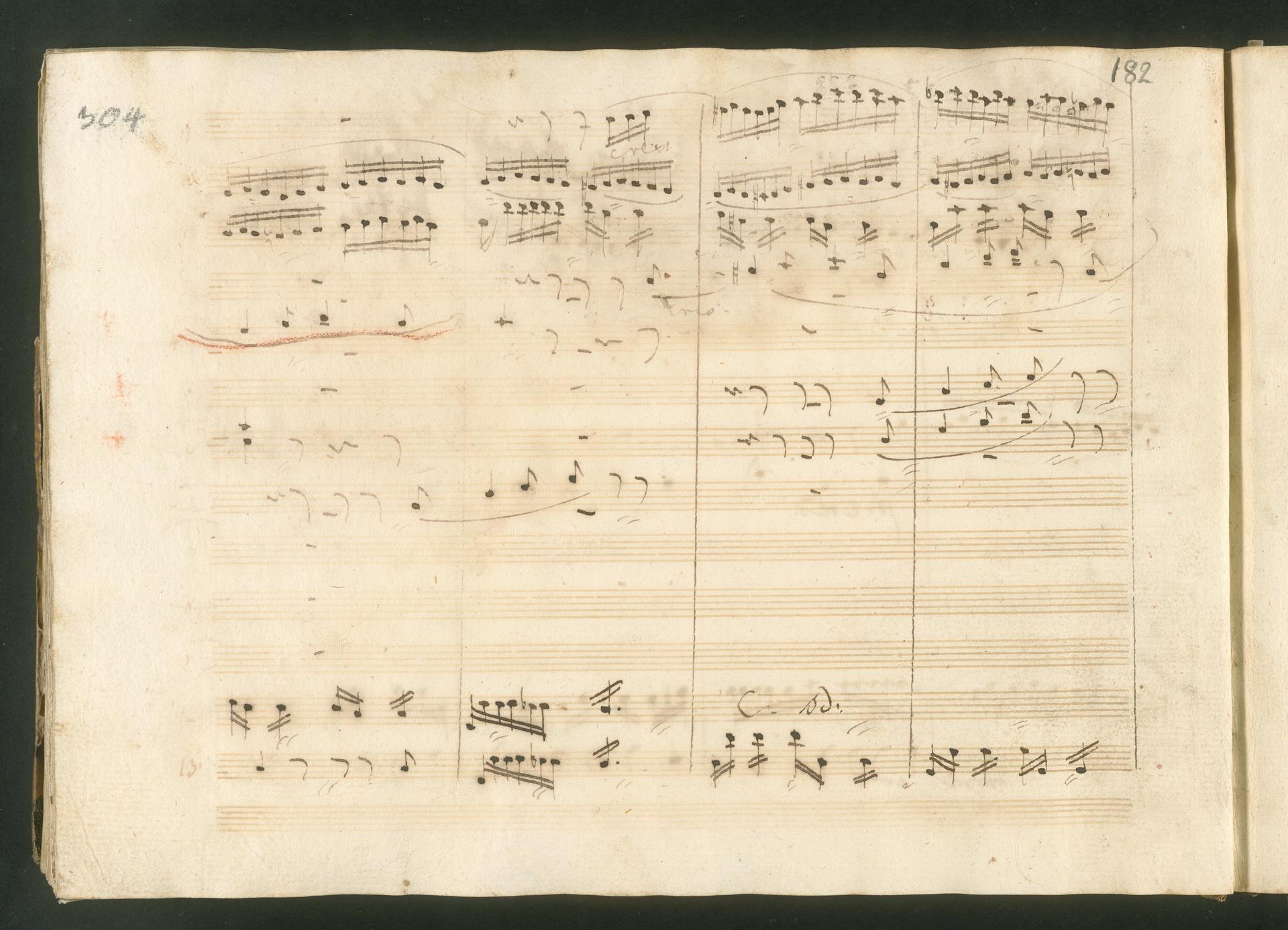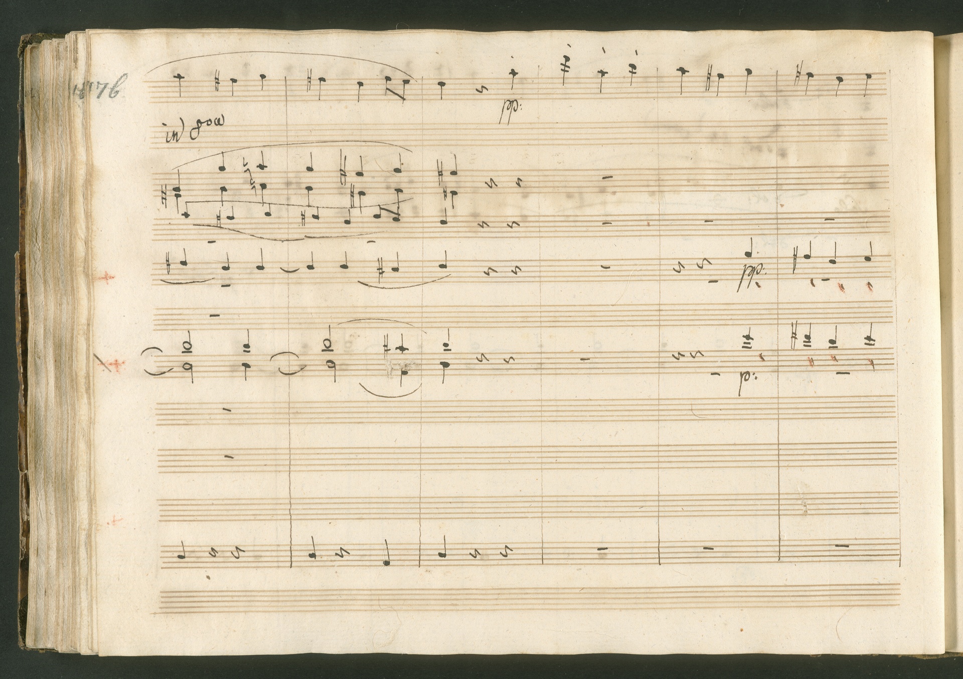 The manuscript shown here is a corrected copy of the Sixth Symphony, the "Pastoral". Beethoven sold the publisher Gottfried Christoph Härtel his Fifth and Sixth Symphonies (op. 67 und 68) in September 1808 on his visit to Vienna. The surviving correspondence shows that Beethoven did not give Härtel autograph scores but corrected copies as engraver's models for the original edition