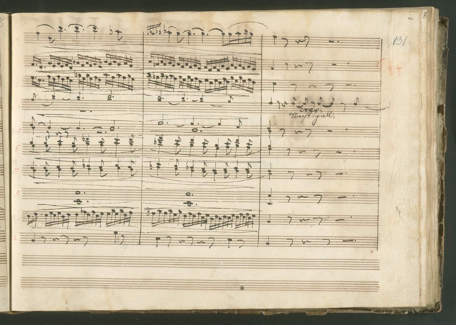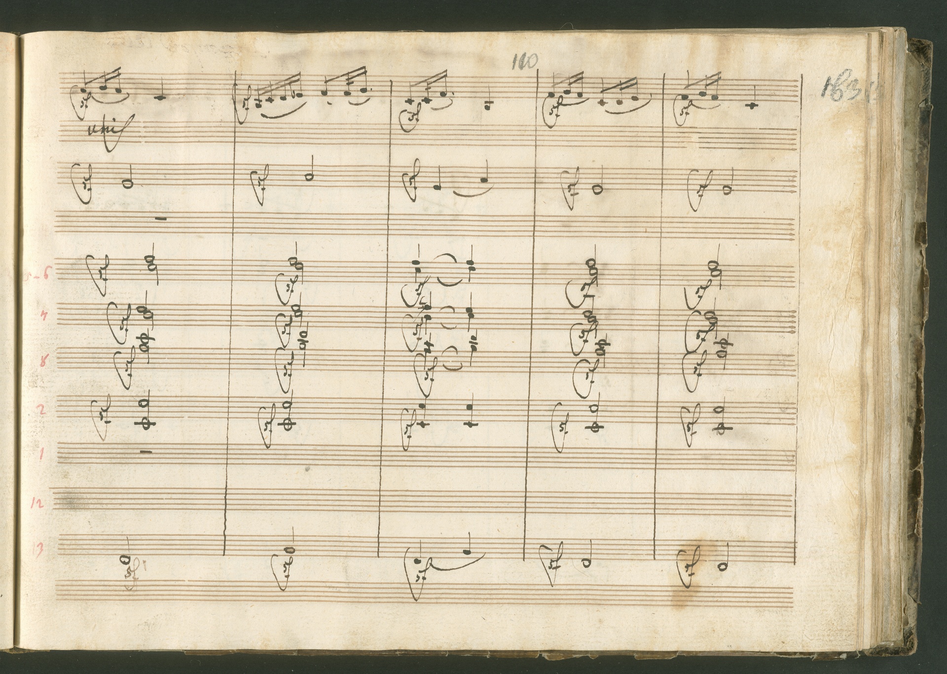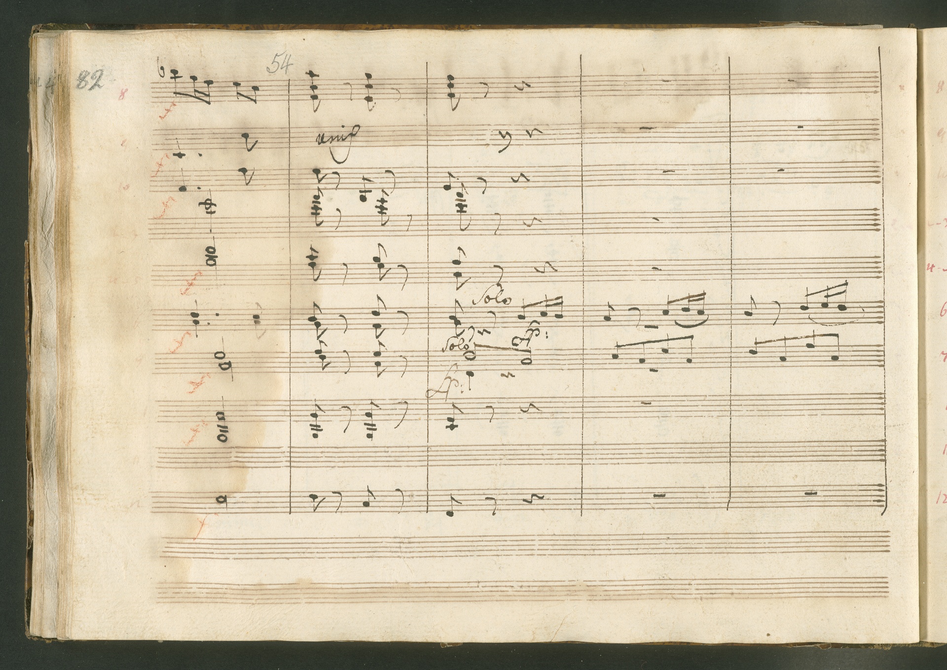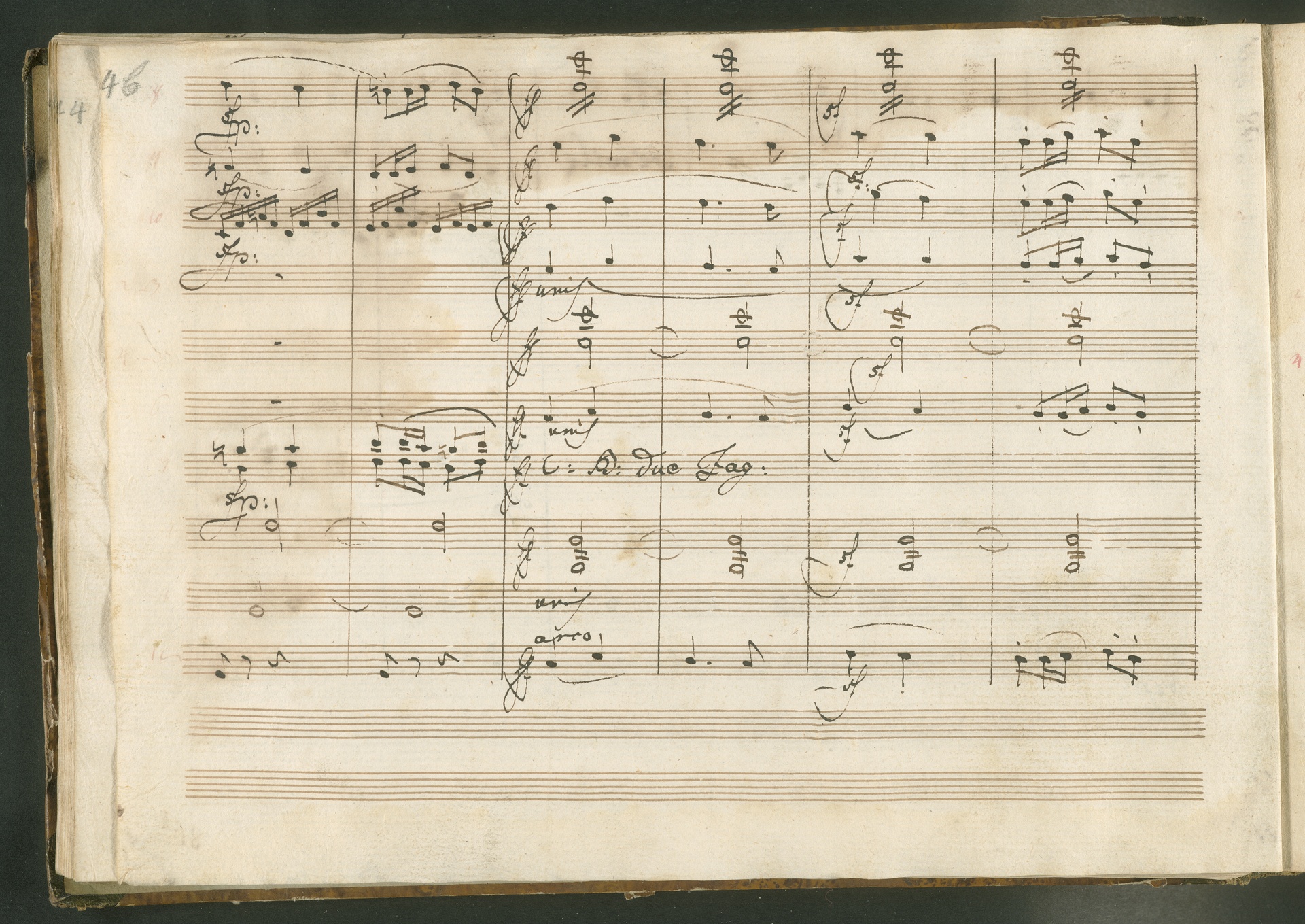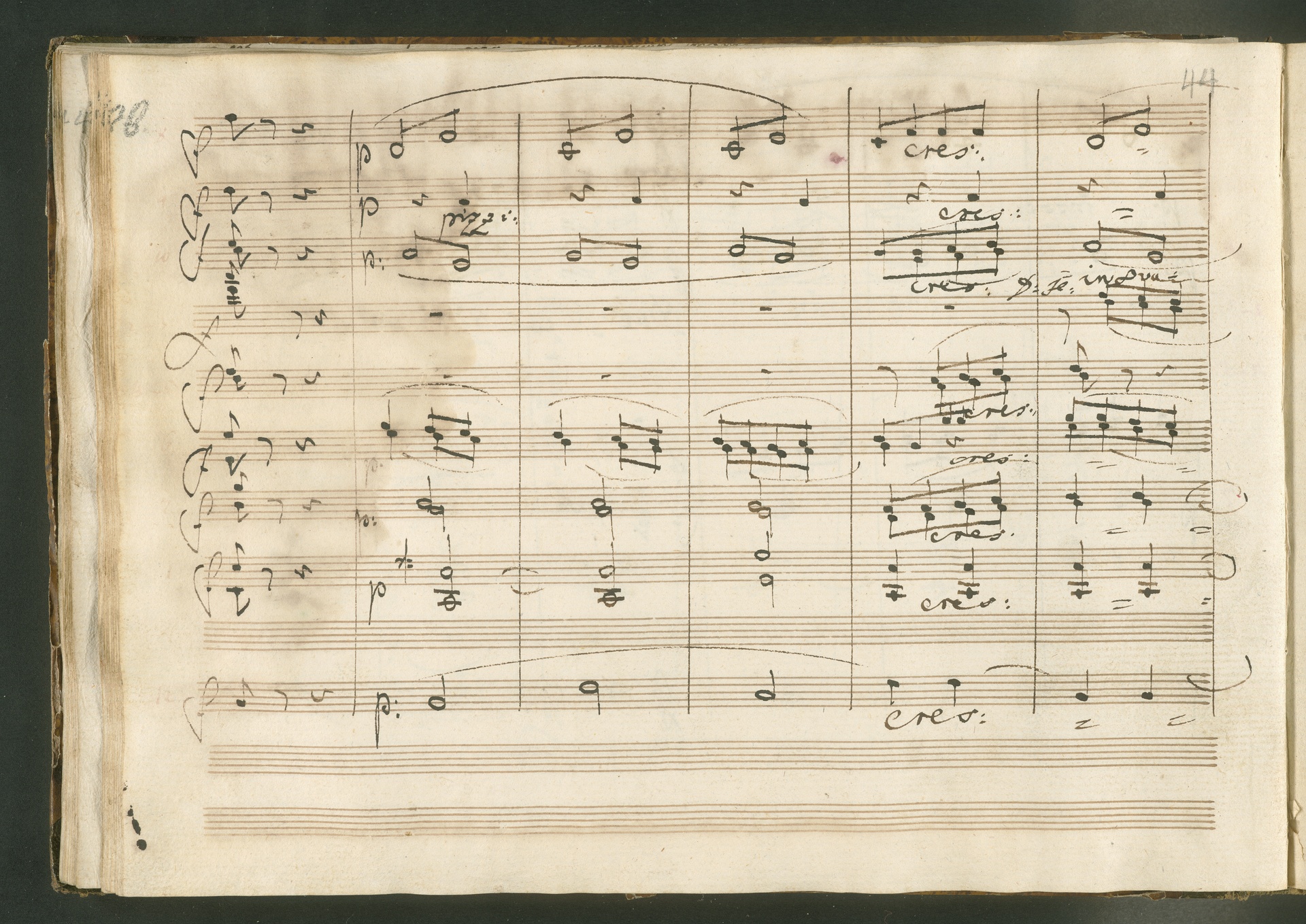 The manuscript shown here is a corrected copy of the Sixth Symphony, the "Pastoral". Beethoven sold the publisher Gottfried Christoph Härtel his Fifth and Sixth Symphonies (op. 67 und 68) in September 1808 on his visit to Vienna. The surviving correspondence shows that Beethoven did not give Härtel autograph scores but corrected copies as engraver's models for the original edition