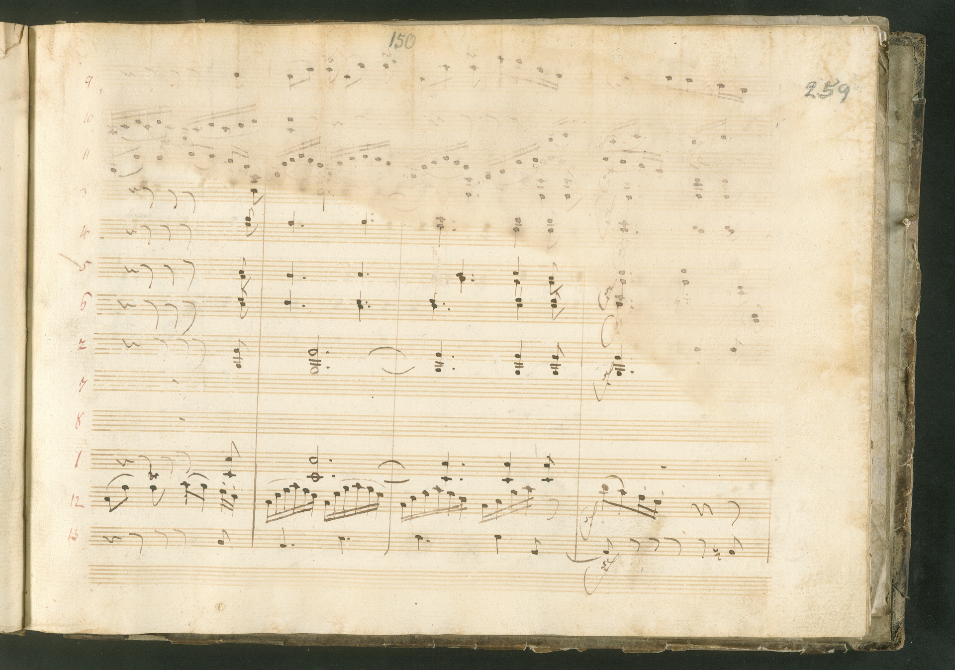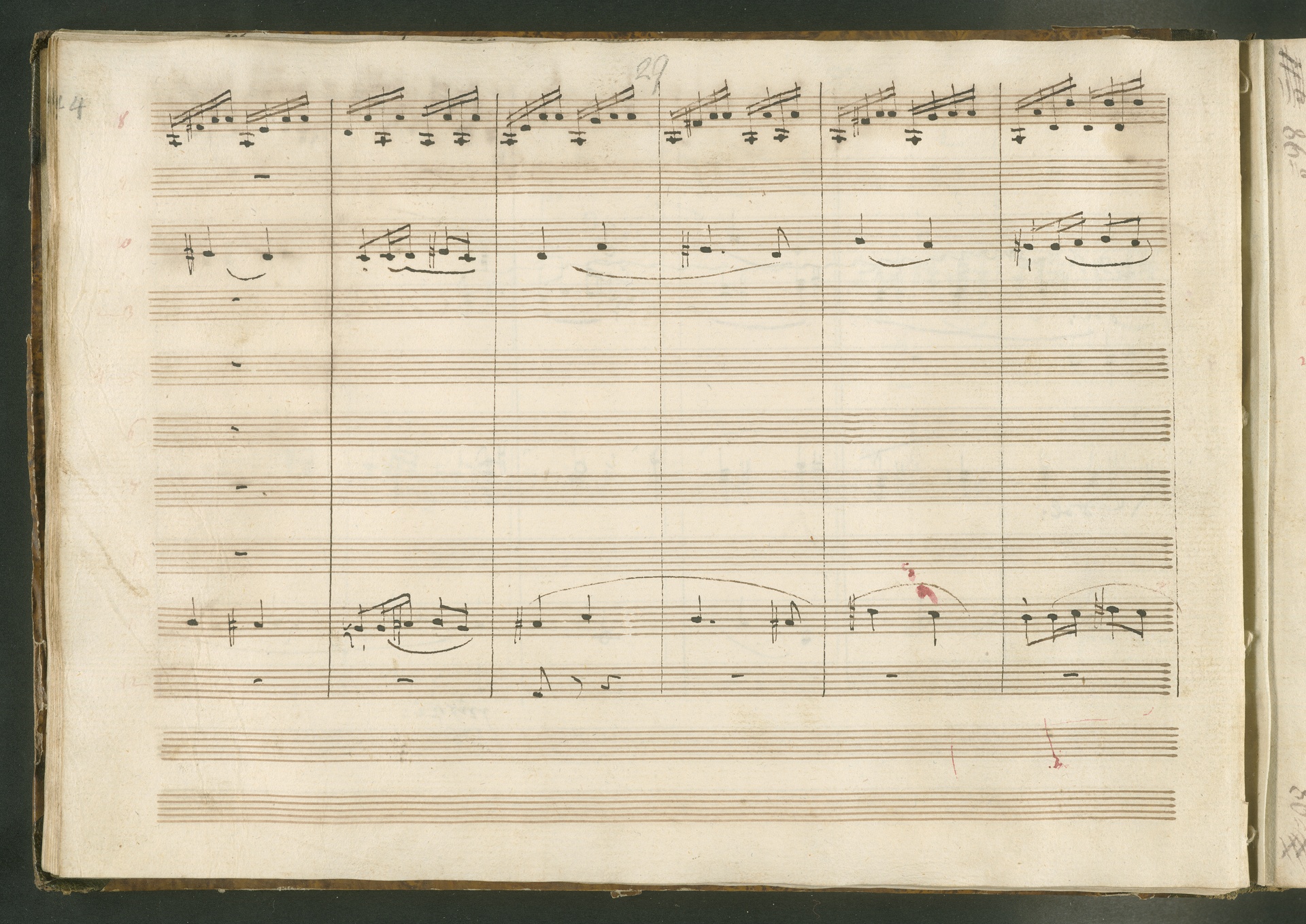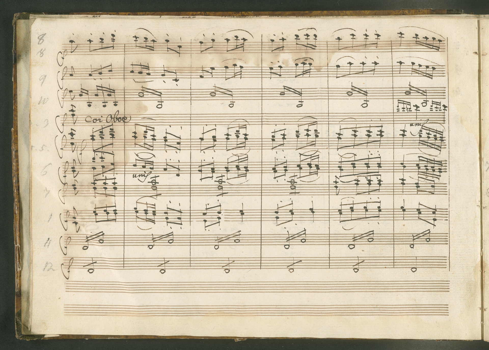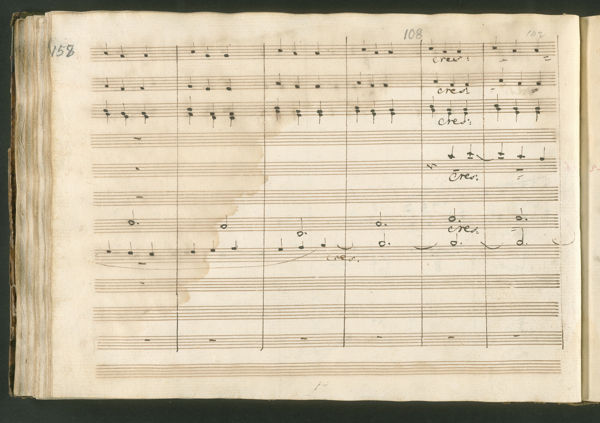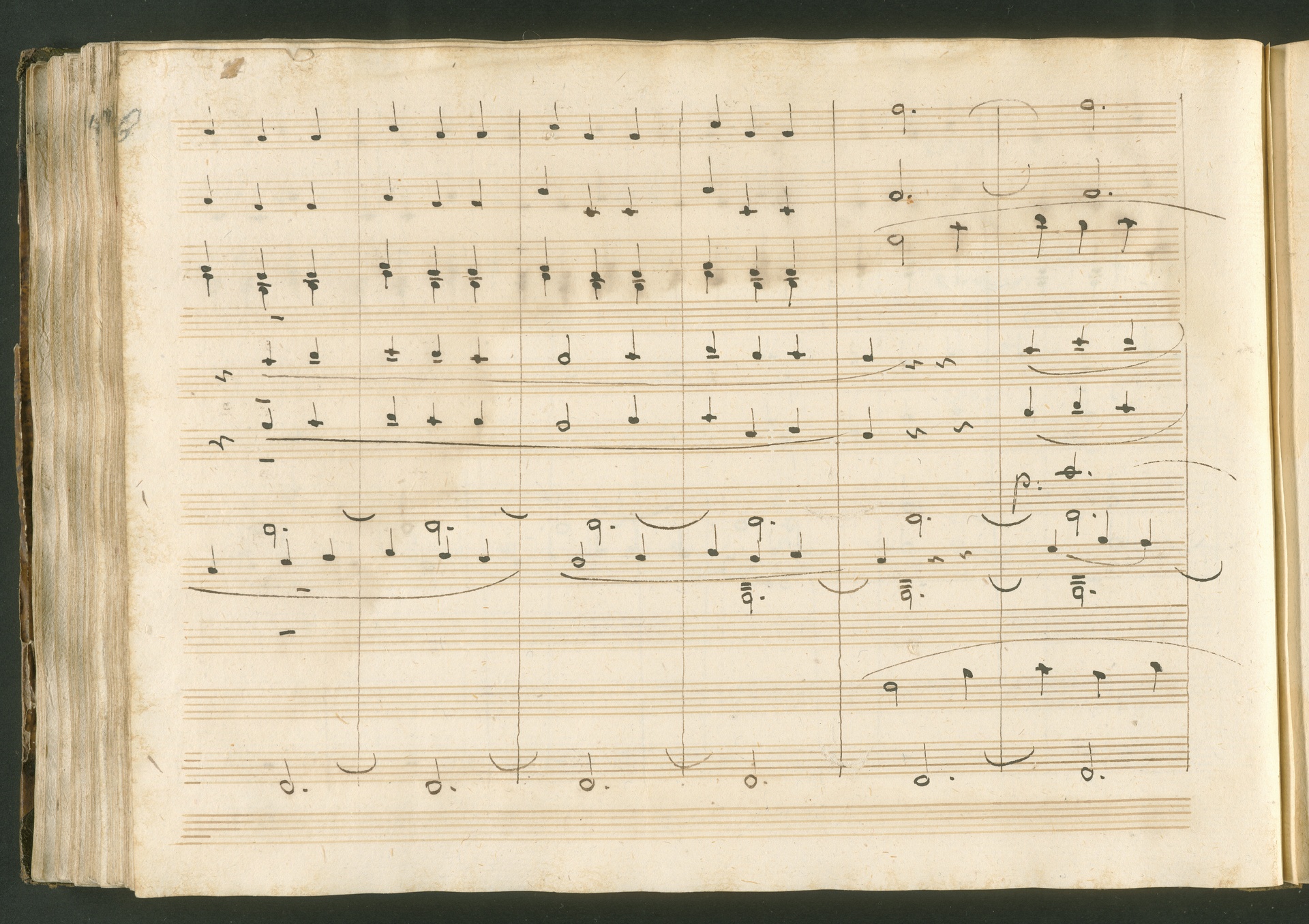 The manuscript shown here is a corrected copy of the Sixth Symphony, the "Pastoral". Beethoven sold the publisher Gottfried Christoph Härtel his Fifth and Sixth Symphonies (op. 67 und 68) in September 1808 on his visit to Vienna. The surviving correspondence shows that Beethoven did not give Härtel autograph scores but corrected copies as engraver's models for the original edition
