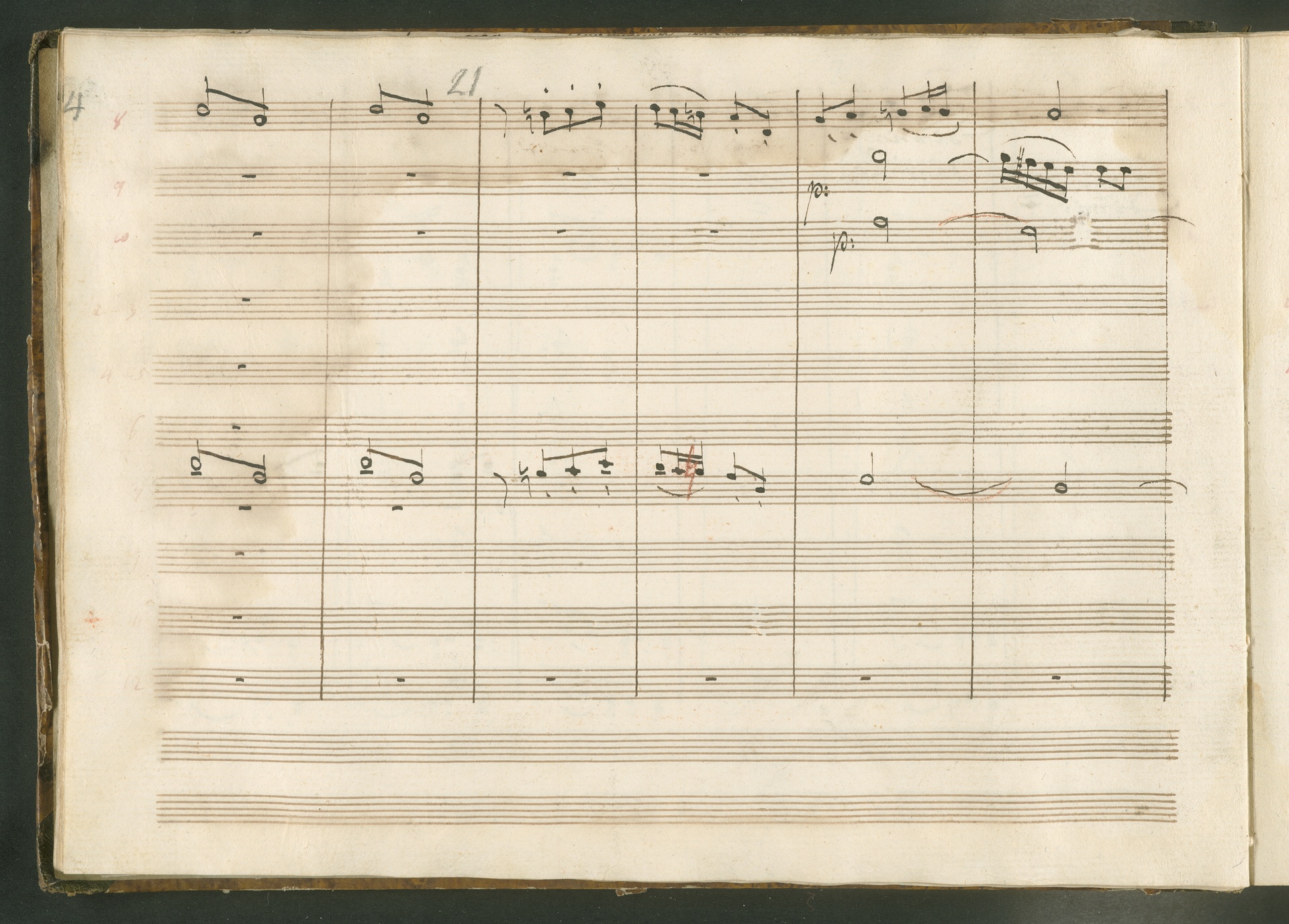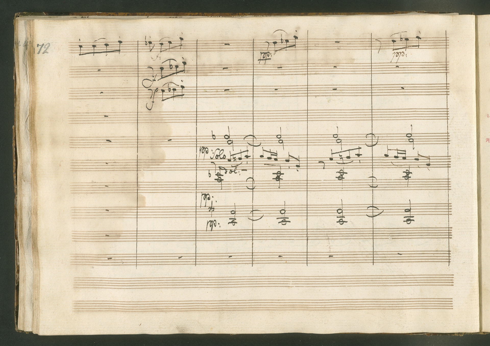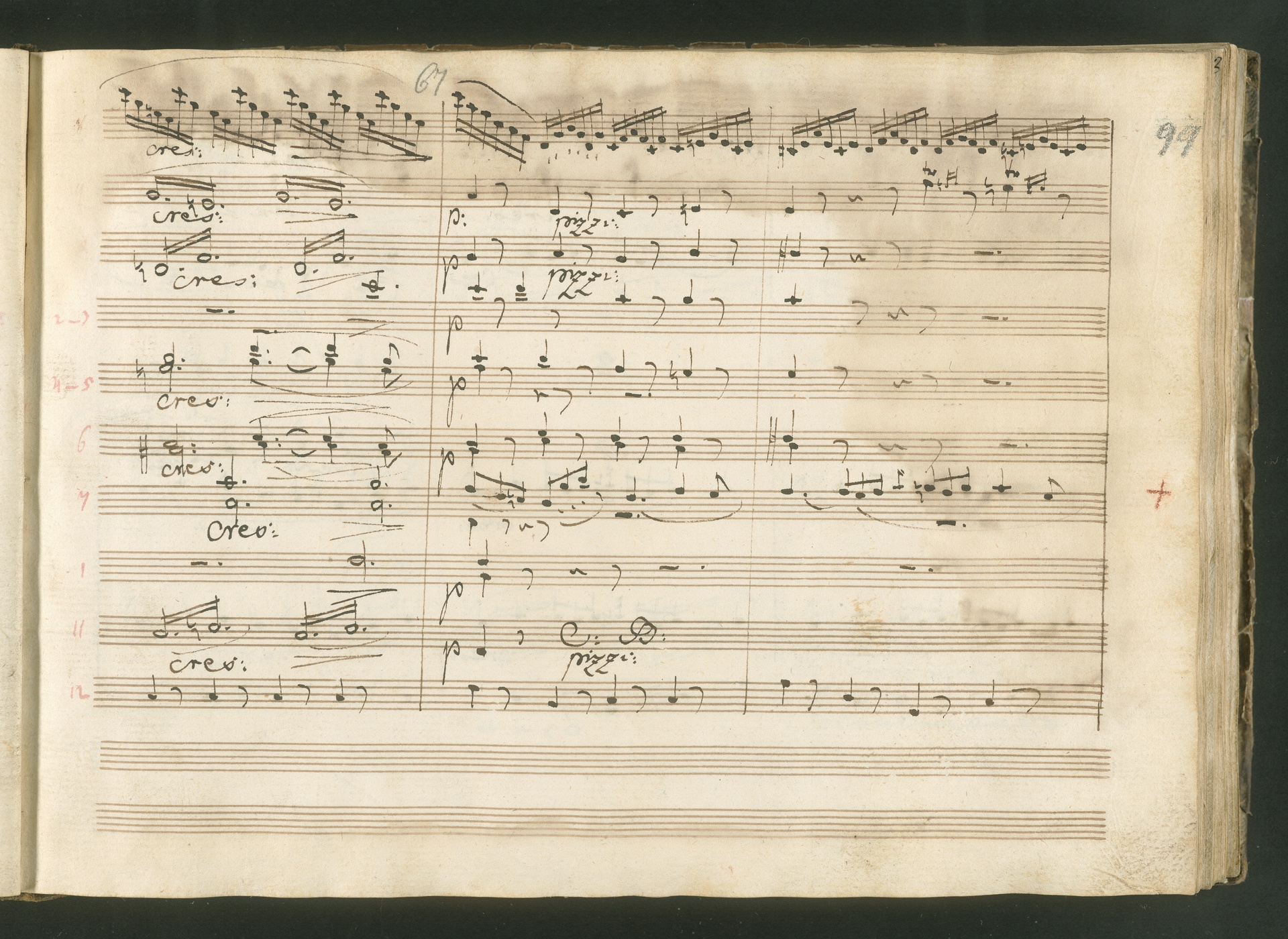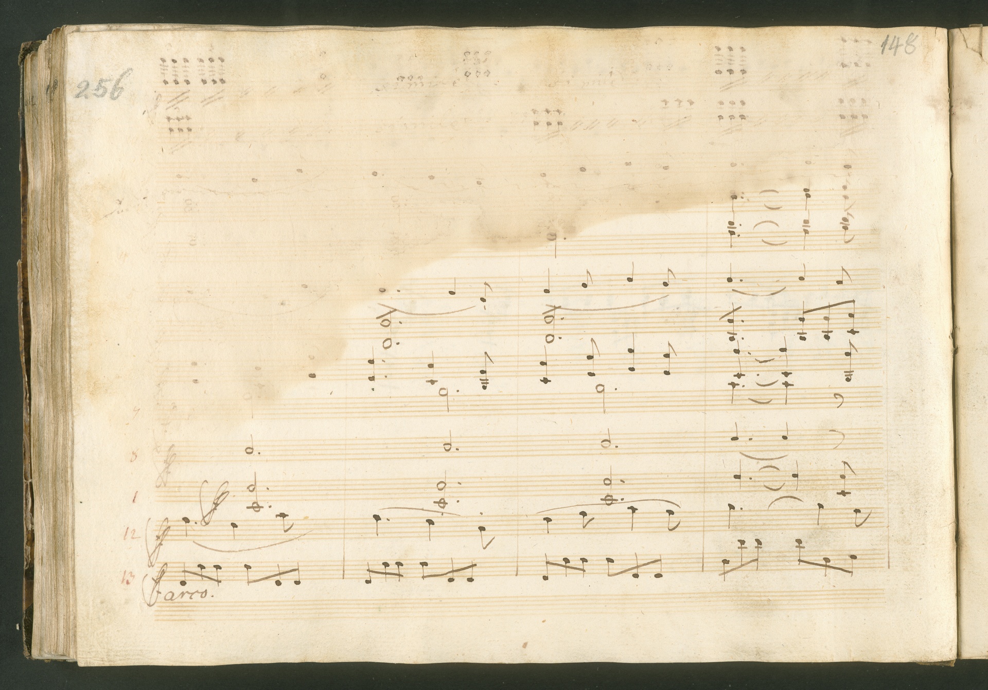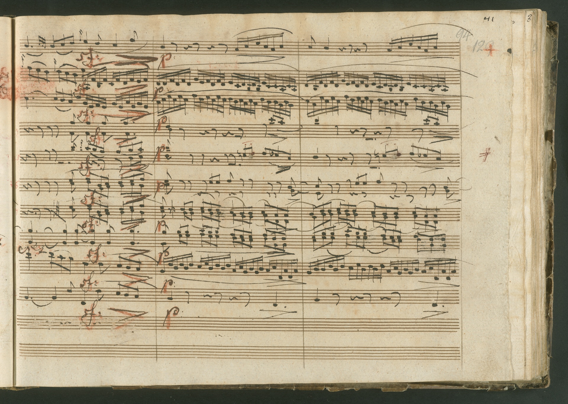 The manuscript shown here is a corrected copy of the Sixth Symphony, the "Pastoral". Beethoven sold the publisher Gottfried Christoph Härtel his Fifth and Sixth Symphonies (op. 67 und 68) in September 1808 on his visit to Vienna. The surviving correspondence shows that Beethoven did not give Härtel autograph scores but corrected copies as engraver's models for the original edition