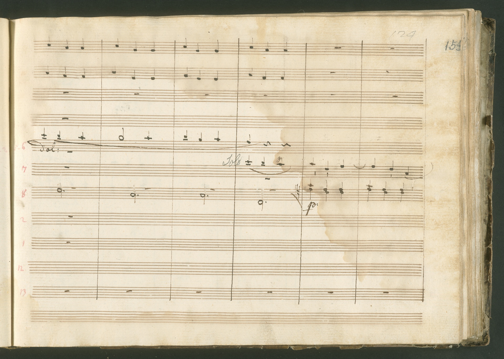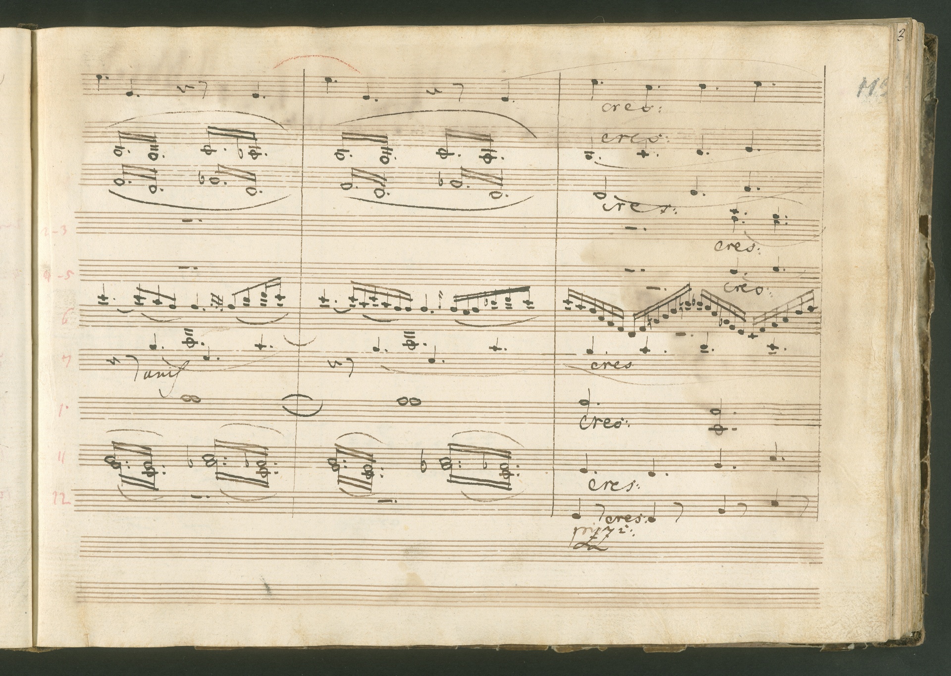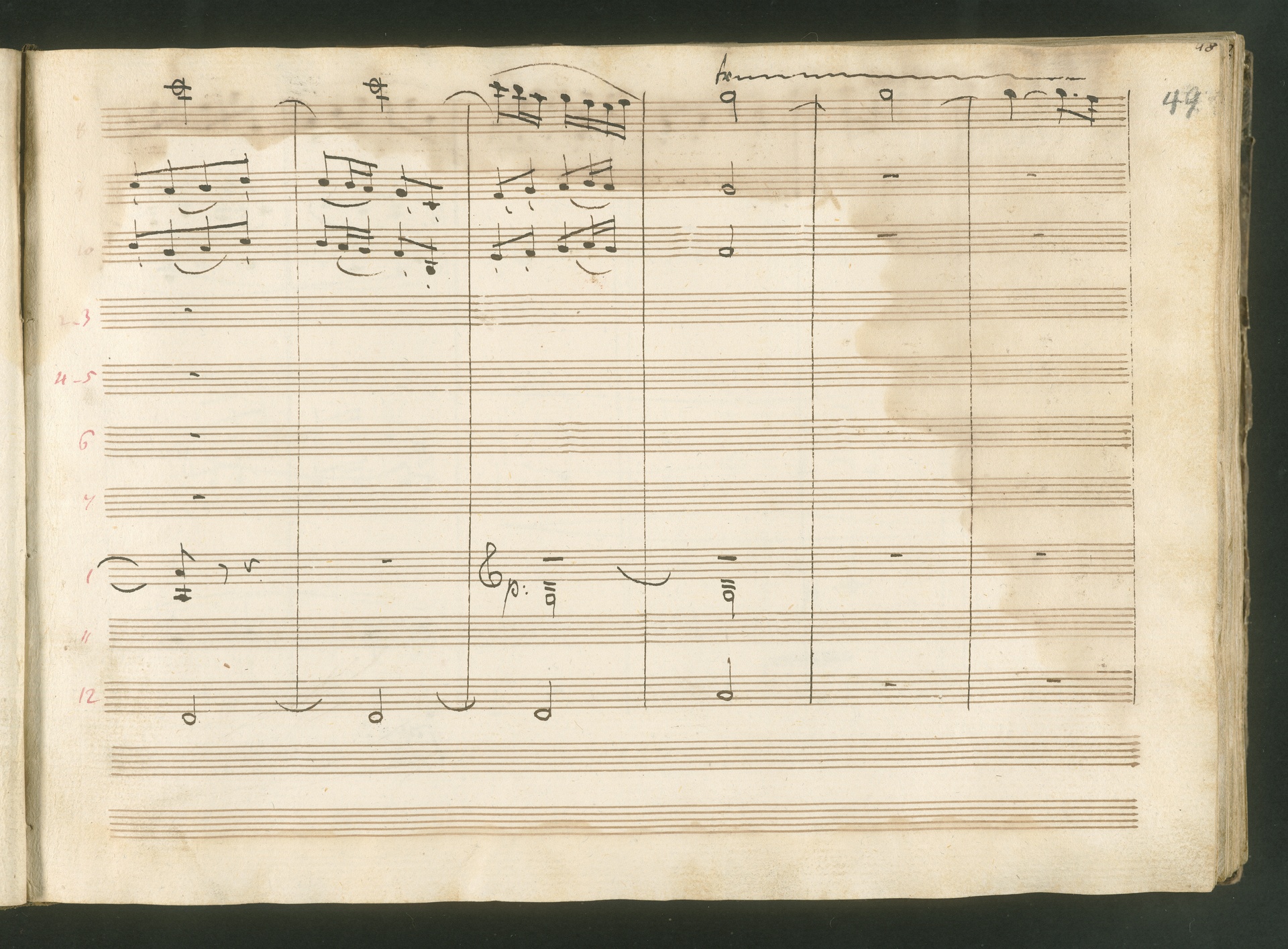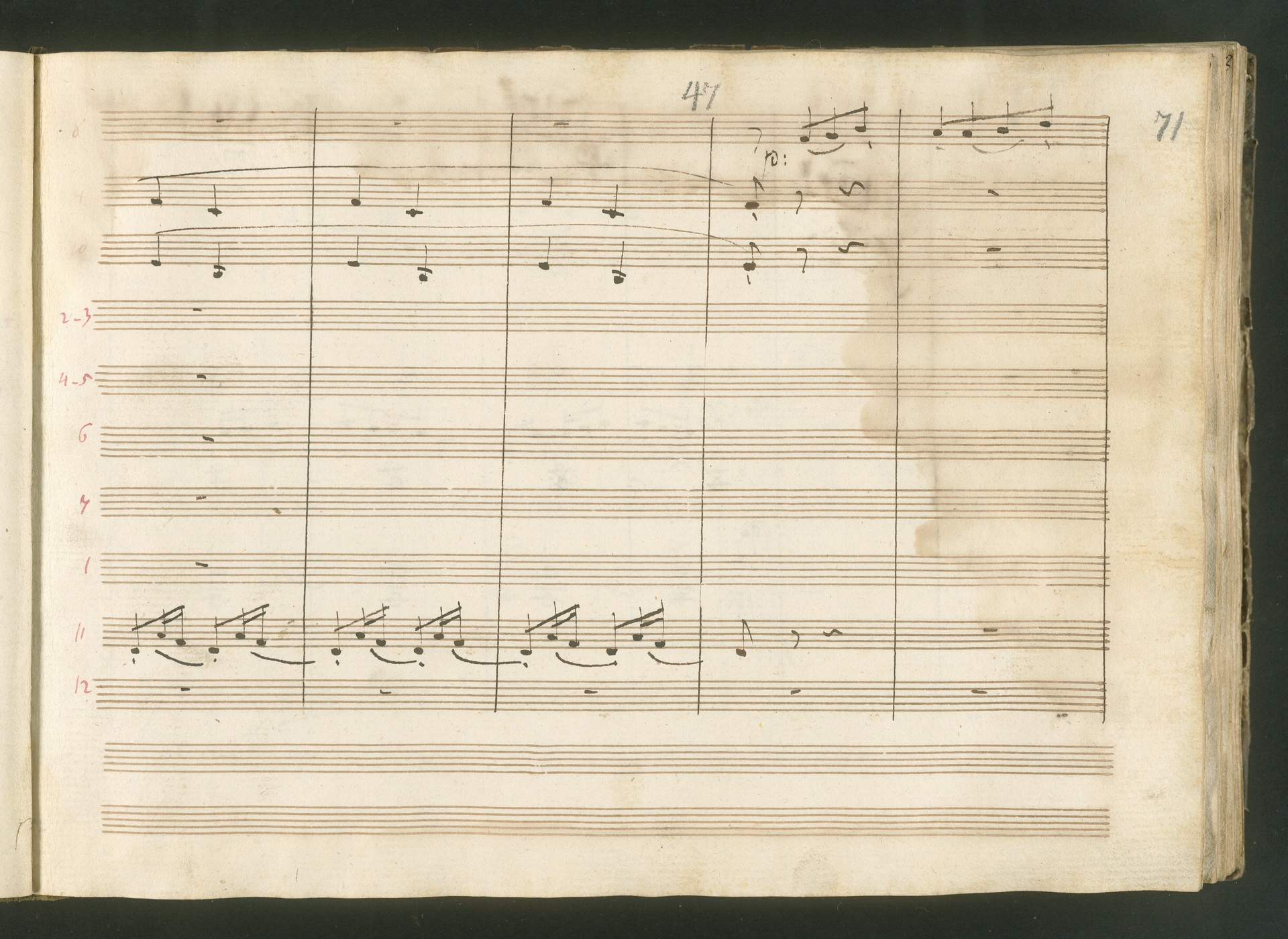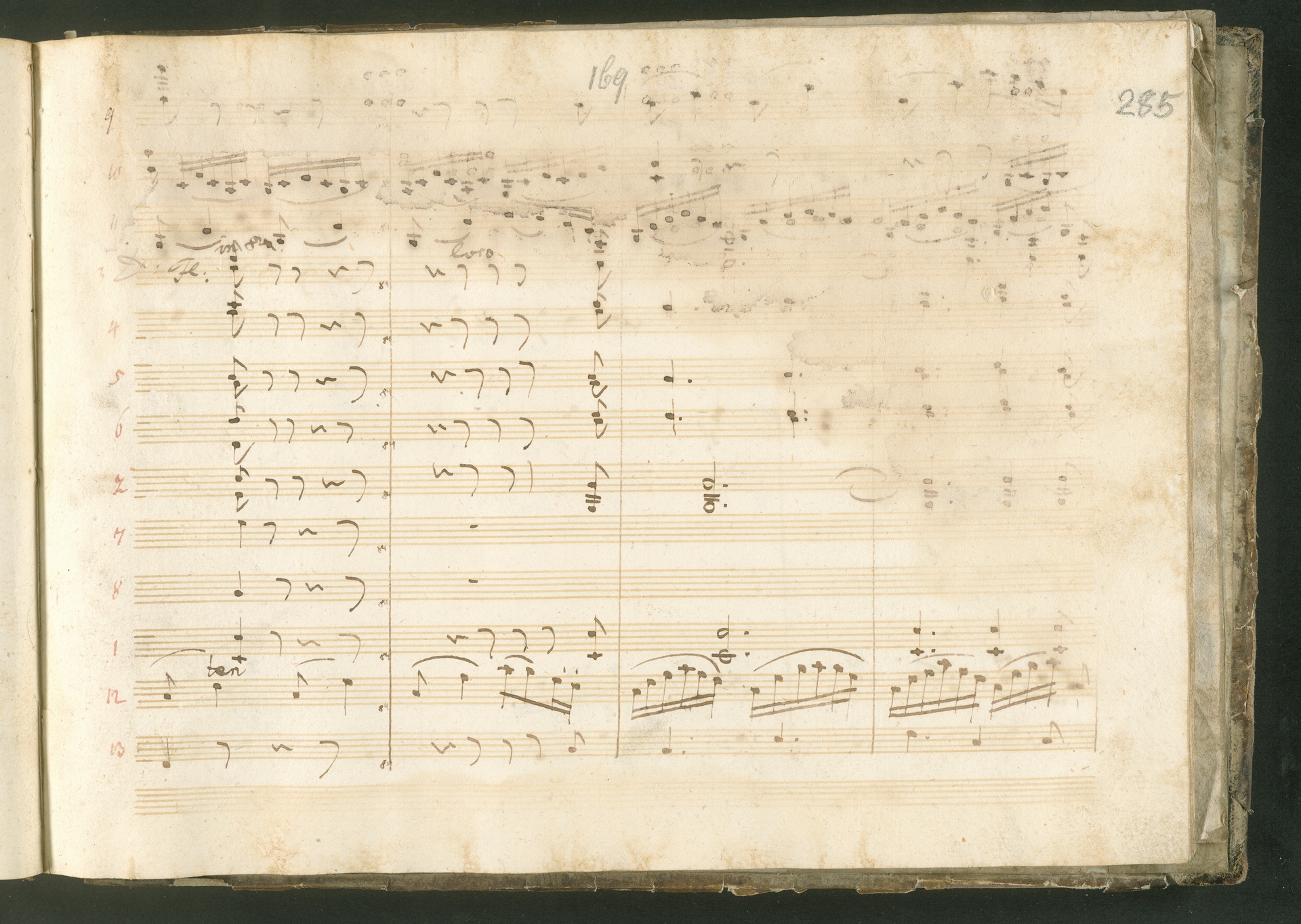 The manuscript shown here is a corrected copy of the Sixth Symphony, the "Pastoral". Beethoven sold the publisher Gottfried Christoph Härtel his Fifth and Sixth Symphonies (op. 67 und 68) in September 1808 on his visit to Vienna. The surviving correspondence shows that Beethoven did not give Härtel autograph scores but corrected copies as engraver's models for the original edition