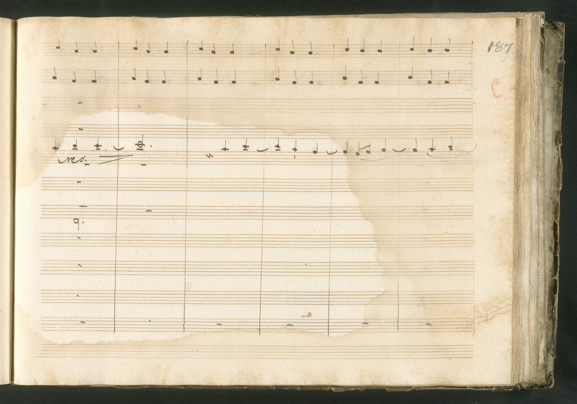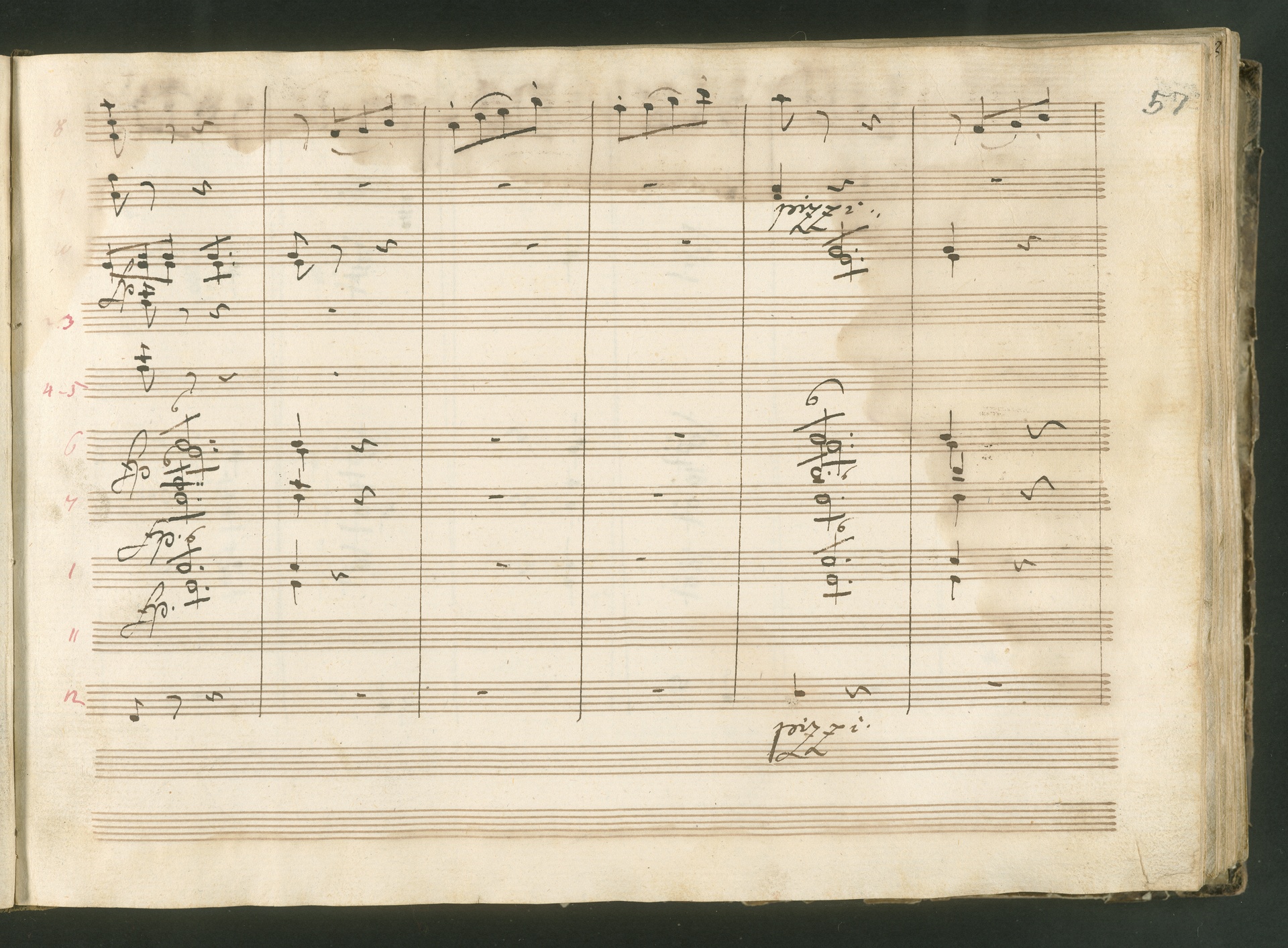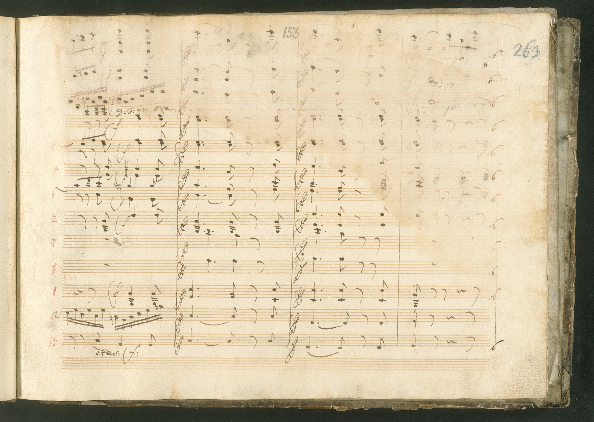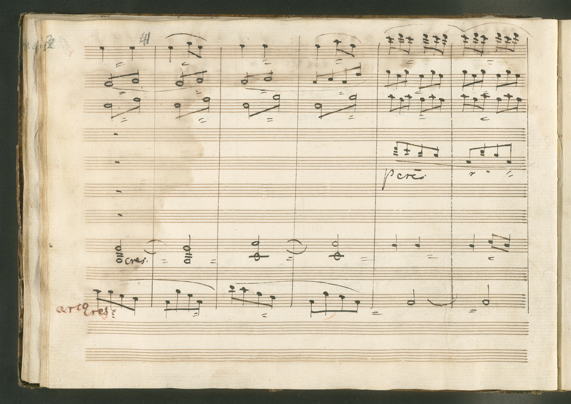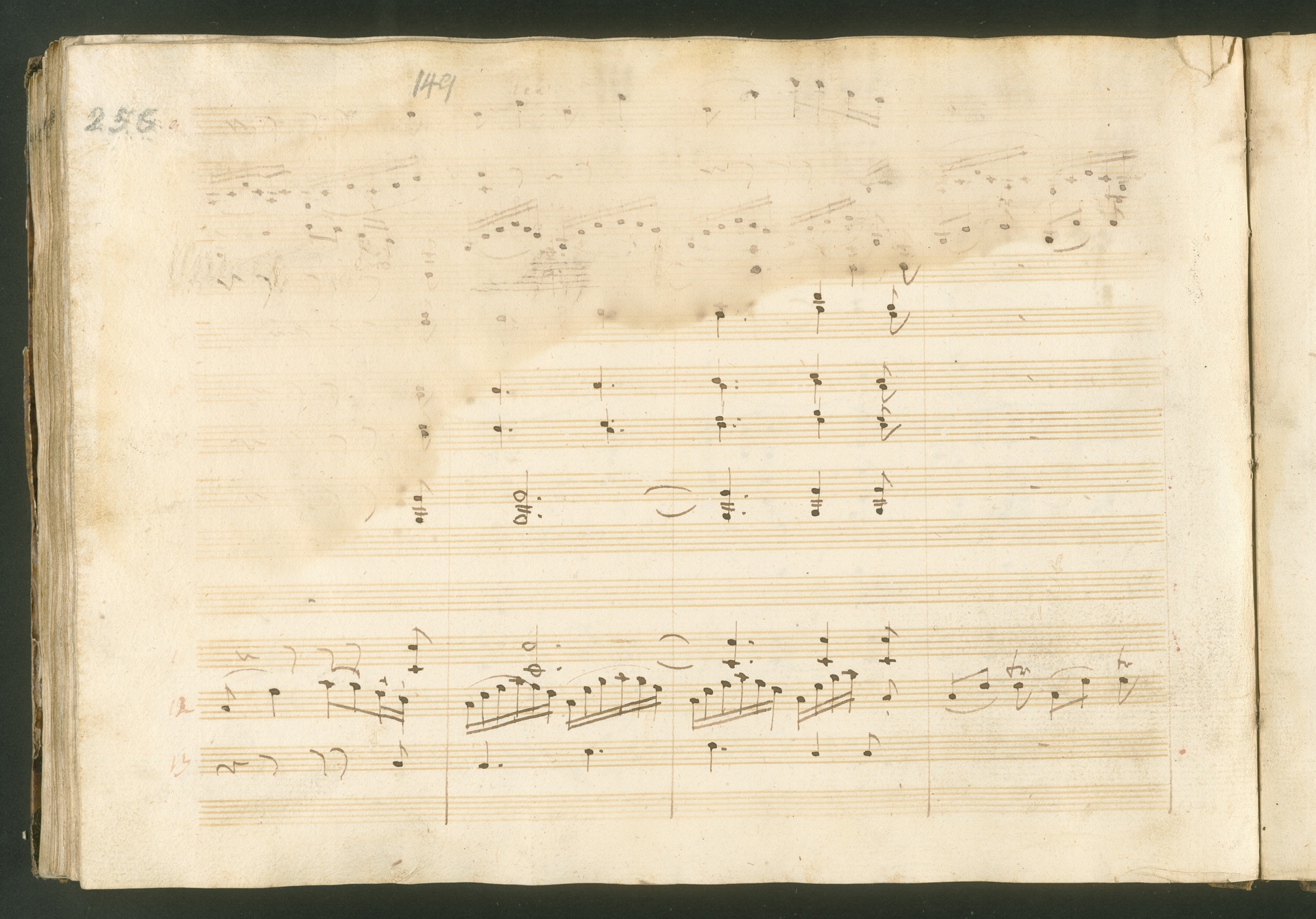 The manuscript shown here is a corrected copy of the Sixth Symphony, the "Pastoral". Beethoven sold the publisher Gottfried Christoph Härtel his Fifth and Sixth Symphonies (op. 67 und 68) in September 1808 on his visit to Vienna. The surviving correspondence shows that Beethoven did not give Härtel autograph scores but corrected copies as engraver's models for the original edition