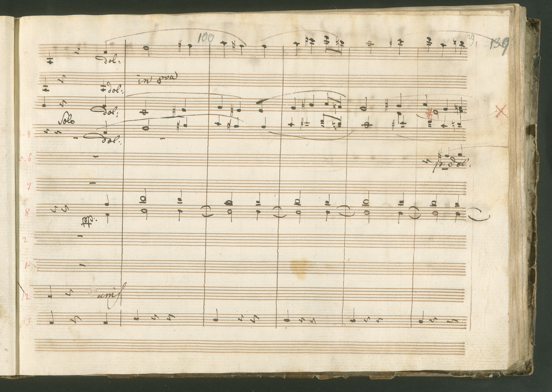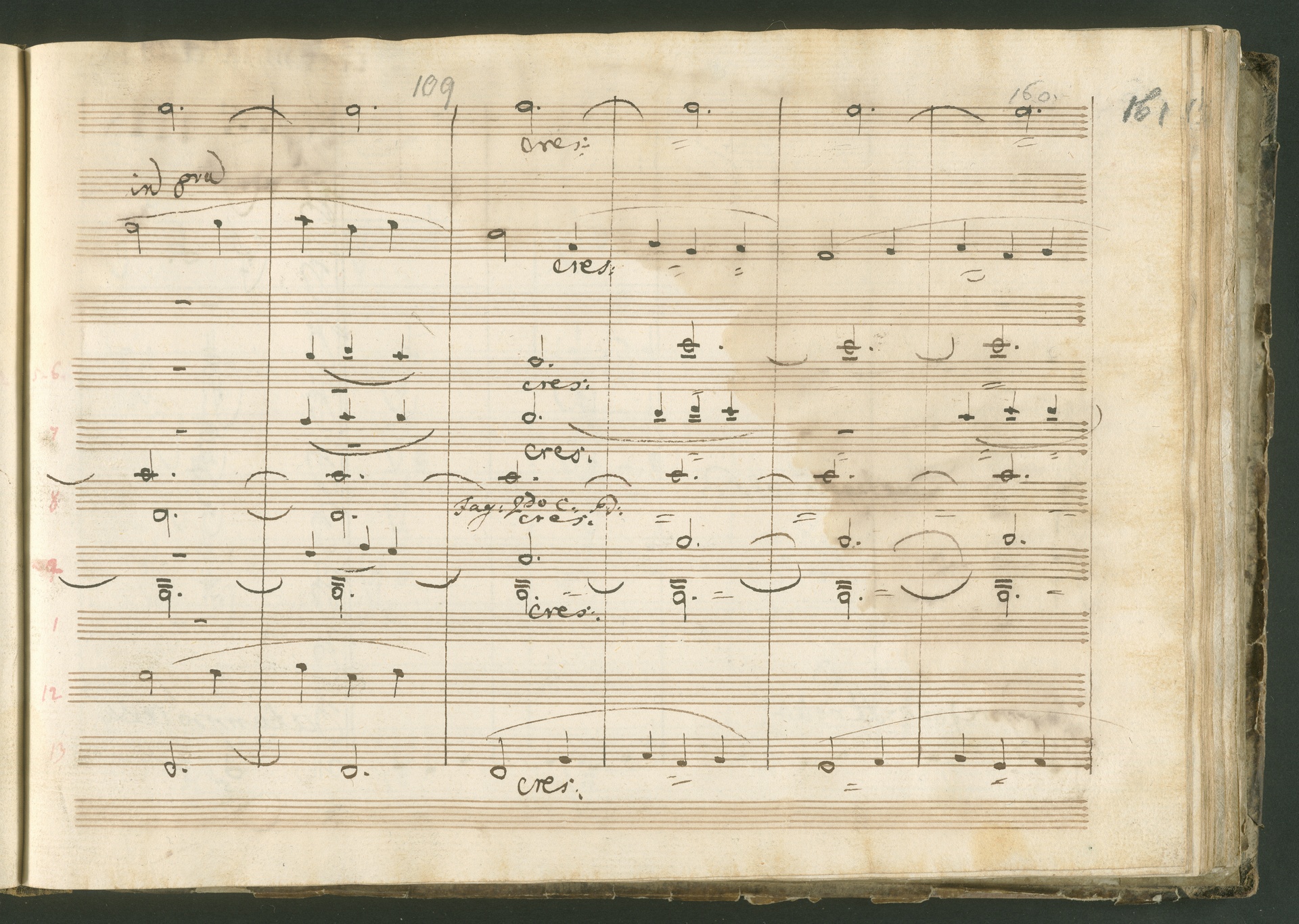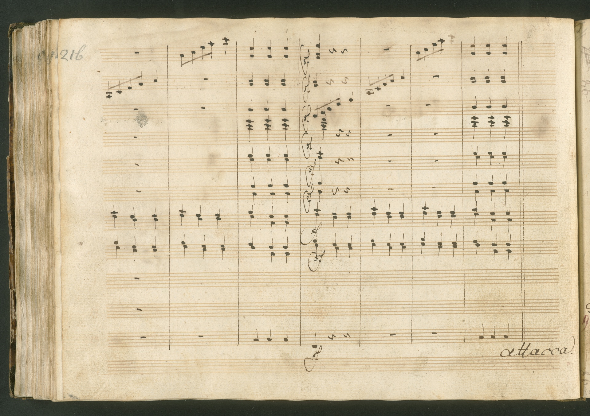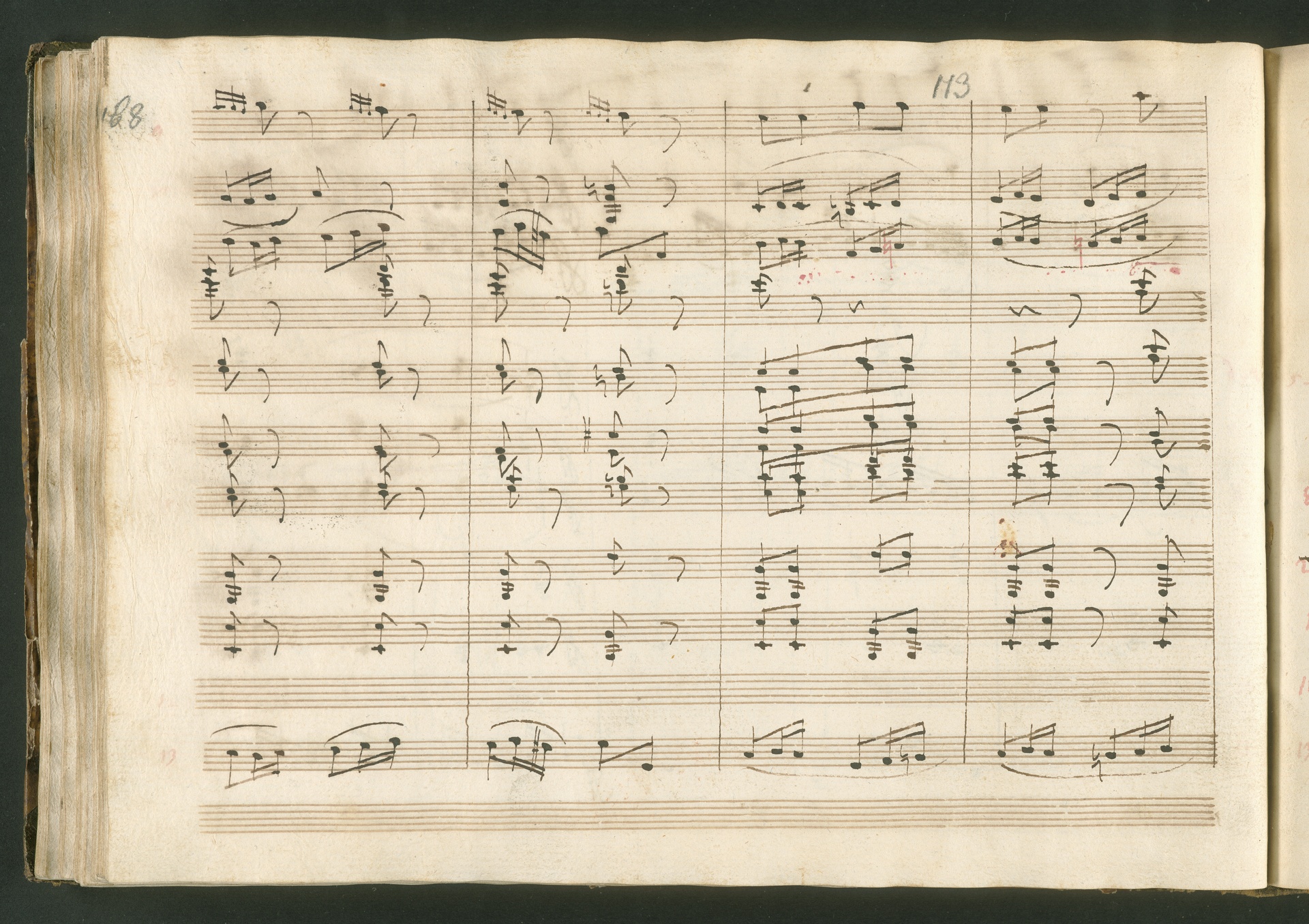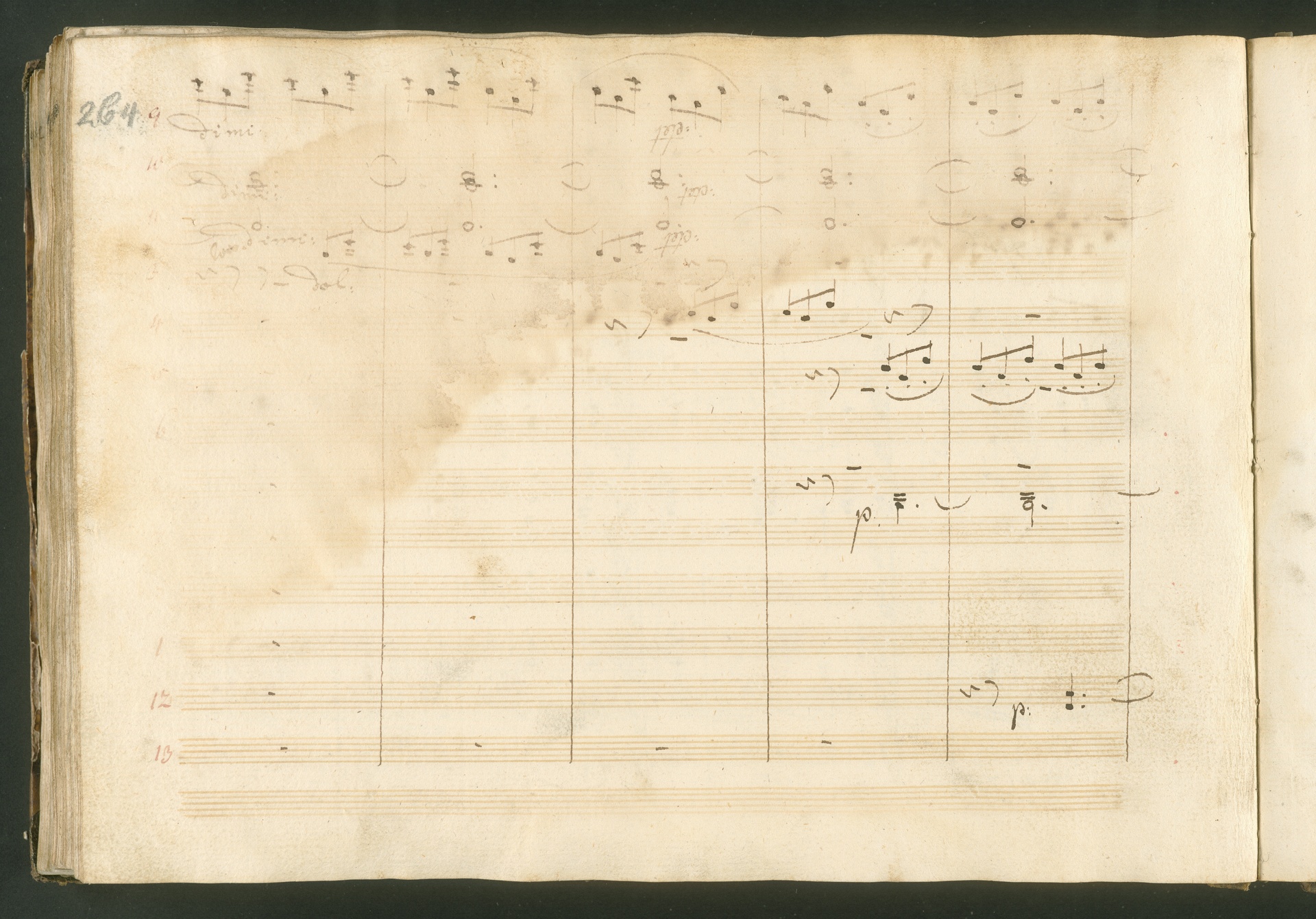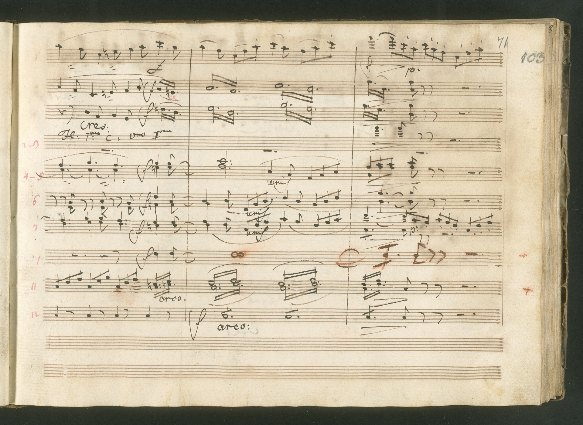 The manuscript shown here is a corrected copy of the Sixth Symphony, the "Pastoral". Beethoven sold the publisher Gottfried Christoph Härtel his Fifth and Sixth Symphonies (op. 67 und 68) in September 1808 on his visit to Vienna. The surviving correspondence shows that Beethoven did not give Härtel autograph scores but corrected copies as engraver's models for the original edition