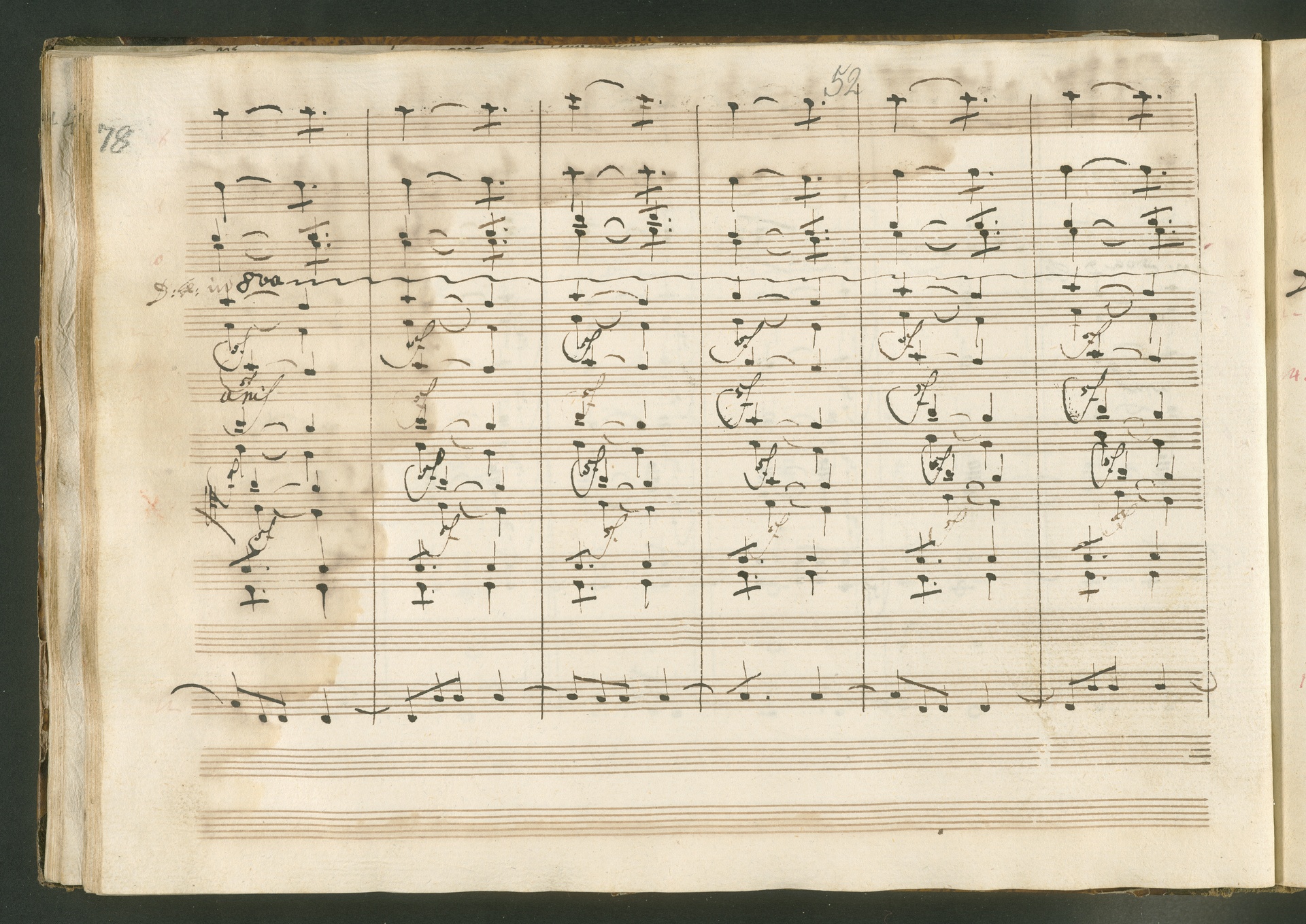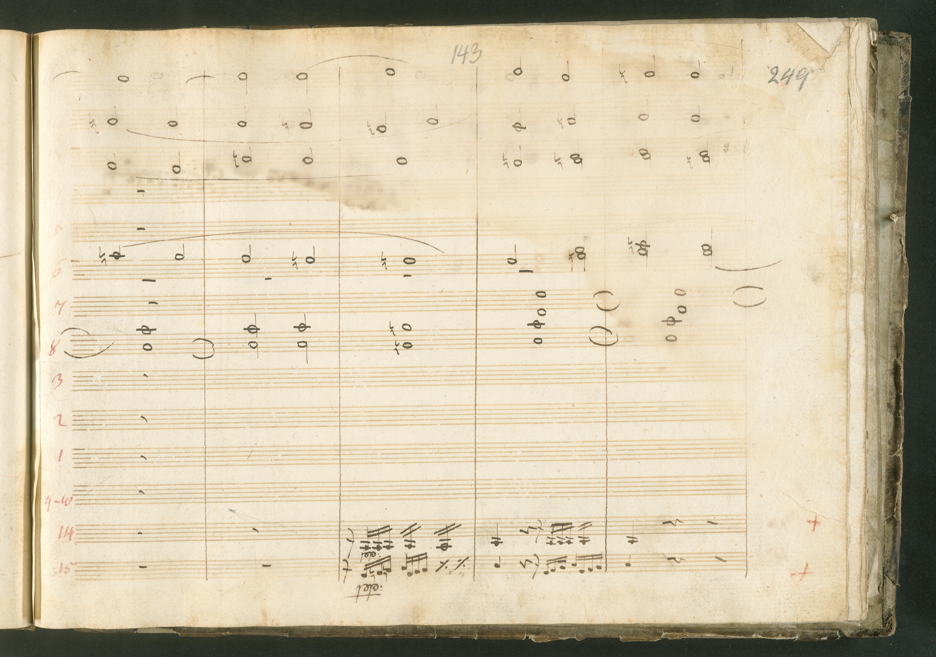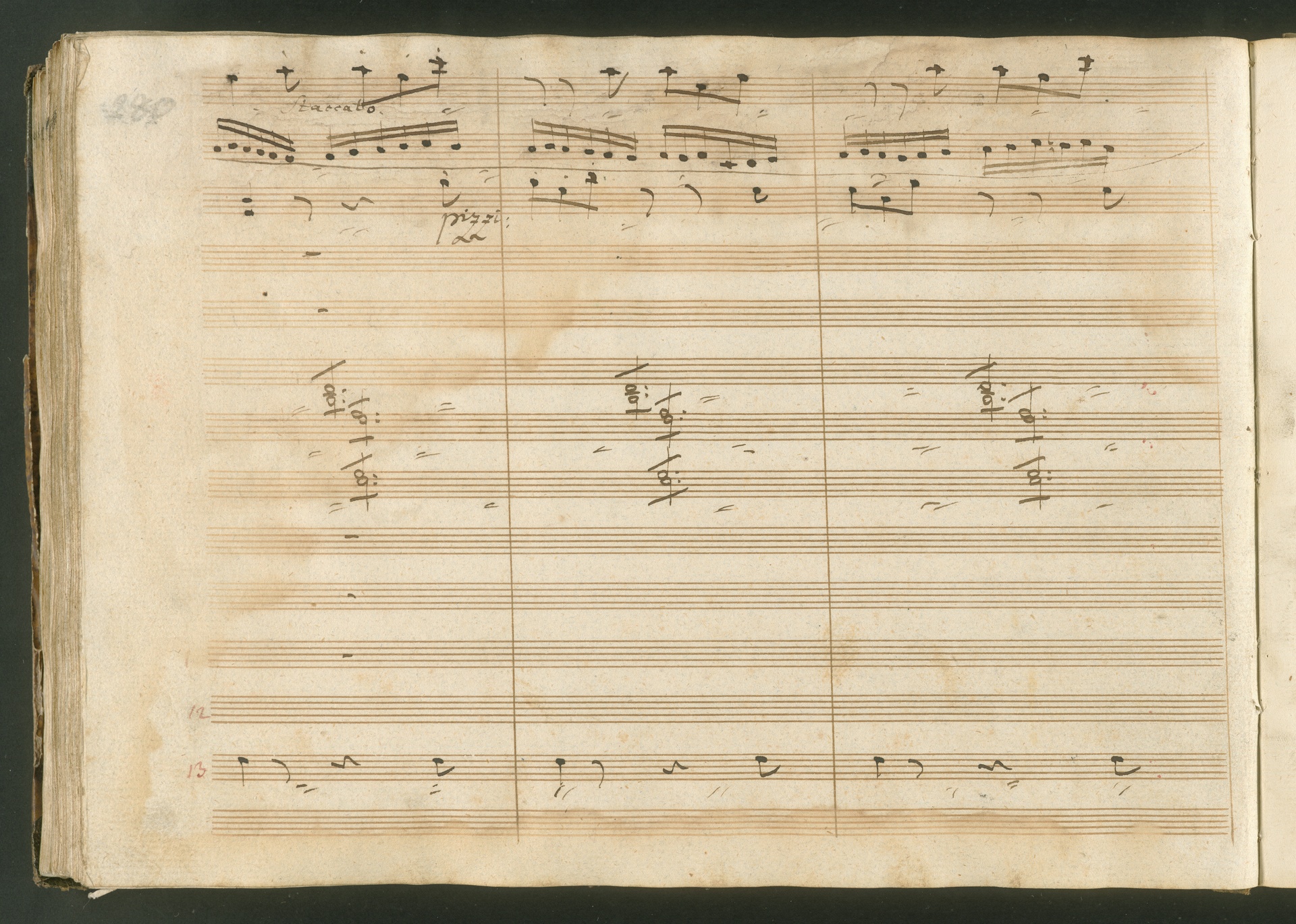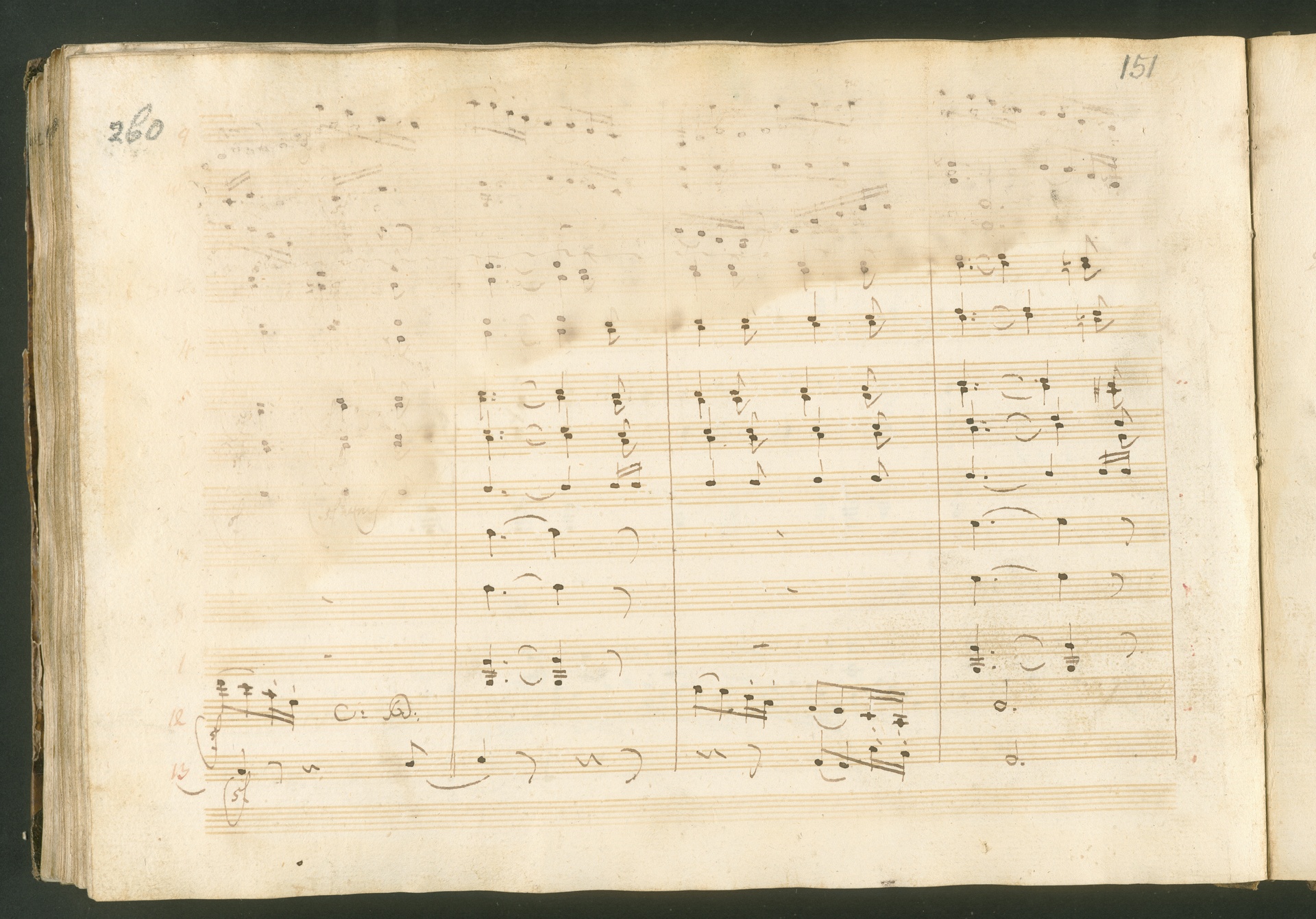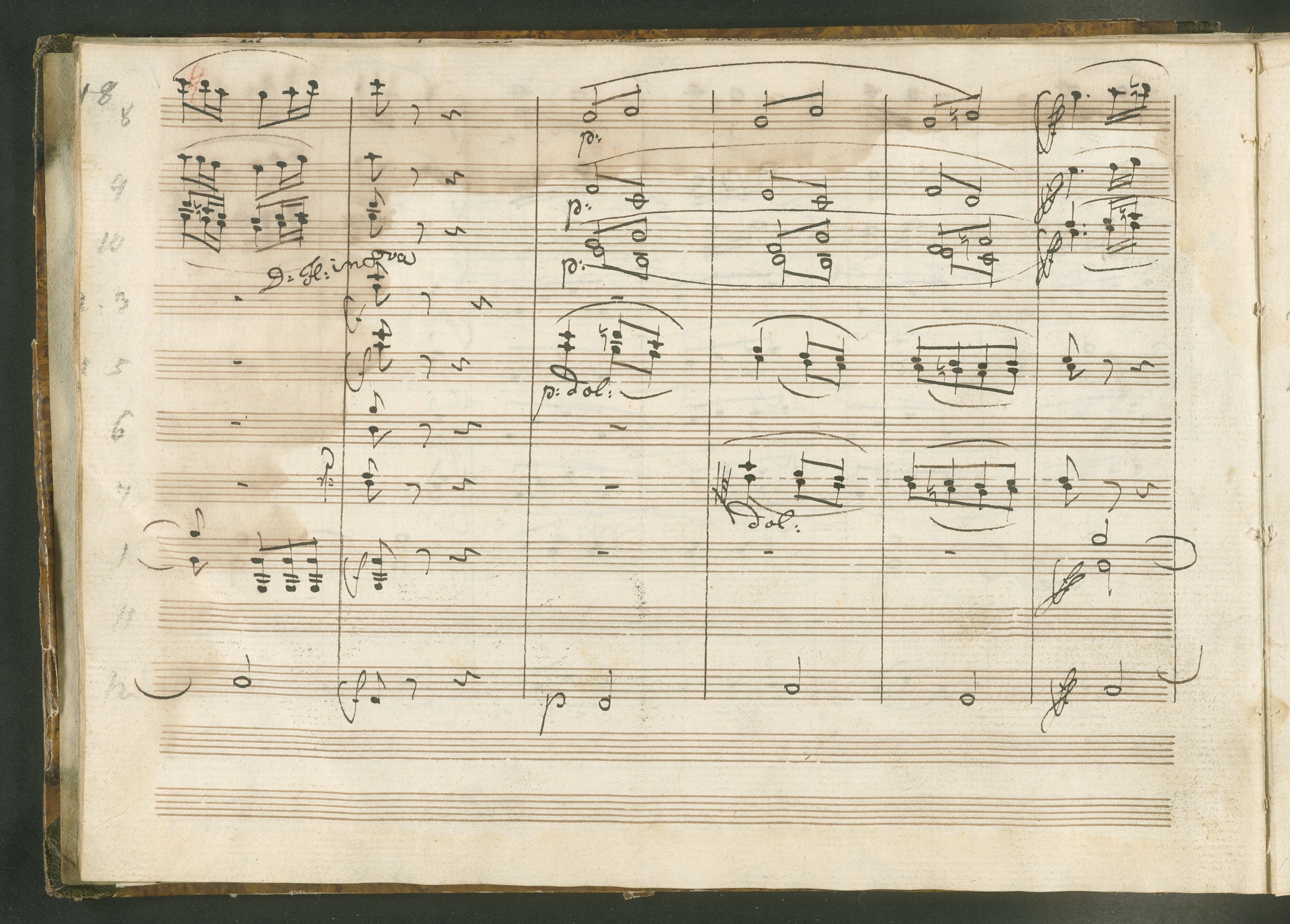 The manuscript shown here is a corrected copy of the Sixth Symphony, the "Pastoral". Beethoven sold the publisher Gottfried Christoph Härtel his Fifth and Sixth Symphonies (op. 67 und 68) in September 1808 on his visit to Vienna. The surviving correspondence shows that Beethoven did not give Härtel autograph scores but corrected copies as engraver's models for the original edition