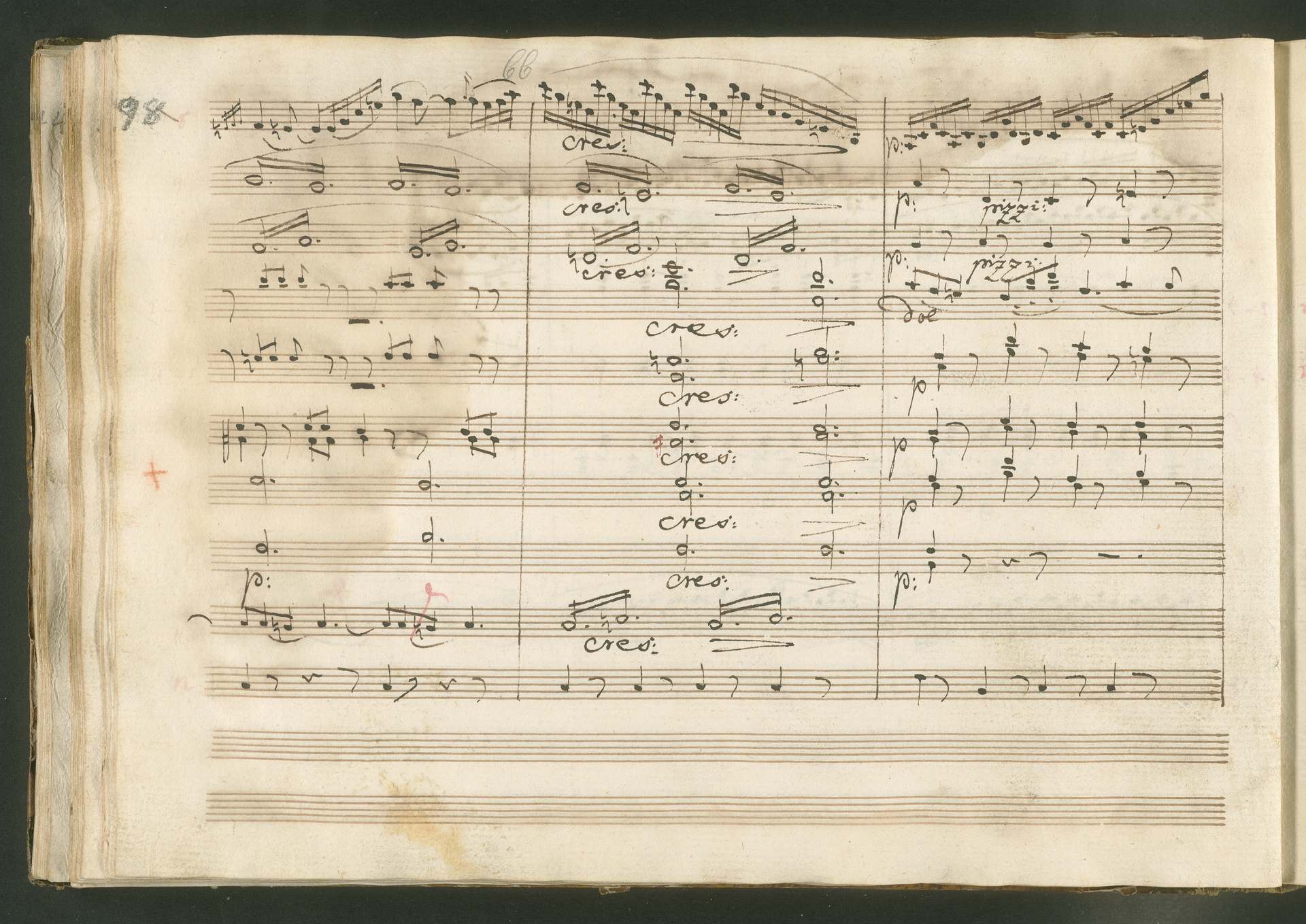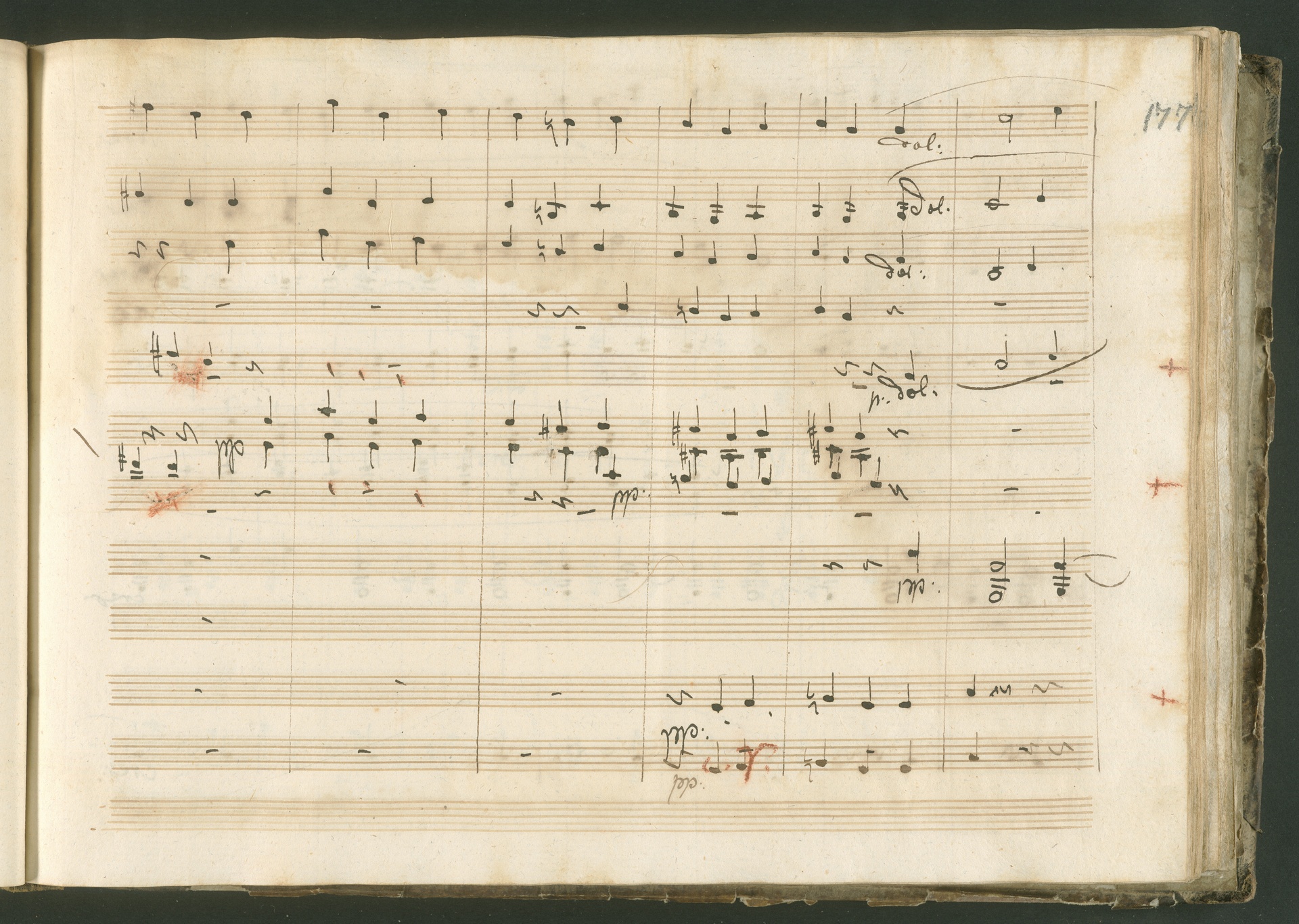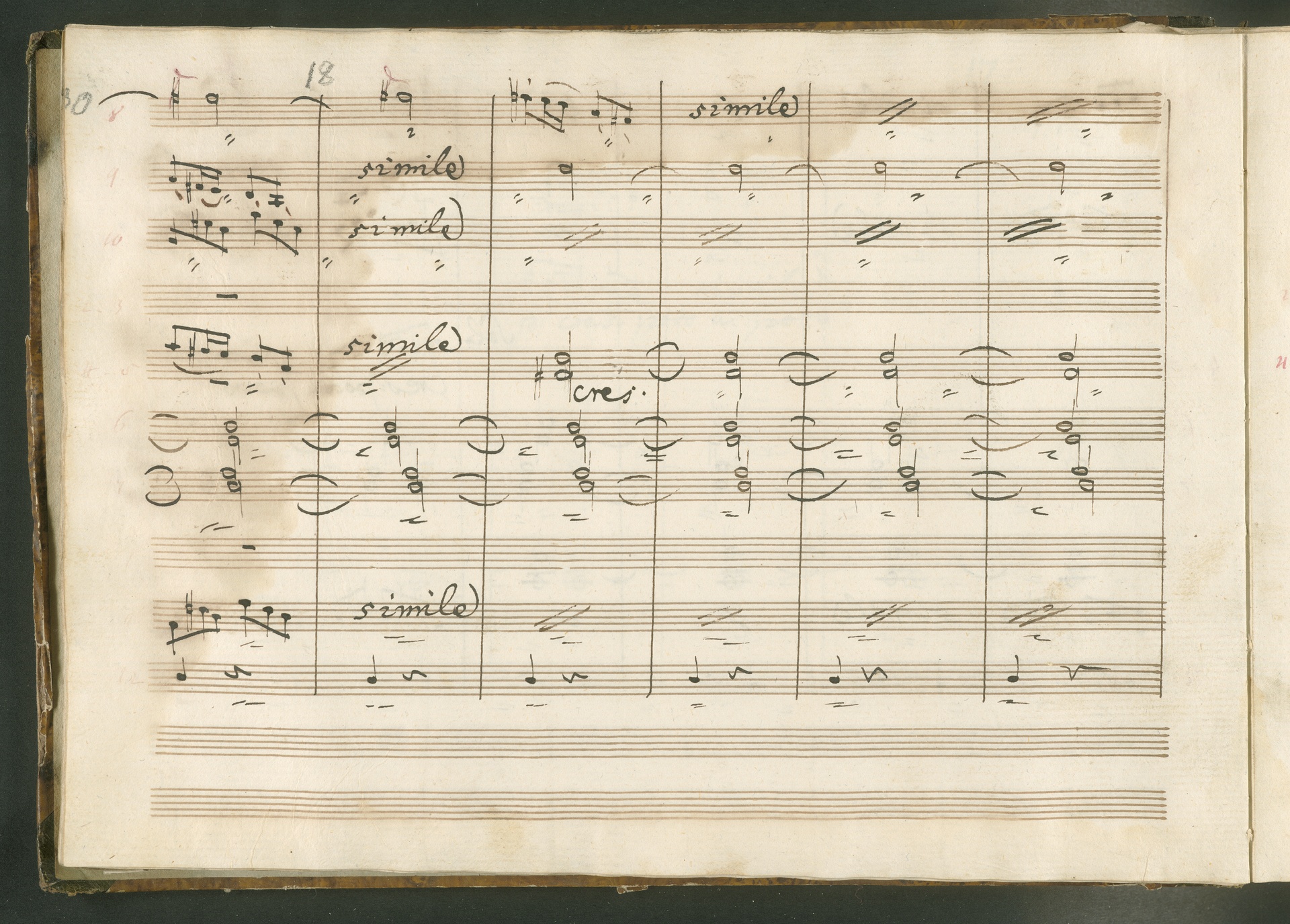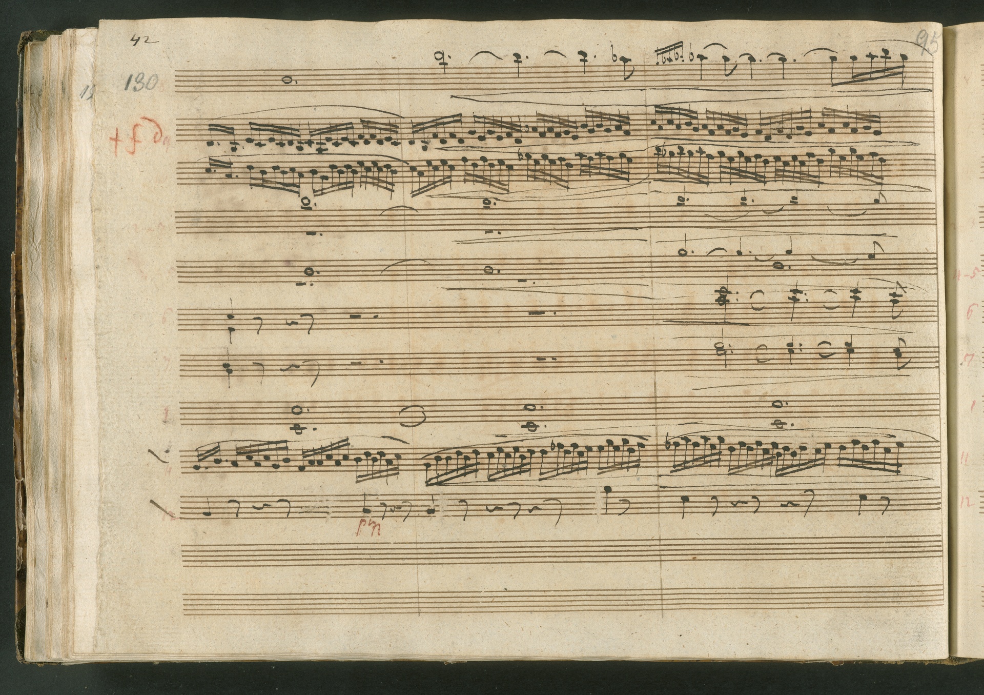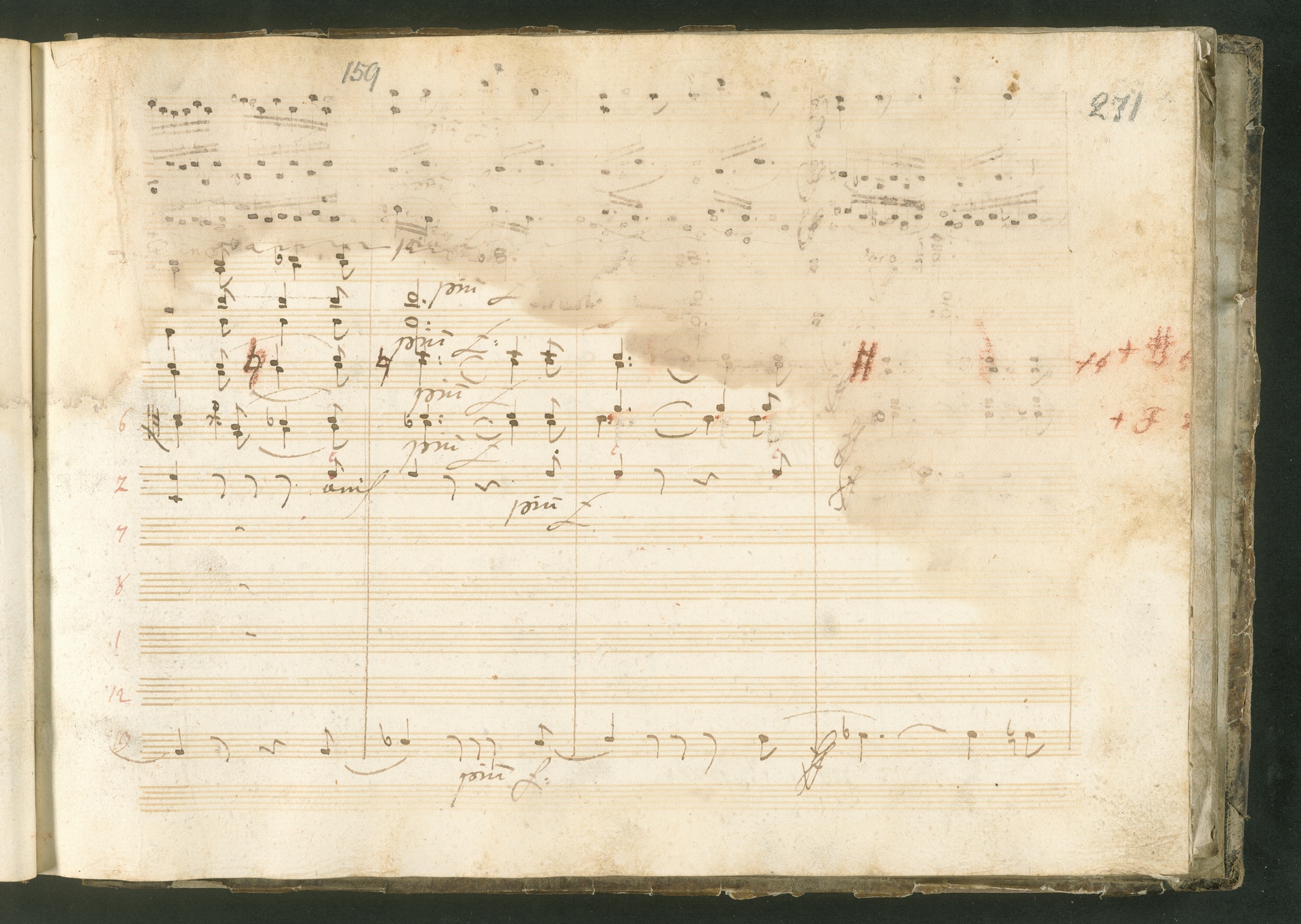 The manuscript shown here is a corrected copy of the Sixth Symphony, the "Pastoral". Beethoven sold the publisher Gottfried Christoph Härtel his Fifth and Sixth Symphonies (op. 67 und 68) in September 1808 on his visit to Vienna. The surviving correspondence shows that Beethoven did not give Härtel autograph scores but corrected copies as engraver's models for the original edition