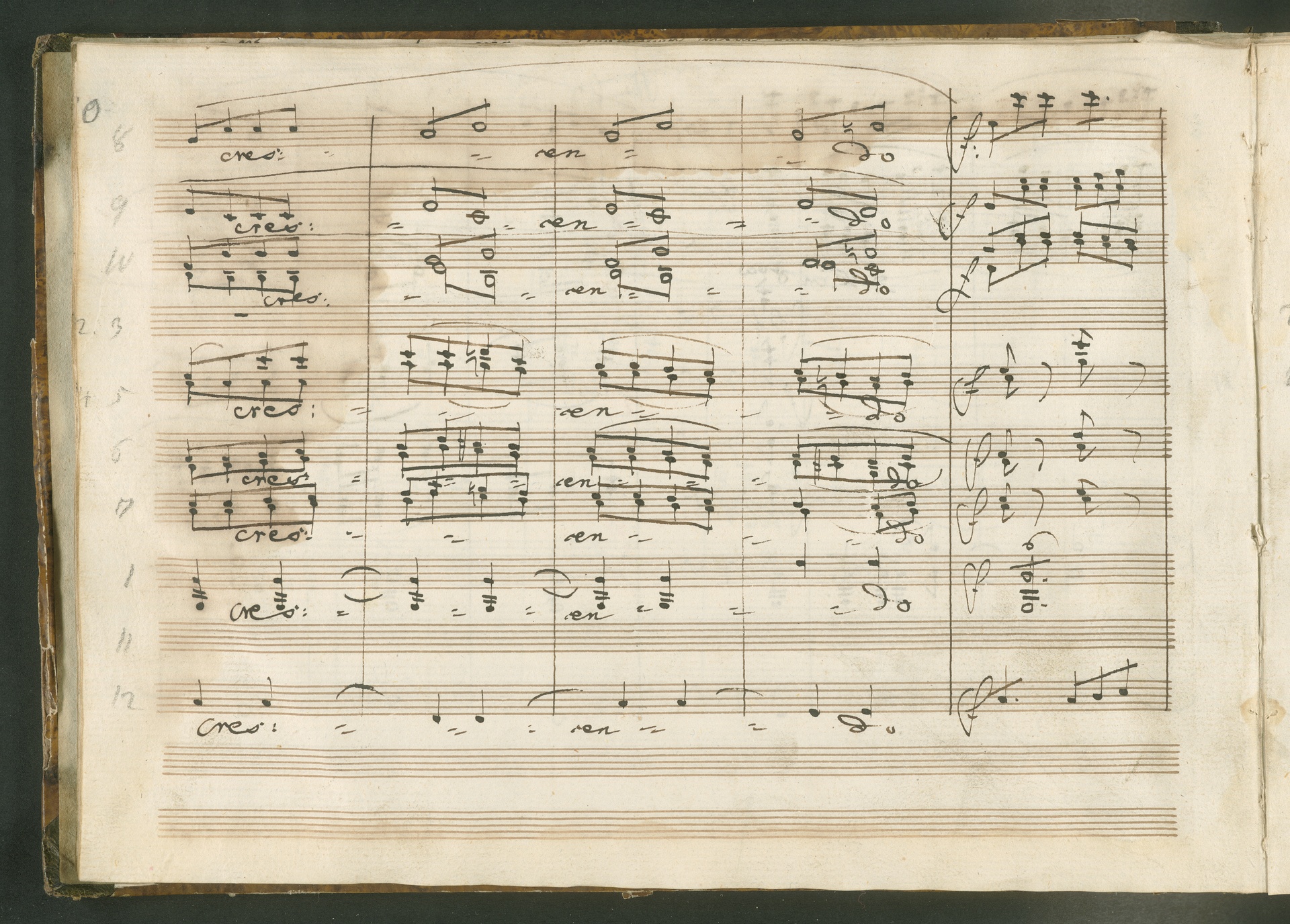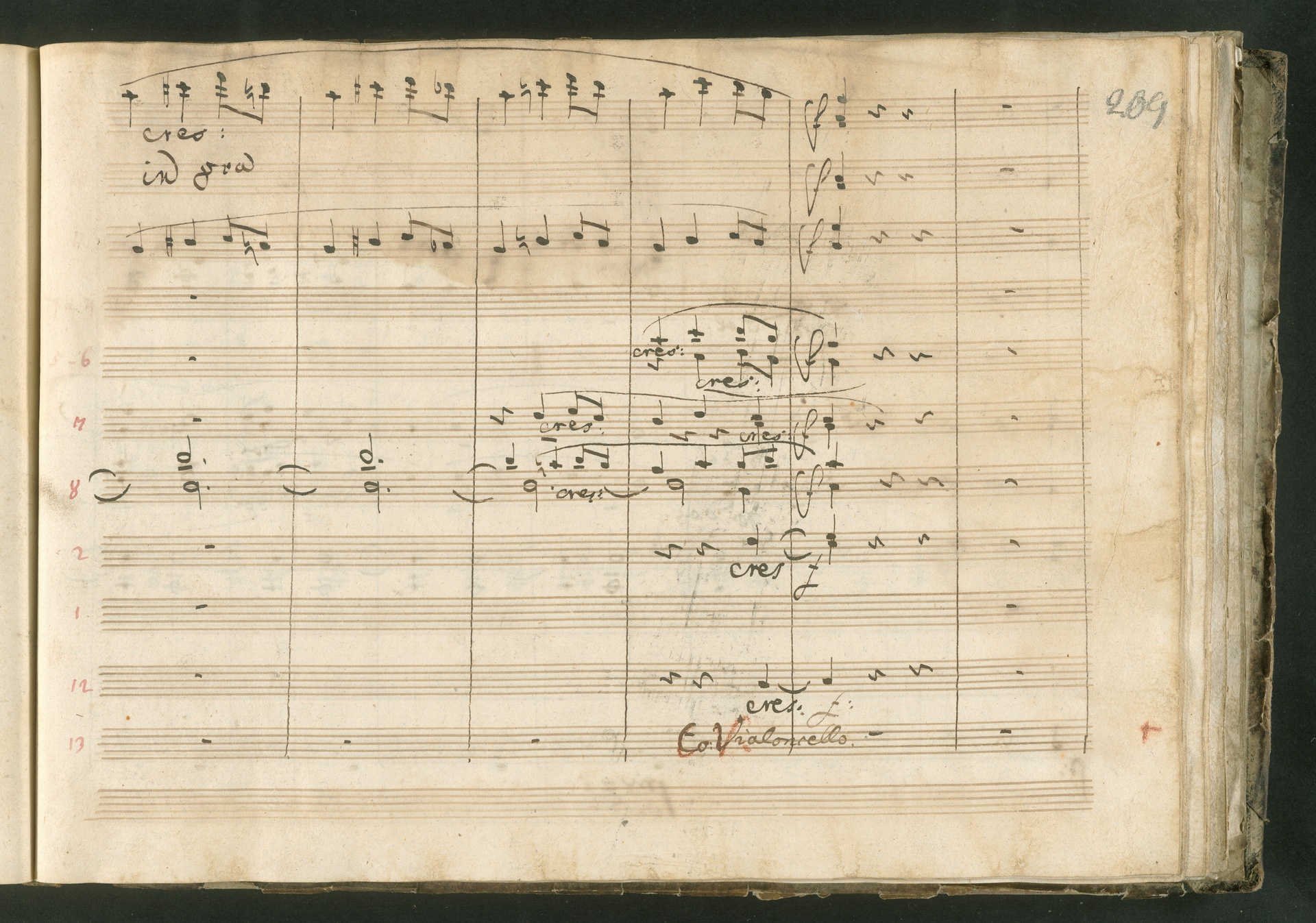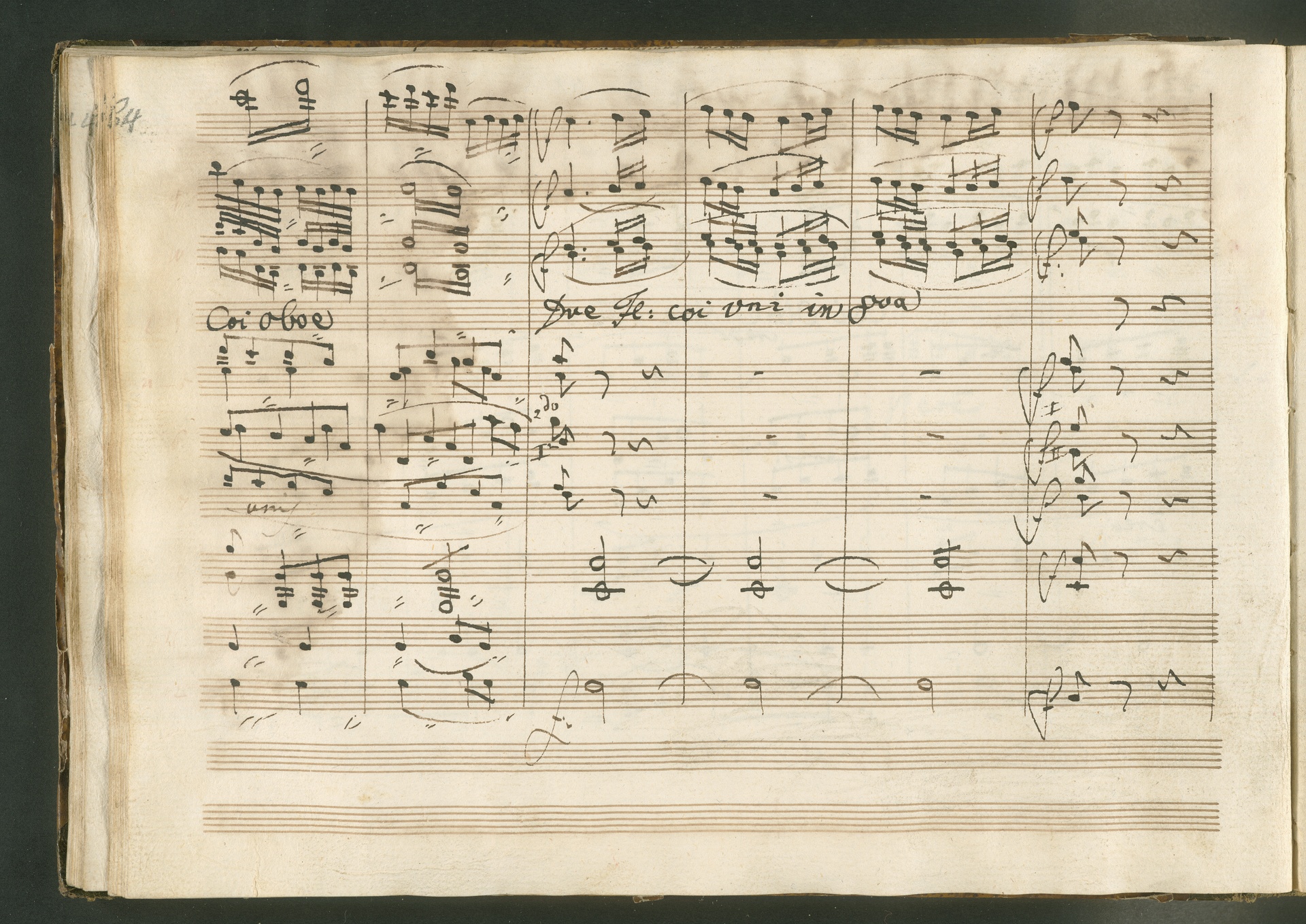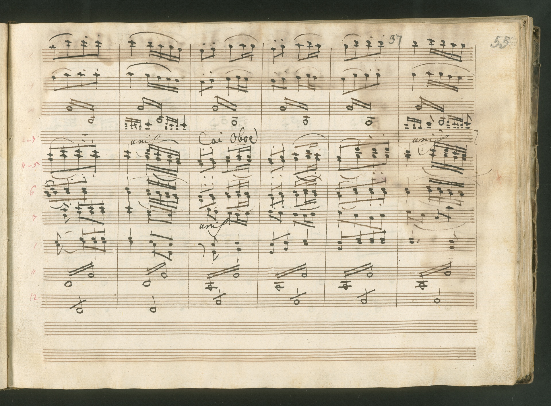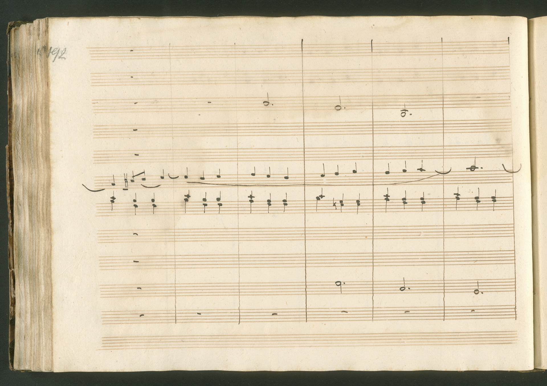 The manuscript shown here is a corrected copy of the Sixth Symphony, the "Pastoral". Beethoven sold the publisher Gottfried Christoph Härtel his Fifth and Sixth Symphonies (op. 67 und 68) in September 1808 on his visit to Vienna. The surviving correspondence shows that Beethoven did not give Härtel autograph scores but corrected copies as engraver's models for the original edition