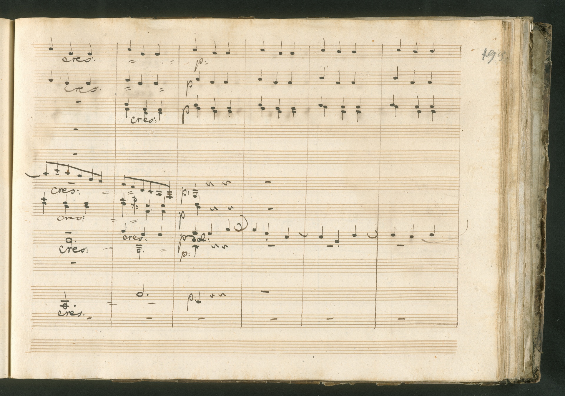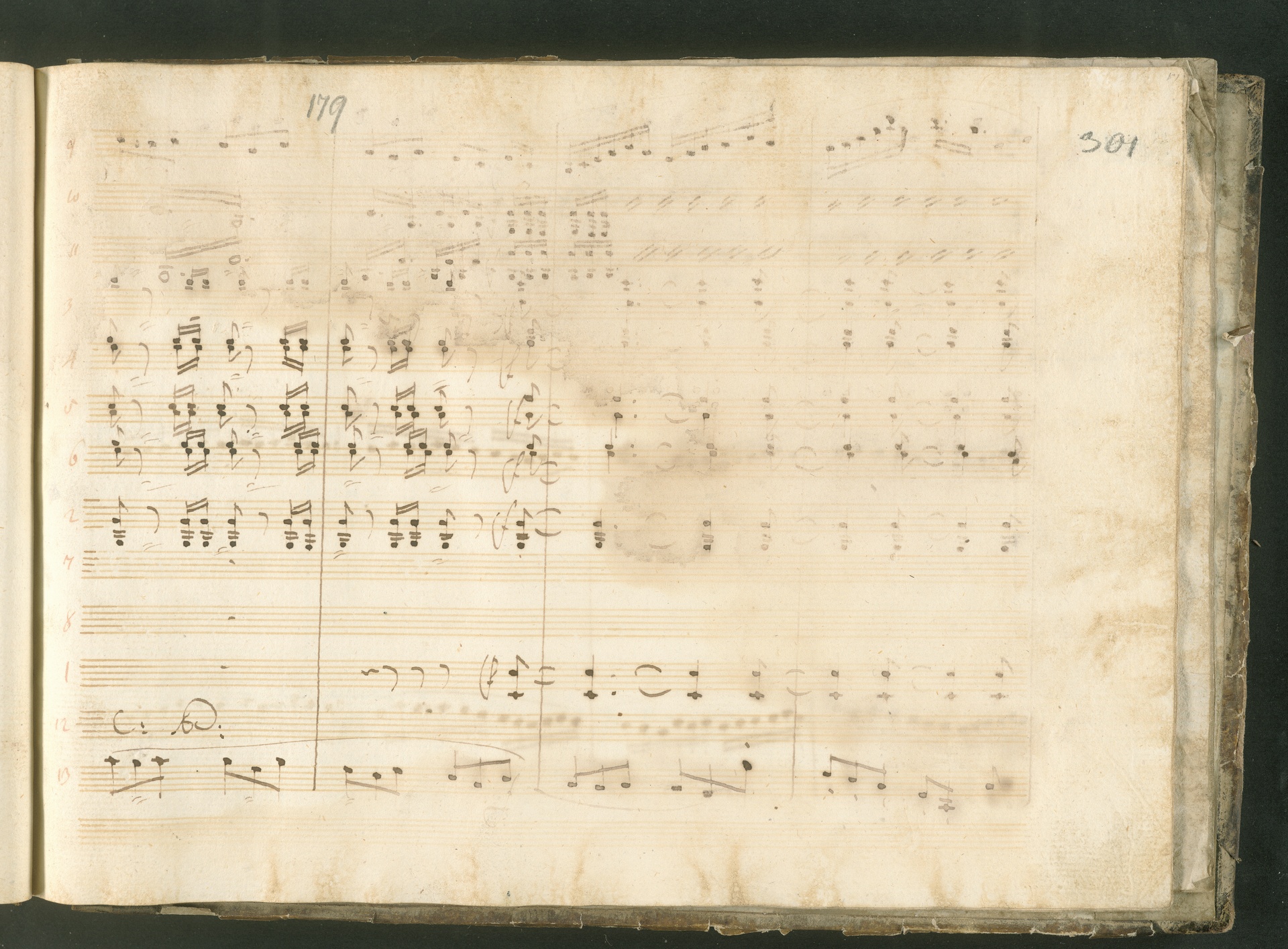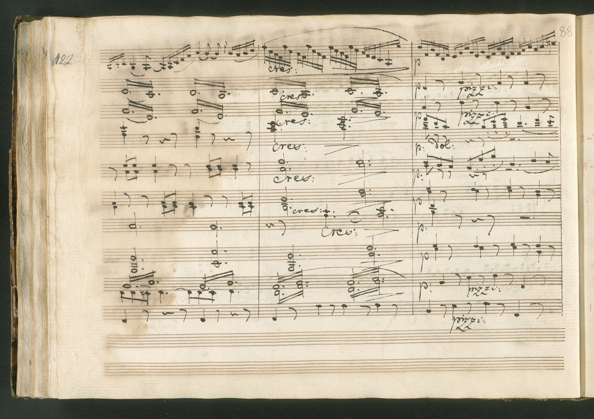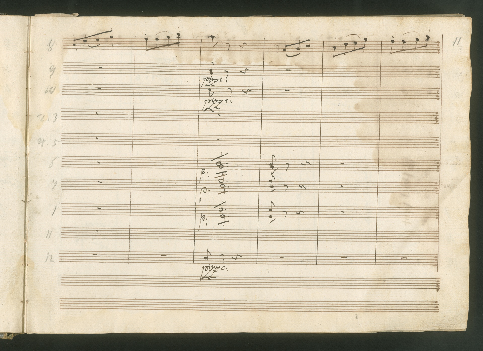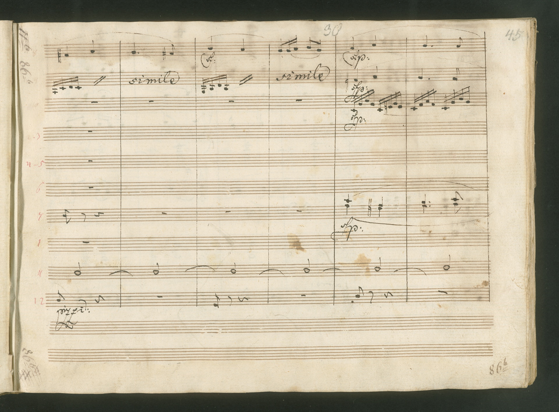 The manuscript shown here is a corrected copy of the Sixth Symphony, the "Pastoral". Beethoven sold the publisher Gottfried Christoph Härtel his Fifth and Sixth Symphonies (op. 67 und 68) in September 1808 on his visit to Vienna. The surviving correspondence shows that Beethoven did not give Härtel autograph scores but corrected copies as engraver's models for the original edition