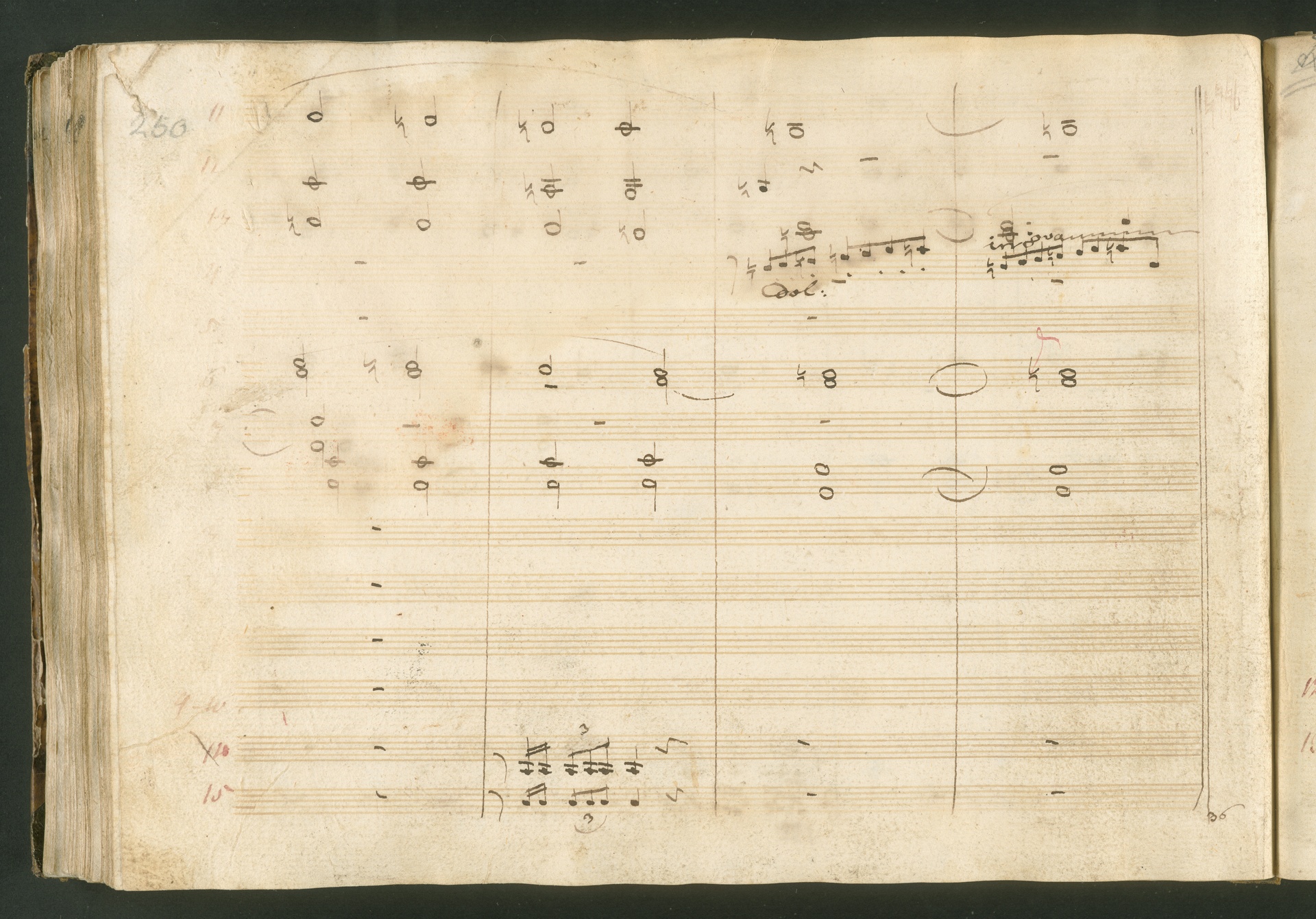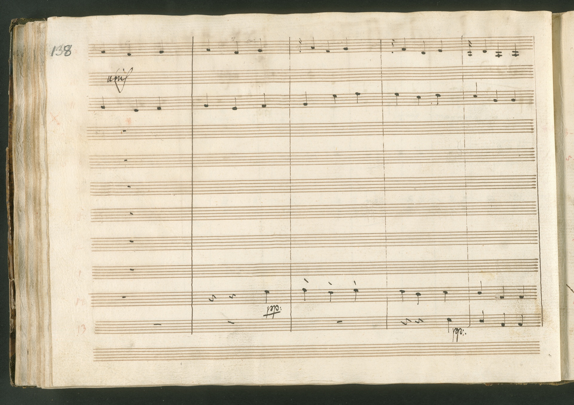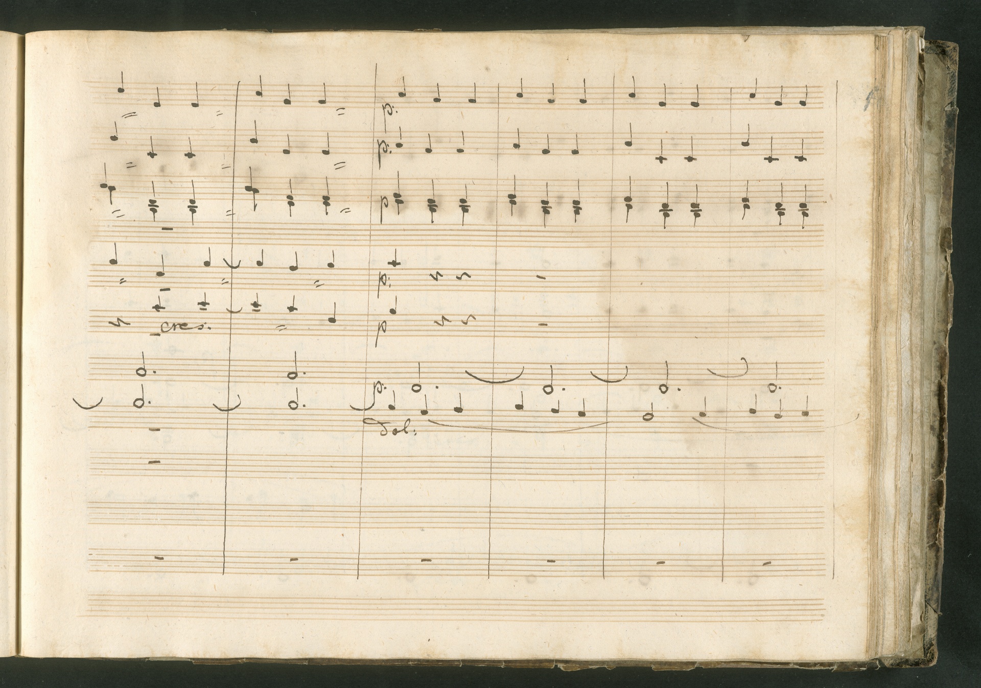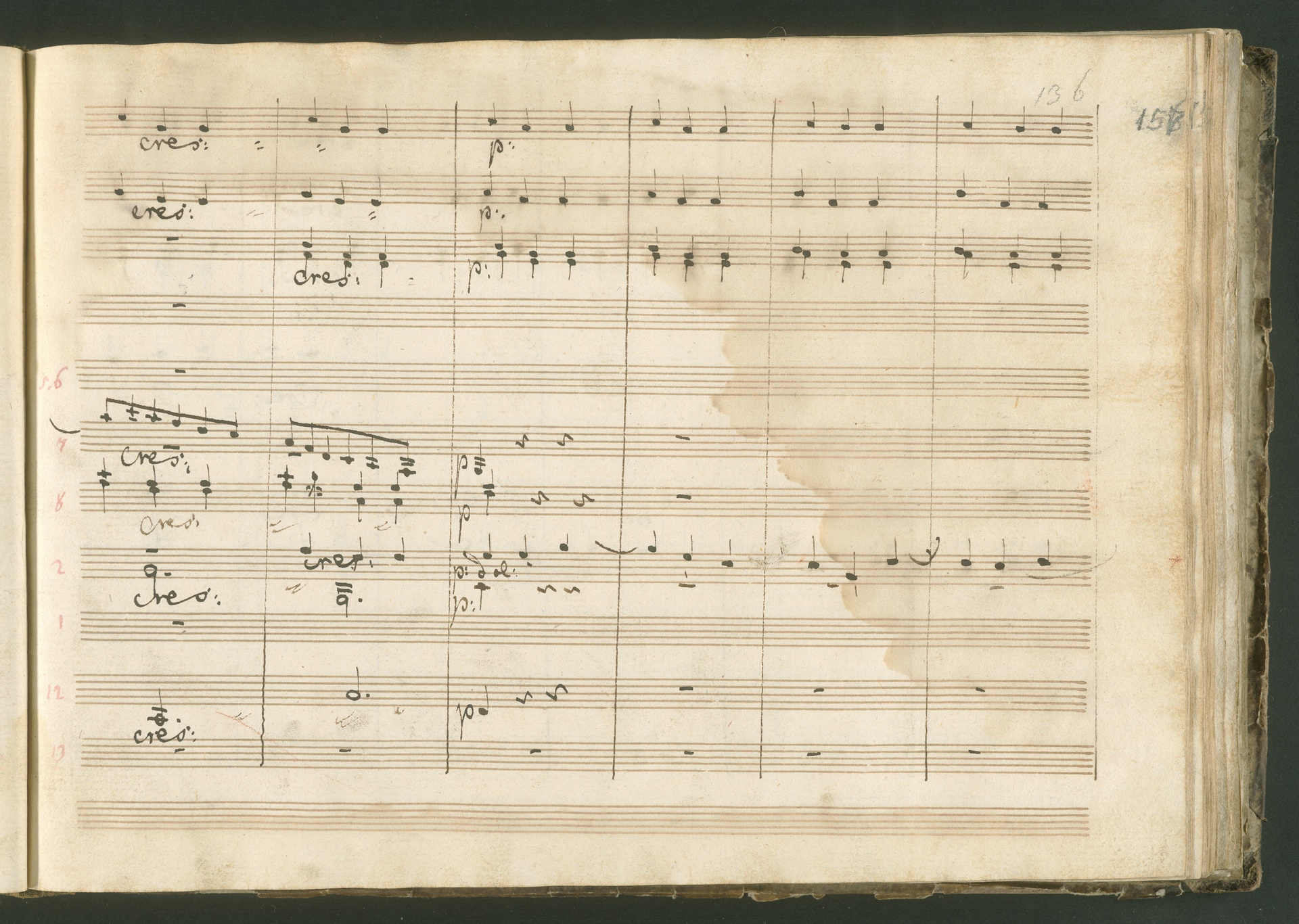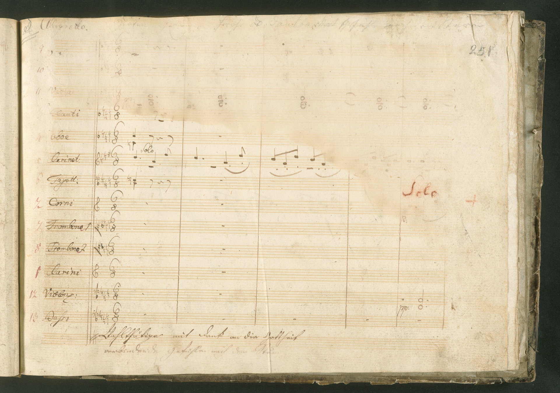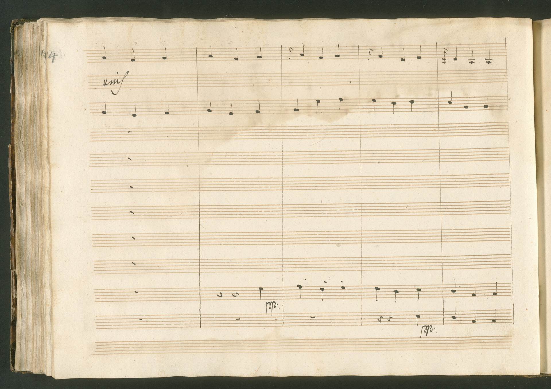 The manuscript shown here is a corrected copy of the Sixth Symphony, the "Pastoral". Beethoven sold the publisher Gottfried Christoph Härtel his Fifth and Sixth Symphonies (op. 67 und 68) in September 1808 on his visit to Vienna. The surviving correspondence shows that Beethoven did not give Härtel autograph scores but corrected copies as engraver's models for the original edition