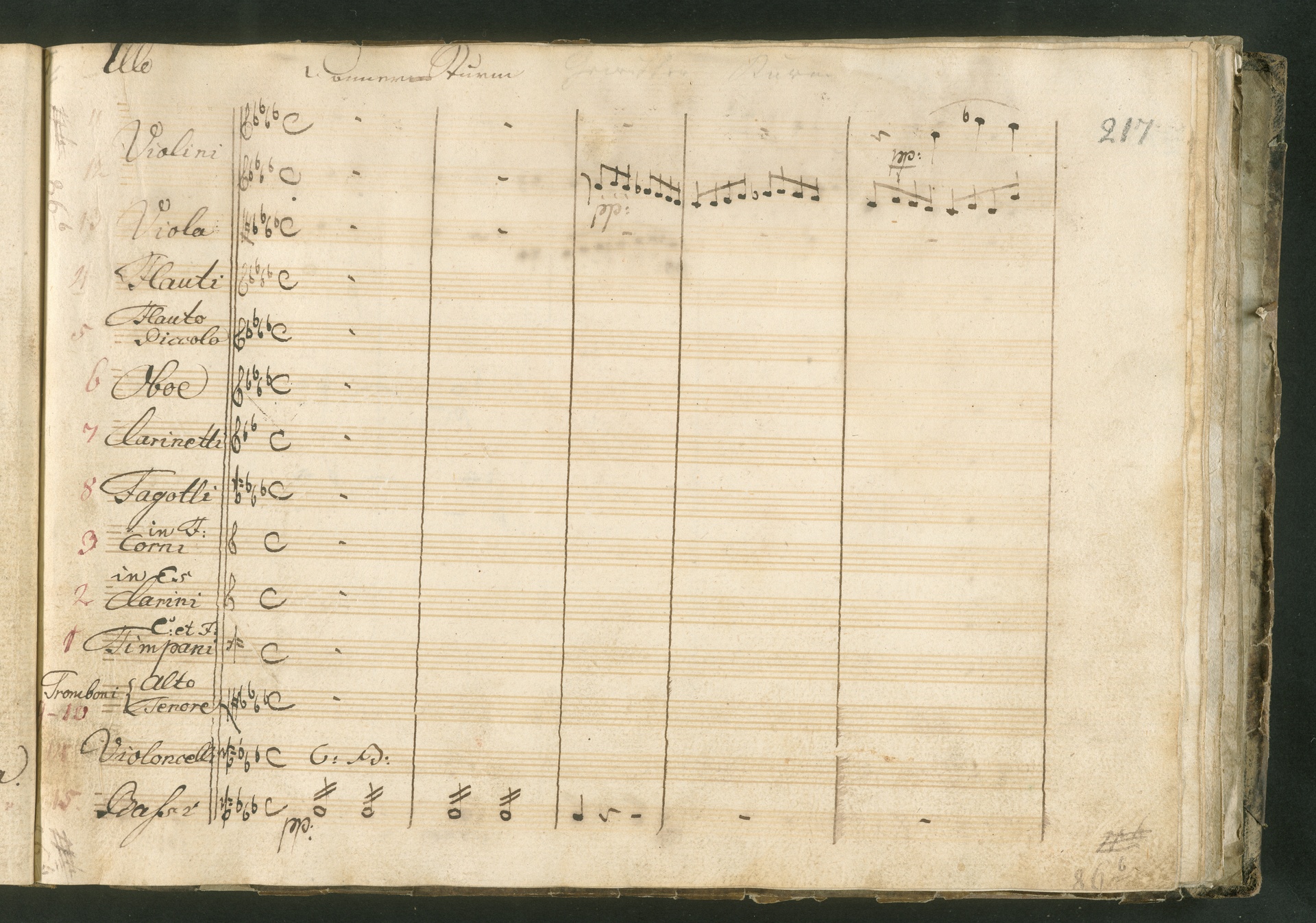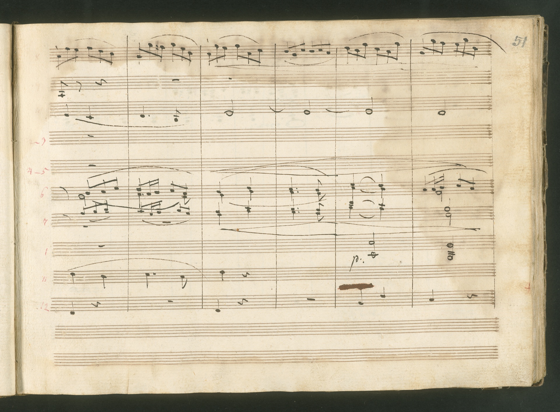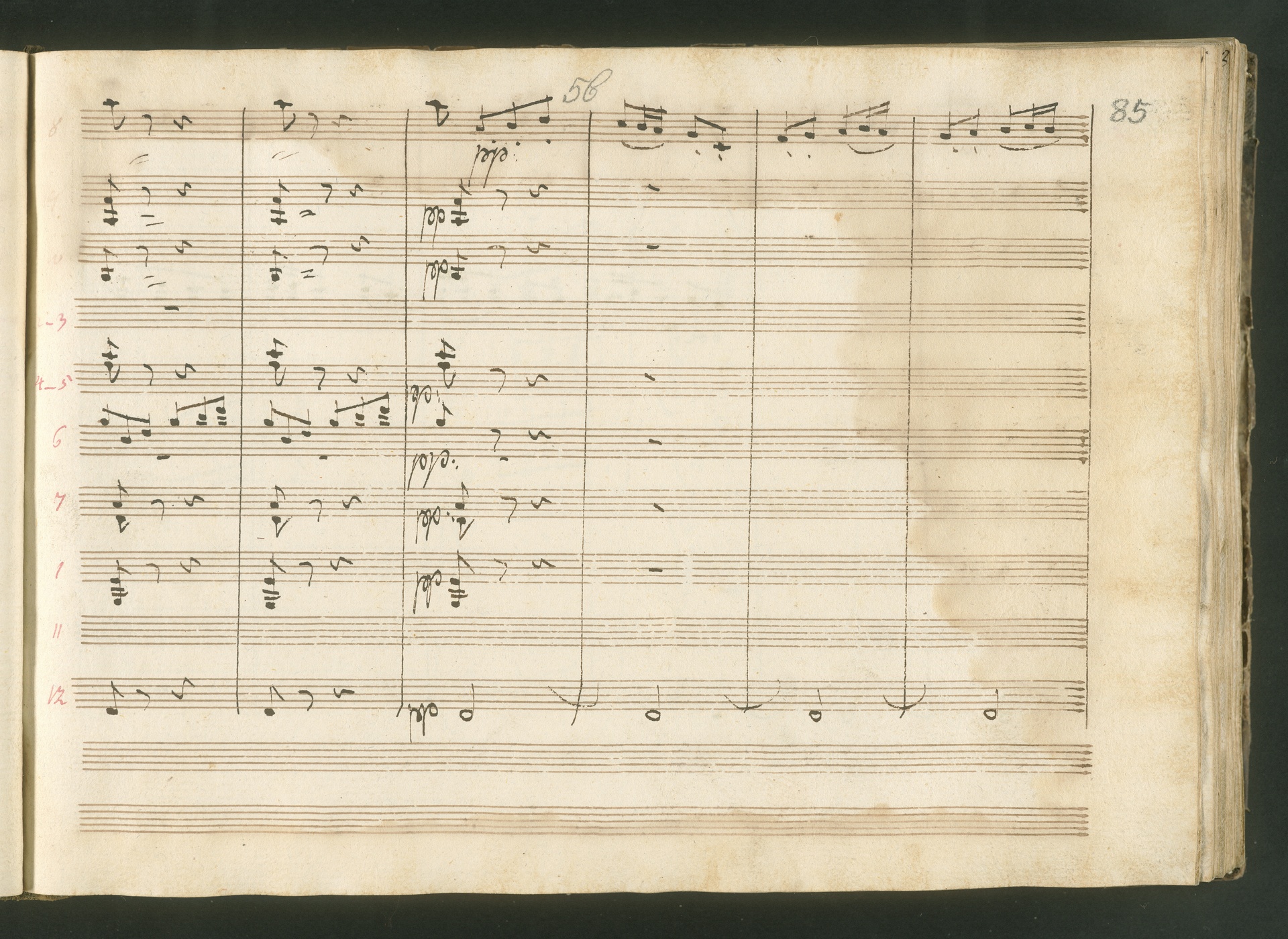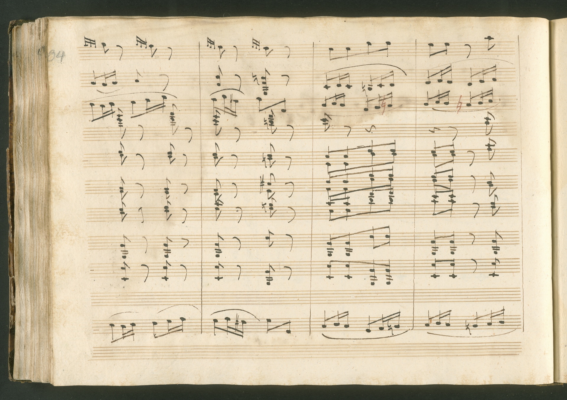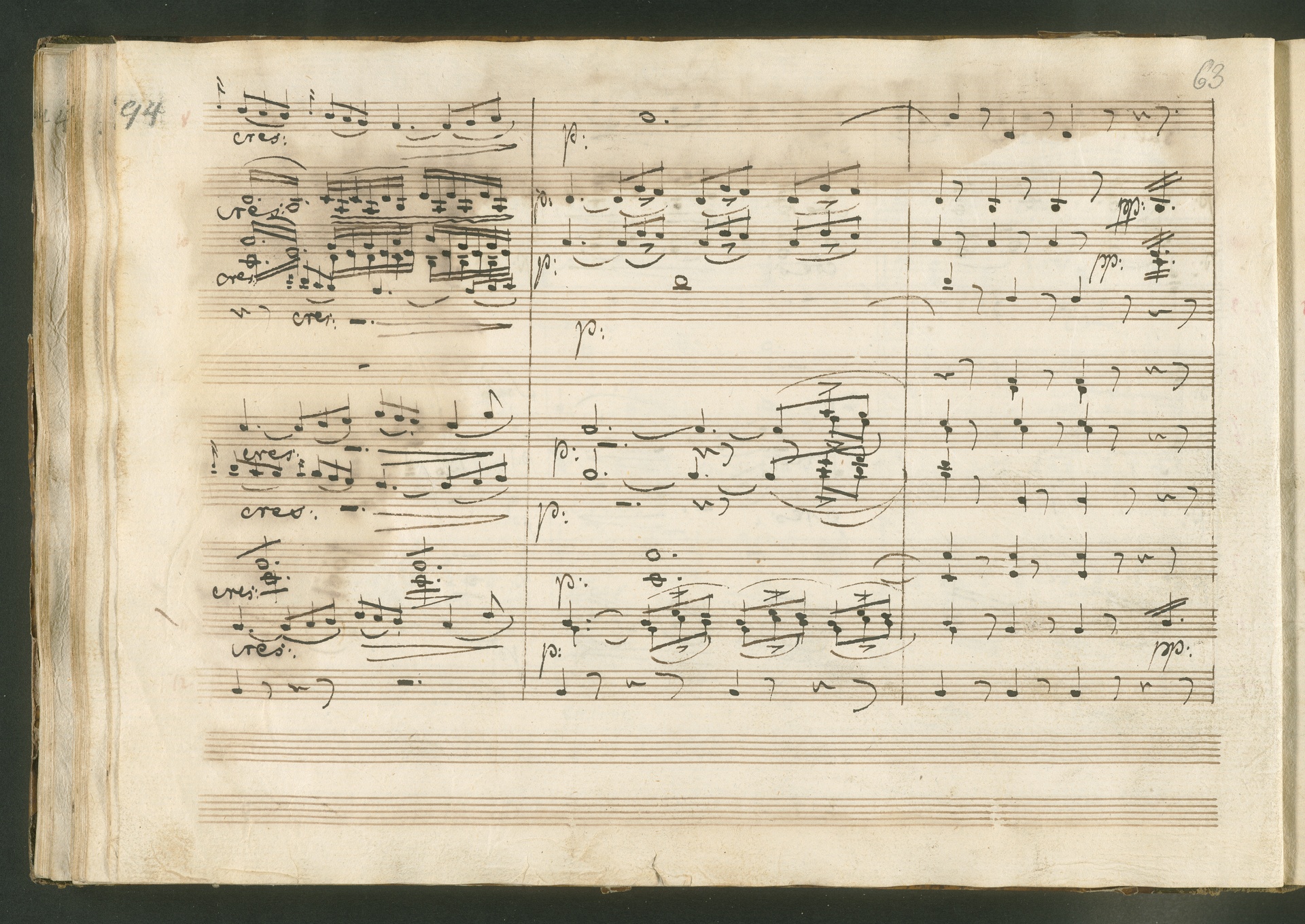 The manuscript shown here is a corrected copy of the Sixth Symphony, the "Pastoral". Beethoven sold the publisher Gottfried Christoph Härtel his Fifth and Sixth Symphonies (op. 67 und 68) in September 1808 on his visit to Vienna. The surviving correspondence shows that Beethoven did not give Härtel autograph scores but corrected copies as engraver's models for the original edition