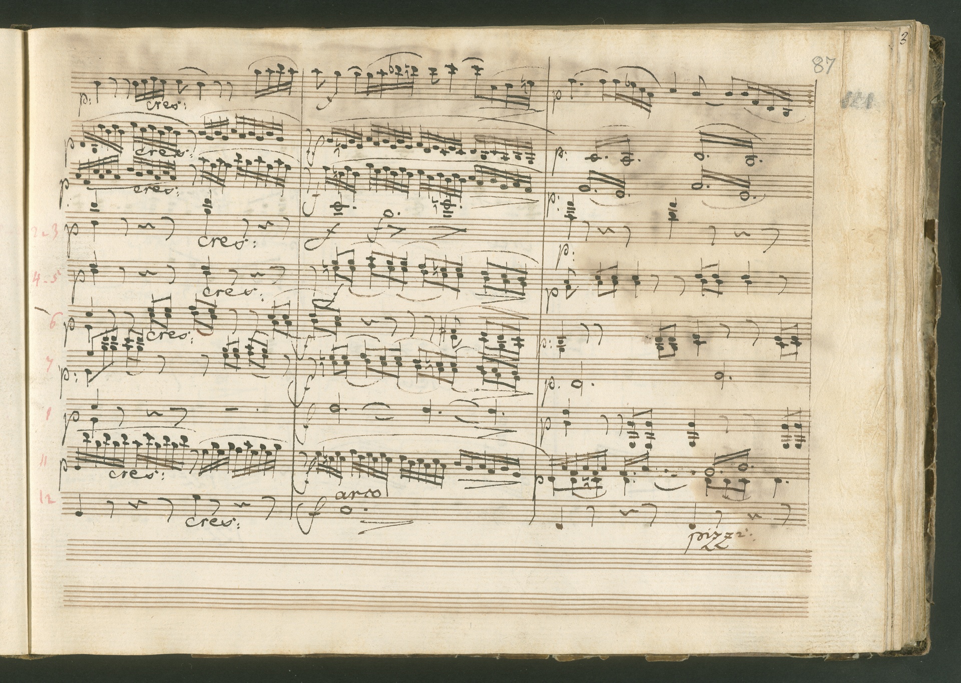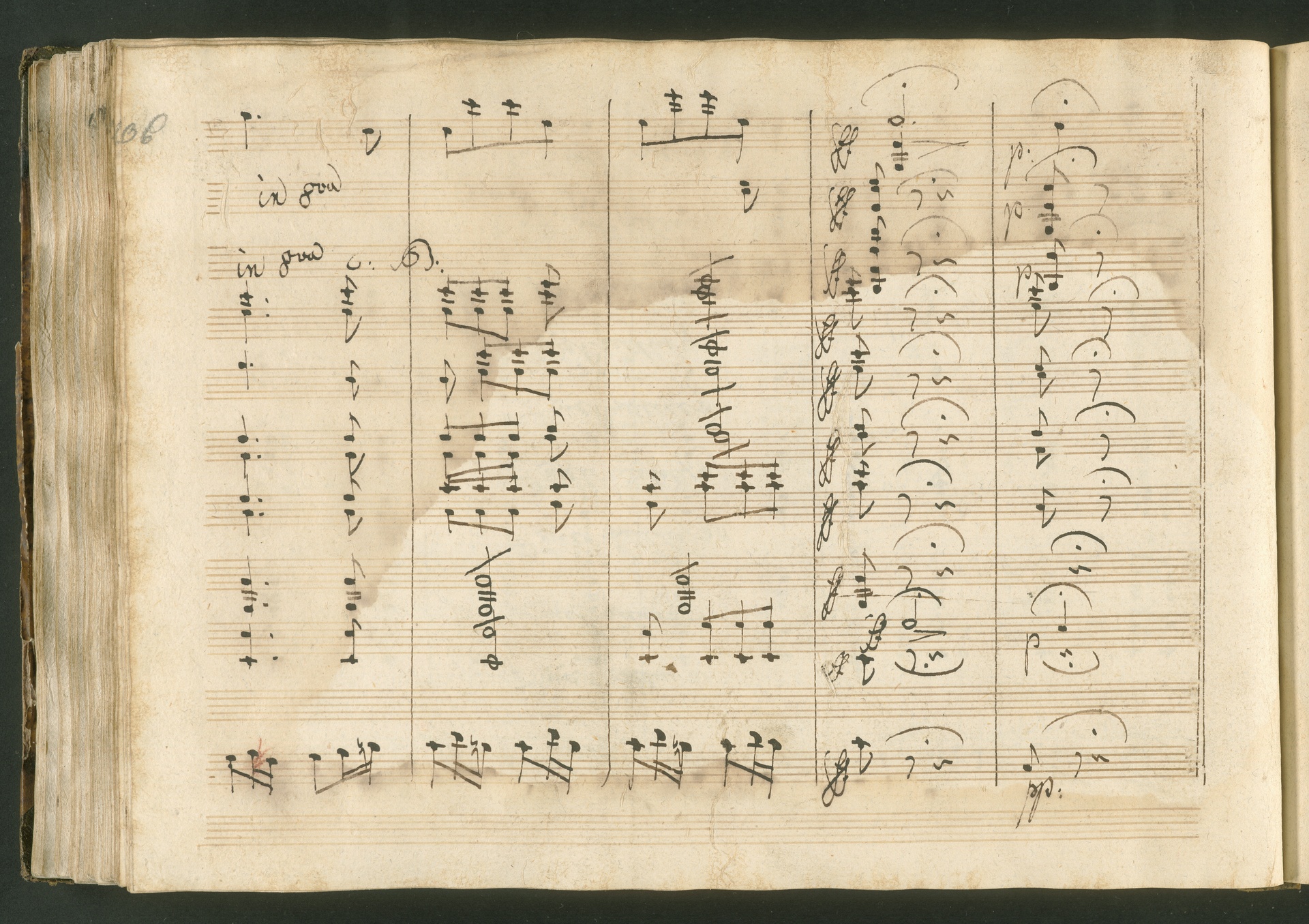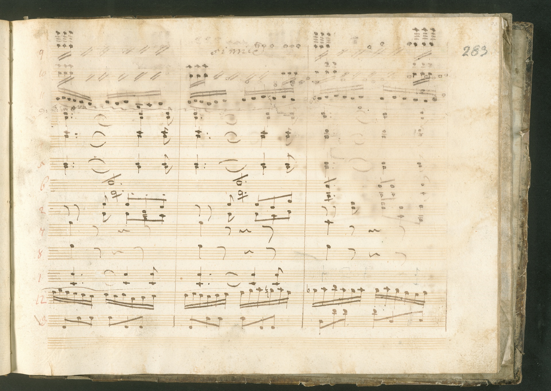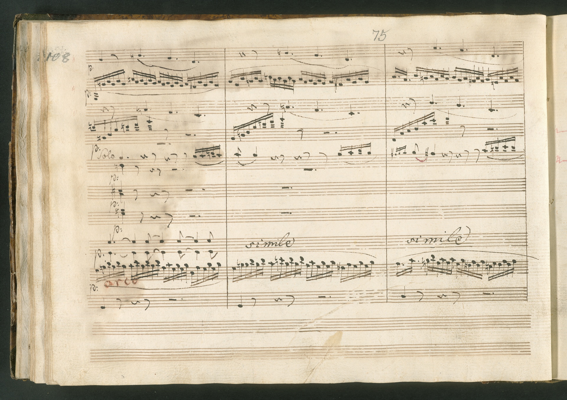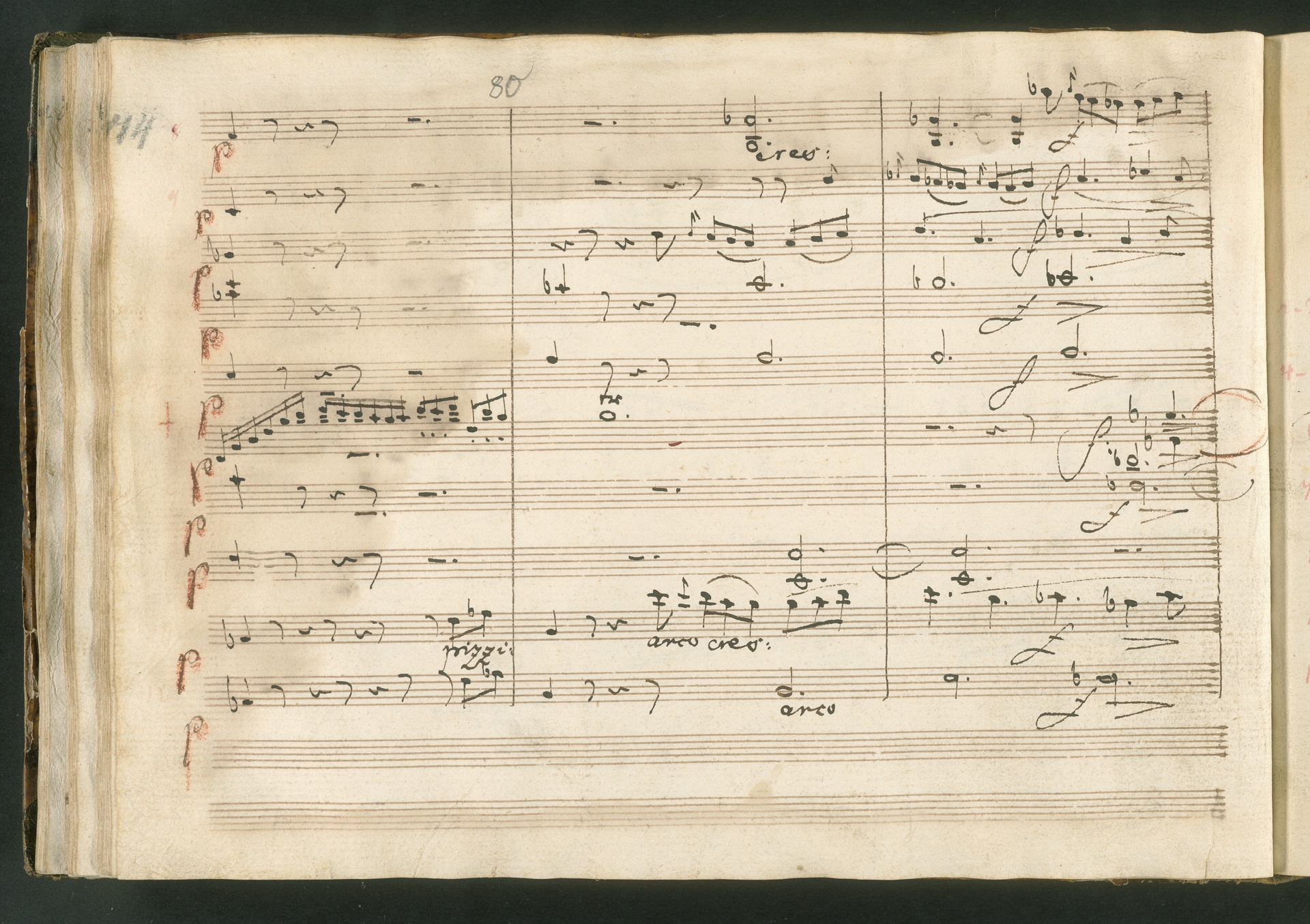 The manuscript shown here is a corrected copy of the Sixth Symphony, the "Pastoral". Beethoven sold the publisher Gottfried Christoph Härtel his Fifth and Sixth Symphonies (op. 67 und 68) in September 1808 on his visit to Vienna. The surviving correspondence shows that Beethoven did not give Härtel autograph scores but corrected copies as engraver's models for the original edition