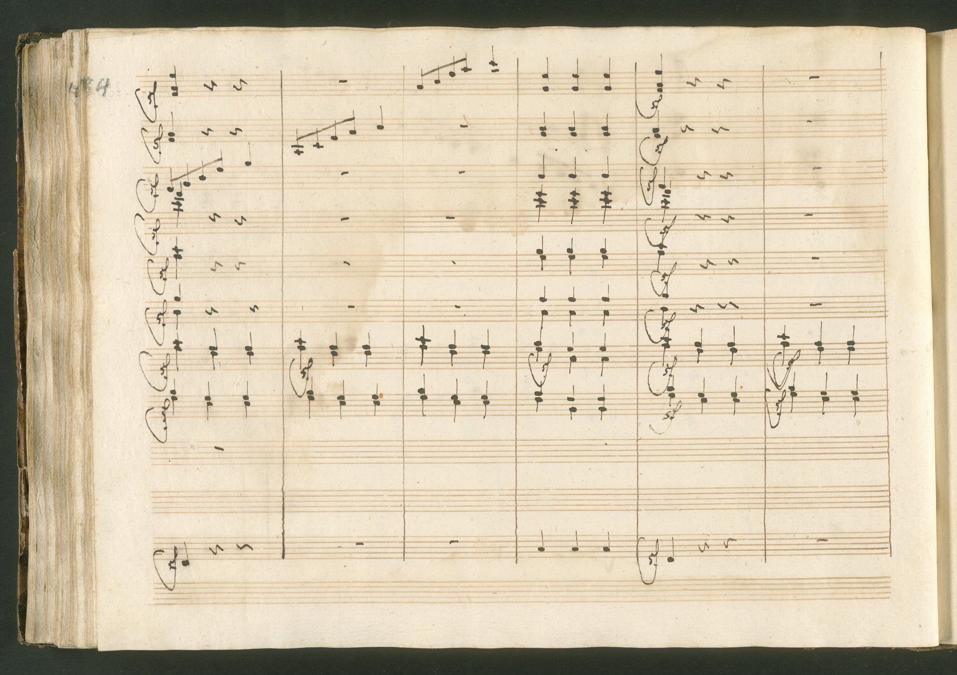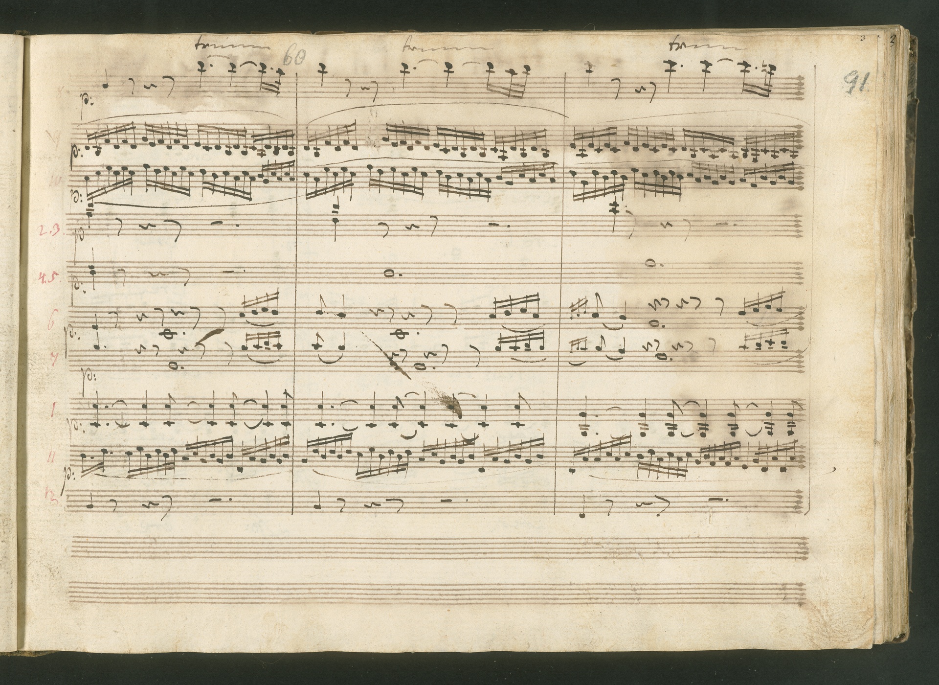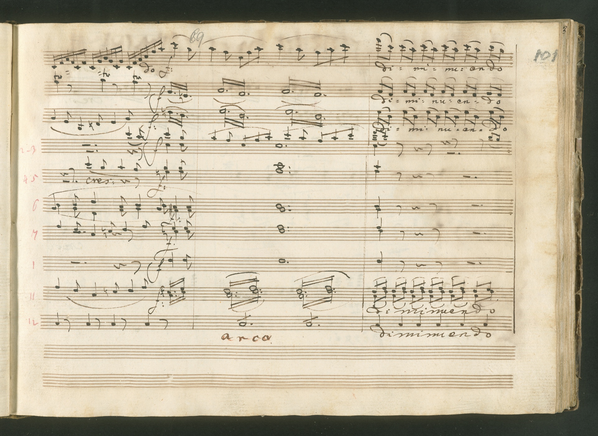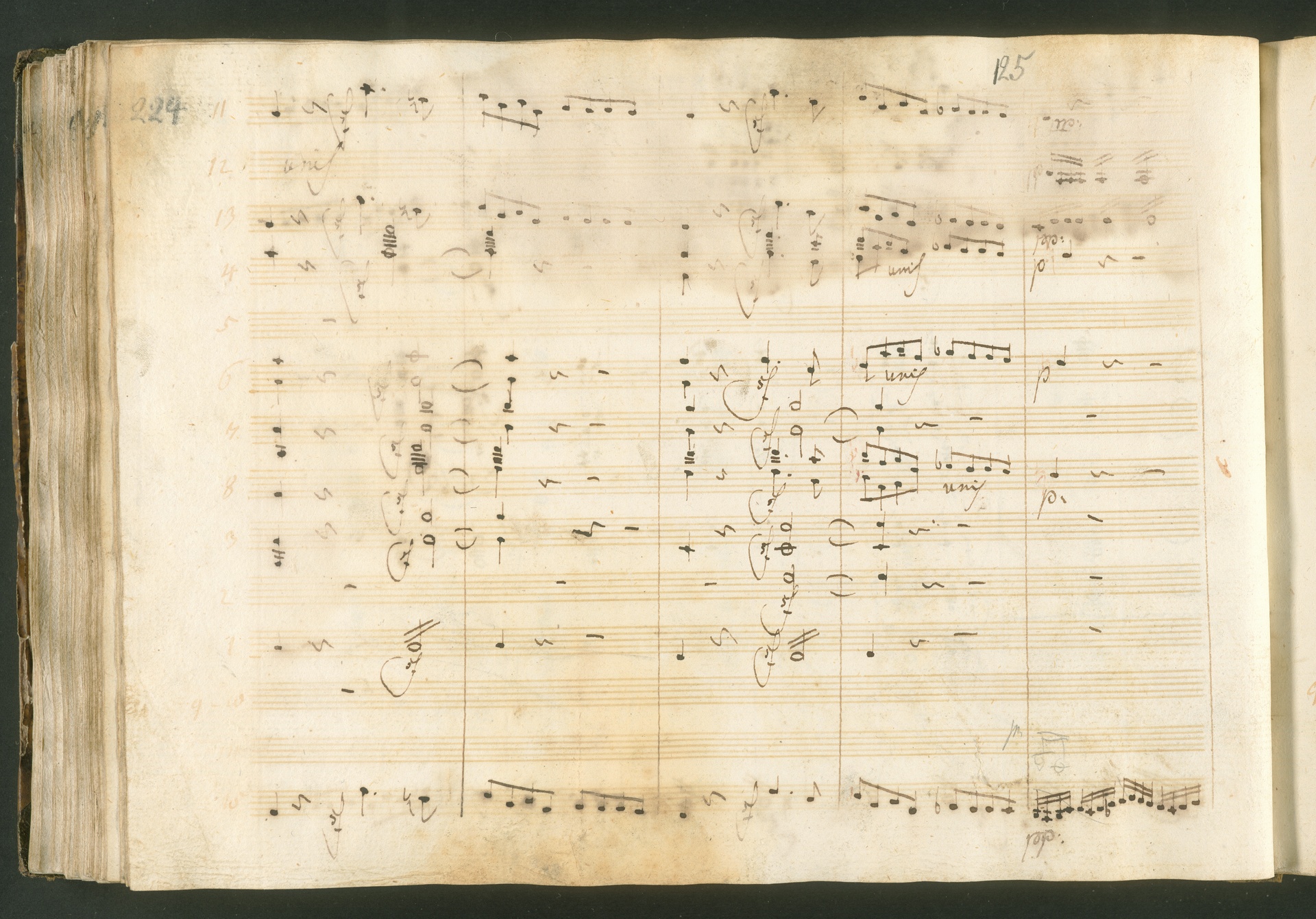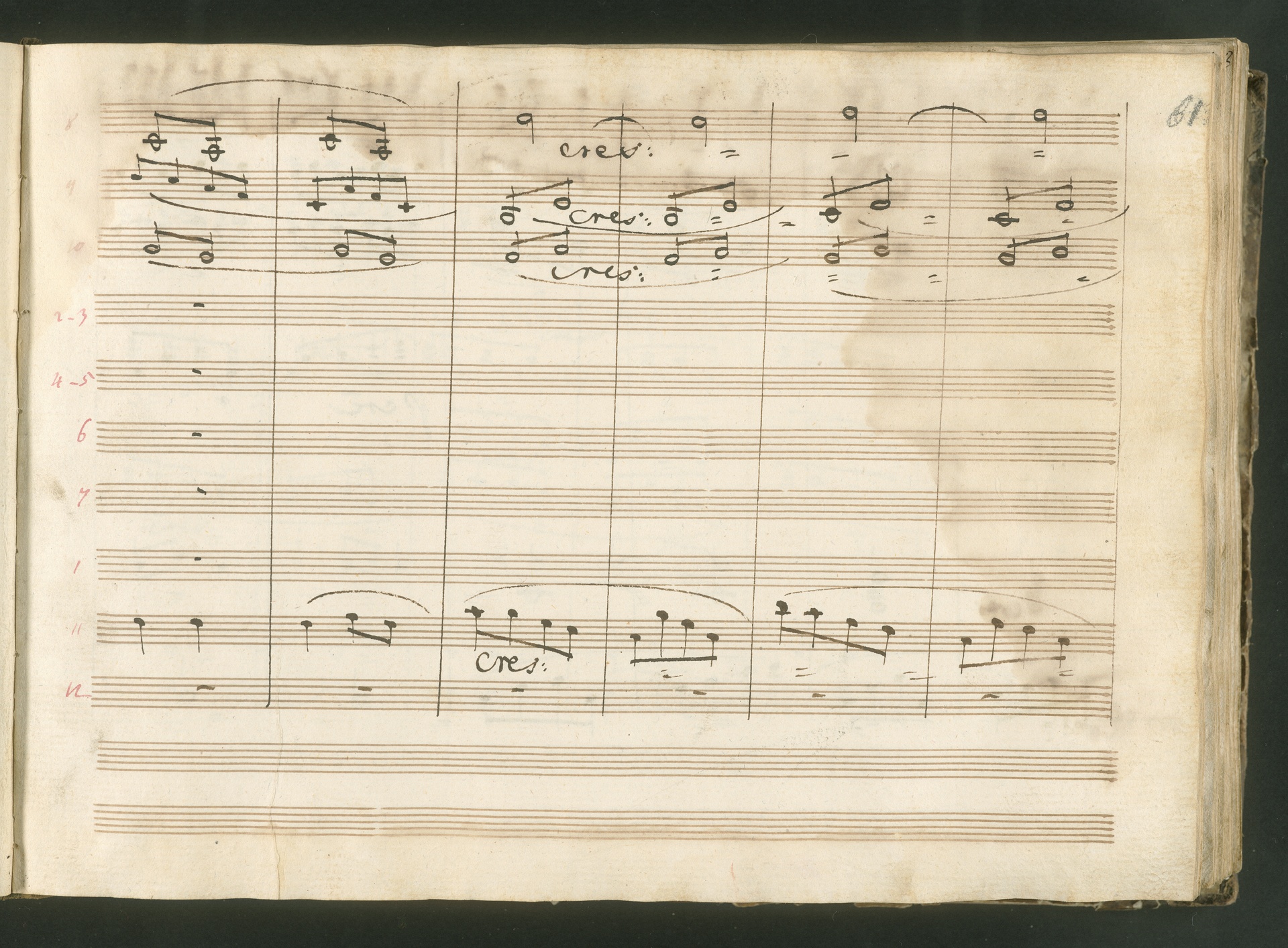 The manuscript shown here is a corrected copy of the Sixth Symphony, the "Pastoral". Beethoven sold the publisher Gottfried Christoph Härtel his Fifth and Sixth Symphonies (op. 67 und 68) in September 1808 on his visit to Vienna. The surviving correspondence shows that Beethoven did not give Härtel autograph scores but corrected copies as engraver's models for the original edition