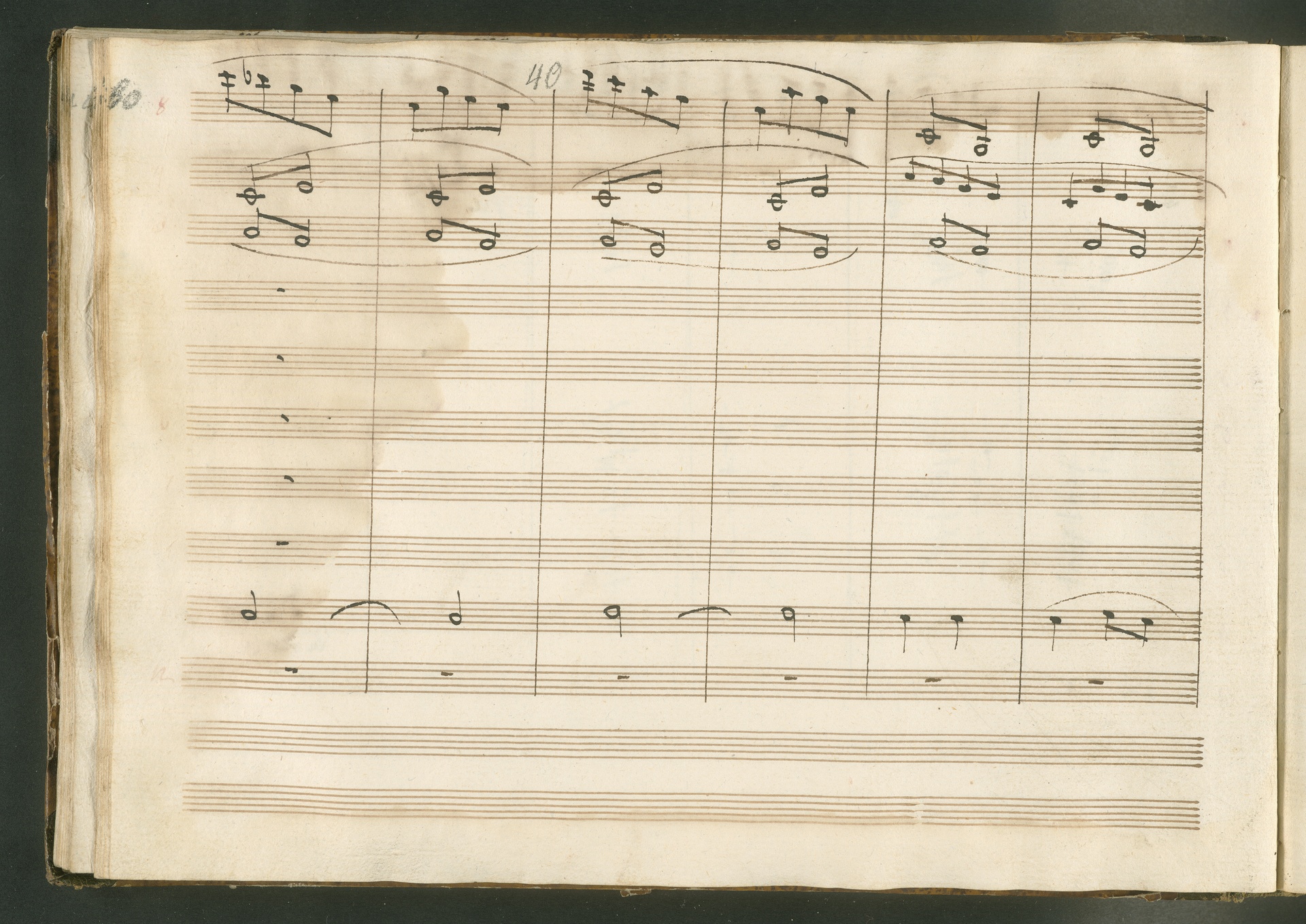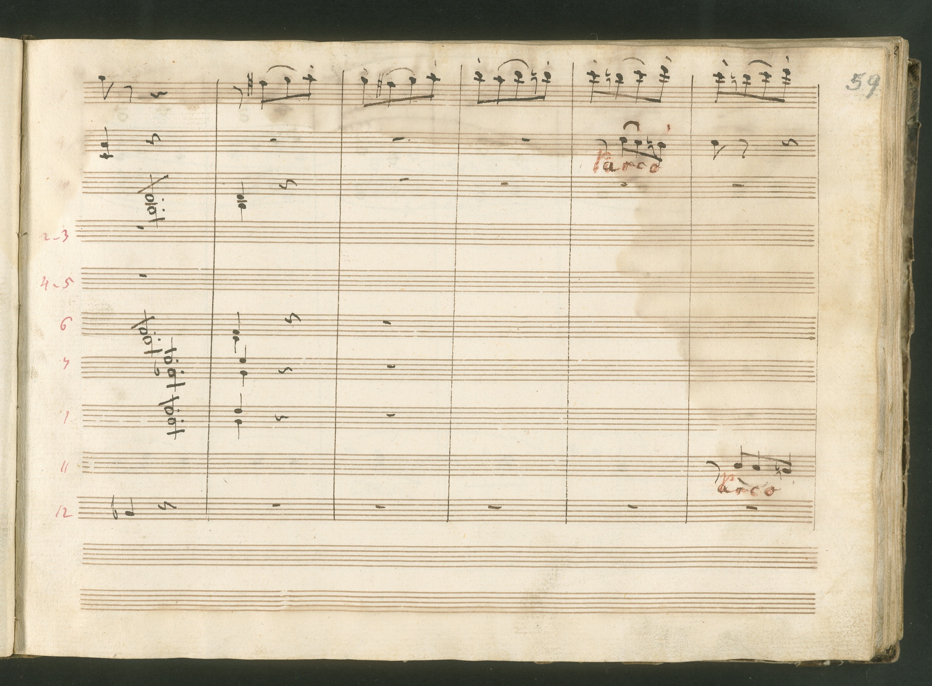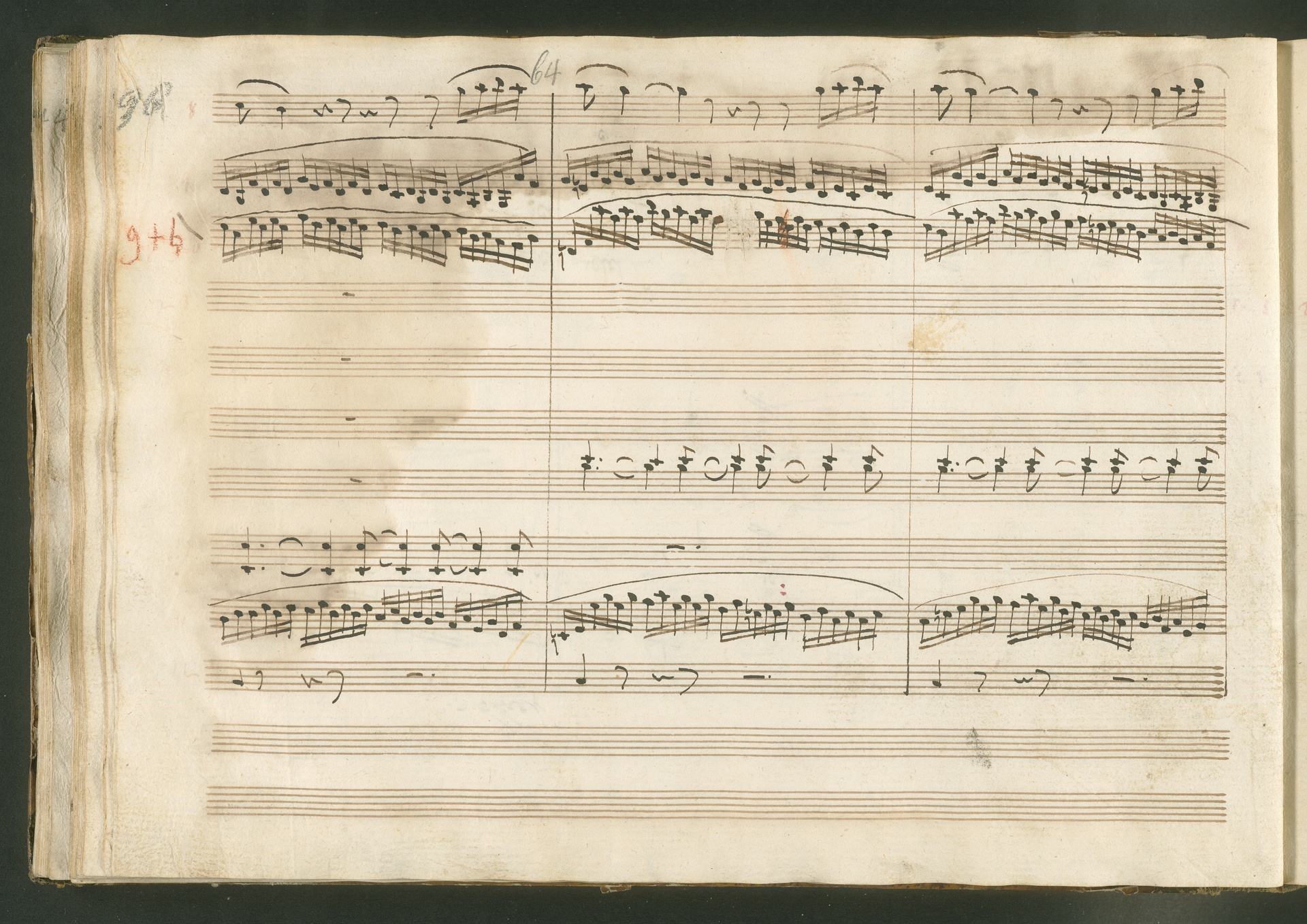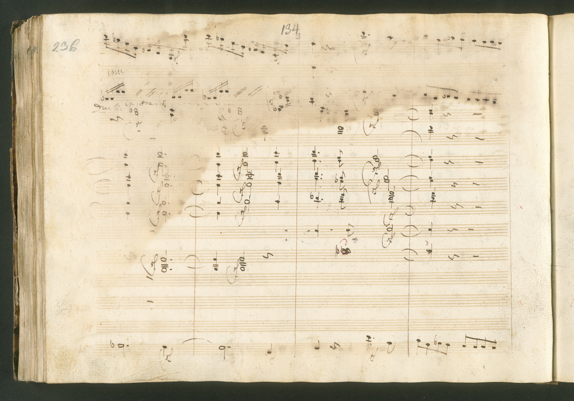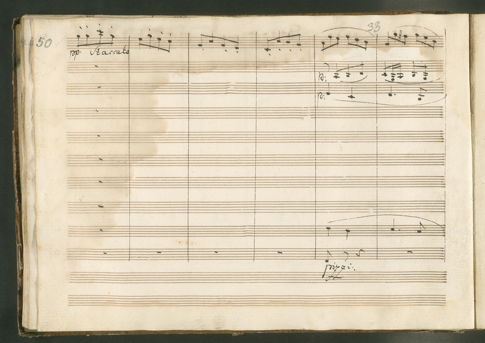 The manuscript shown here is a corrected copy of the Sixth Symphony, the "Pastoral". Beethoven sold the publisher Gottfried Christoph Härtel his Fifth and Sixth Symphonies (op. 67 und 68) in September 1808 on his visit to Vienna. The surviving correspondence shows that Beethoven did not give Härtel autograph scores but corrected copies as engraver's models for the original edition