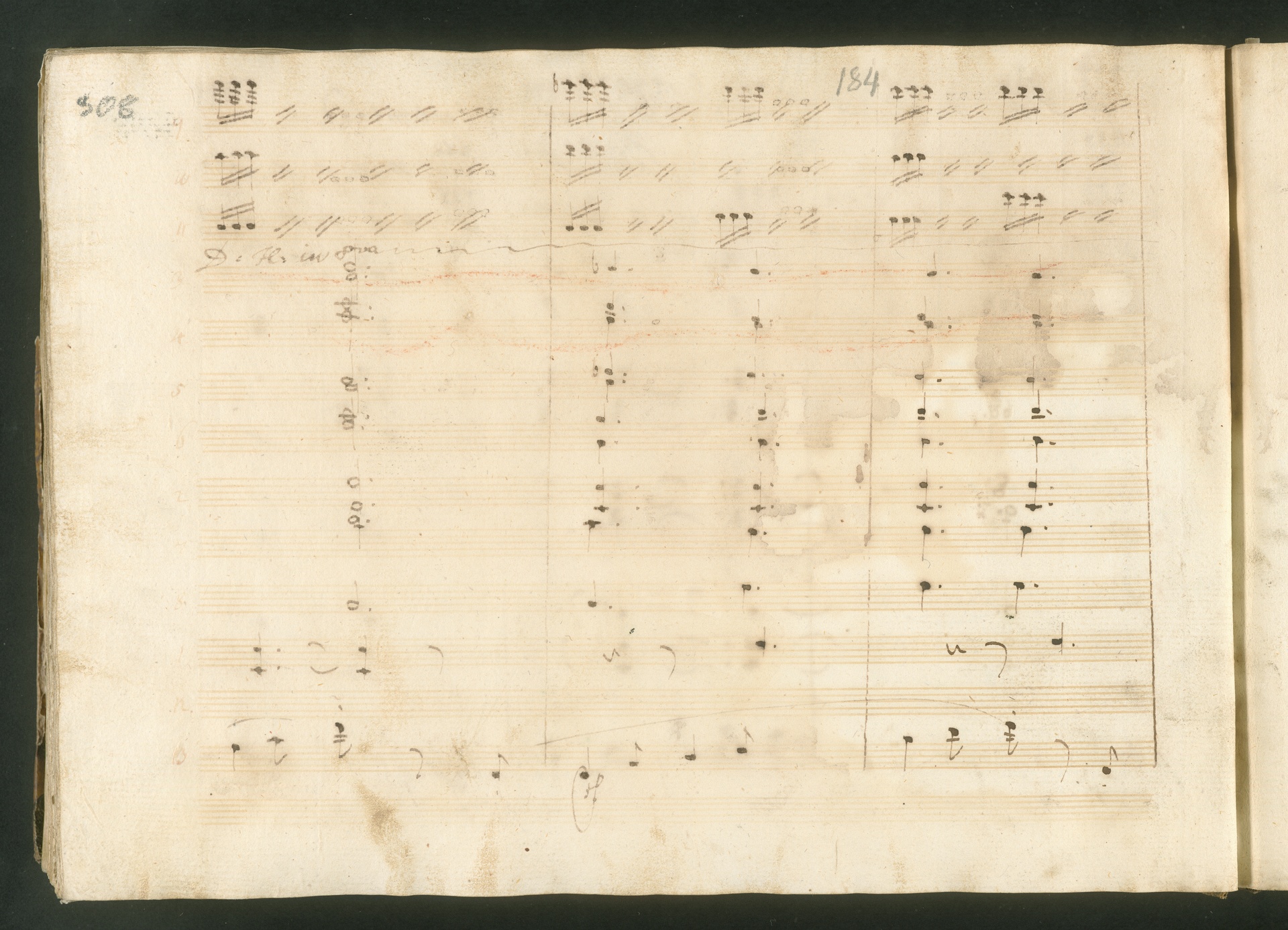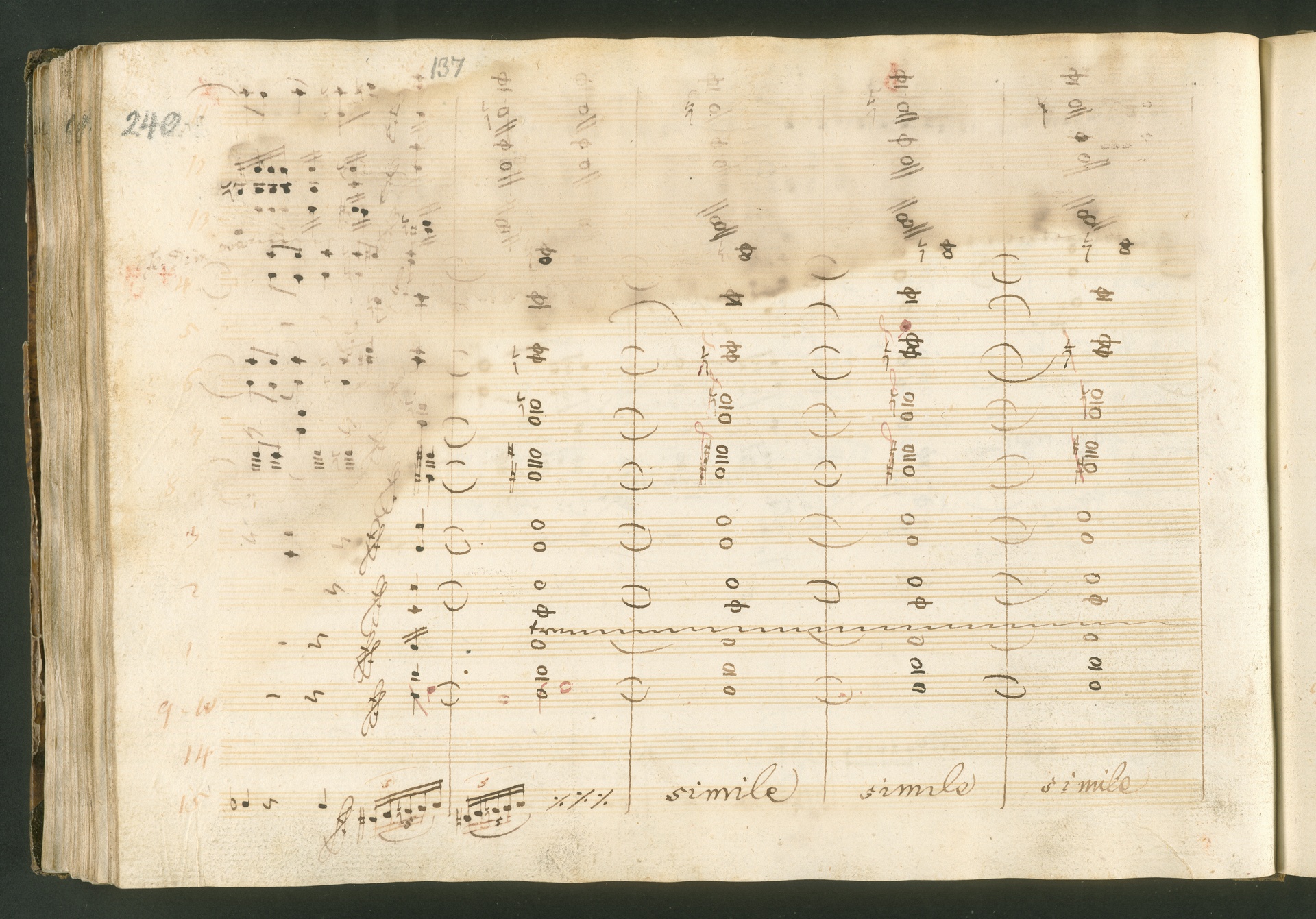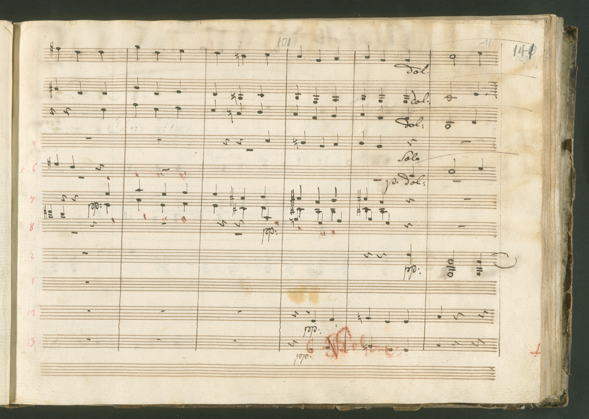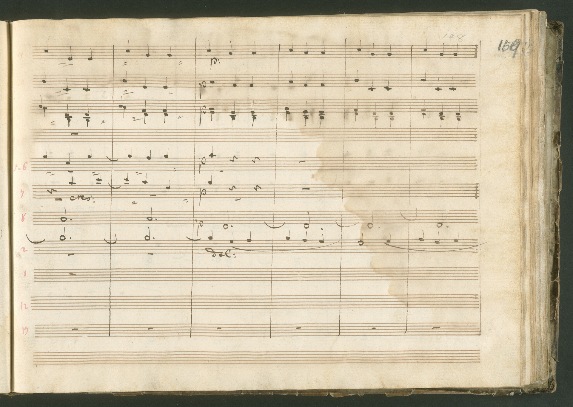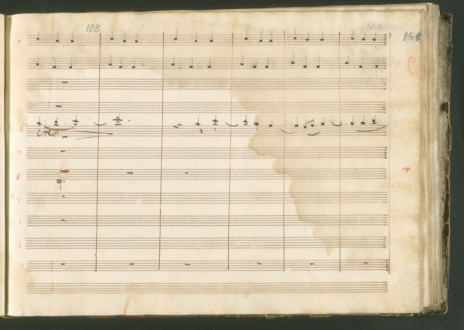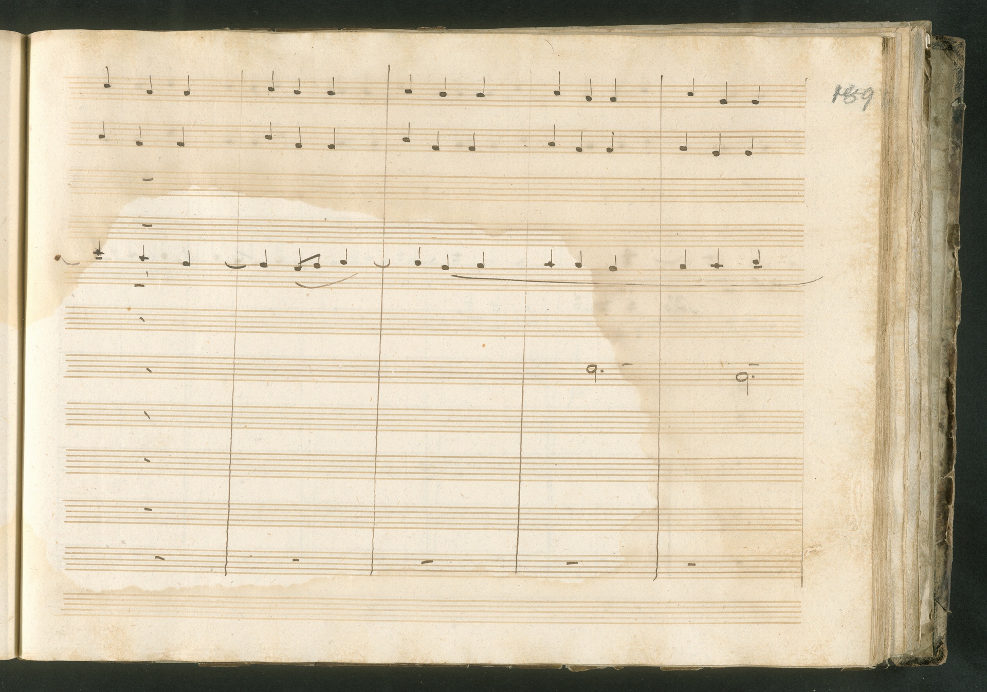 The manuscript shown here is a corrected copy of the Sixth Symphony, the "Pastoral". Beethoven sold the publisher Gottfried Christoph Härtel his Fifth and Sixth Symphonies (op. 67 und 68) in September 1808 on his visit to Vienna. The surviving correspondence shows that Beethoven did not give Härtel autograph scores but corrected copies as engraver's models for the original edition