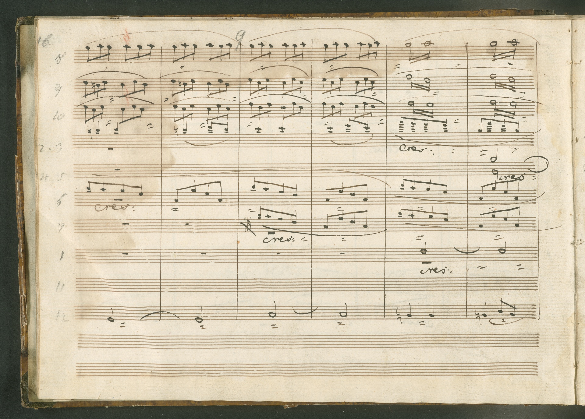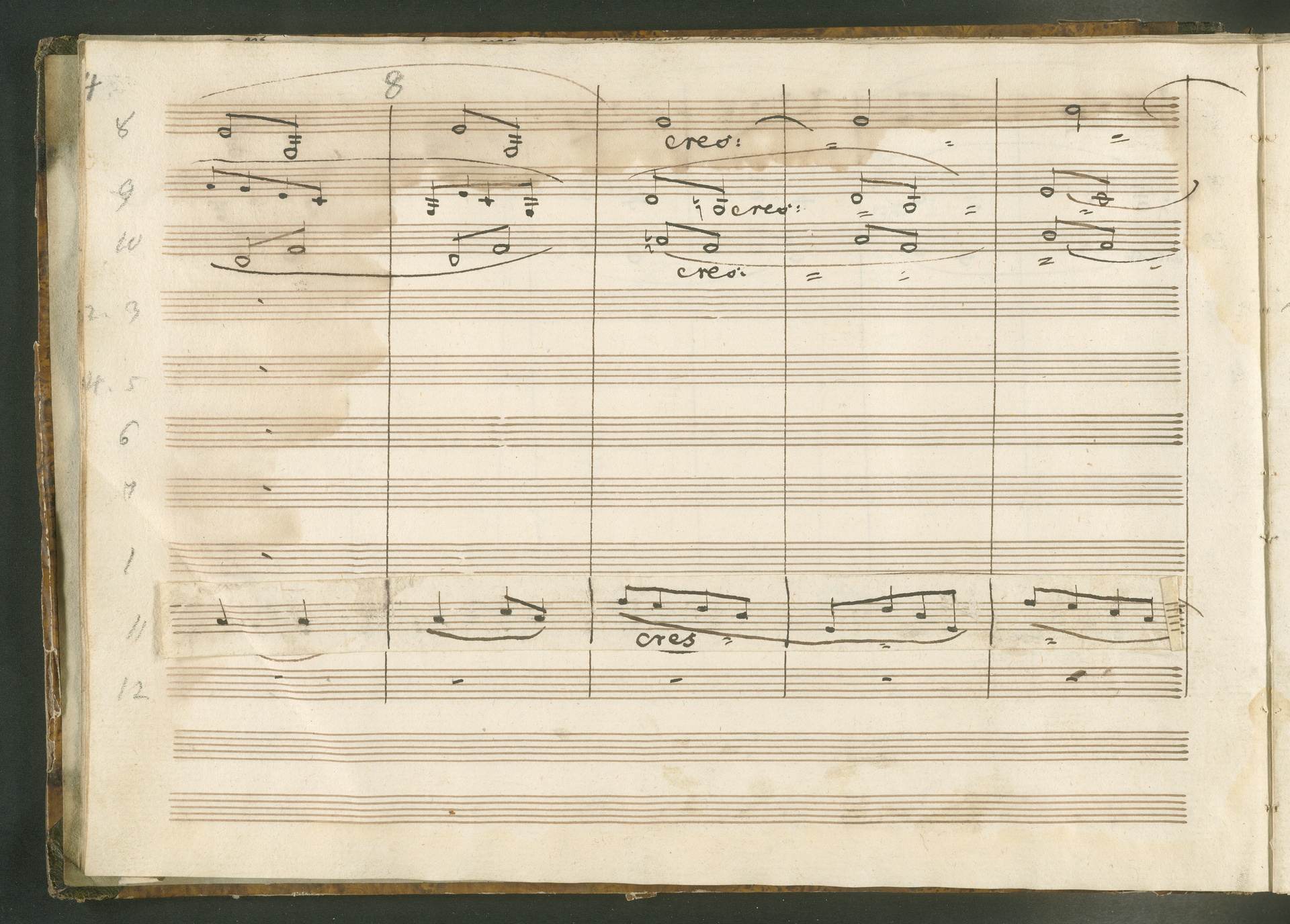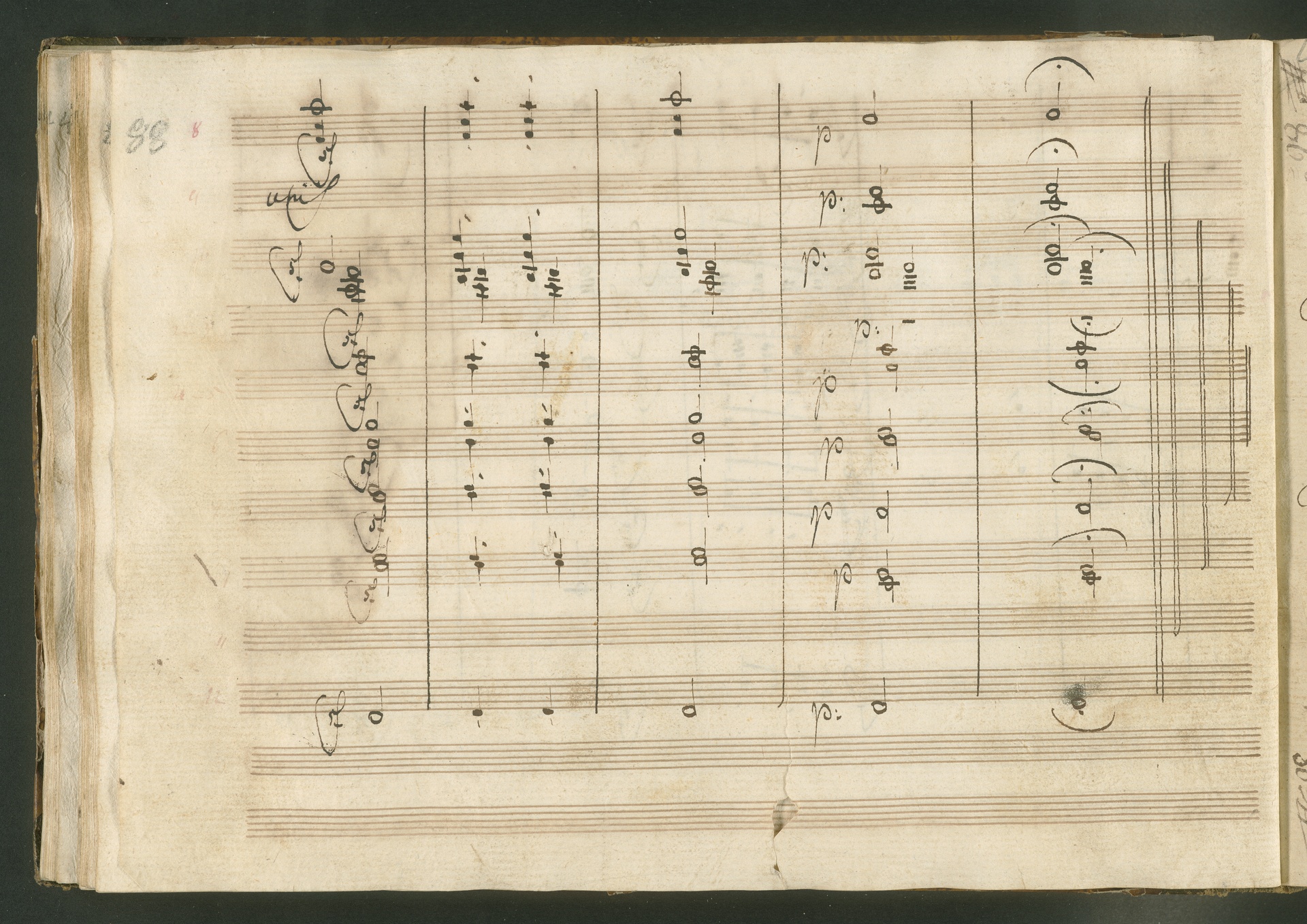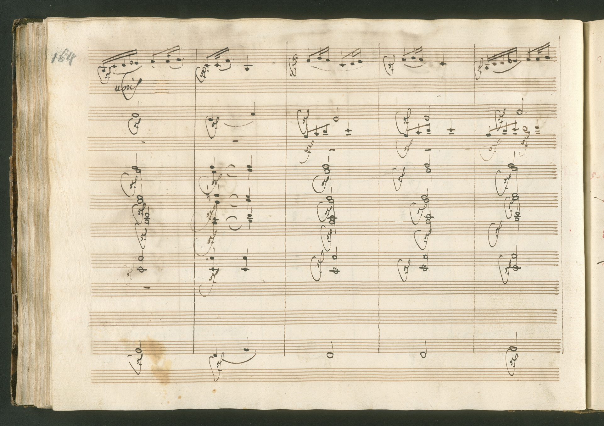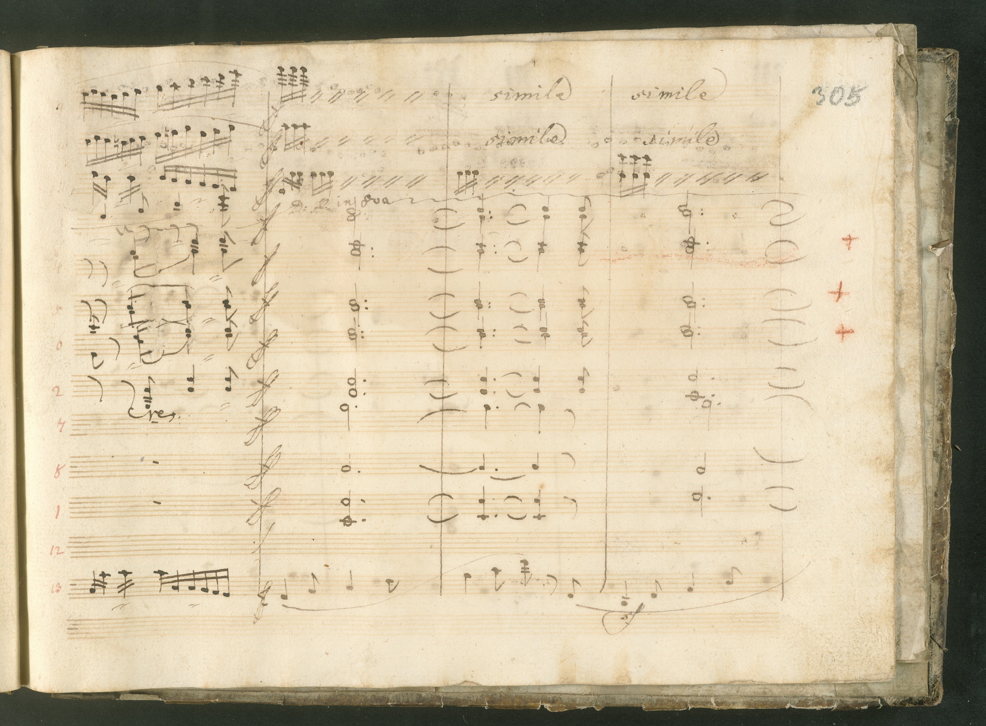 The manuscript shown here is a corrected copy of the Sixth Symphony, the "Pastoral". Beethoven sold the publisher Gottfried Christoph Härtel his Fifth and Sixth Symphonies (op. 67 und 68) in September 1808 on his visit to Vienna. The surviving correspondence shows that Beethoven did not give Härtel autograph scores but corrected copies as engraver's models for the original edition
