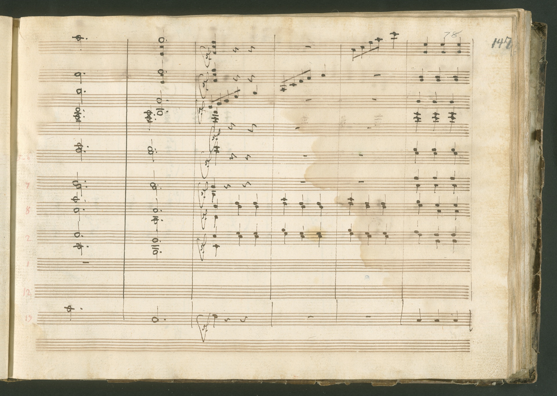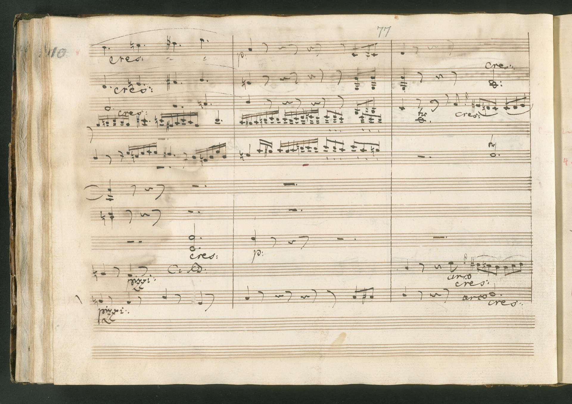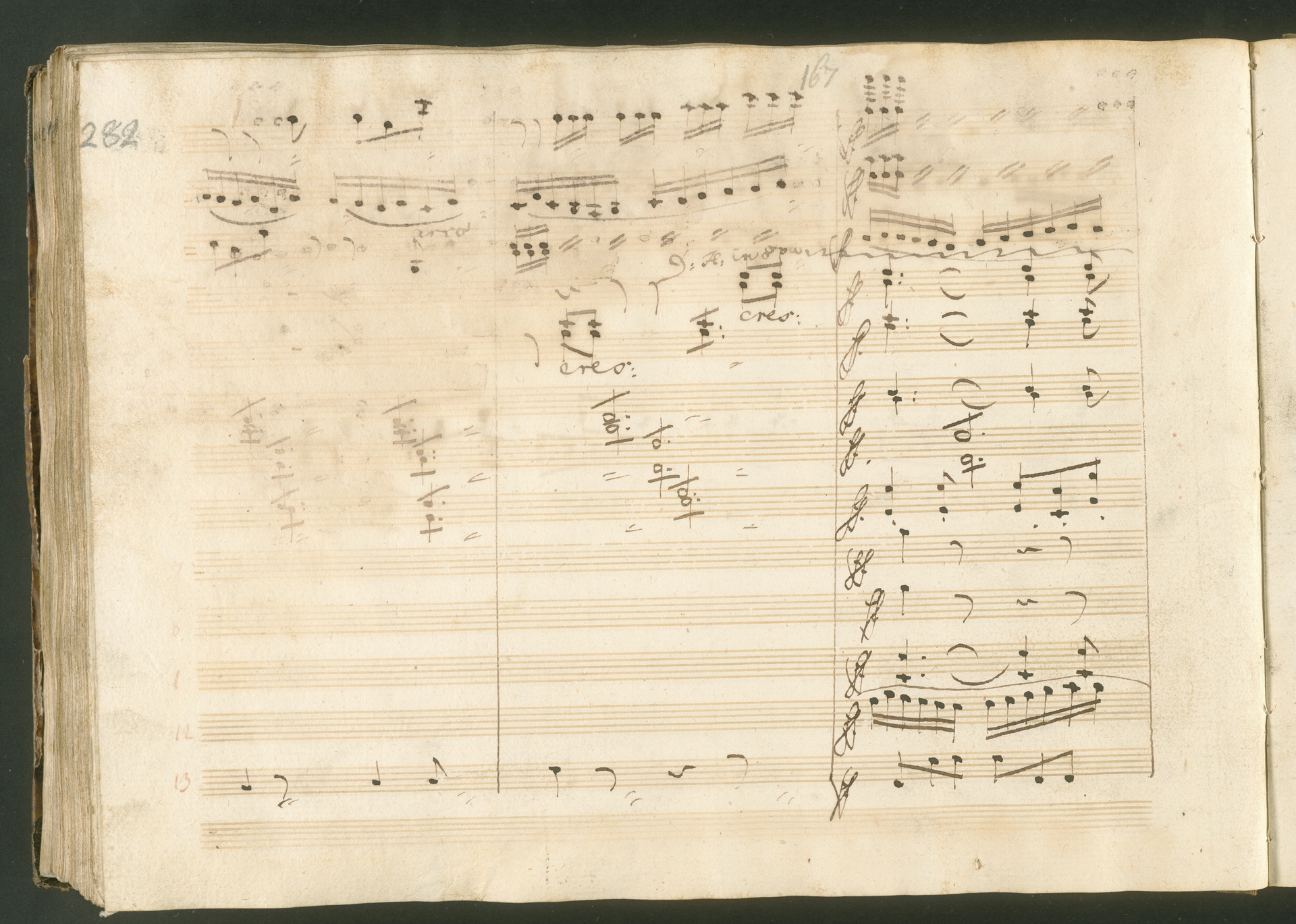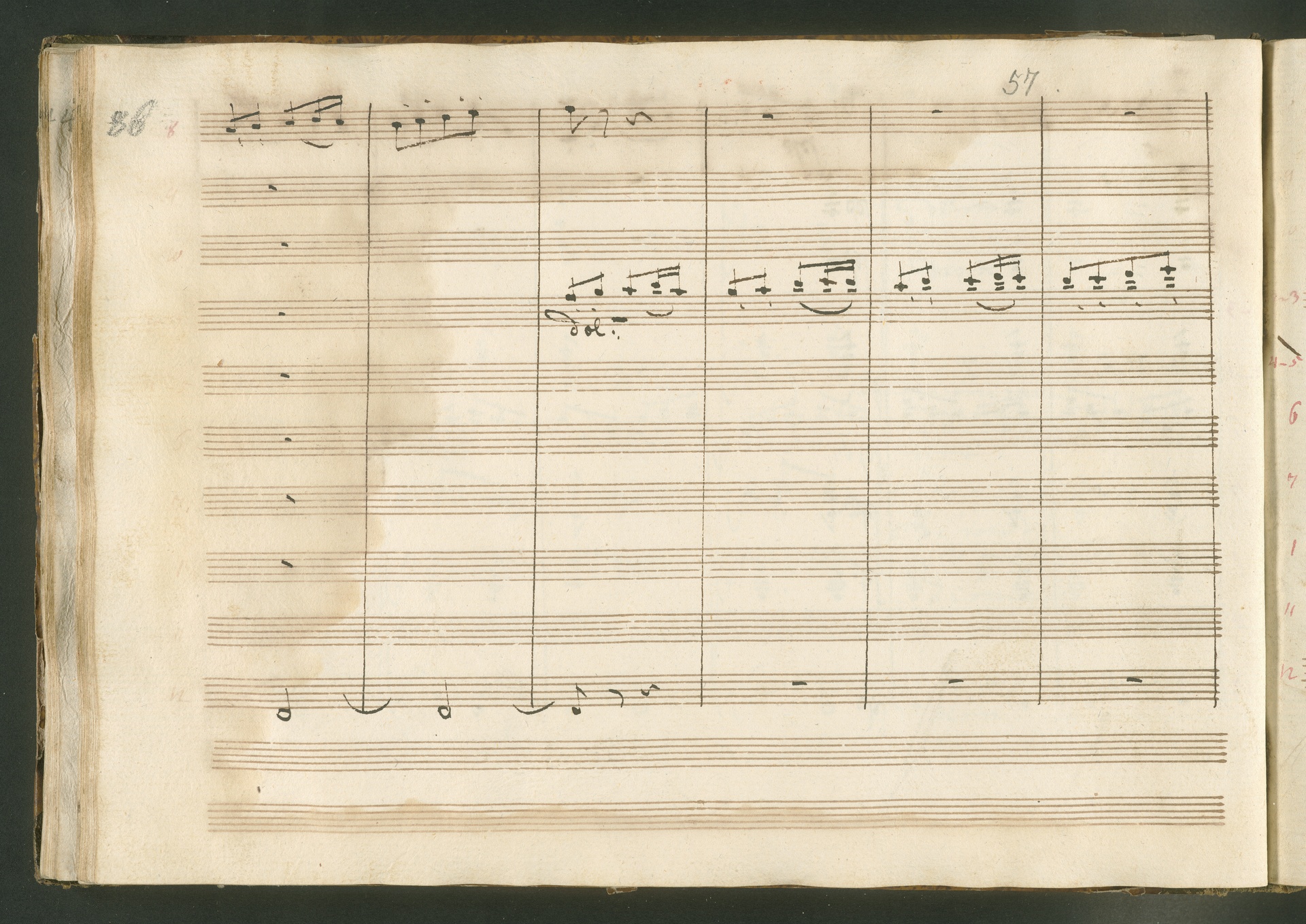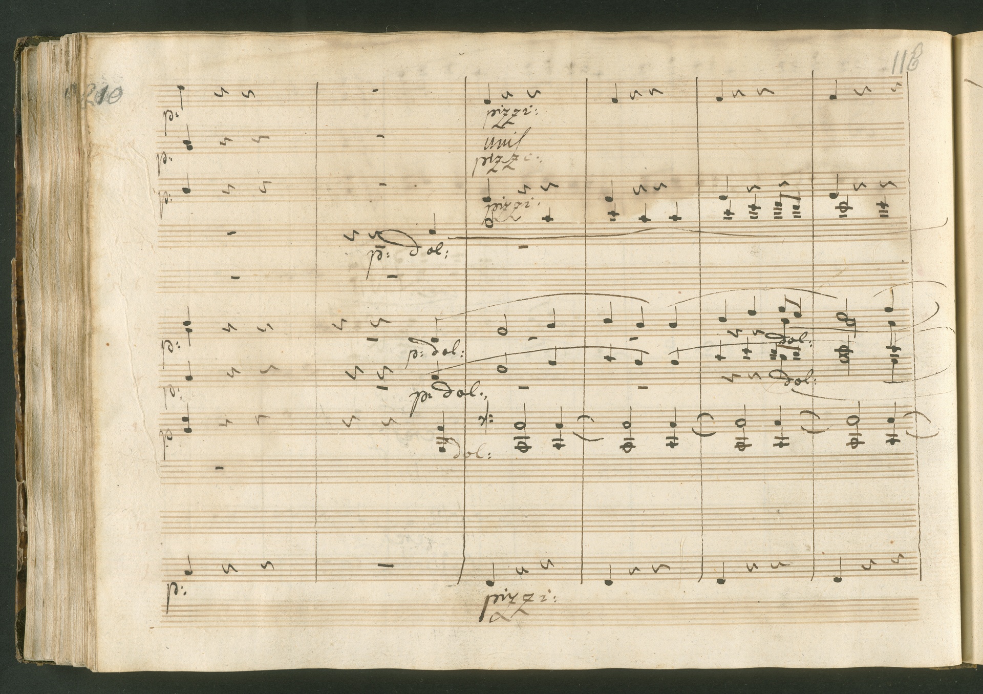 The manuscript shown here is a corrected copy of the Sixth Symphony, the "Pastoral". Beethoven sold the publisher Gottfried Christoph Härtel his Fifth and Sixth Symphonies (op. 67 und 68) in September 1808 on his visit to Vienna. The surviving correspondence shows that Beethoven did not give Härtel autograph scores but corrected copies as engraver's models for the original edition