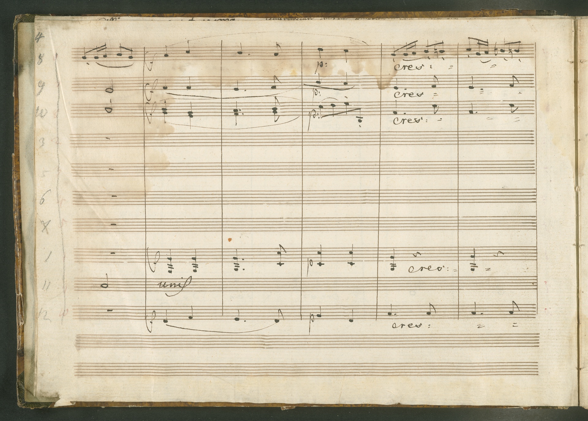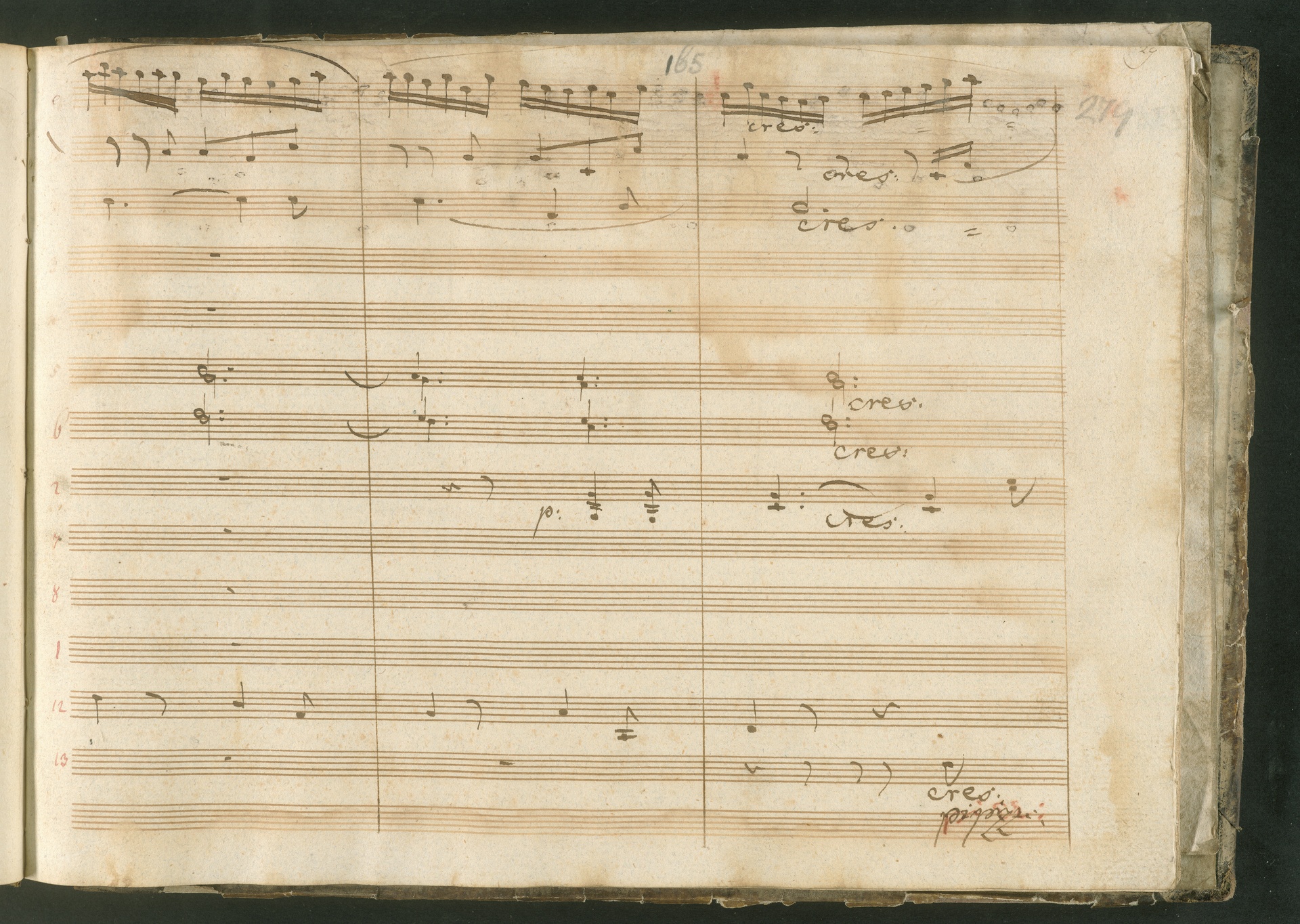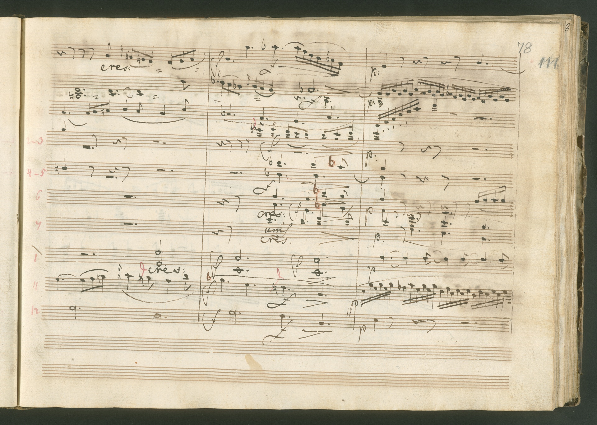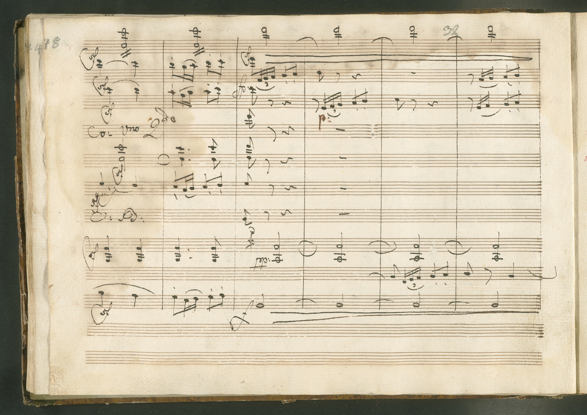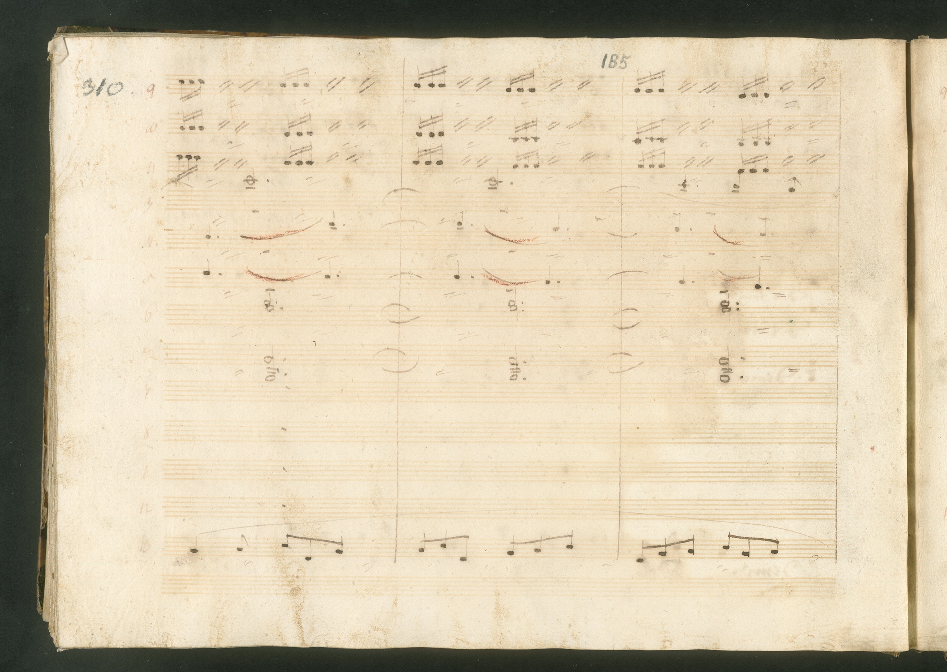 The manuscript shown here is a corrected copy of the Sixth Symphony, the "Pastoral". Beethoven sold the publisher Gottfried Christoph Härtel his Fifth and Sixth Symphonies (op. 67 und 68) in September 1808 on his visit to Vienna. The surviving correspondence shows that Beethoven did not give Härtel autograph scores but corrected copies as engraver's models for the original edition