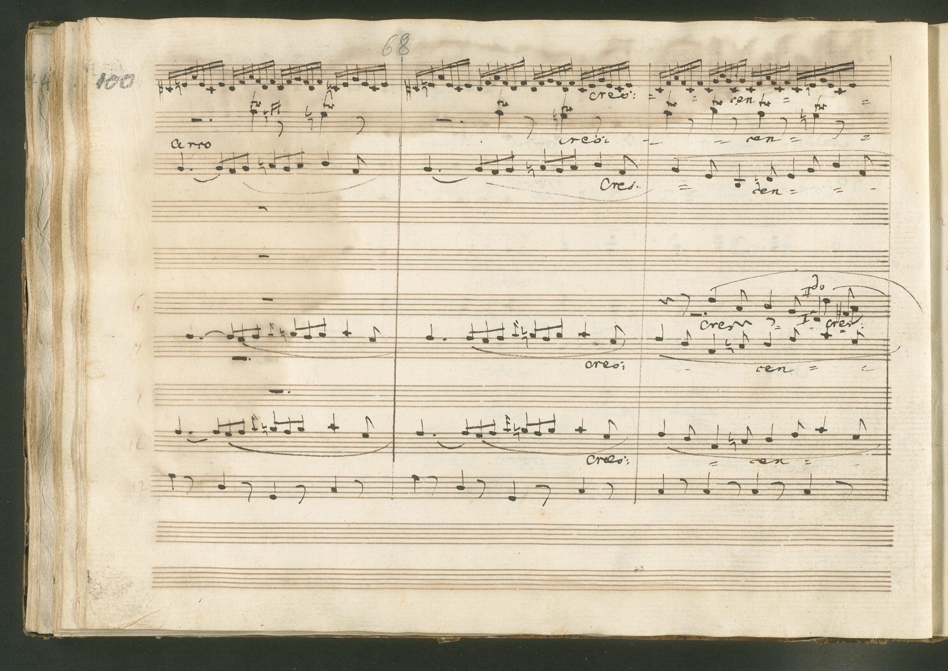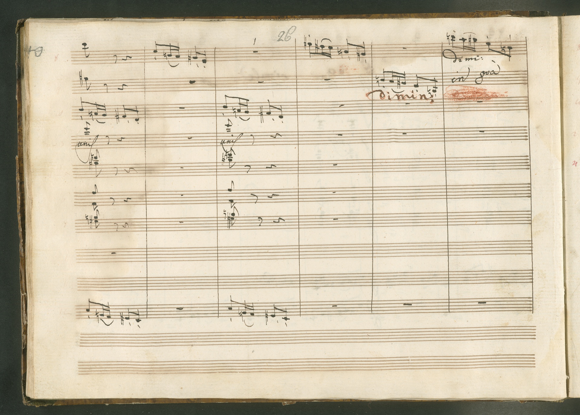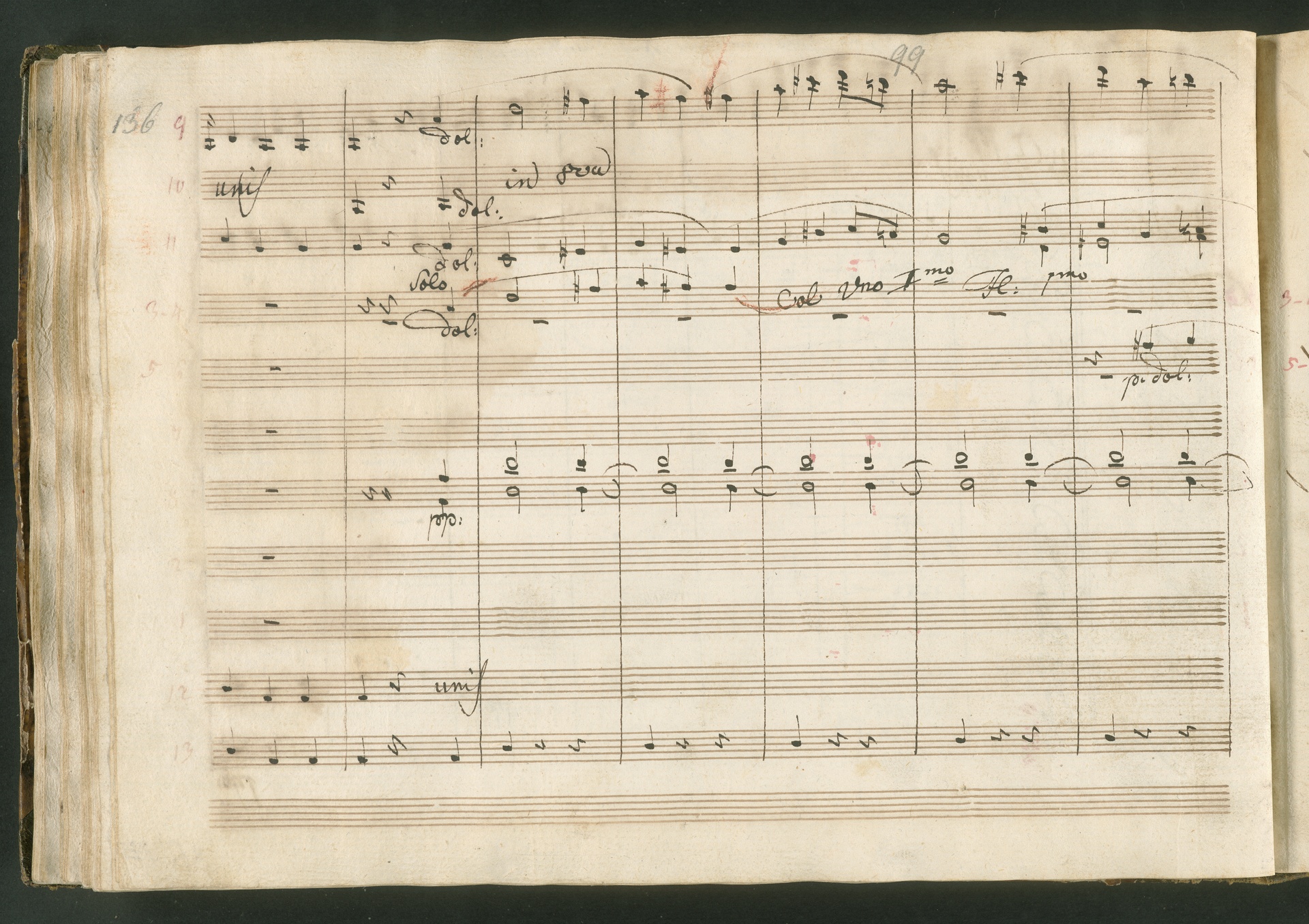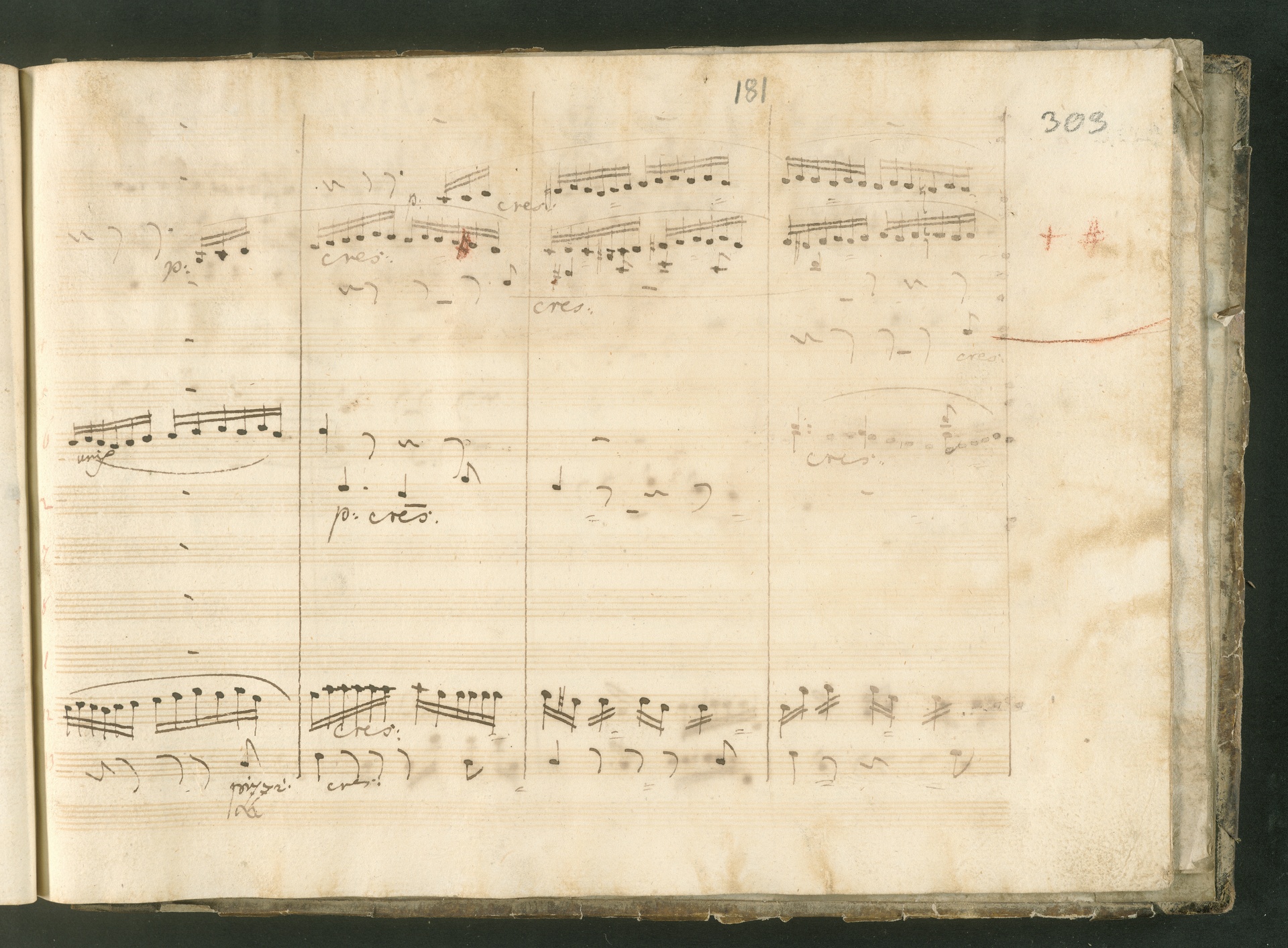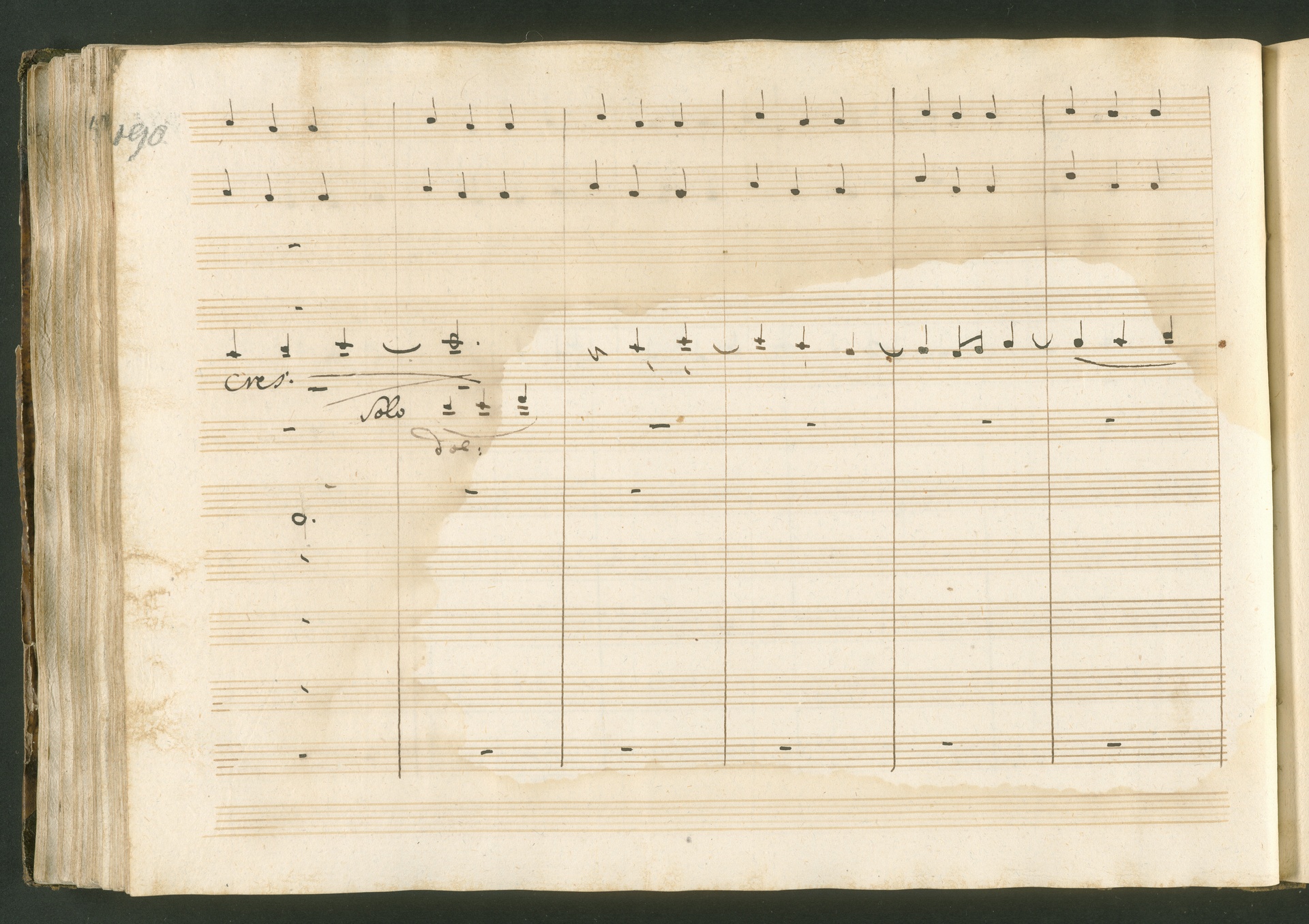 The manuscript shown here is a corrected copy of the Sixth Symphony, the "Pastoral". Beethoven sold the publisher Gottfried Christoph Härtel his Fifth and Sixth Symphonies (op. 67 und 68) in September 1808 on his visit to Vienna. The surviving correspondence shows that Beethoven did not give Härtel autograph scores but corrected copies as engraver's models for the original edition