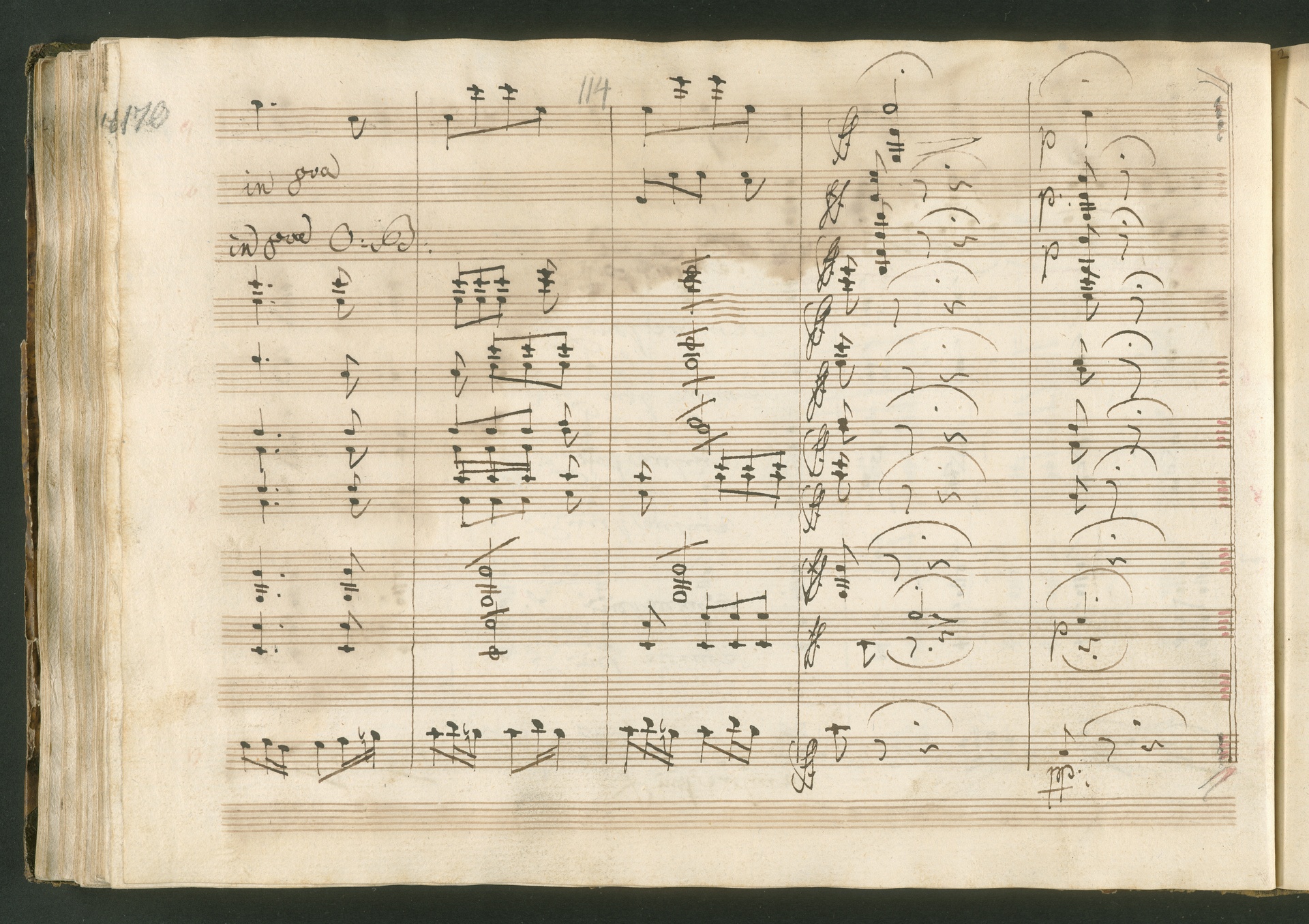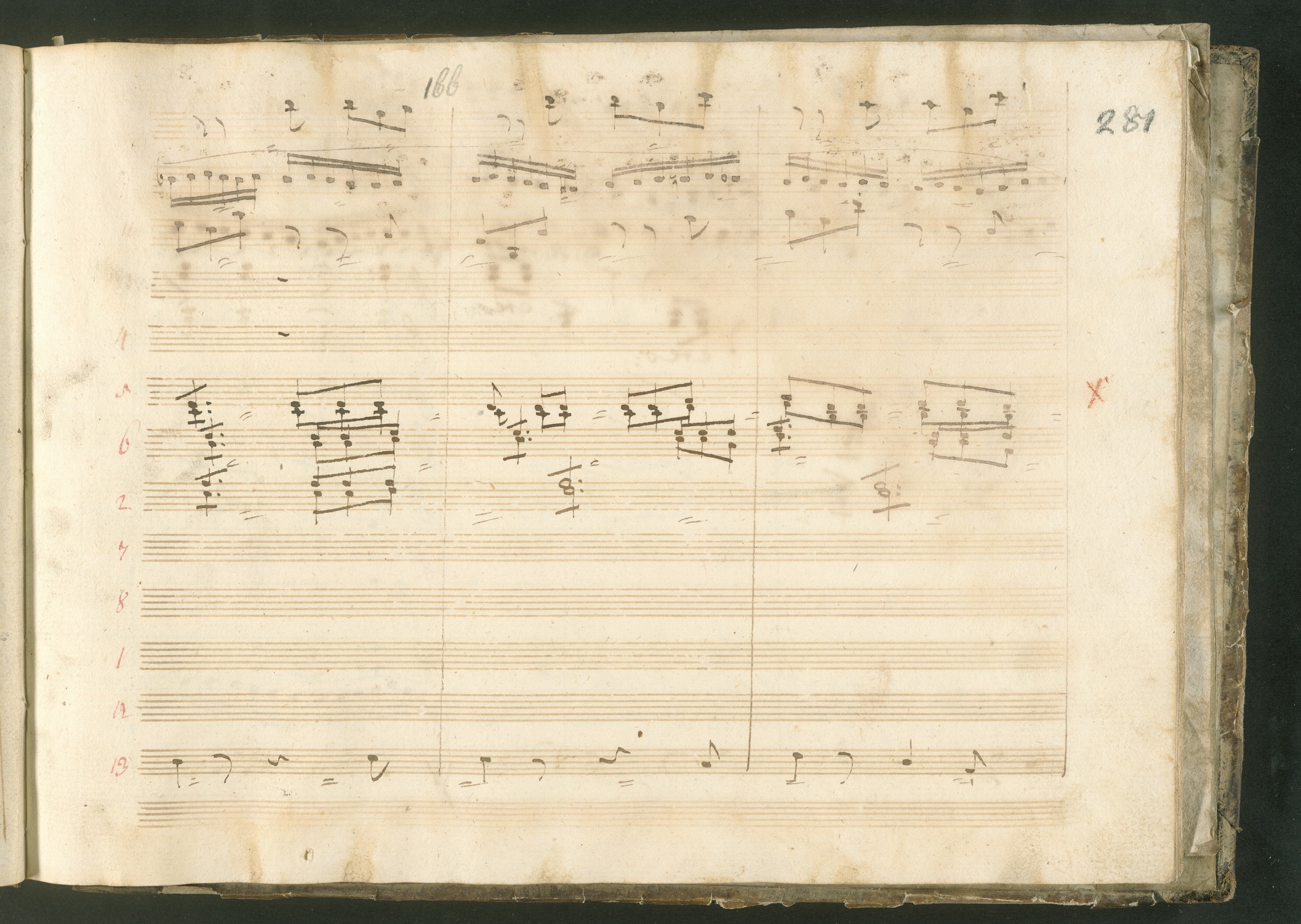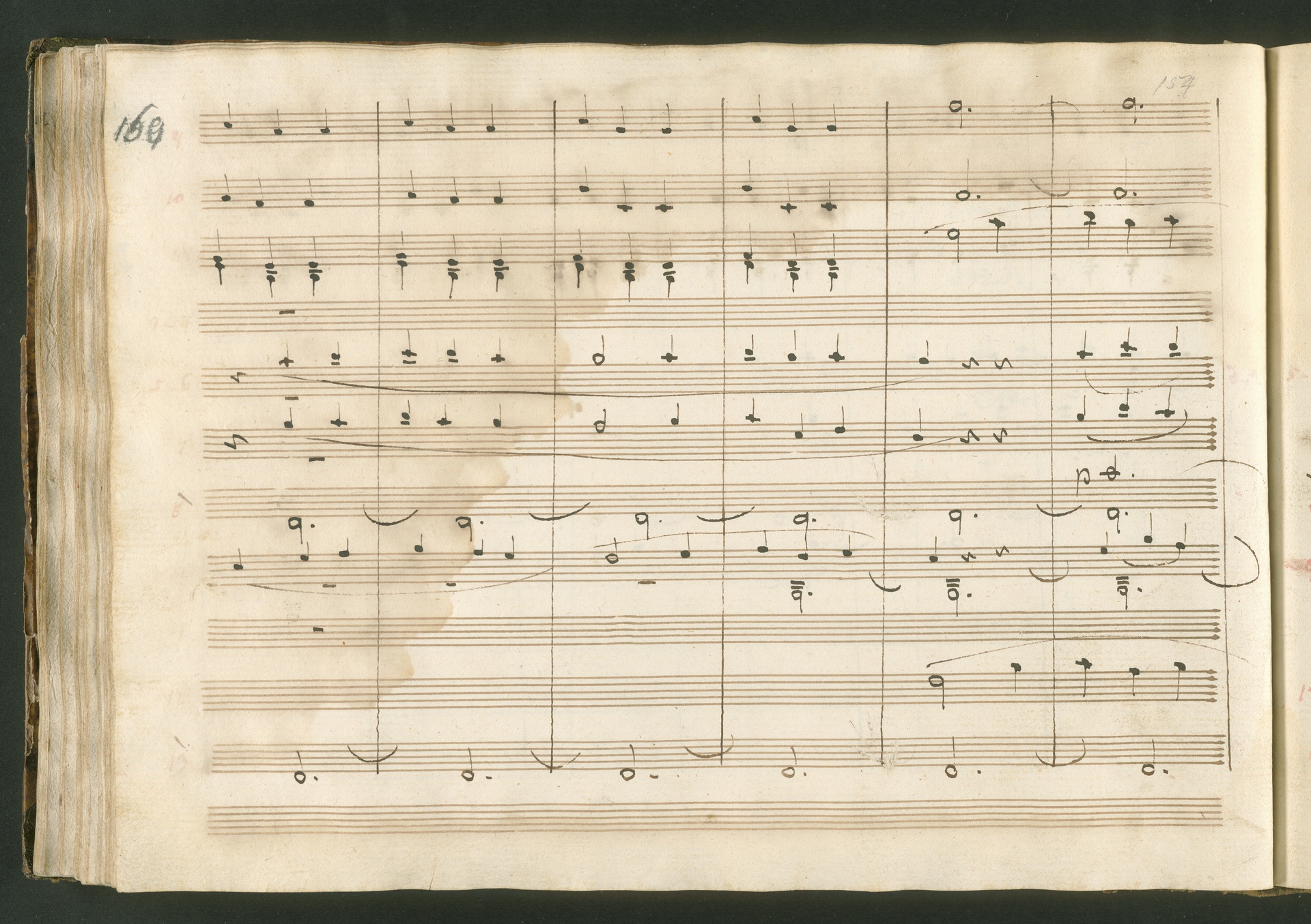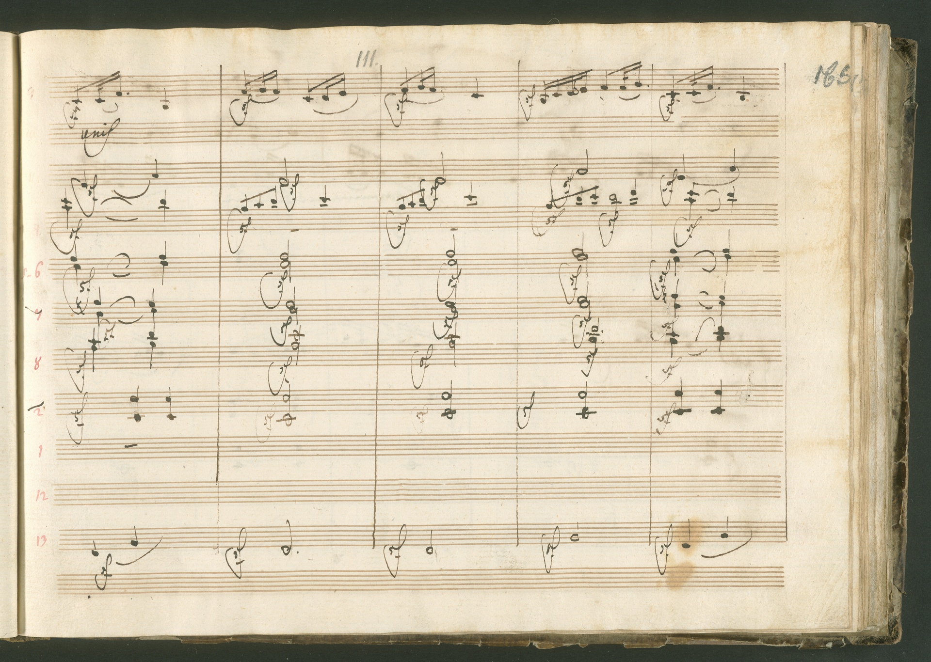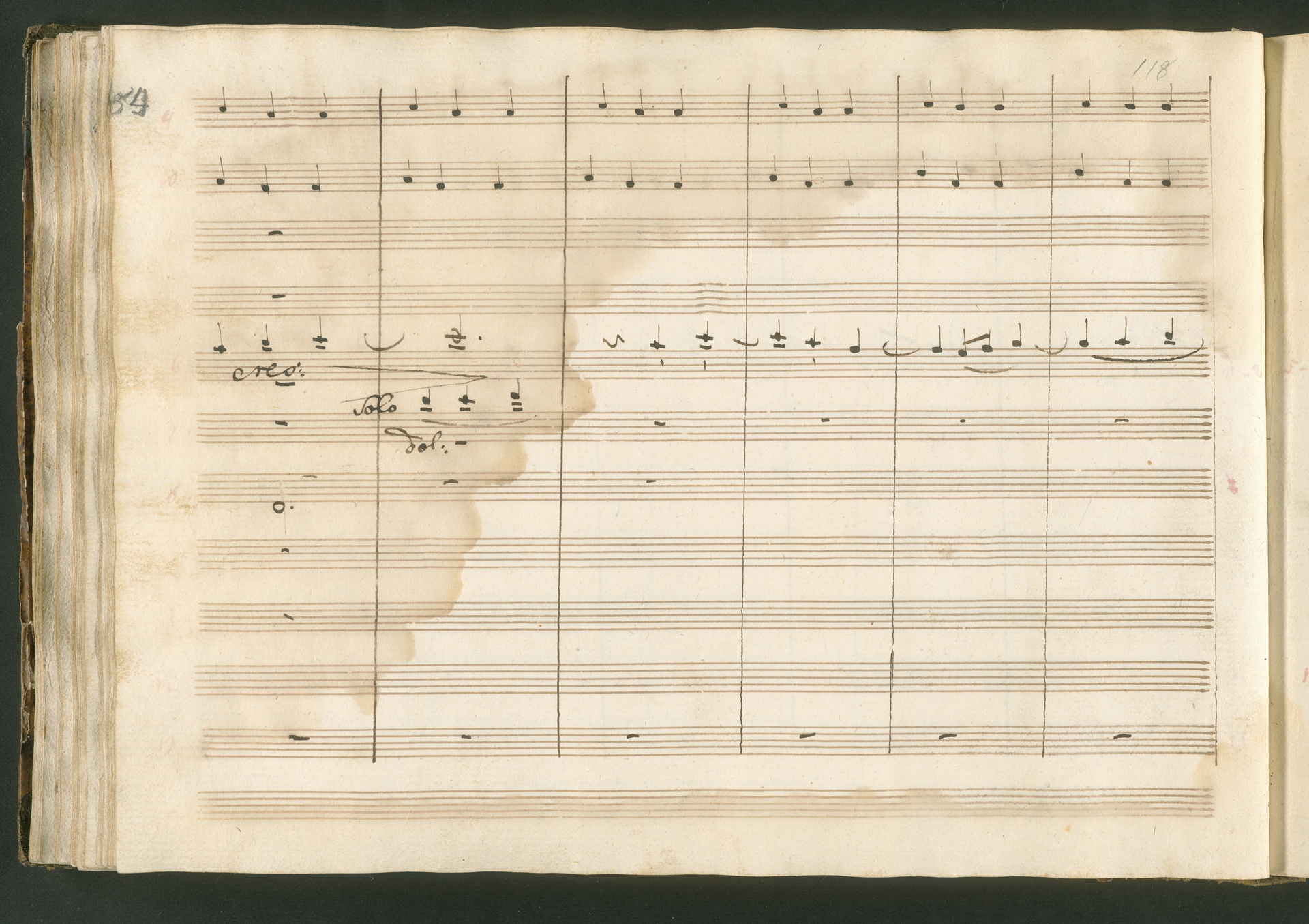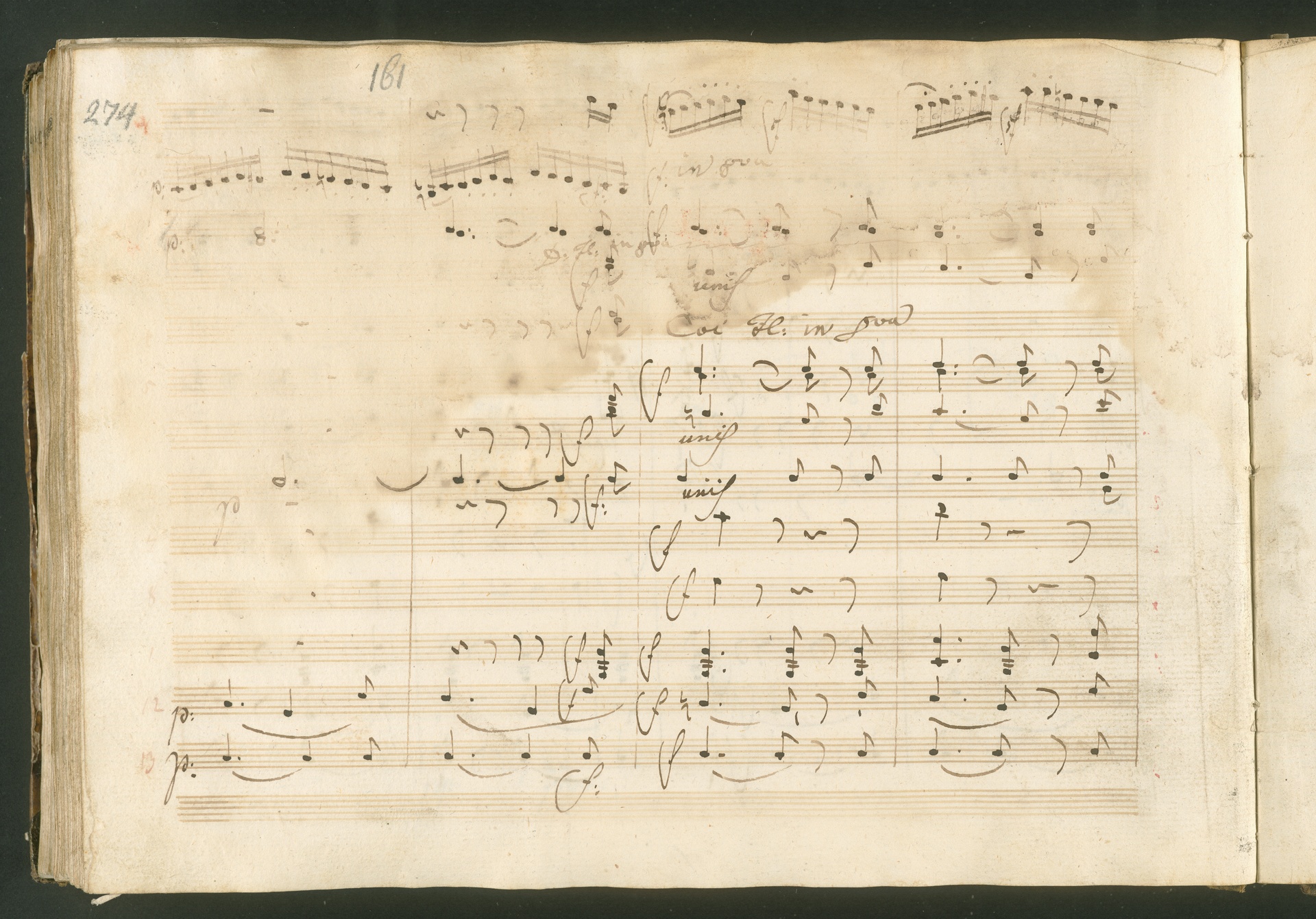 The manuscript shown here is a corrected copy of the Sixth Symphony, the "Pastoral". Beethoven sold the publisher Gottfried Christoph Härtel his Fifth and Sixth Symphonies (op. 67 und 68) in September 1808 on his visit to Vienna. The surviving correspondence shows that Beethoven did not give Härtel autograph scores but corrected copies as engraver's models for the original edition