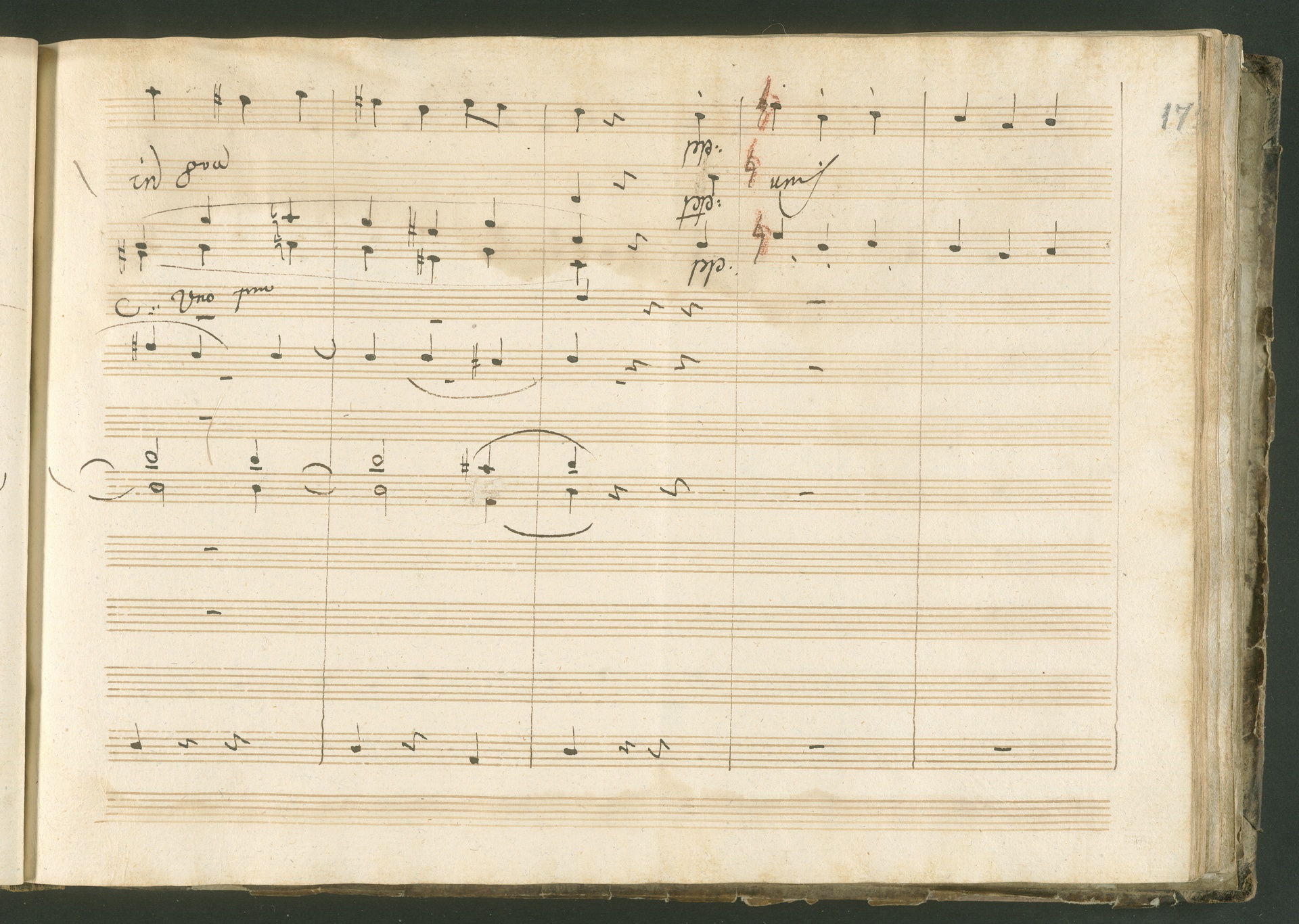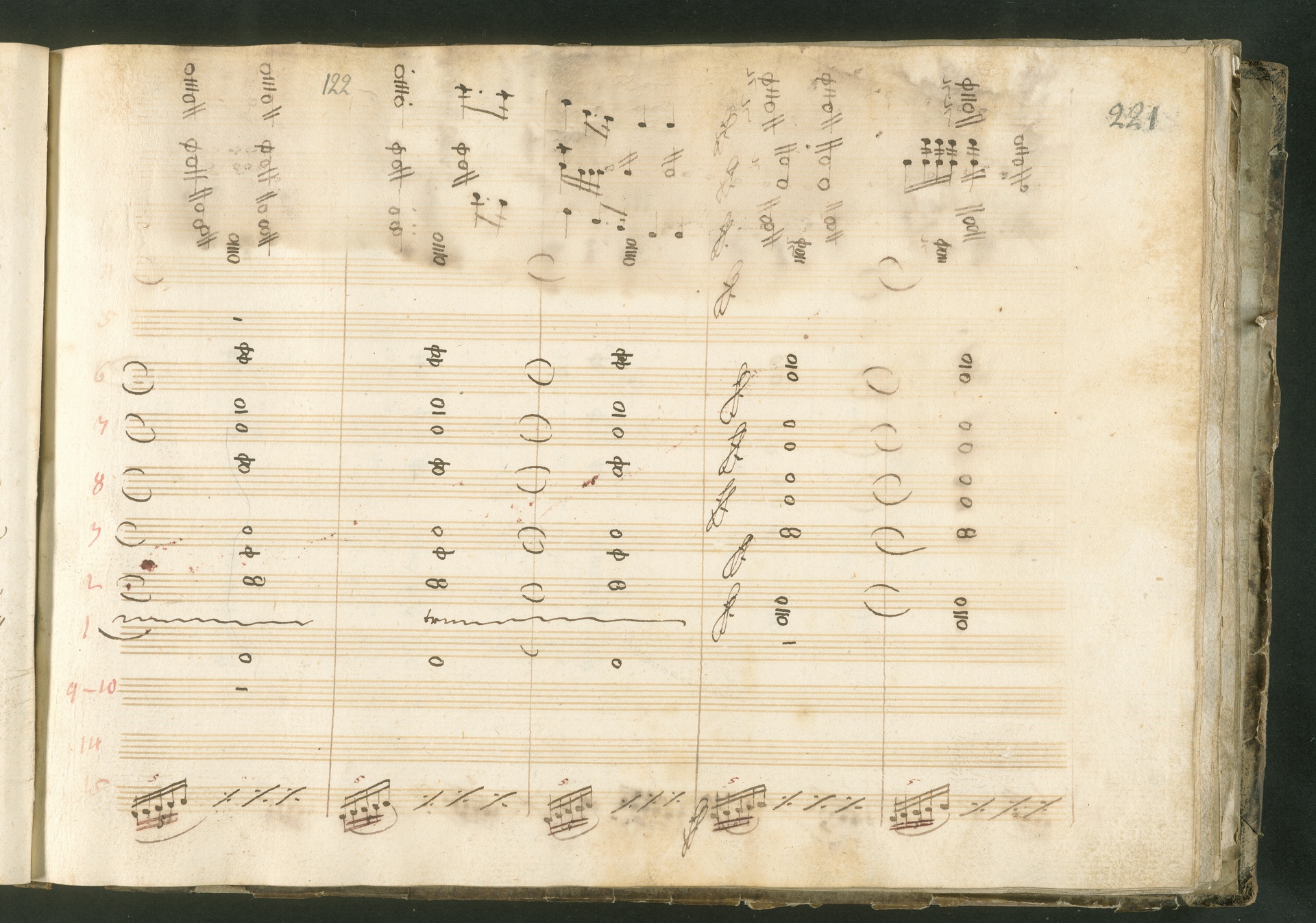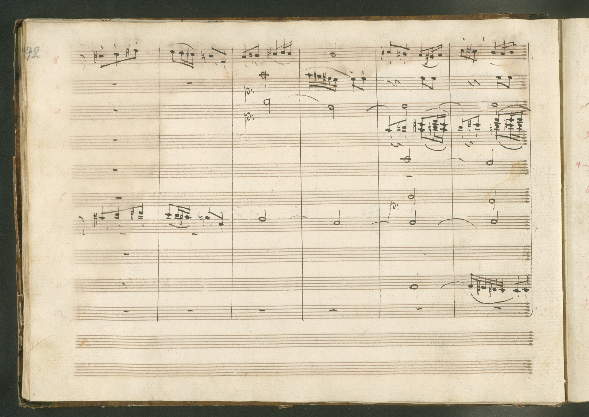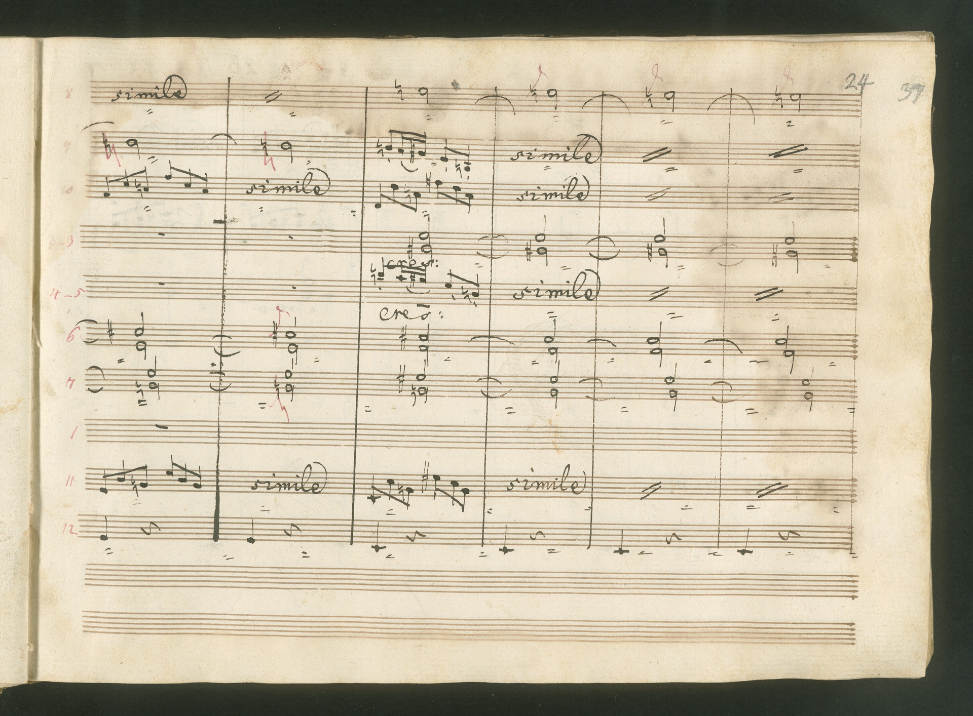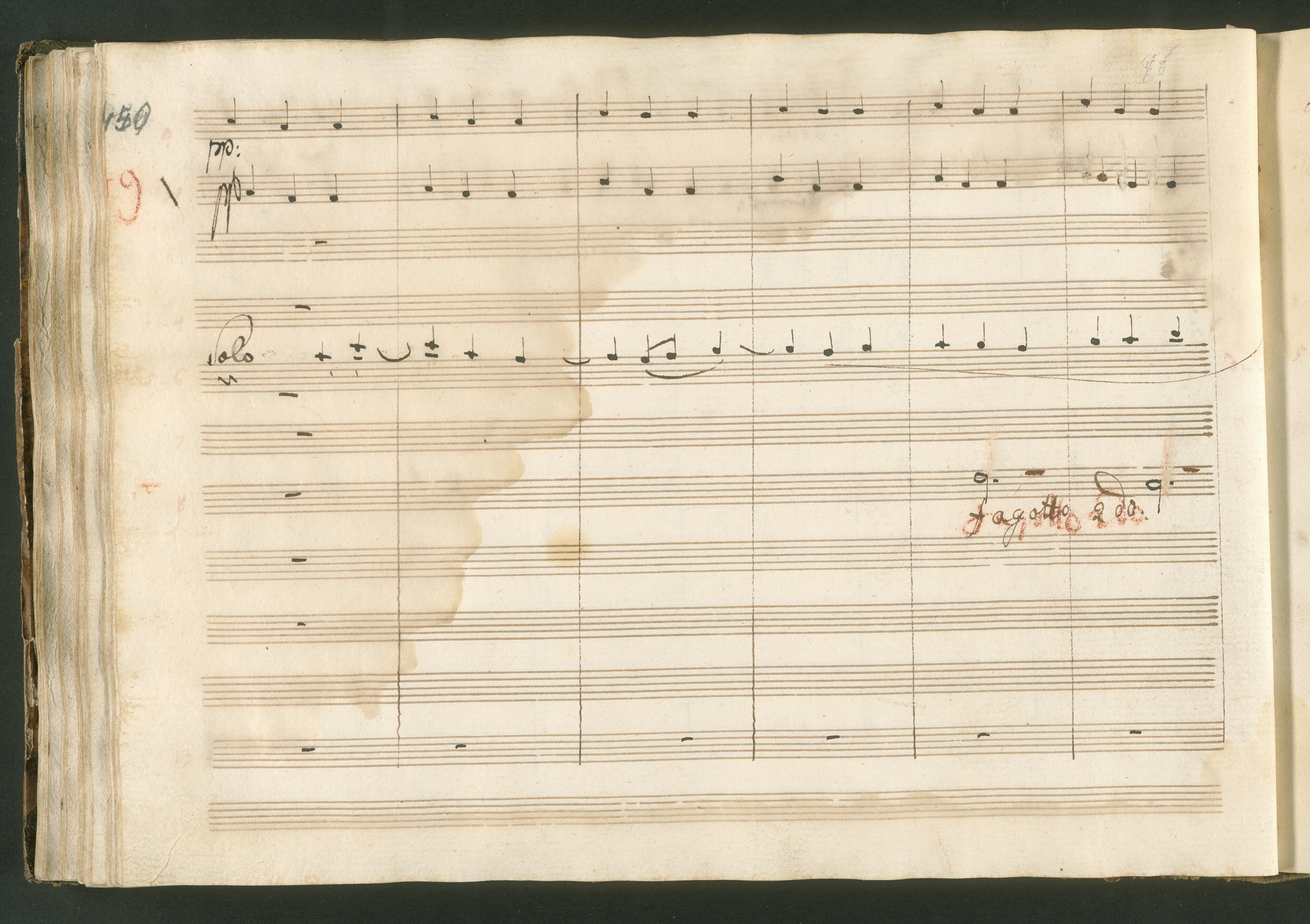 The manuscript shown here is a corrected copy of the Sixth Symphony, the "Pastoral". Beethoven sold the publisher Gottfried Christoph Härtel his Fifth and Sixth Symphonies (op. 67 und 68) in September 1808 on his visit to Vienna. The surviving correspondence shows that Beethoven did not give Härtel autograph scores but corrected copies as engraver's models for the original edition