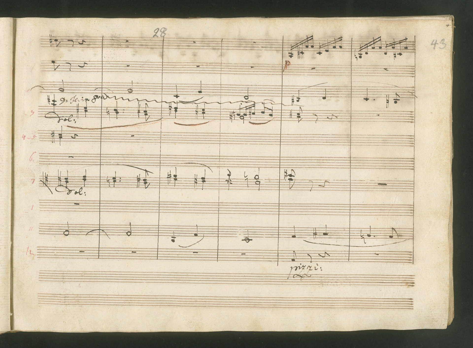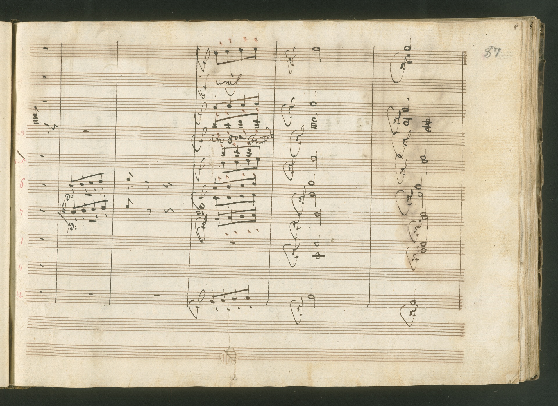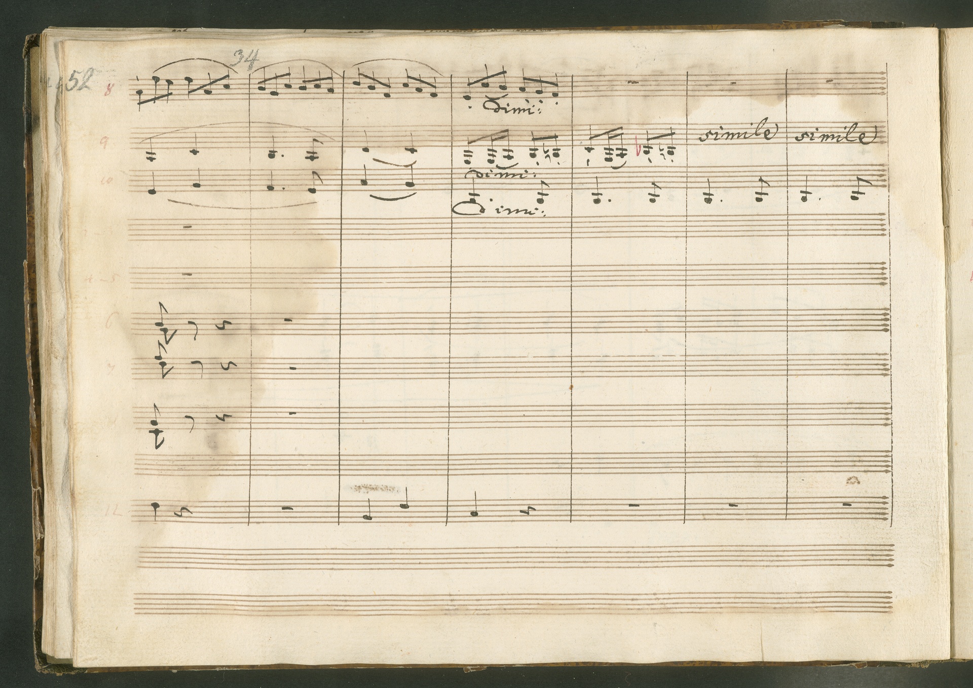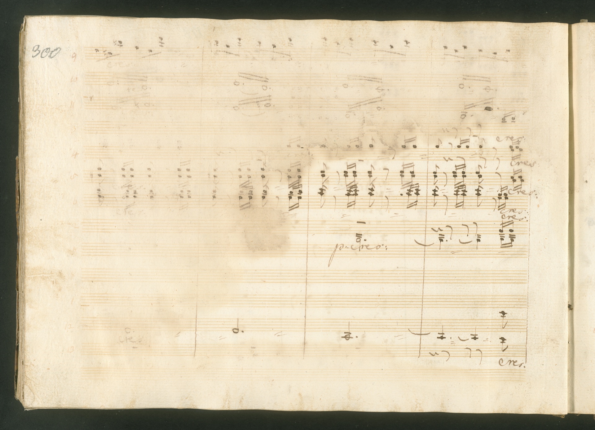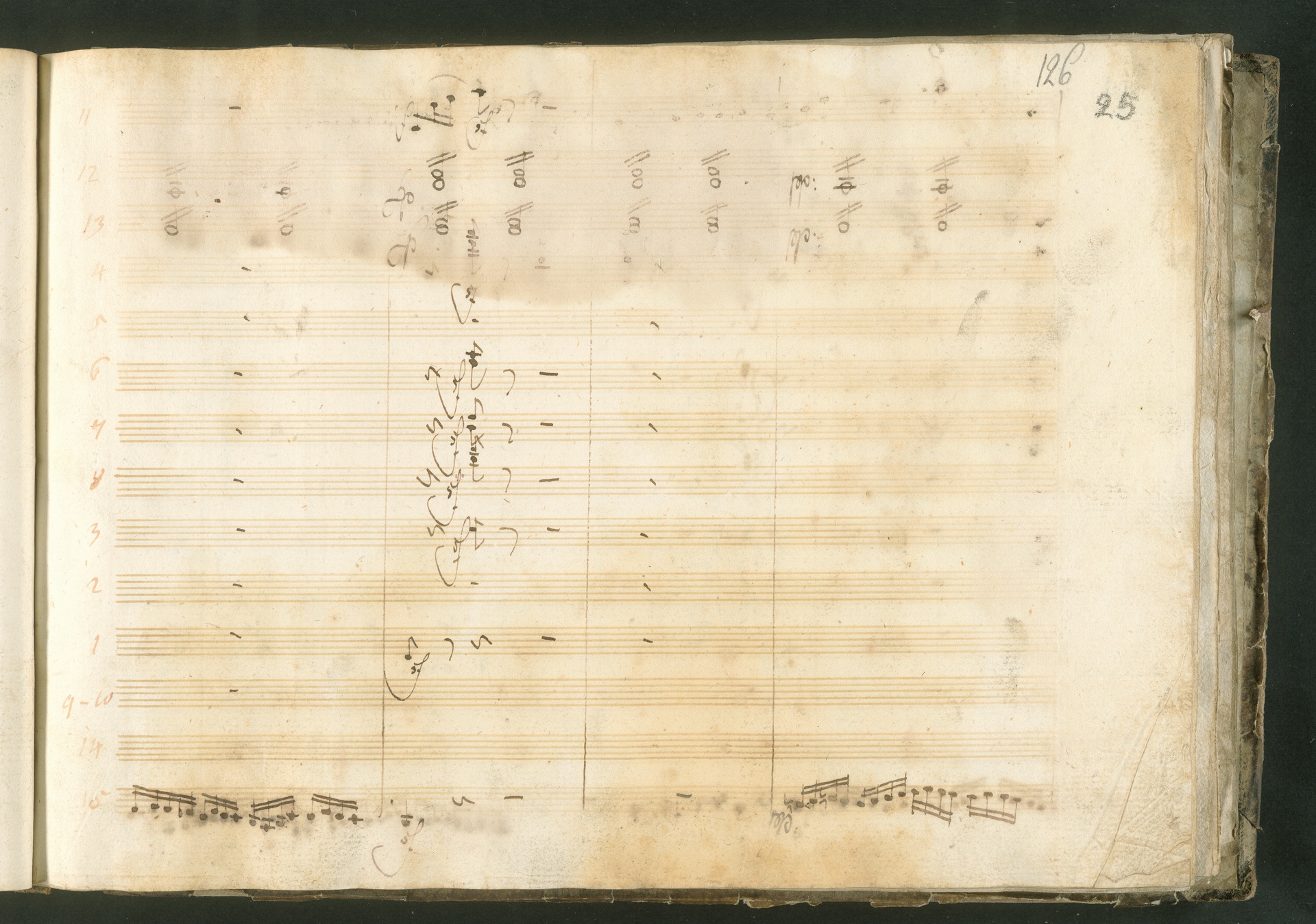 The manuscript shown here is a corrected copy of the Sixth Symphony, the "Pastoral". Beethoven sold the publisher Gottfried Christoph Härtel his Fifth and Sixth Symphonies (op. 67 und 68) in September 1808 on his visit to Vienna. The surviving correspondence shows that Beethoven did not give Härtel autograph scores but corrected copies as engraver's models for the original edition