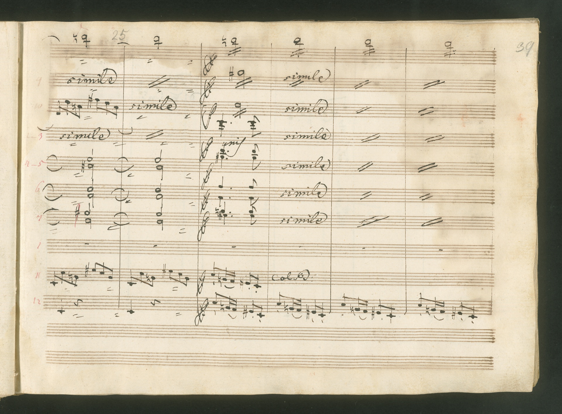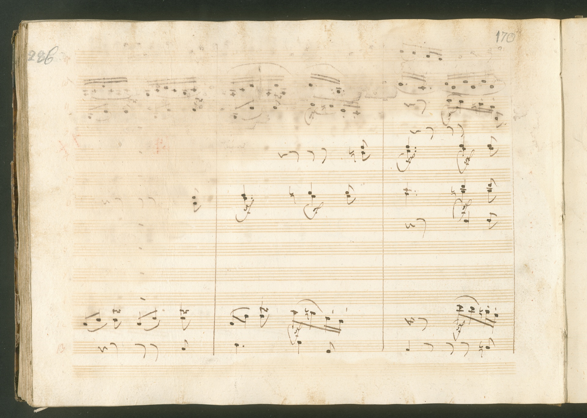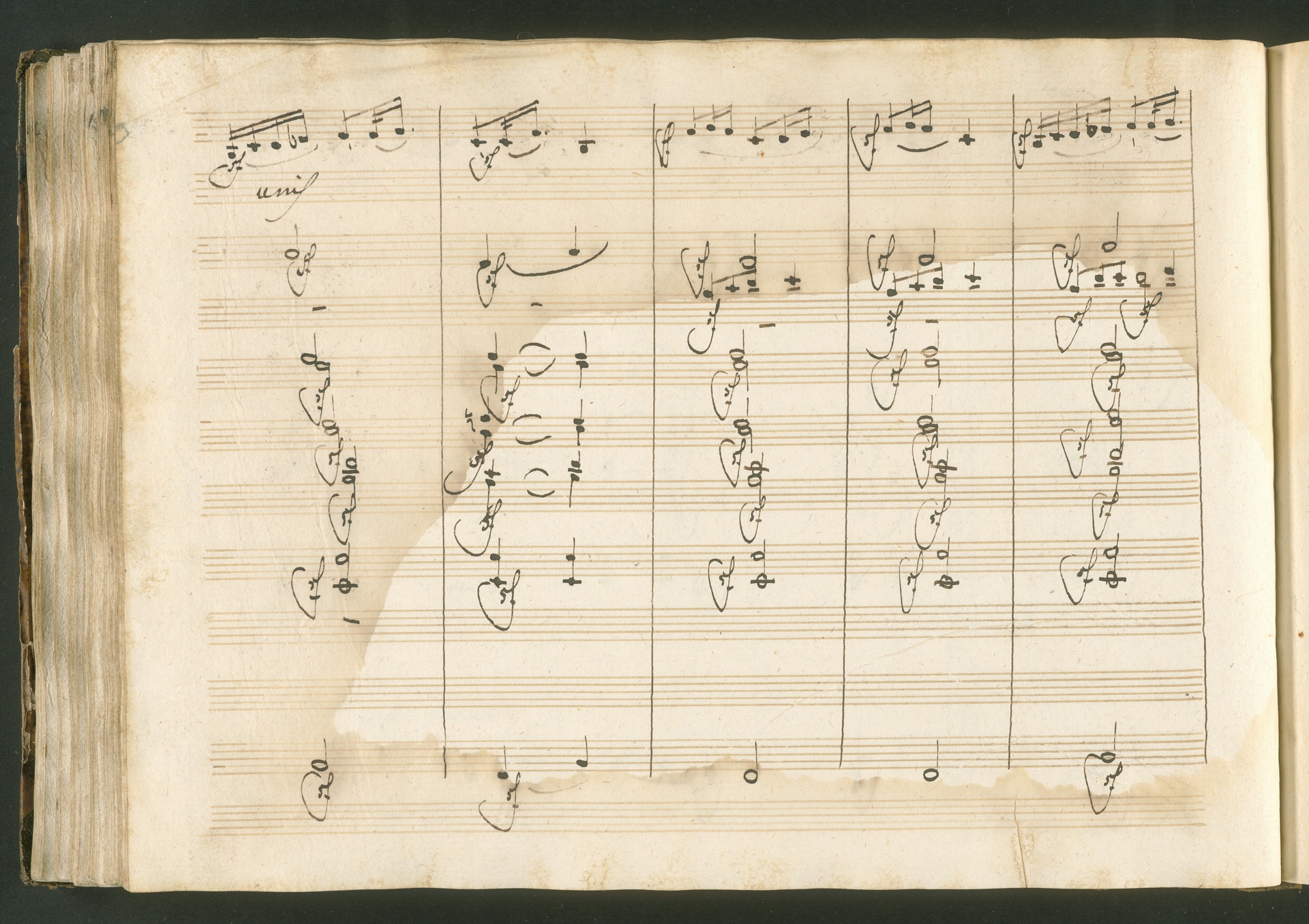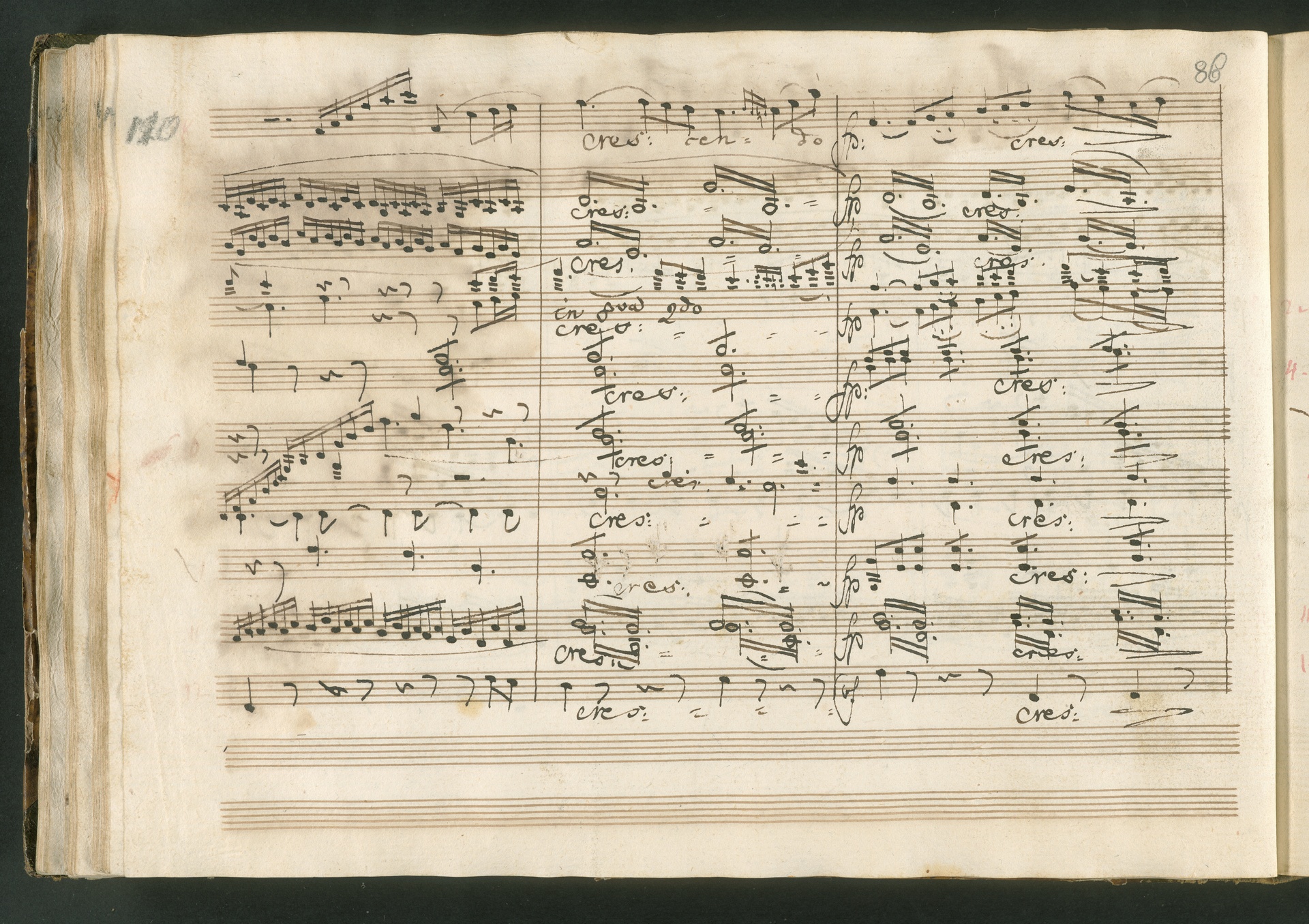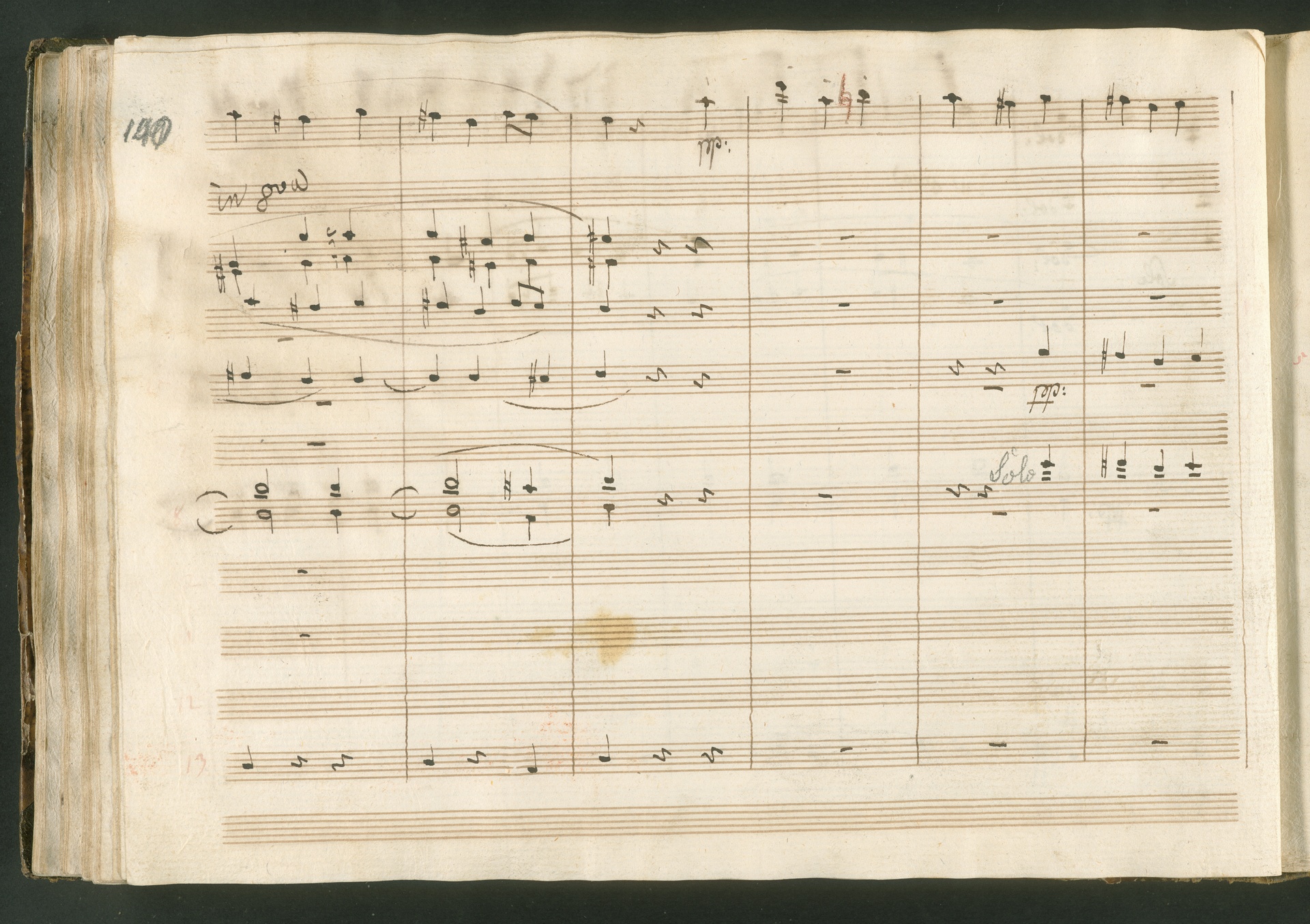 The manuscript shown here is a corrected copy of the Sixth Symphony, the "Pastoral". Beethoven sold the publisher Gottfried Christoph Härtel his Fifth and Sixth Symphonies (op. 67 und 68) in September 1808 on his visit to Vienna. The surviving correspondence shows that Beethoven did not give Härtel autograph scores but corrected copies as engraver's models for the original edition
