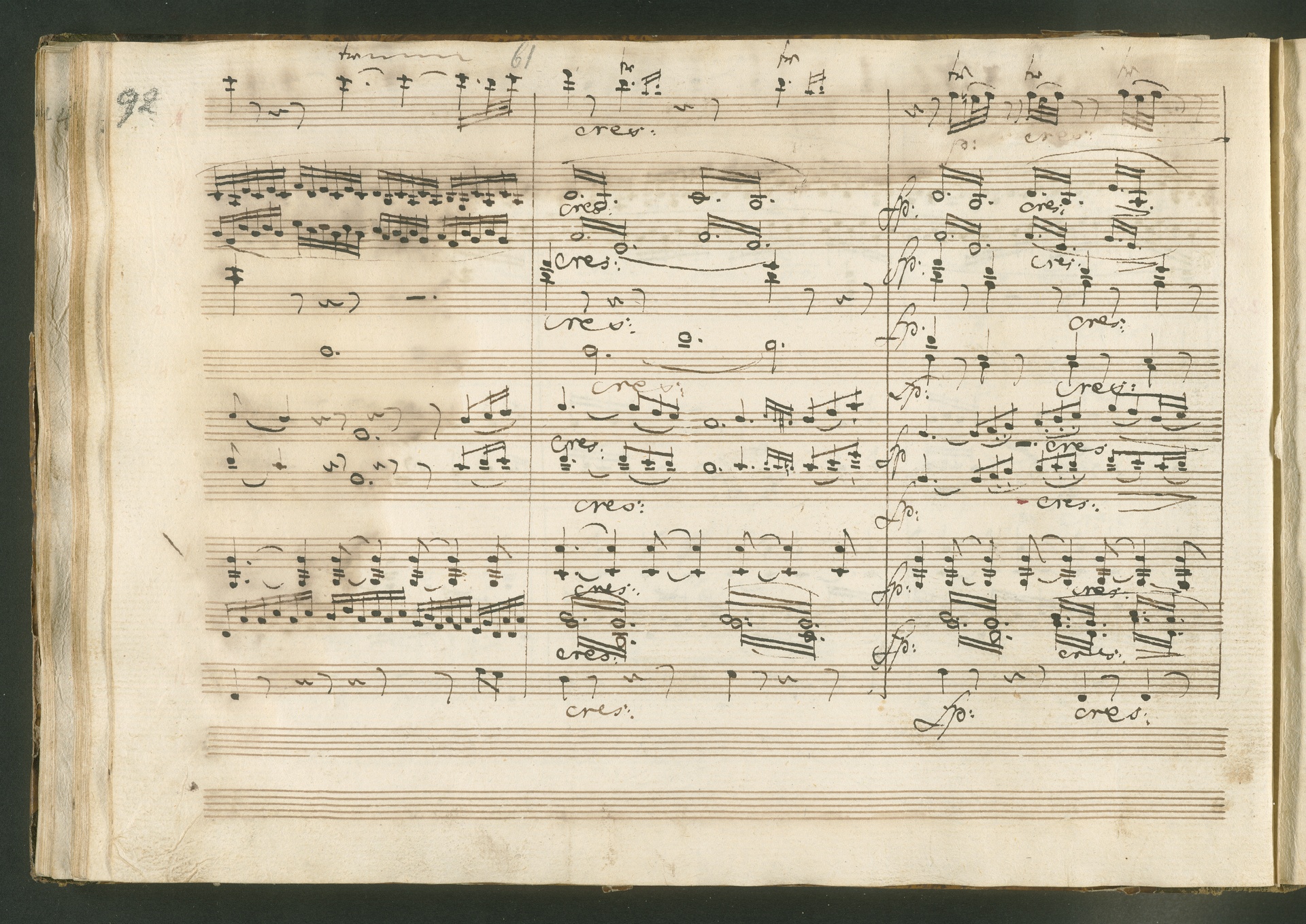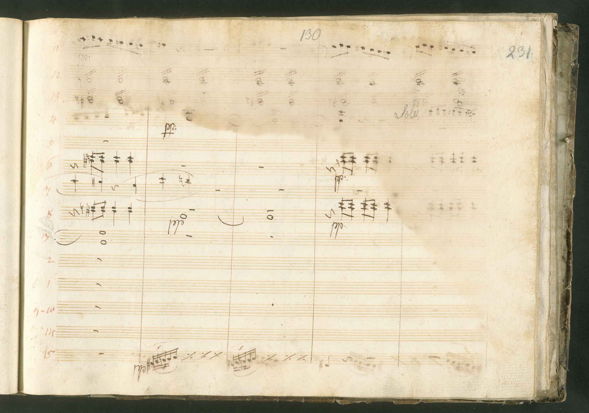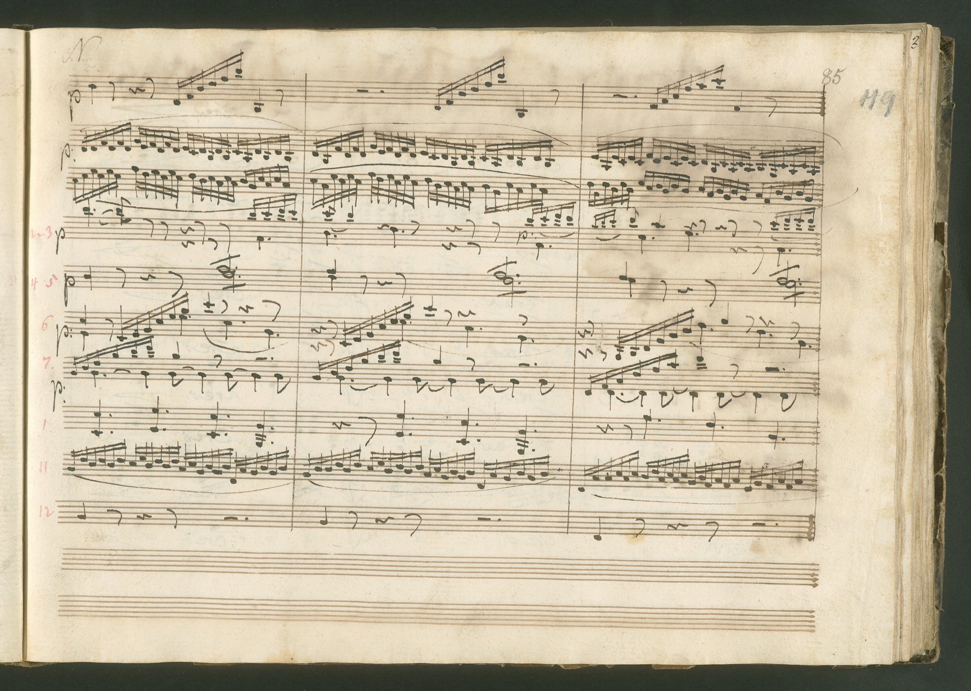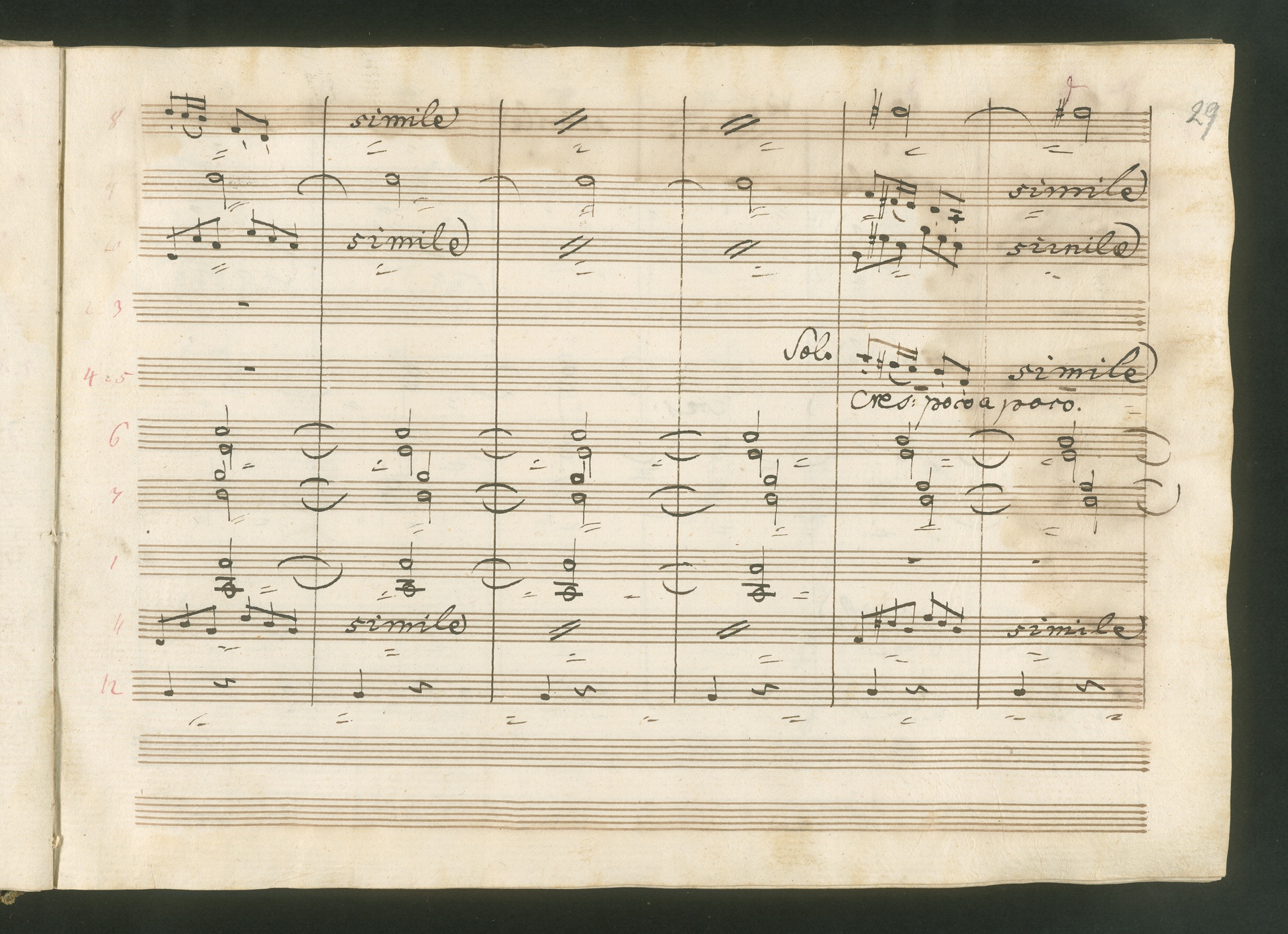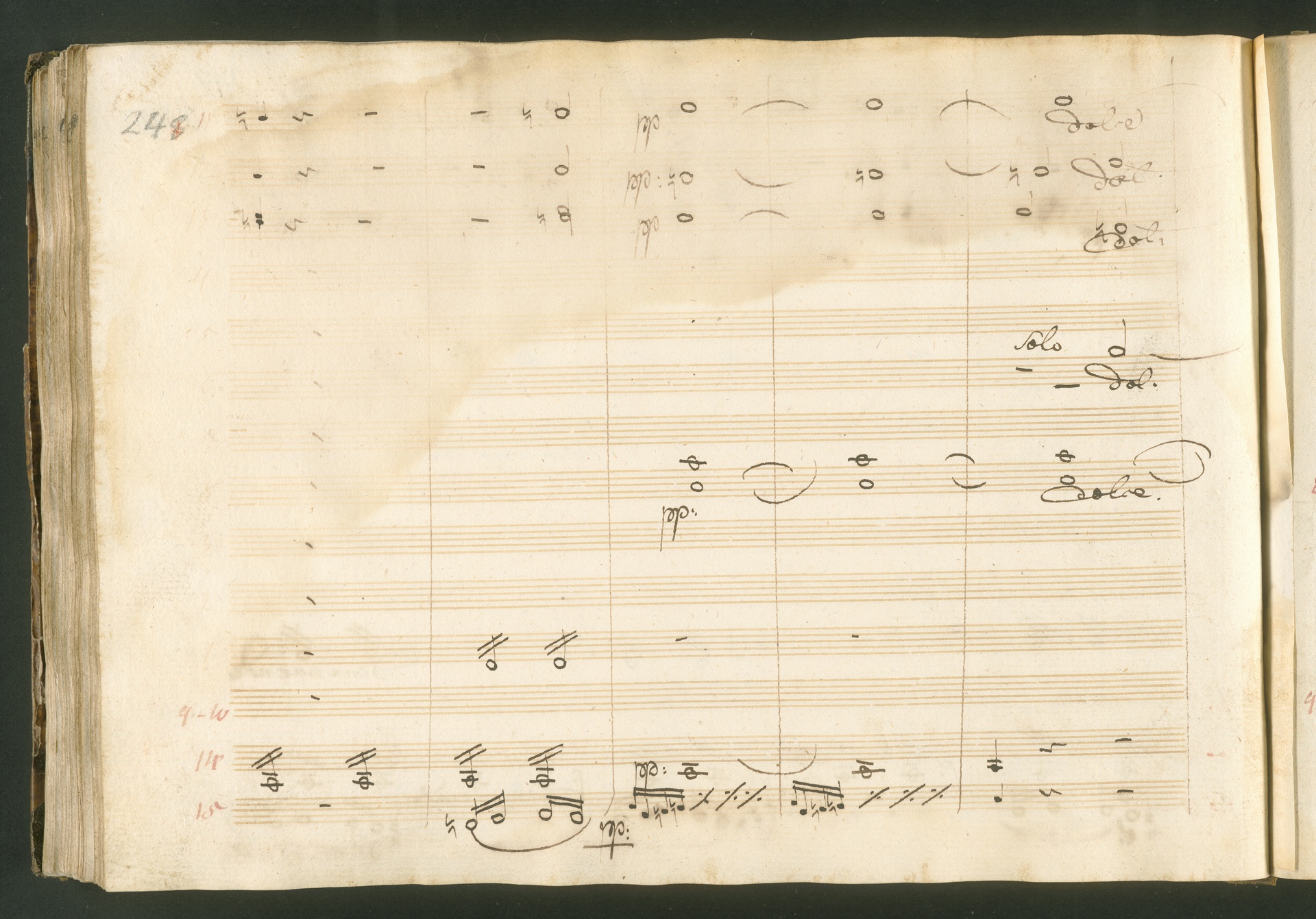 The manuscript shown here is a corrected copy of the Sixth Symphony, the "Pastoral". Beethoven sold the publisher Gottfried Christoph Härtel his Fifth and Sixth Symphonies (op. 67 und 68) in September 1808 on his visit to Vienna. The surviving correspondence shows that Beethoven did not give Härtel autograph scores but corrected copies as engraver's models for the original edition