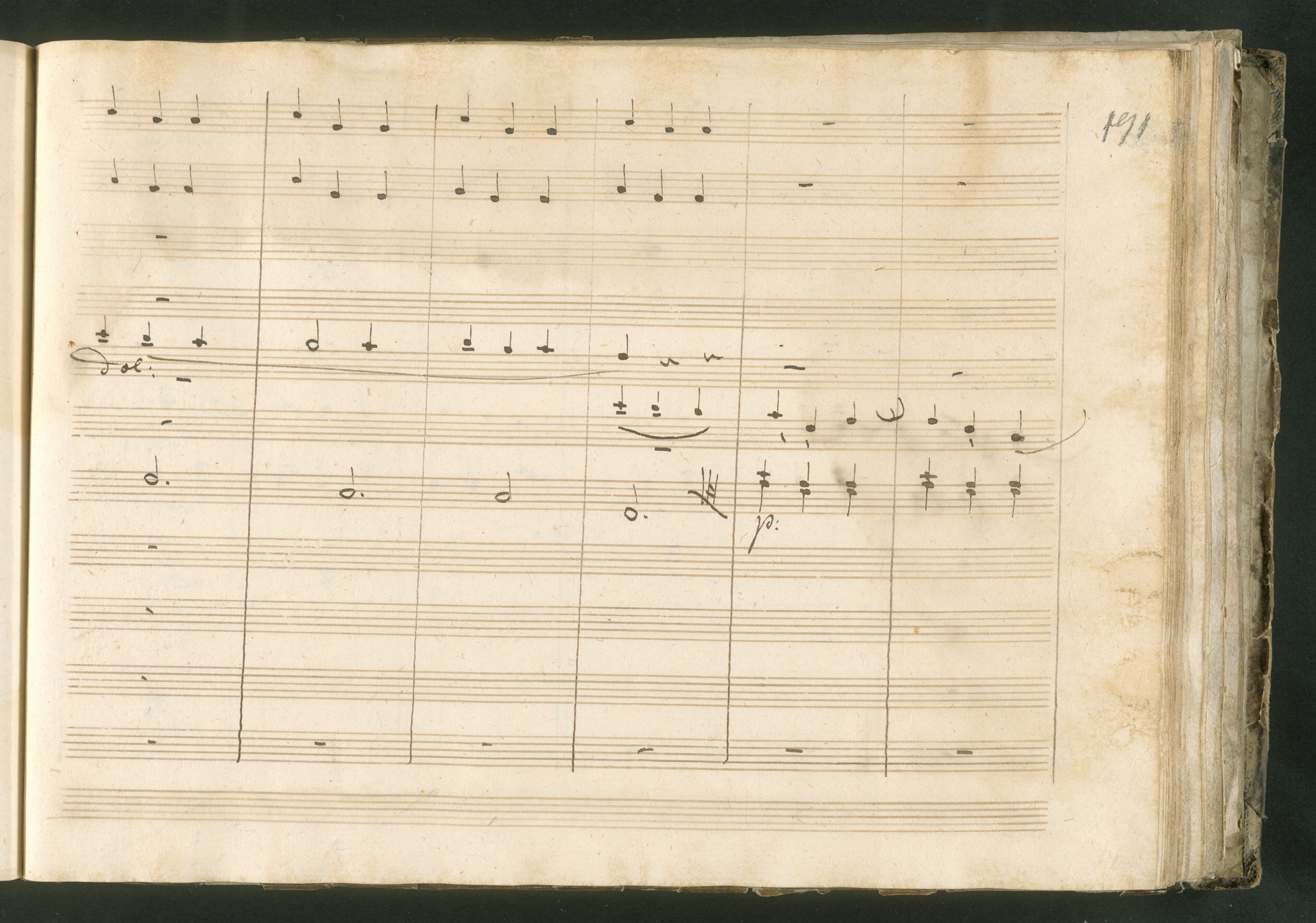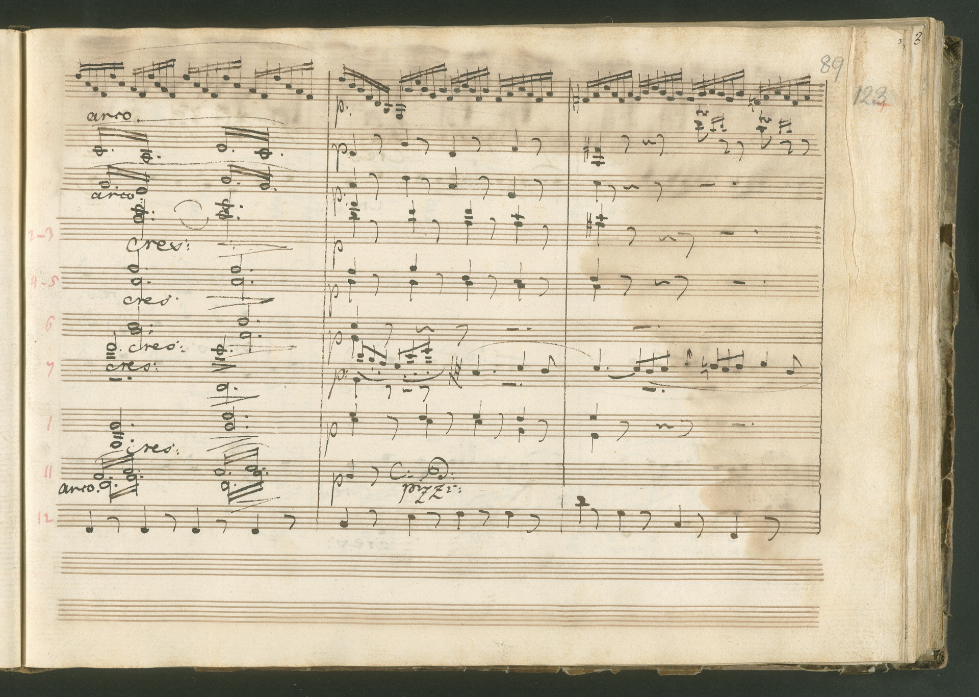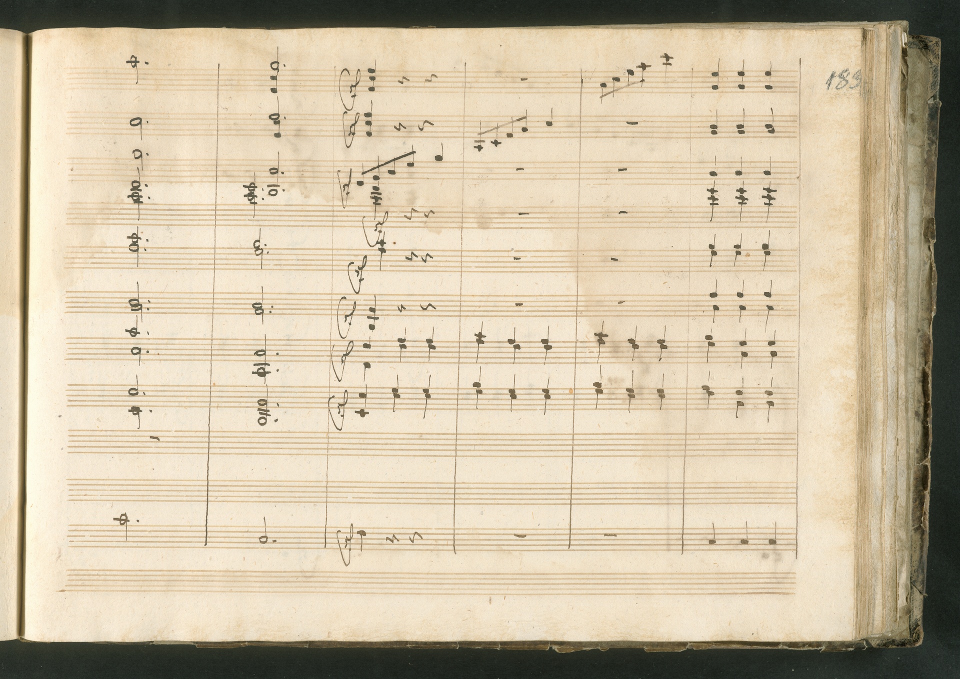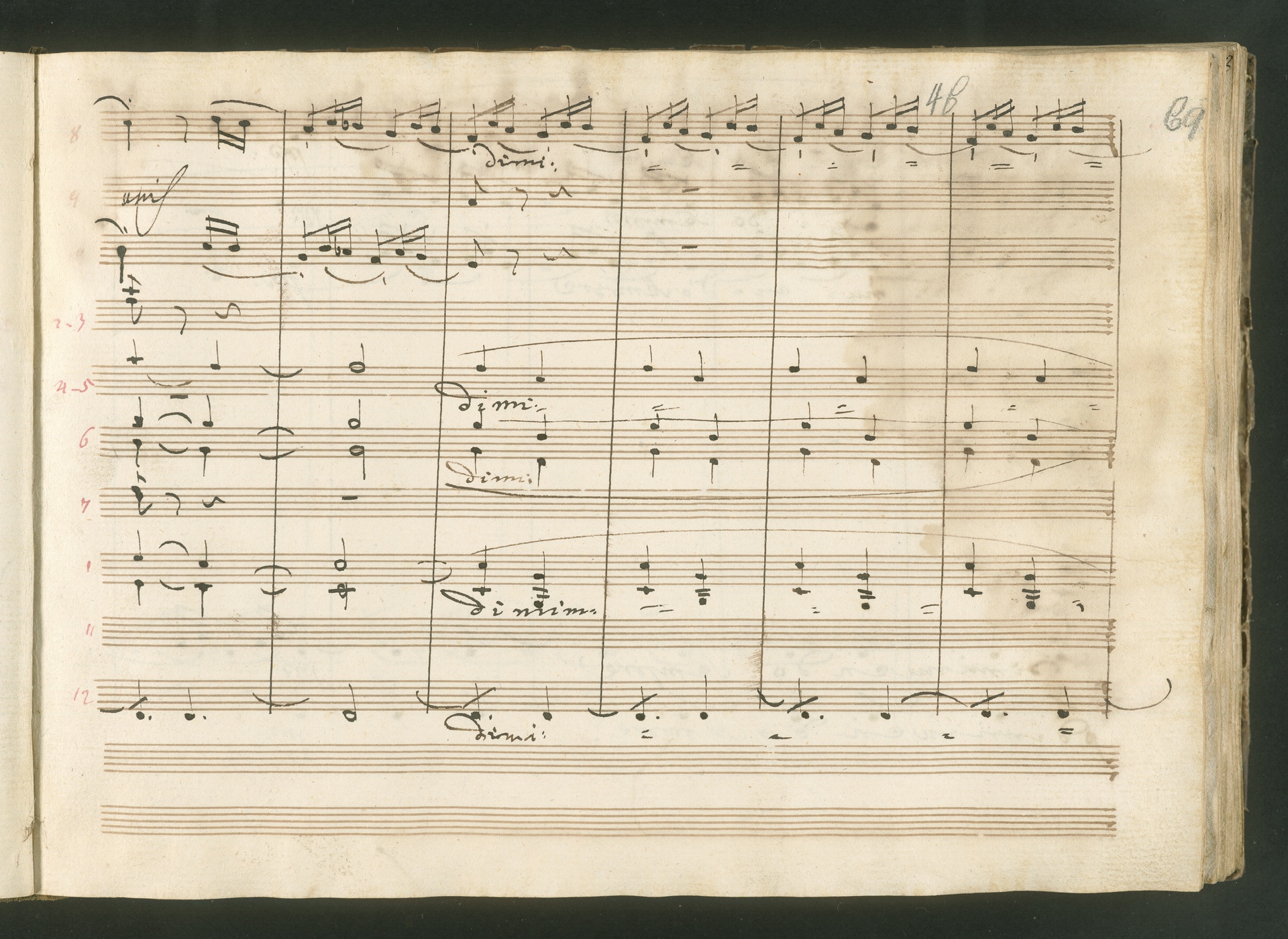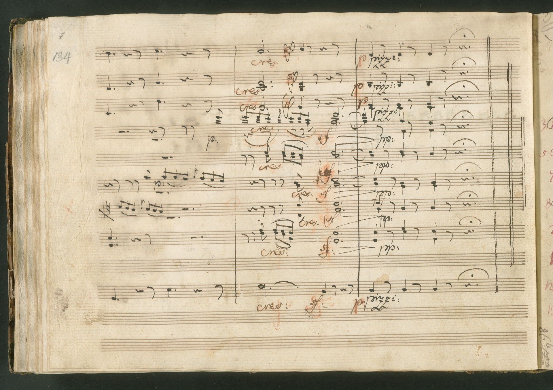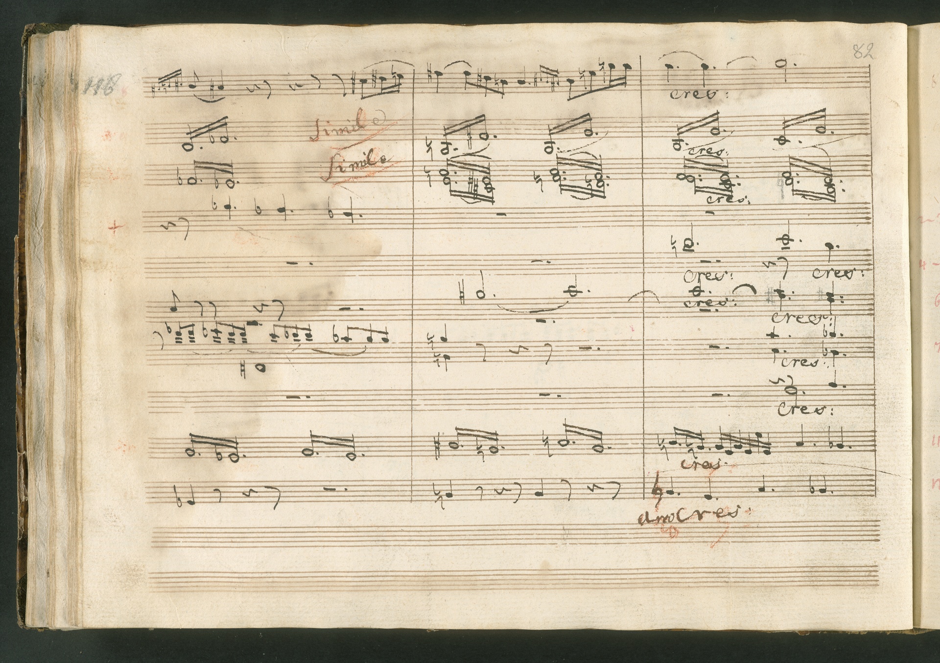 The manuscript shown here is a corrected copy of the Sixth Symphony, the "Pastoral". Beethoven sold the publisher Gottfried Christoph Härtel his Fifth and Sixth Symphonies (op. 67 und 68) in September 1808 on his visit to Vienna. The surviving correspondence shows that Beethoven did not give Härtel autograph scores but corrected copies as engraver's models for the original edition