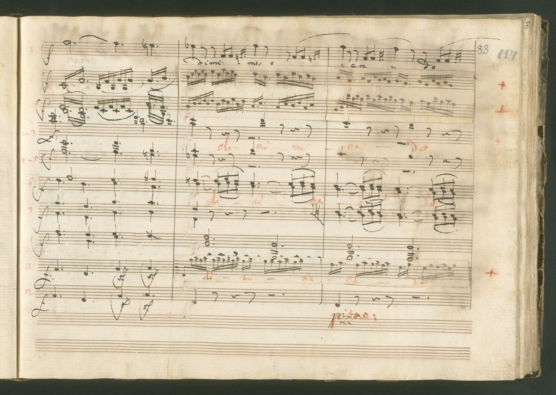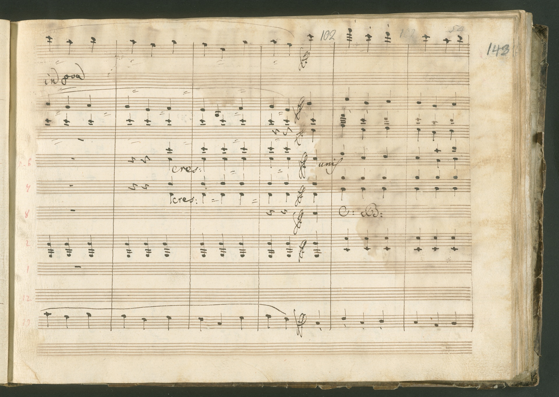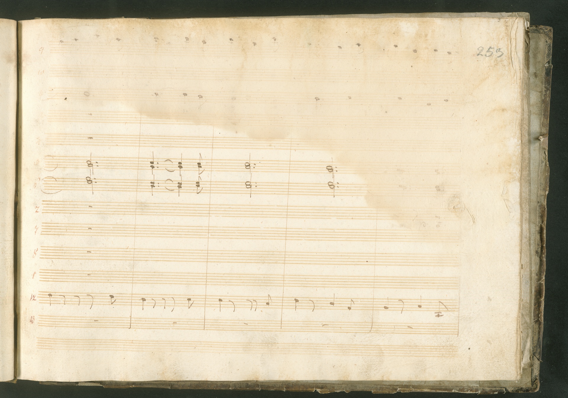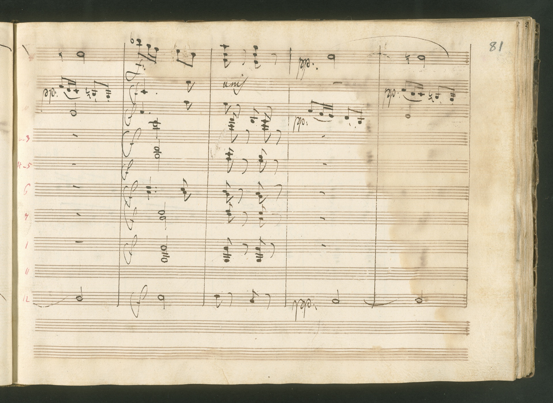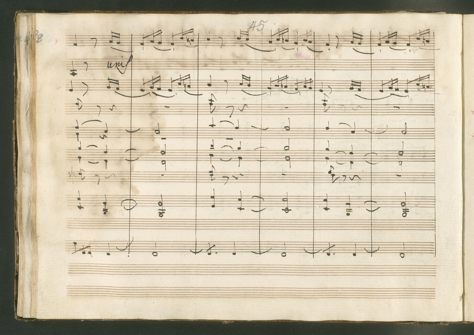 The manuscript shown here is a corrected copy of the Sixth Symphony, the "Pastoral". Beethoven sold the publisher Gottfried Christoph Härtel his Fifth and Sixth Symphonies (op. 67 und 68) in September 1808 on his visit to Vienna. The surviving correspondence shows that Beethoven did not give Härtel autograph scores but corrected copies as engraver's models for the original edition