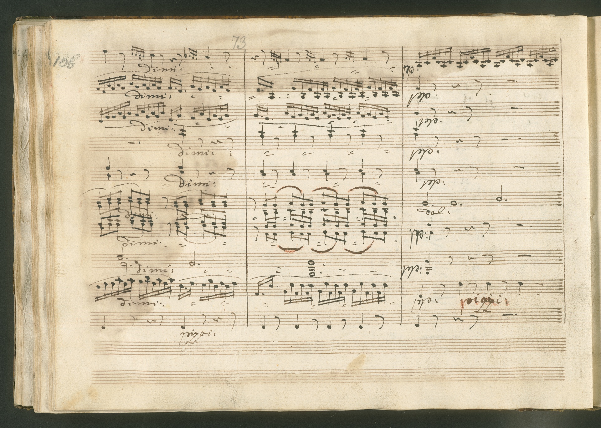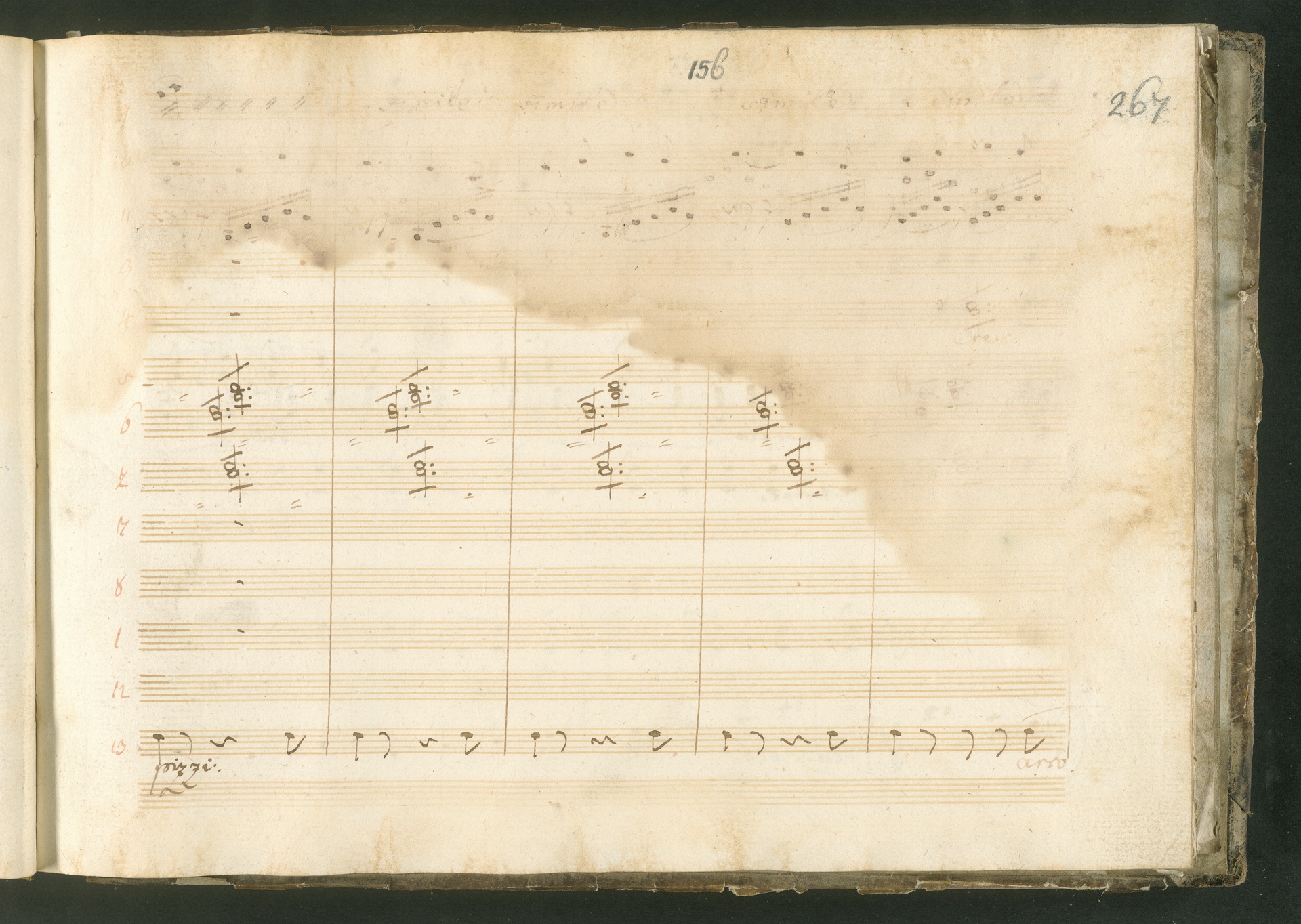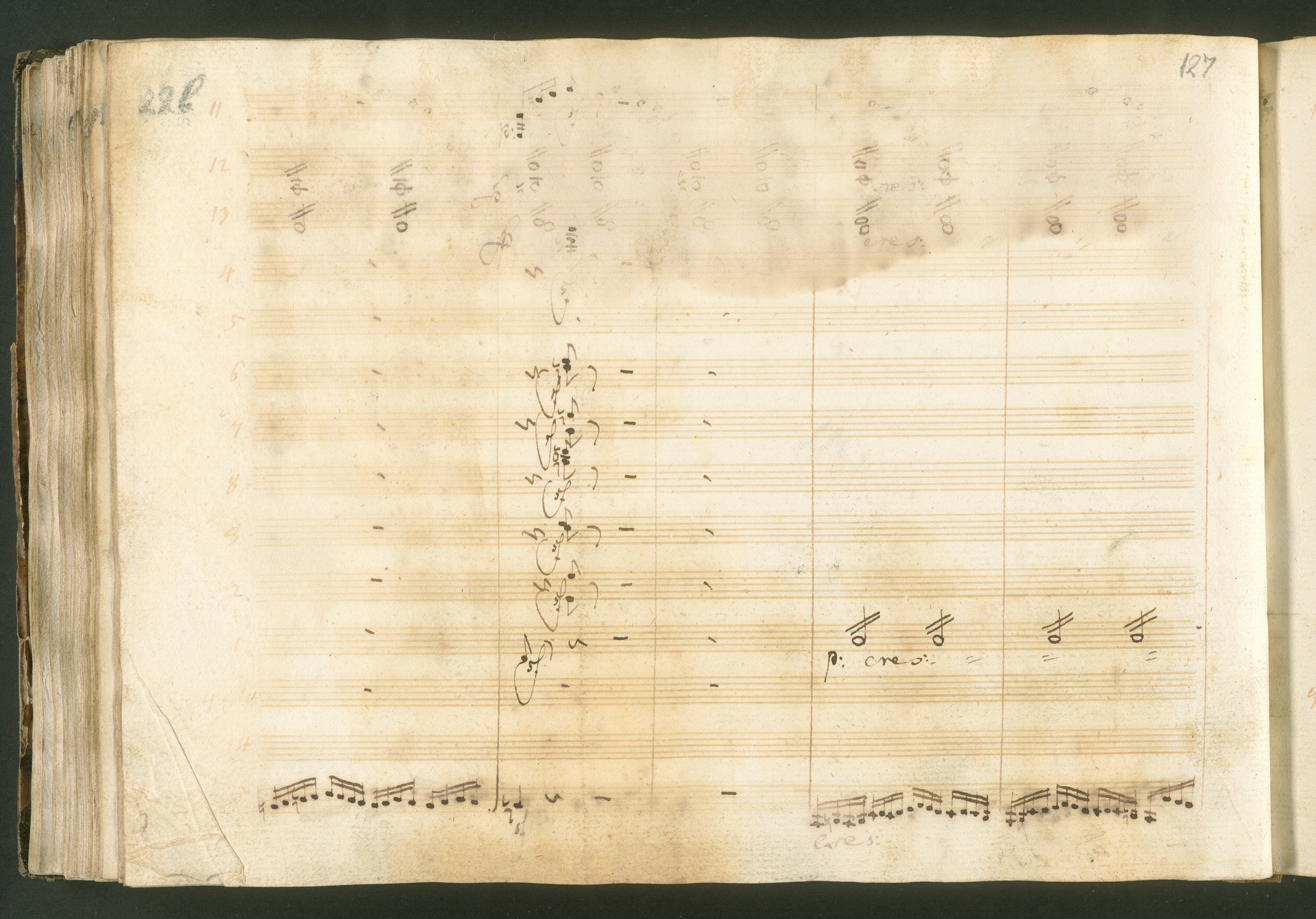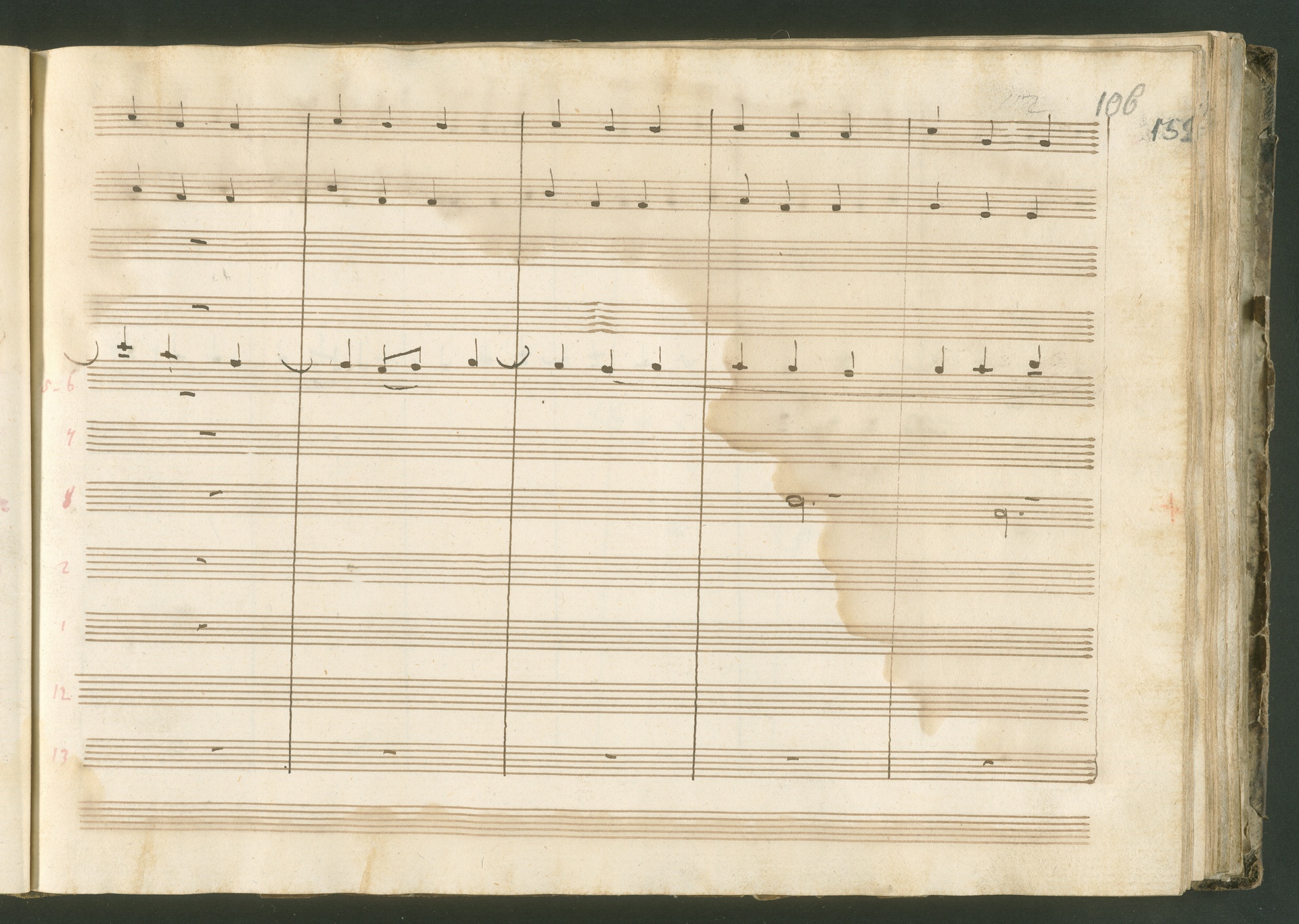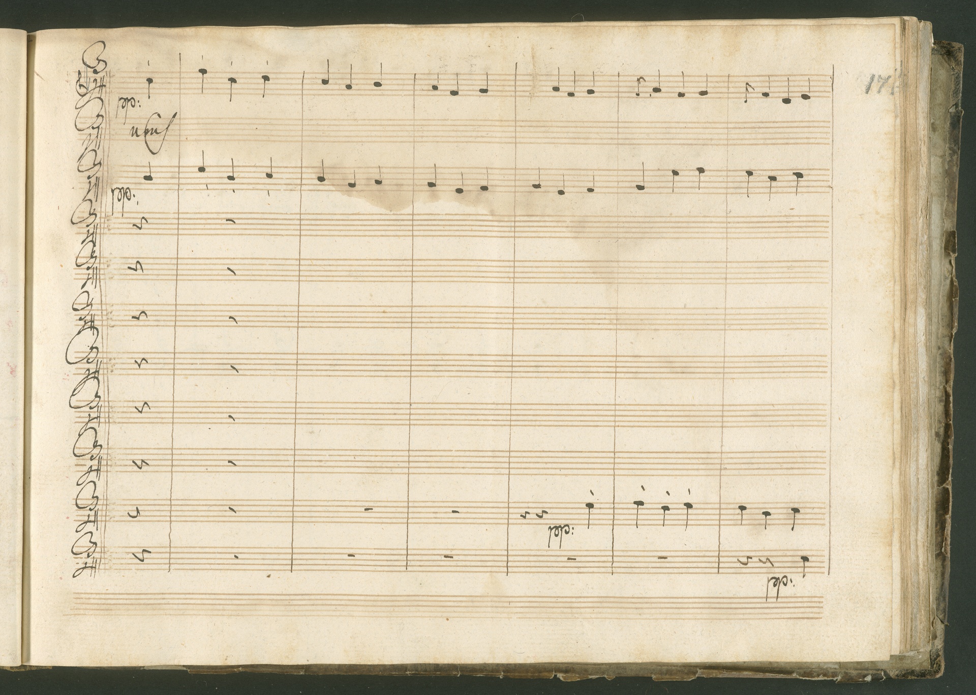 The manuscript shown here is a corrected copy of the Sixth Symphony, the "Pastoral". Beethoven sold the publisher Gottfried Christoph Härtel his Fifth and Sixth Symphonies (op. 67 und 68) in September 1808 on his visit to Vienna. The surviving correspondence shows that Beethoven did not give Härtel autograph scores but corrected copies as engraver's models for the original edition