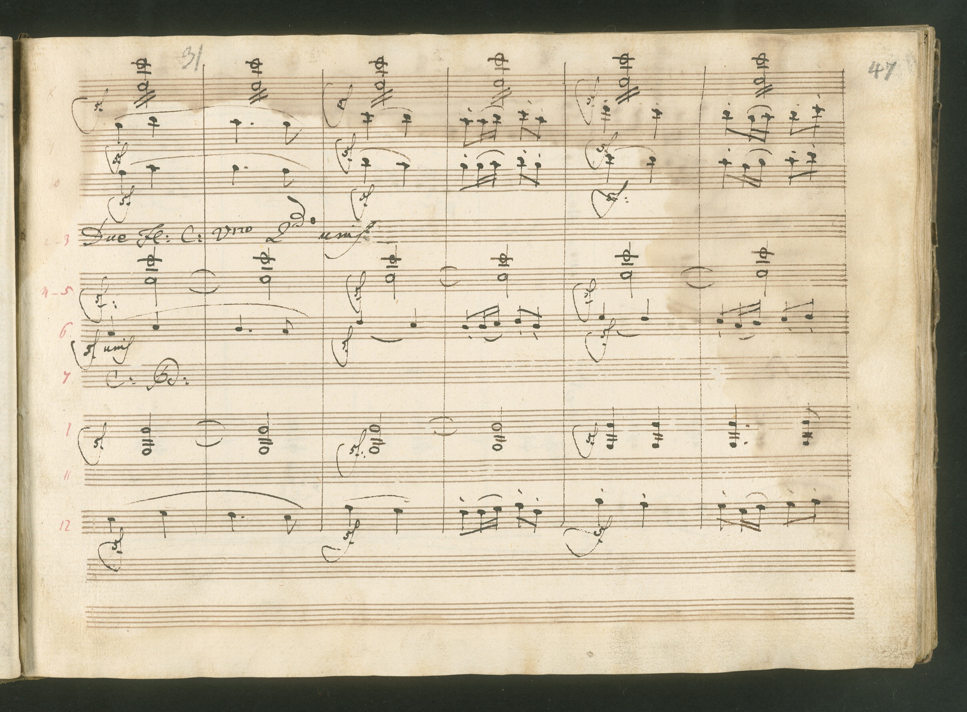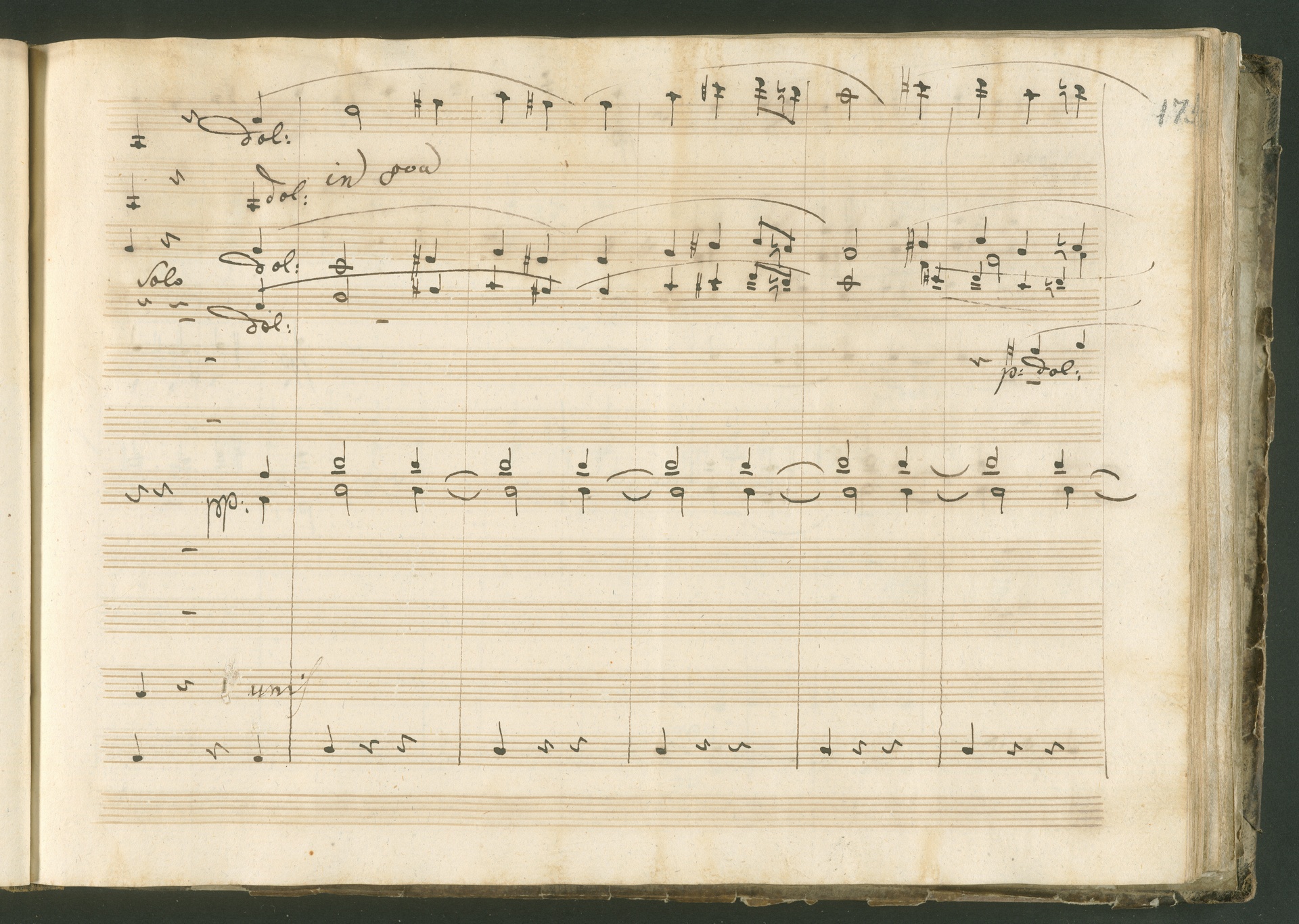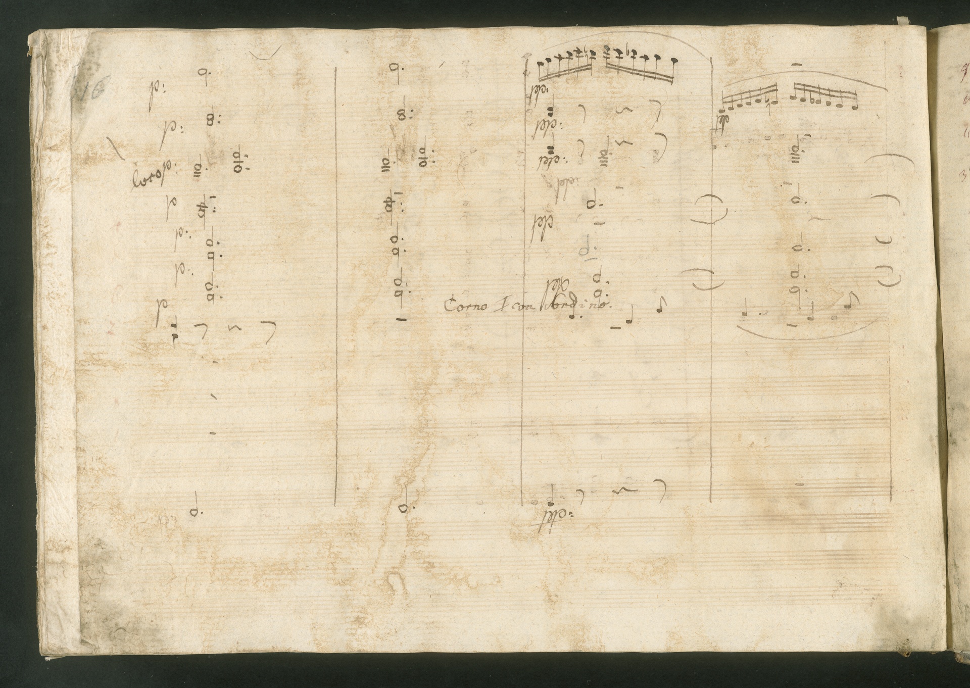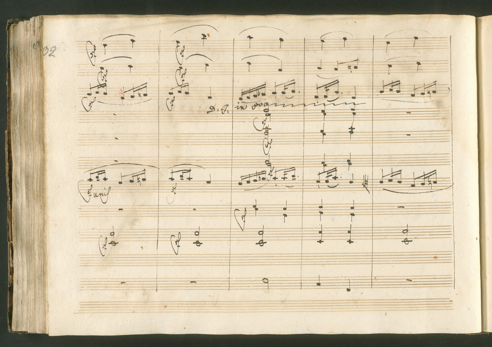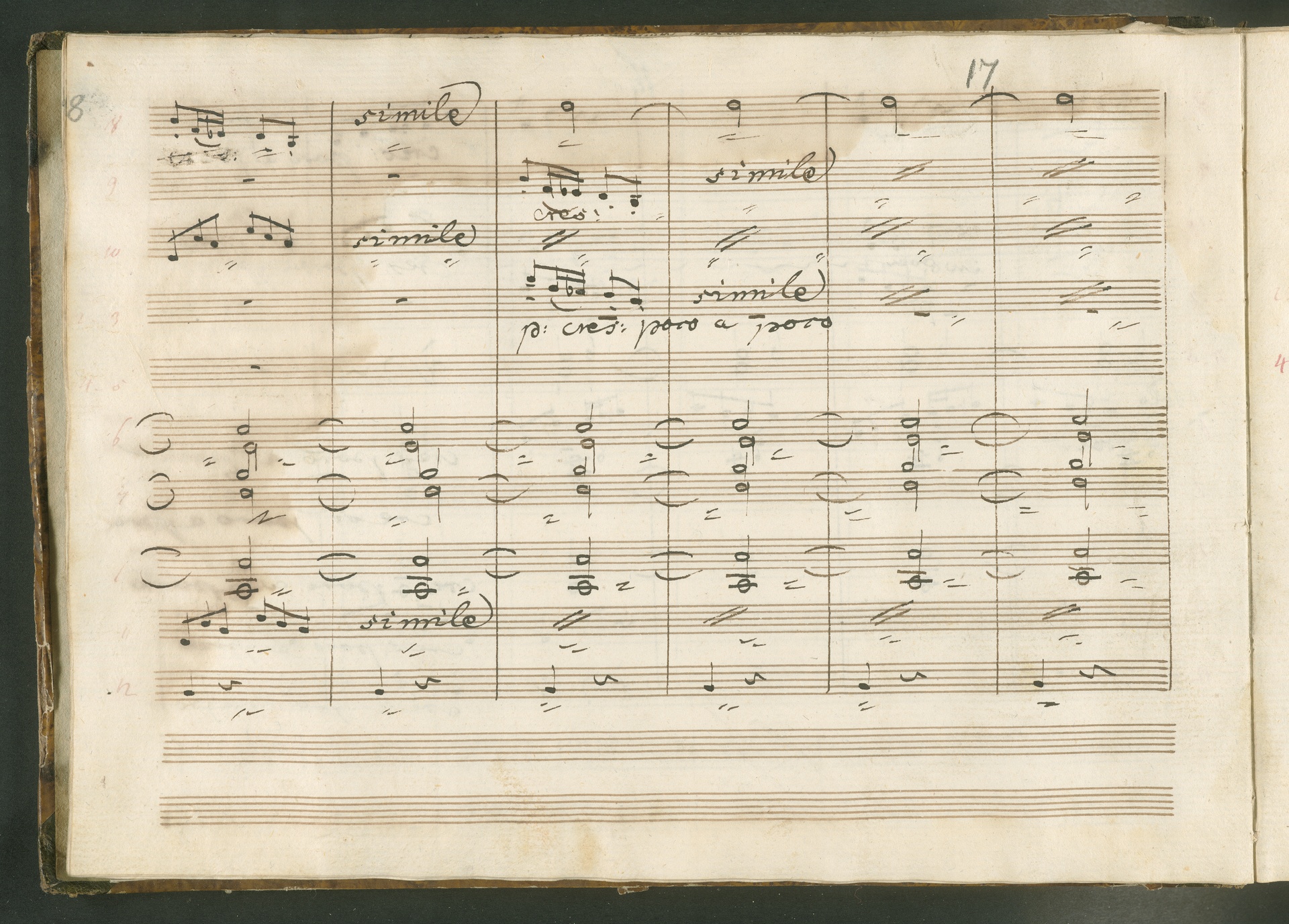 The manuscript shown here is a corrected copy of the Sixth Symphony, the "Pastoral". Beethoven sold the publisher Gottfried Christoph Härtel his Fifth and Sixth Symphonies (op. 67 und 68) in September 1808 on his visit to Vienna. The surviving correspondence shows that Beethoven did not give Härtel autograph scores but corrected copies as engraver's models for the original edition