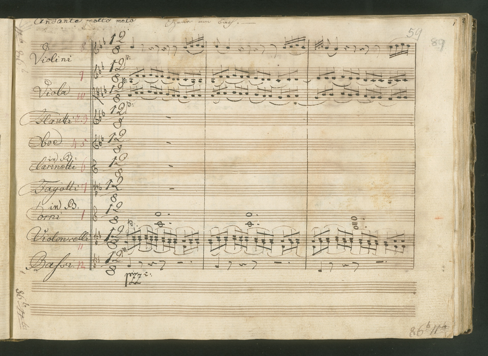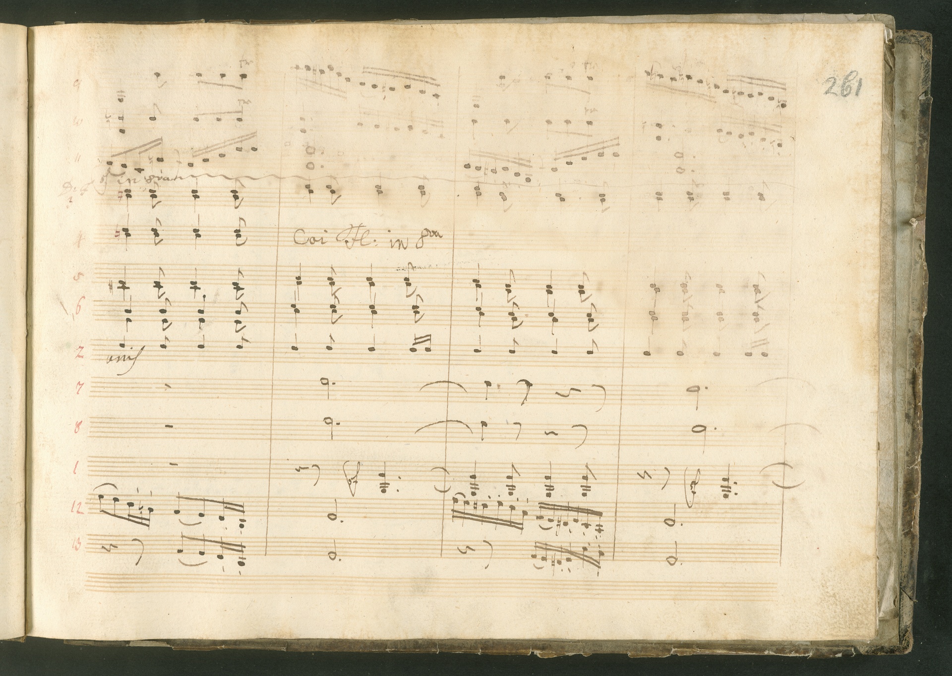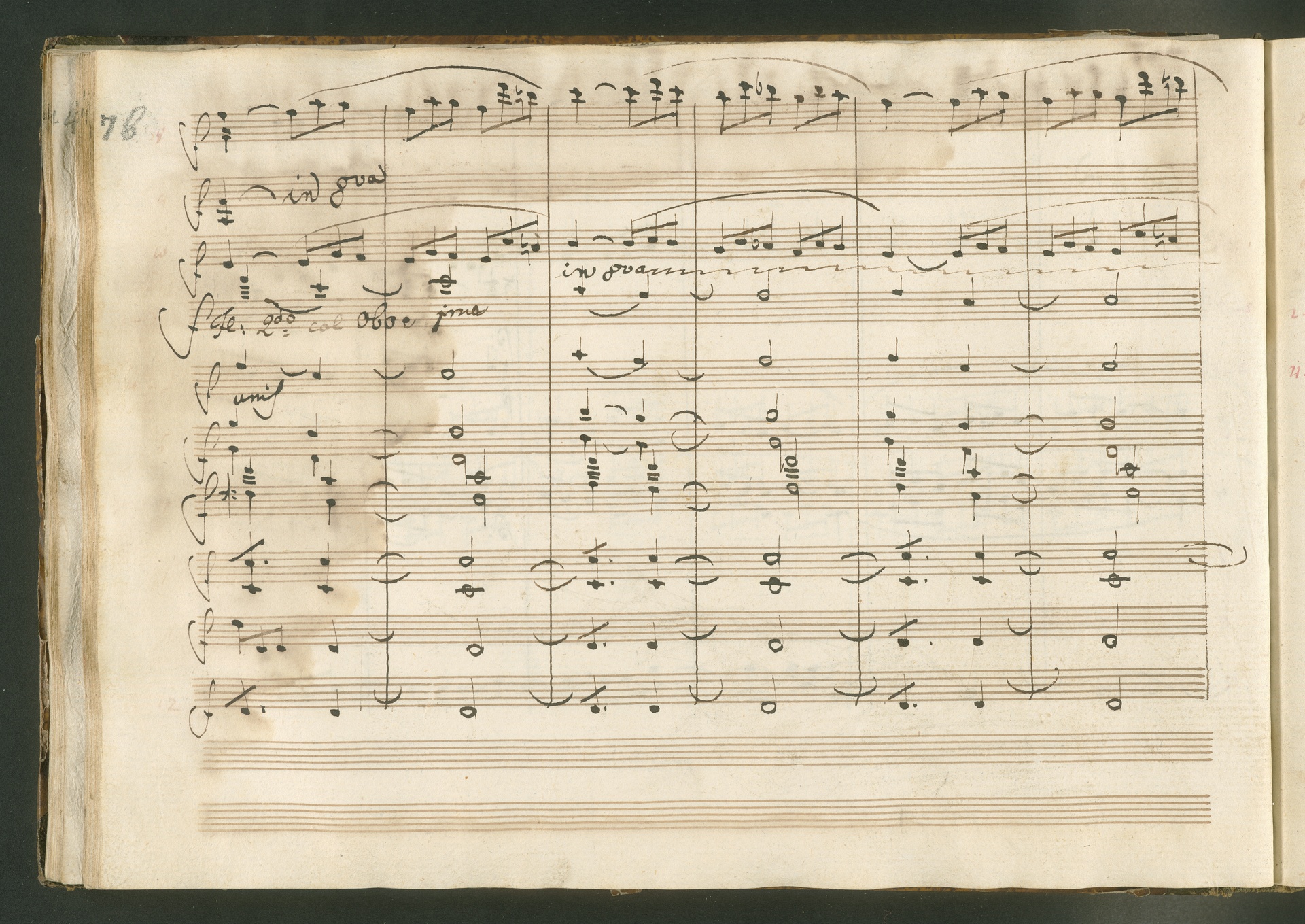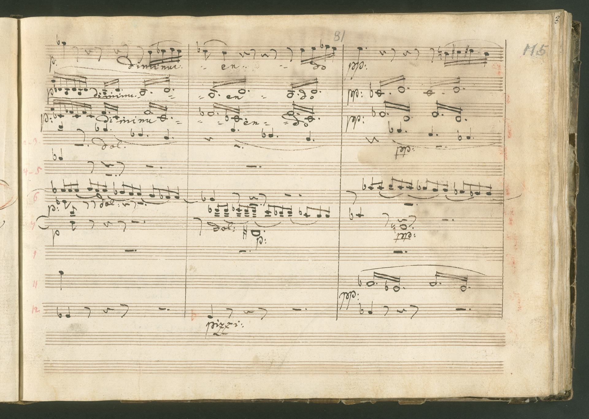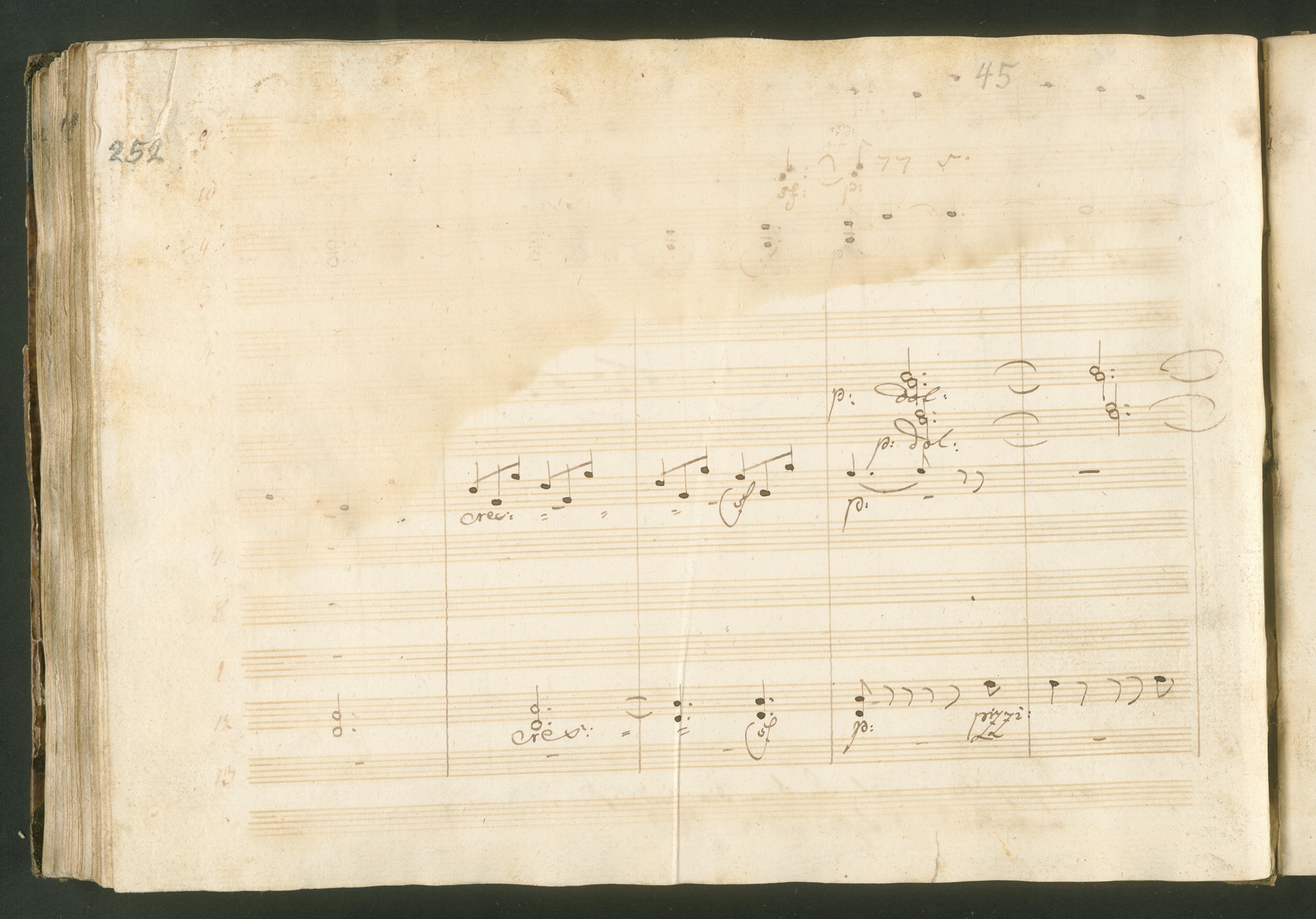 The manuscript shown here is a corrected copy of the Sixth Symphony, the "Pastoral". Beethoven sold the publisher Gottfried Christoph Härtel his Fifth and Sixth Symphonies (op. 67 und 68) in September 1808 on his visit to Vienna. The surviving correspondence shows that Beethoven did not give Härtel autograph scores but corrected copies as engraver's models for the original edition