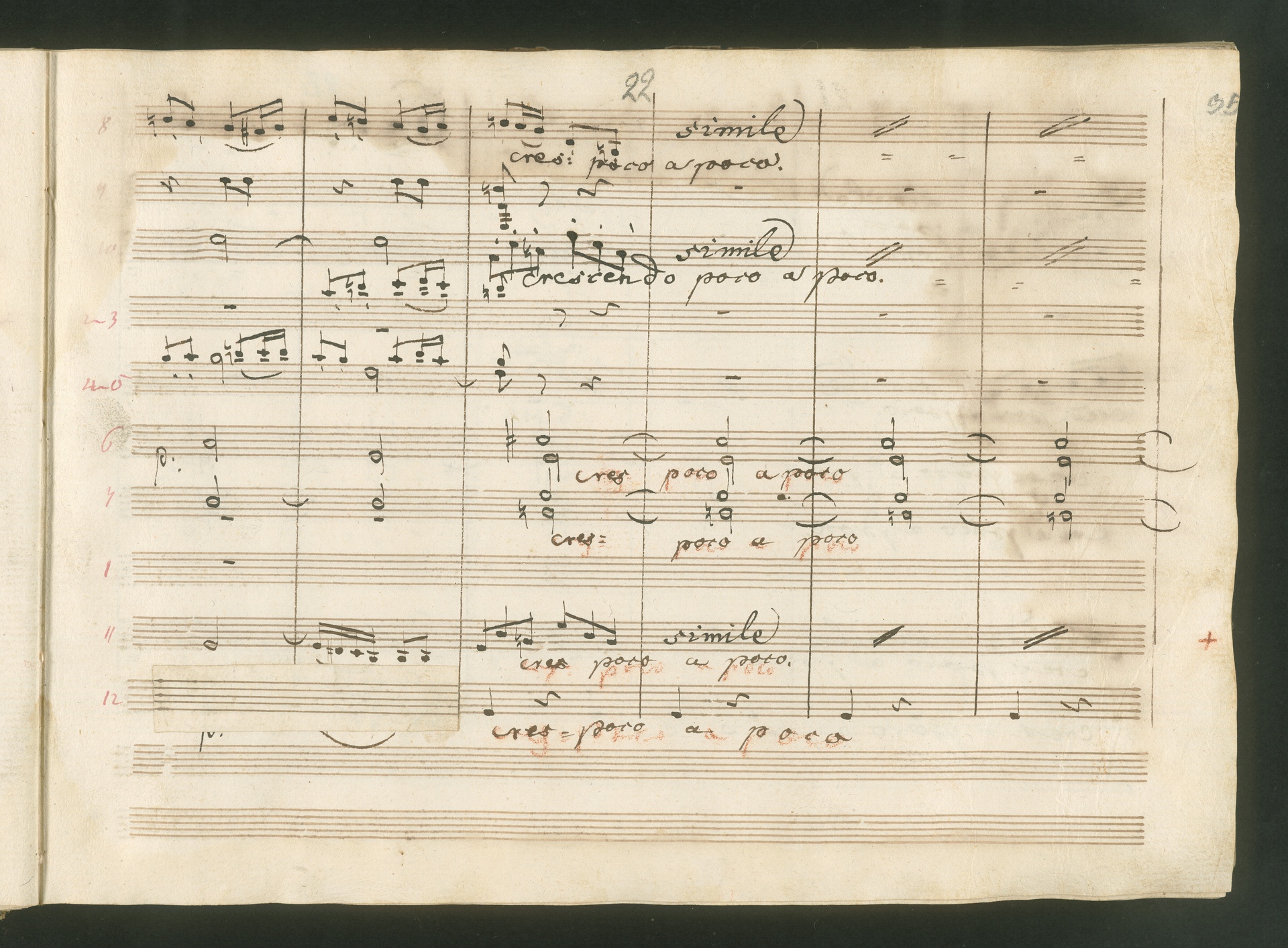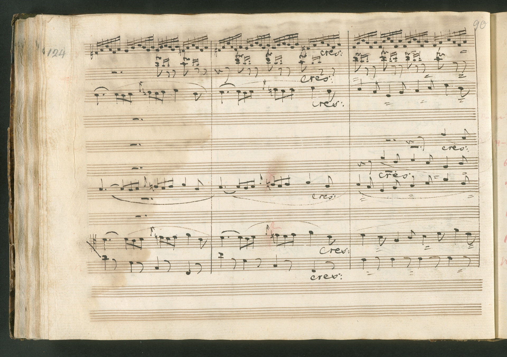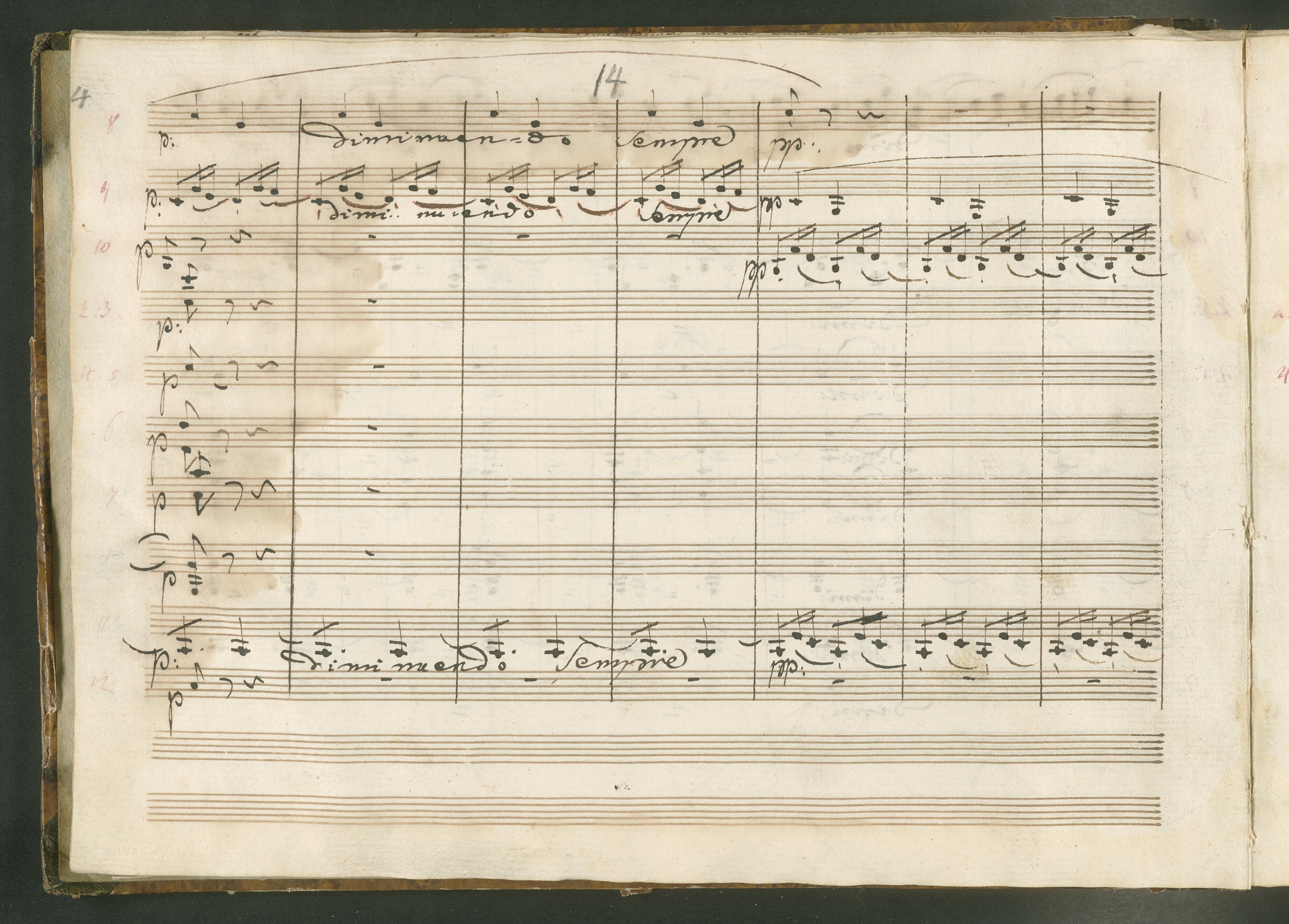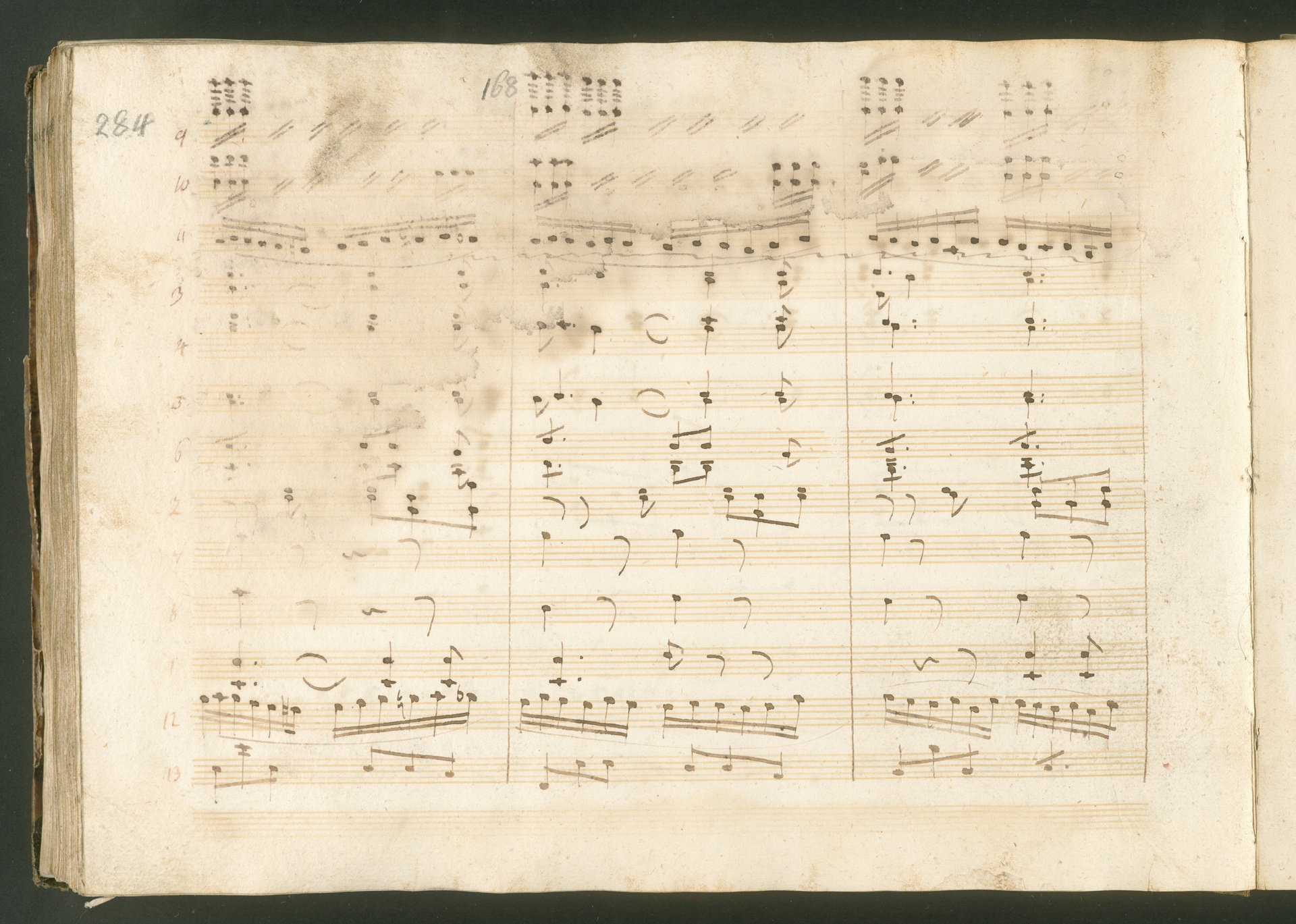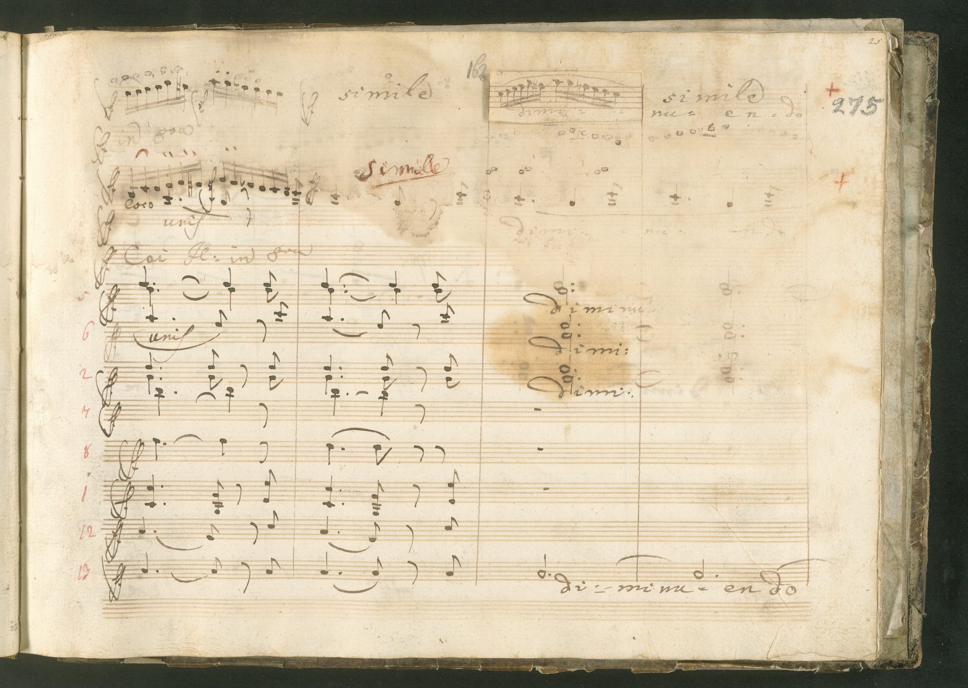 The manuscript shown here is a corrected copy of the Sixth Symphony, the "Pastoral". Beethoven sold the publisher Gottfried Christoph Härtel his Fifth and Sixth Symphonies (op. 67 und 68) in September 1808 on his visit to Vienna. The surviving correspondence shows that Beethoven did not give Härtel autograph scores but corrected copies as engraver's models for the original edition