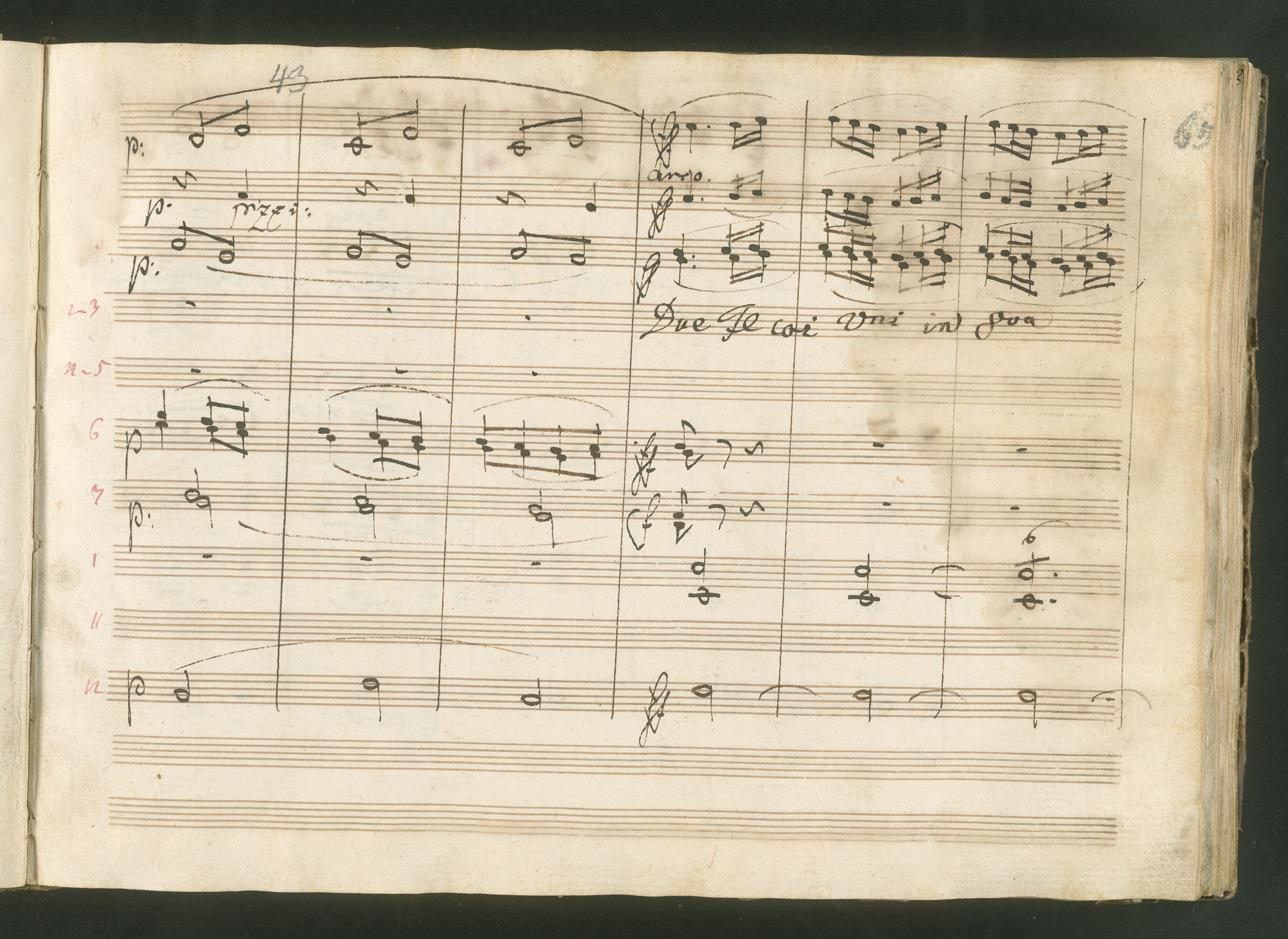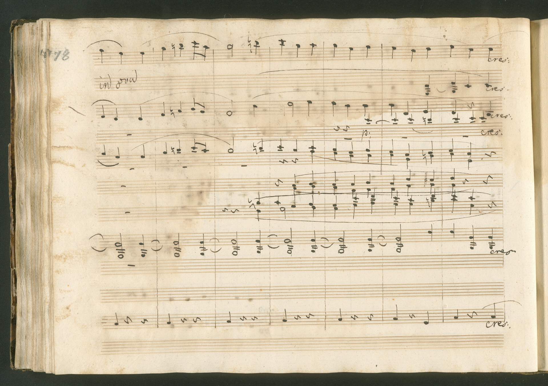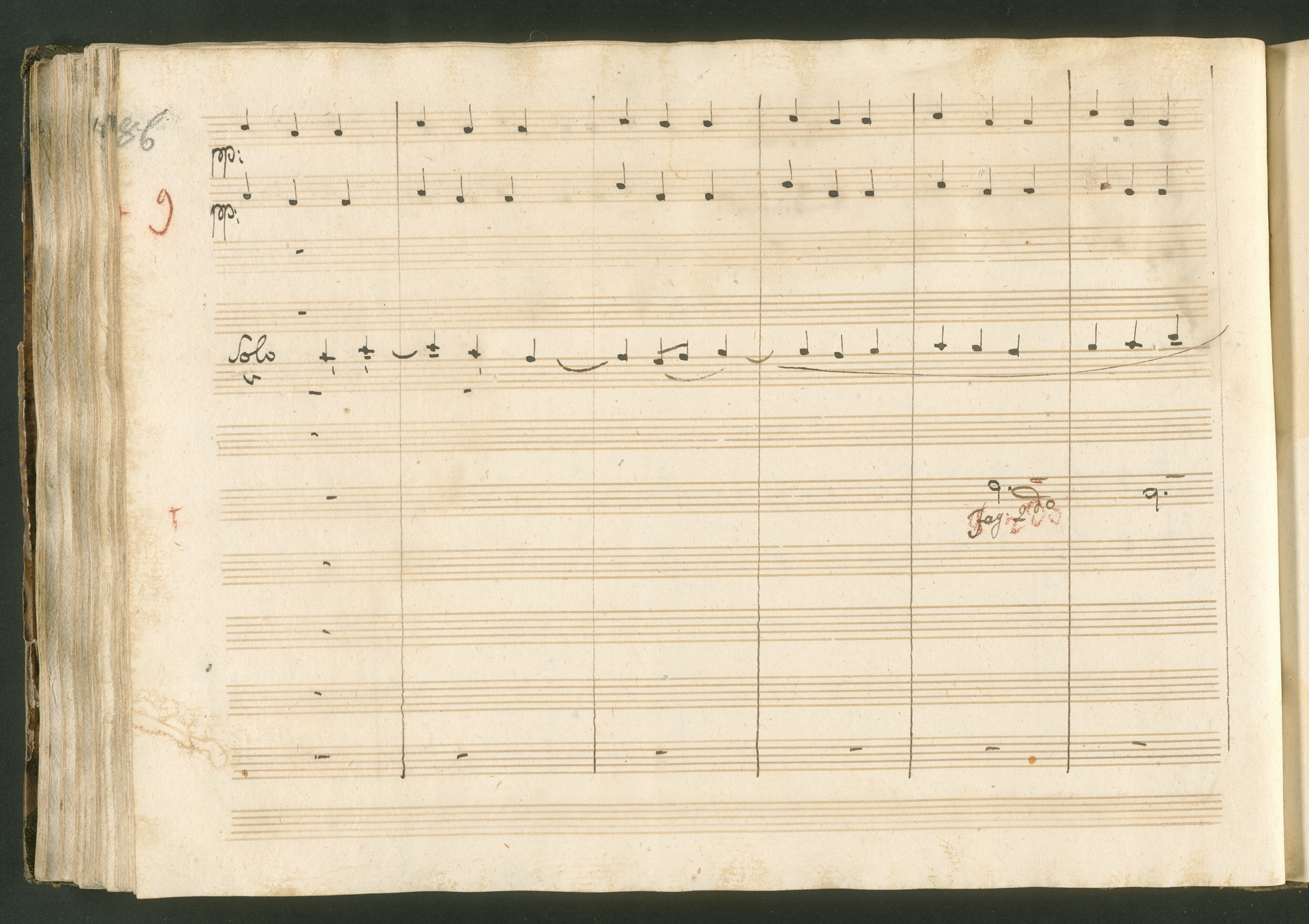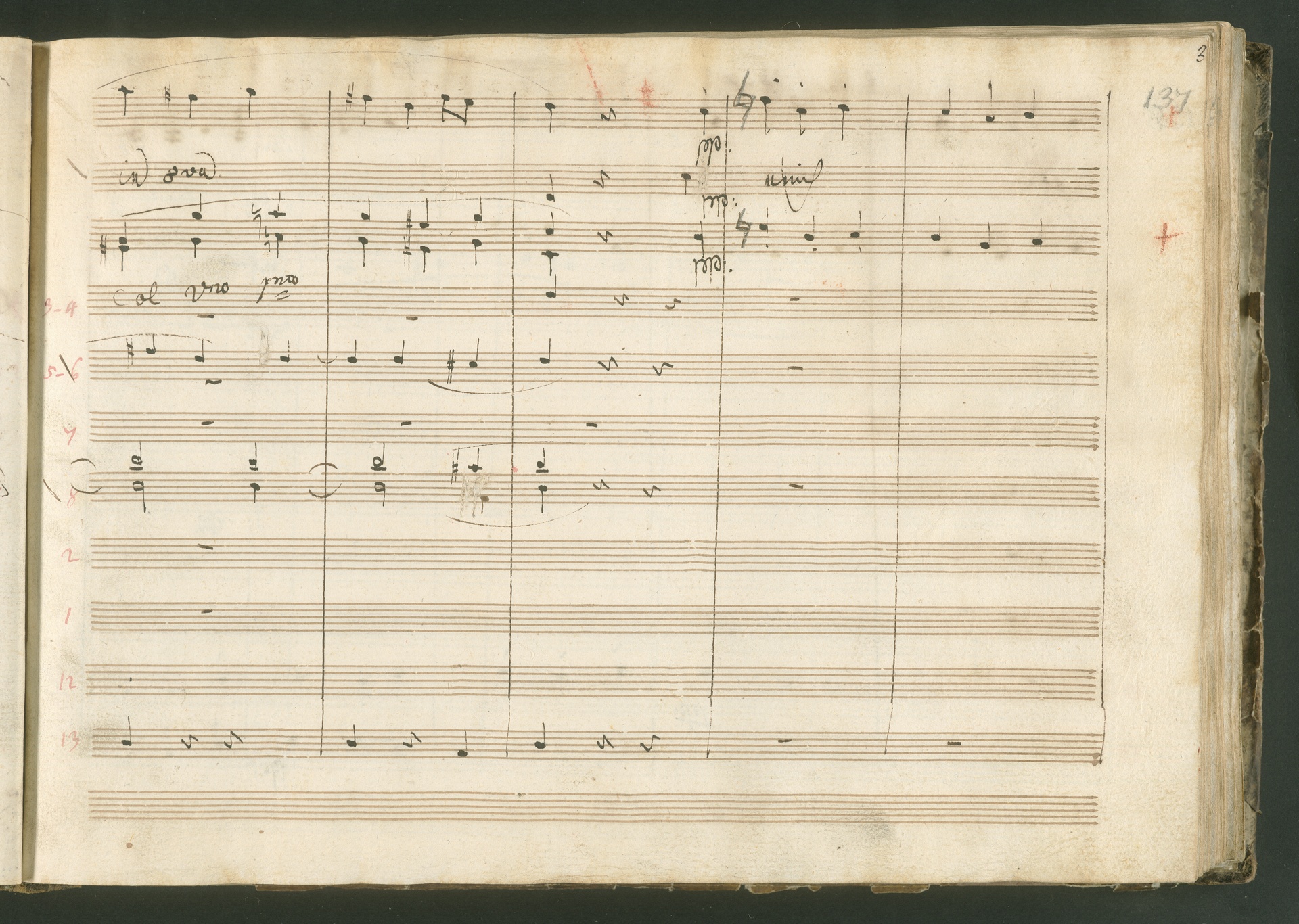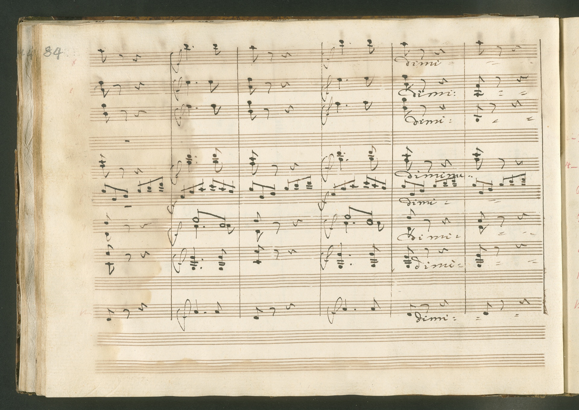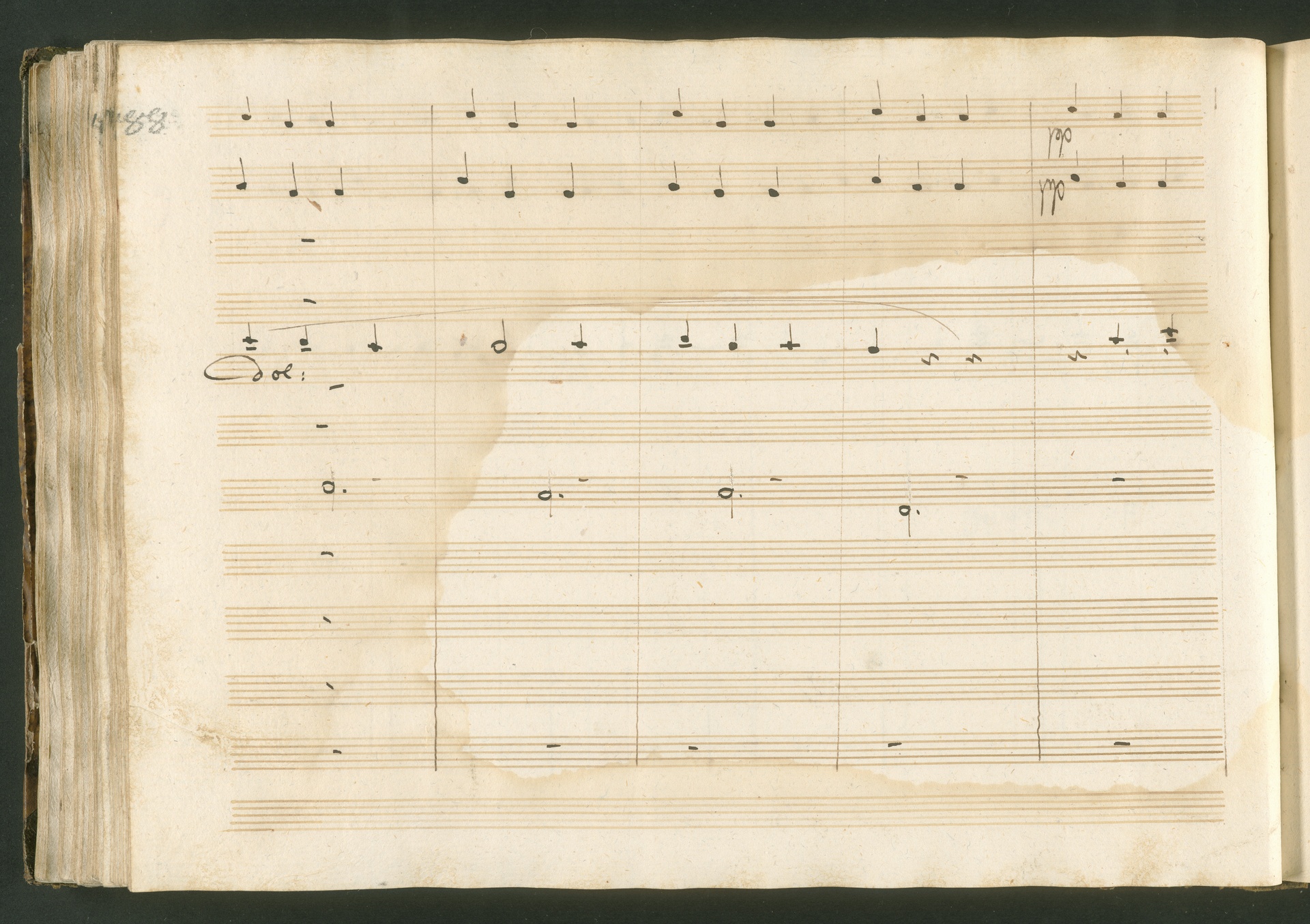 The manuscript shown here is a corrected copy of the Sixth Symphony, the "Pastoral". Beethoven sold the publisher Gottfried Christoph Härtel his Fifth and Sixth Symphonies (op. 67 und 68) in September 1808 on his visit to Vienna. The surviving correspondence shows that Beethoven did not give Härtel autograph scores but corrected copies as engraver's models for the original edition