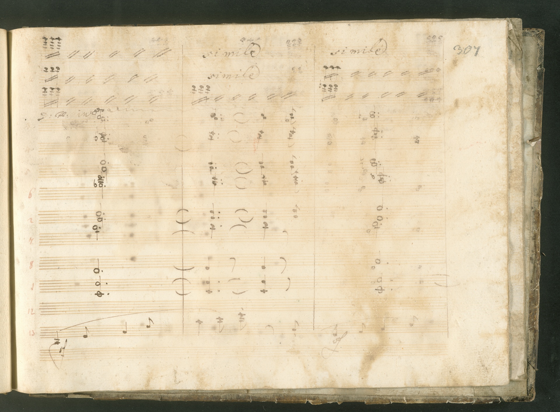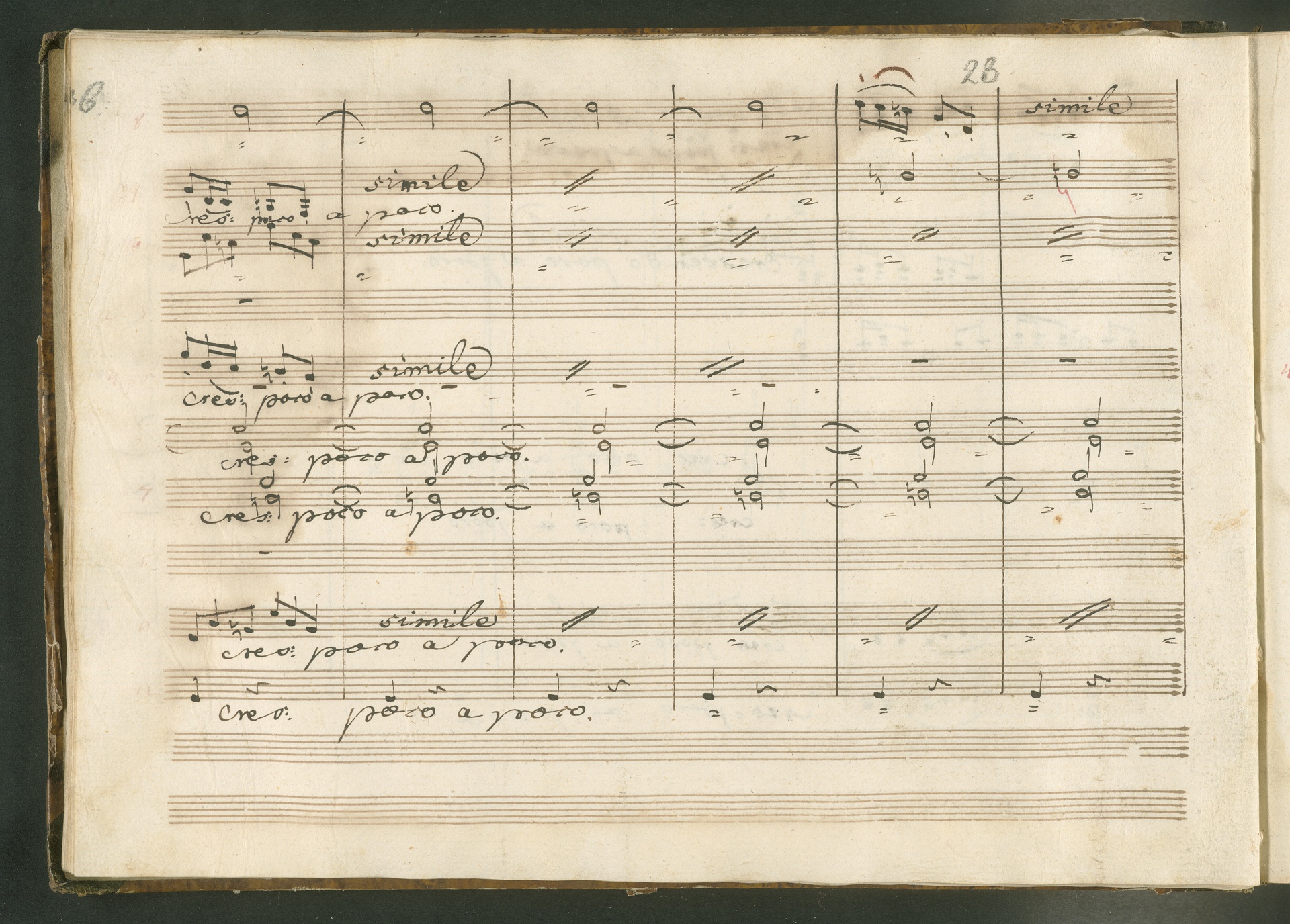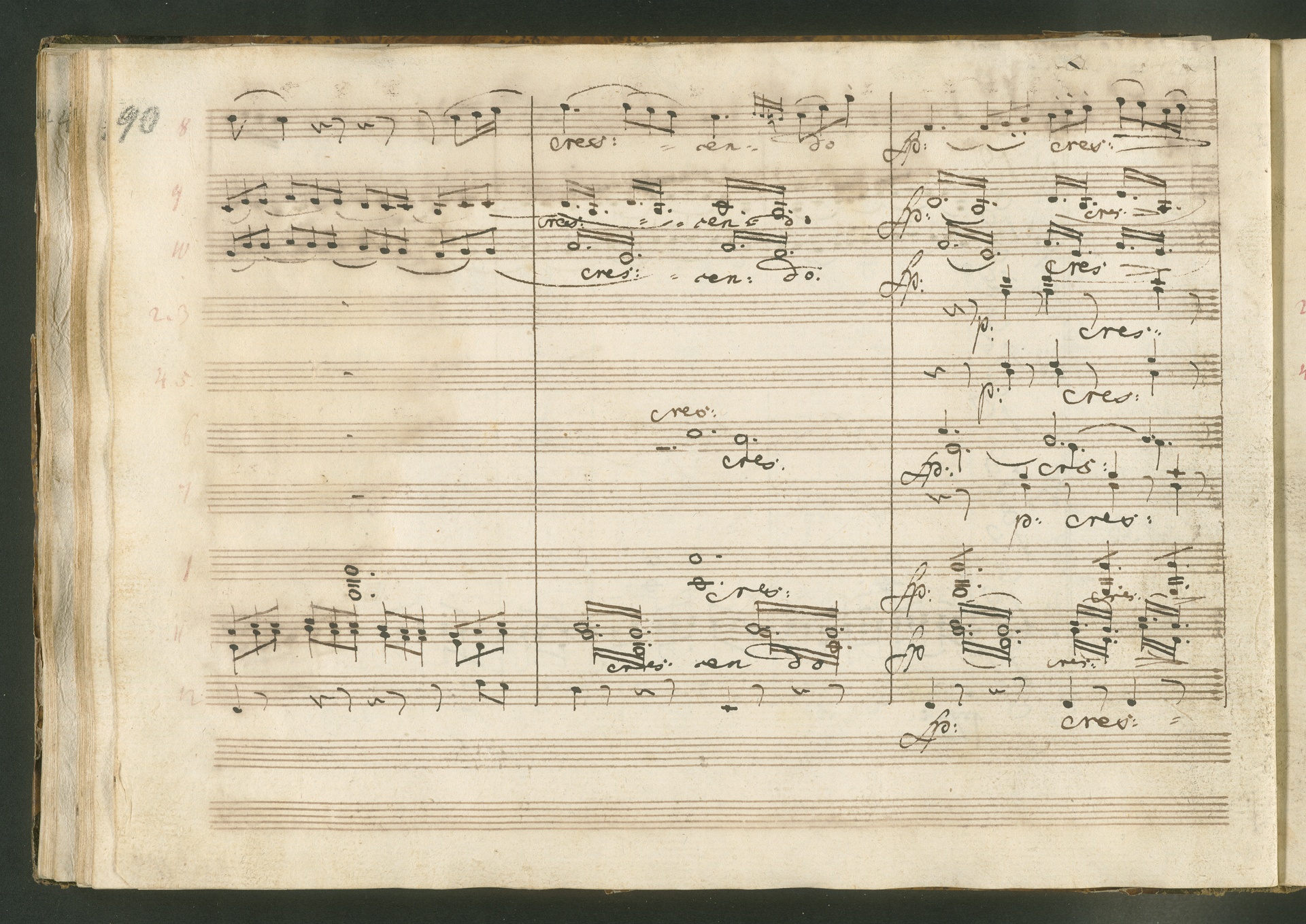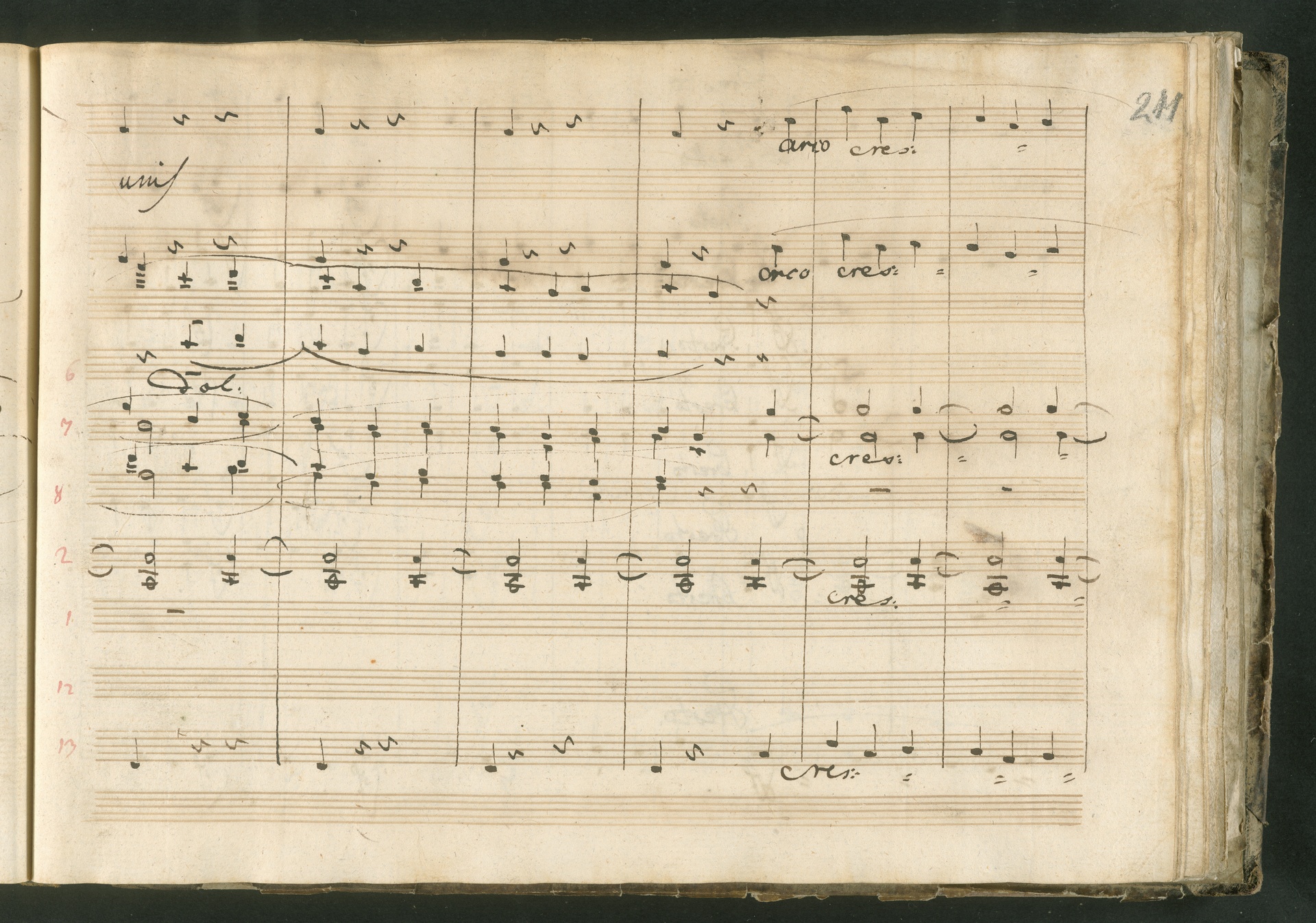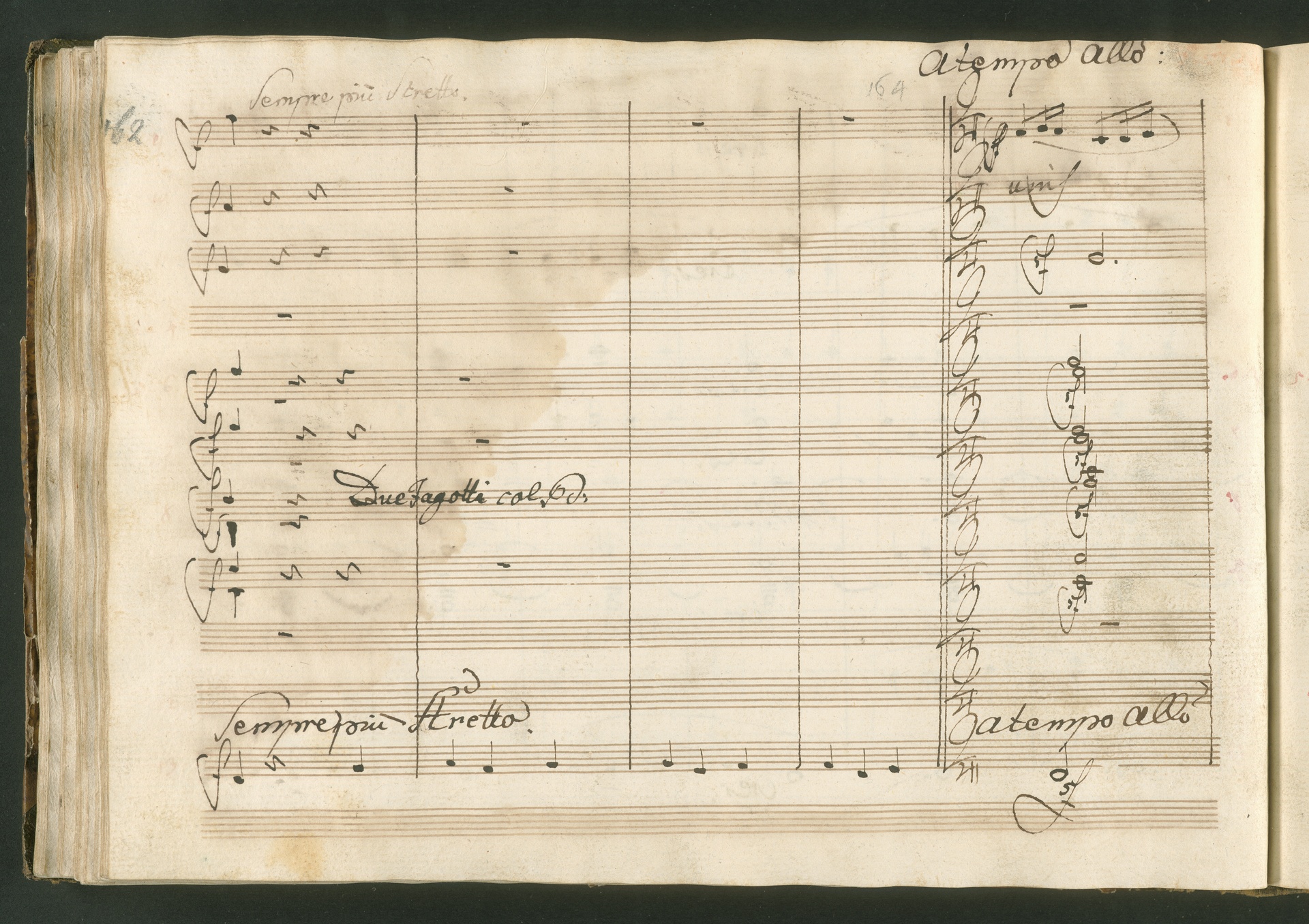 The manuscript shown here is a corrected copy of the Sixth Symphony, the "Pastoral". Beethoven sold the publisher Gottfried Christoph Härtel his Fifth and Sixth Symphonies (op. 67 und 68) in September 1808 on his visit to Vienna. The surviving correspondence shows that Beethoven did not give Härtel autograph scores but corrected copies as engraver's models for the original edition