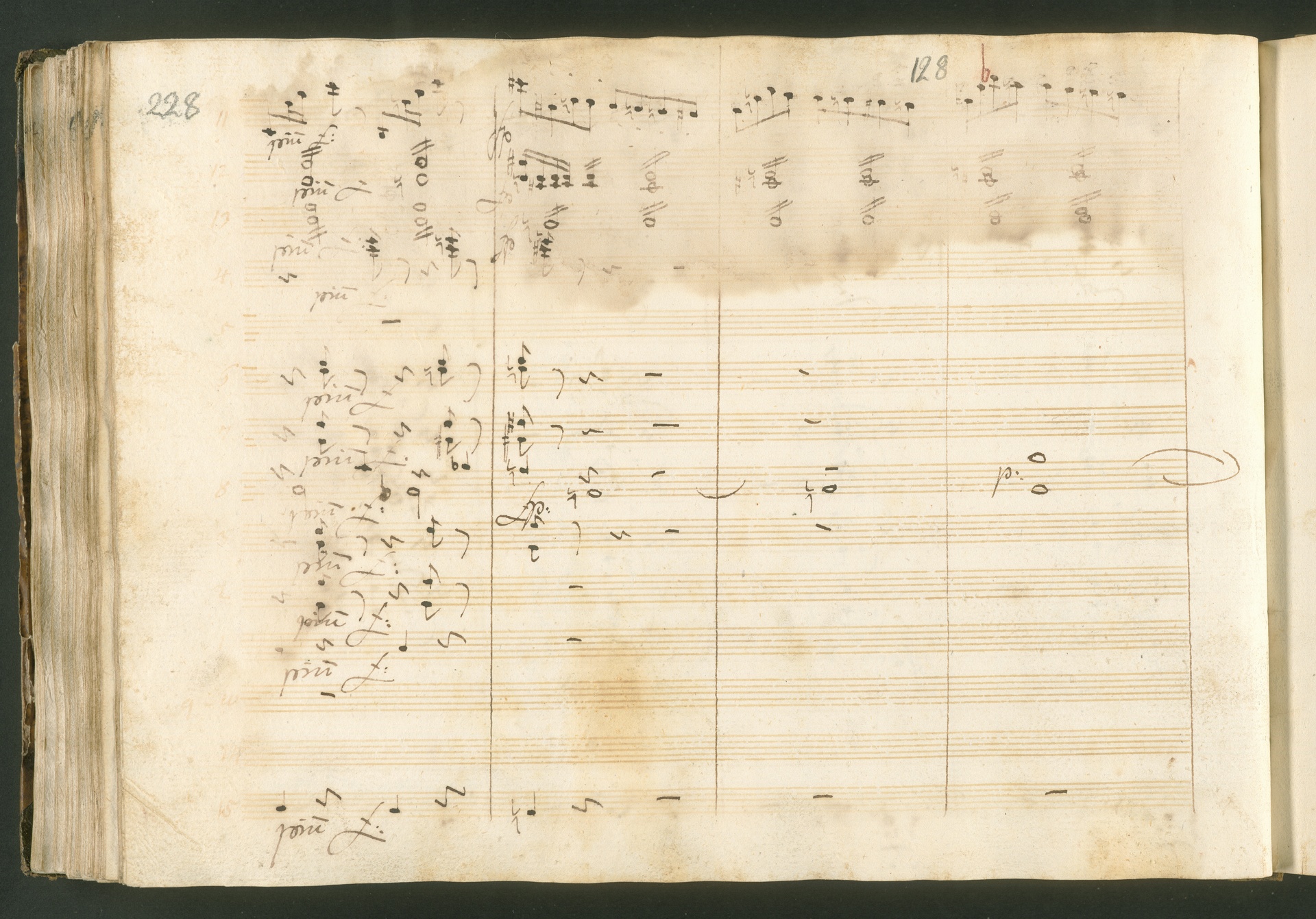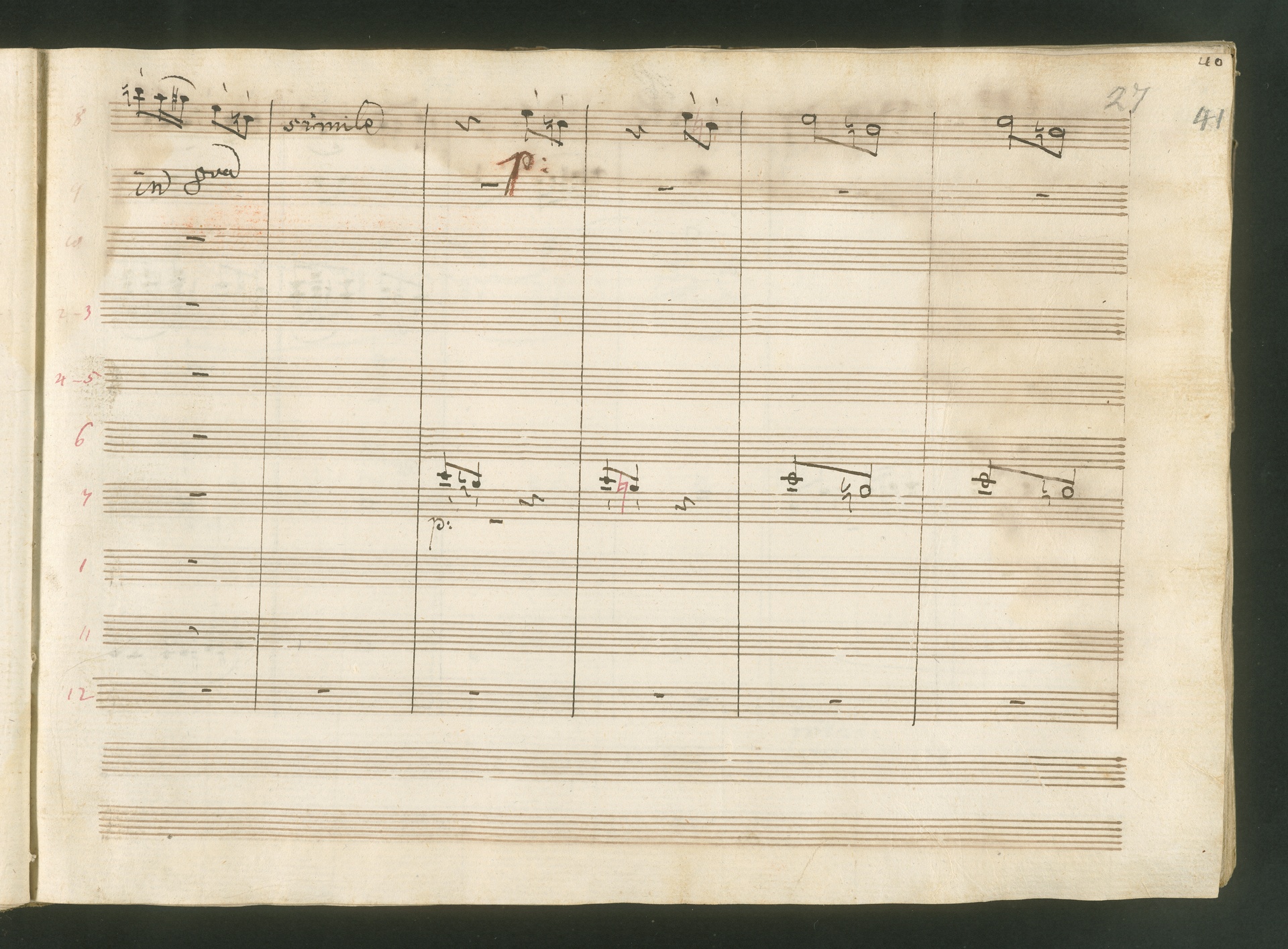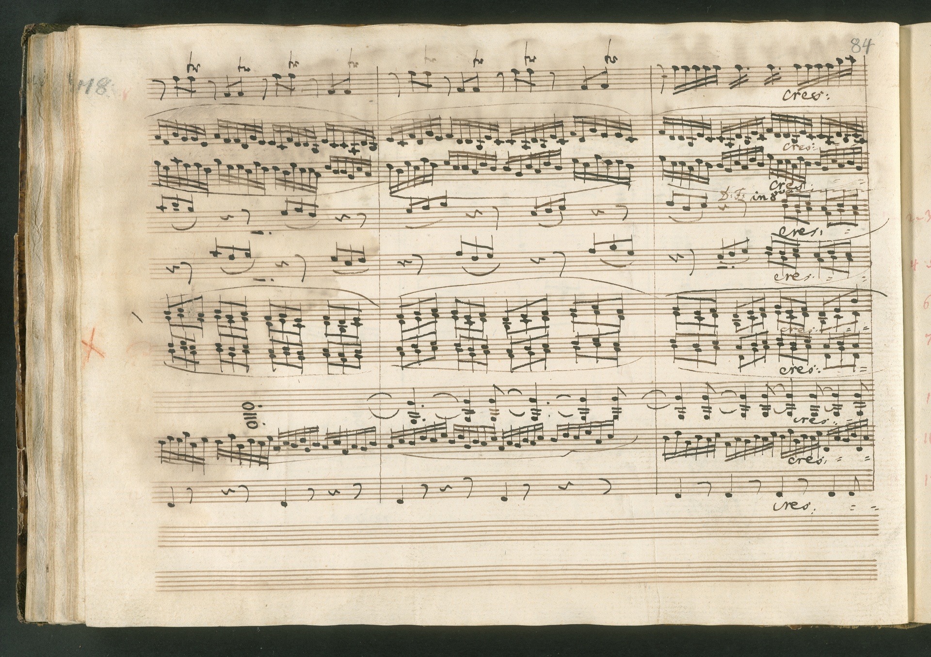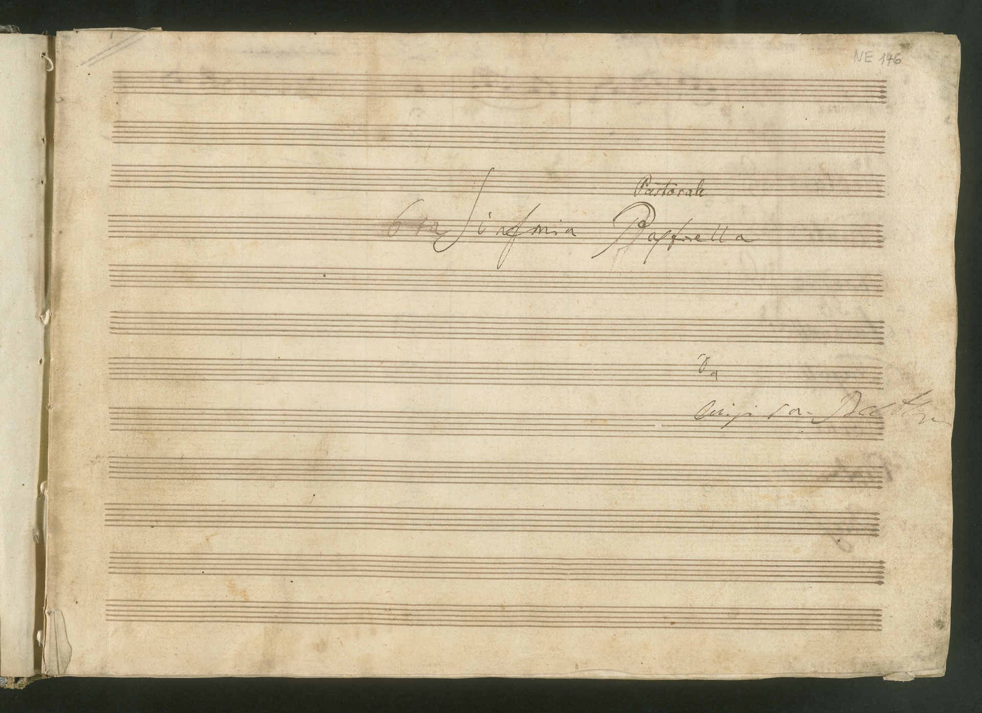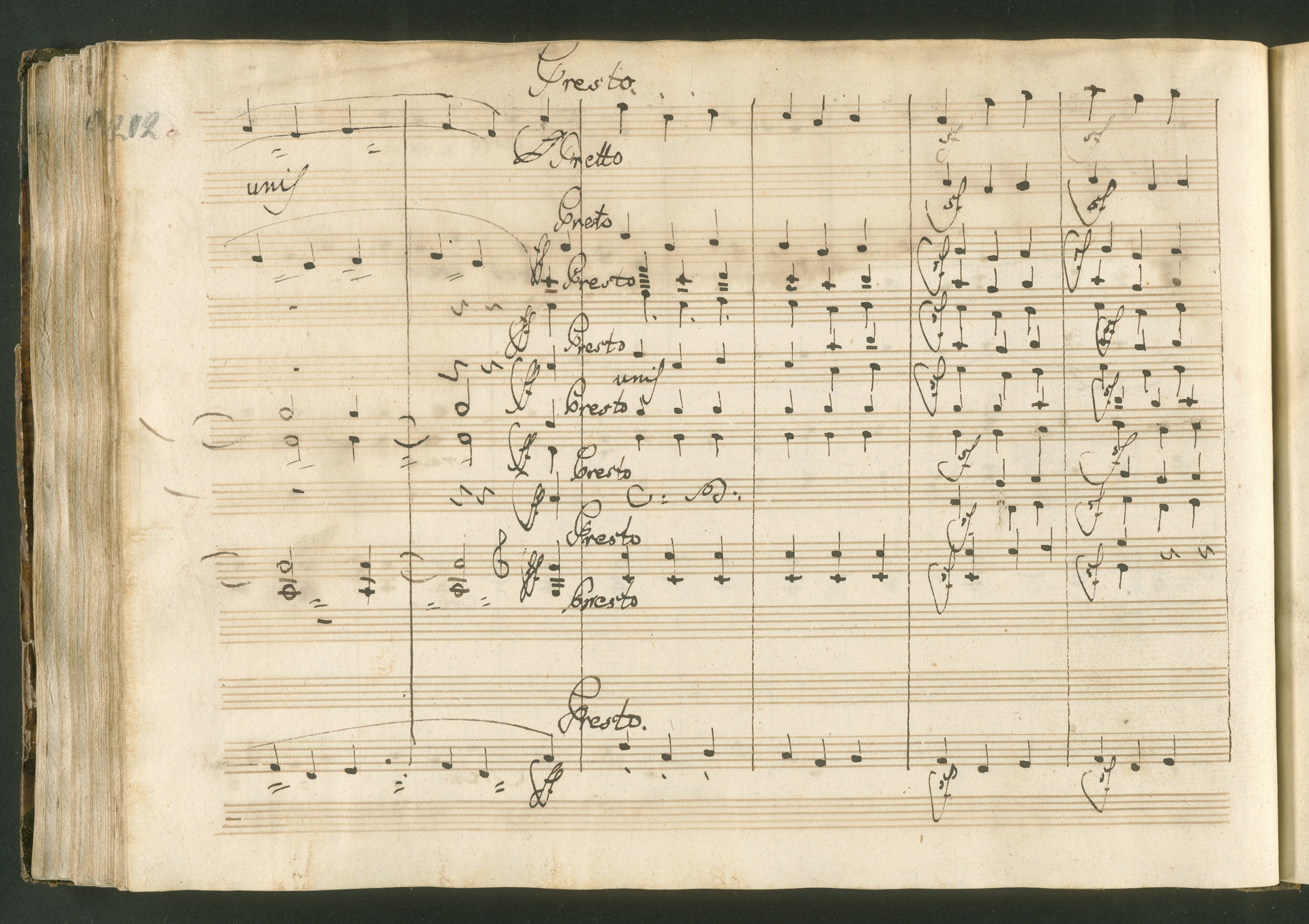The manuscript shown here is a corrected copy of the Sixth Symphony, the "Pastoral". Beethoven sold the publisher Gottfried Christoph Härtel his Fifth and Sixth Symphonies (op. 67 und 68) in September 1808 on his visit to Vienna. The surviving correspondence shows that Beethoven did not give Härtel autograph scores but corrected copies as engraver's models for the original edition