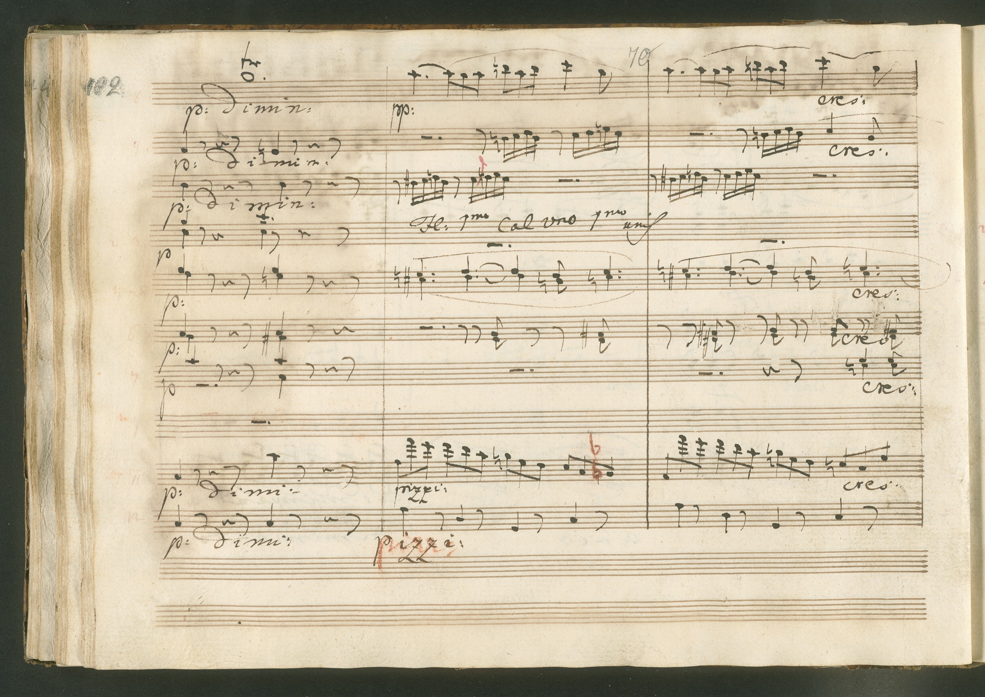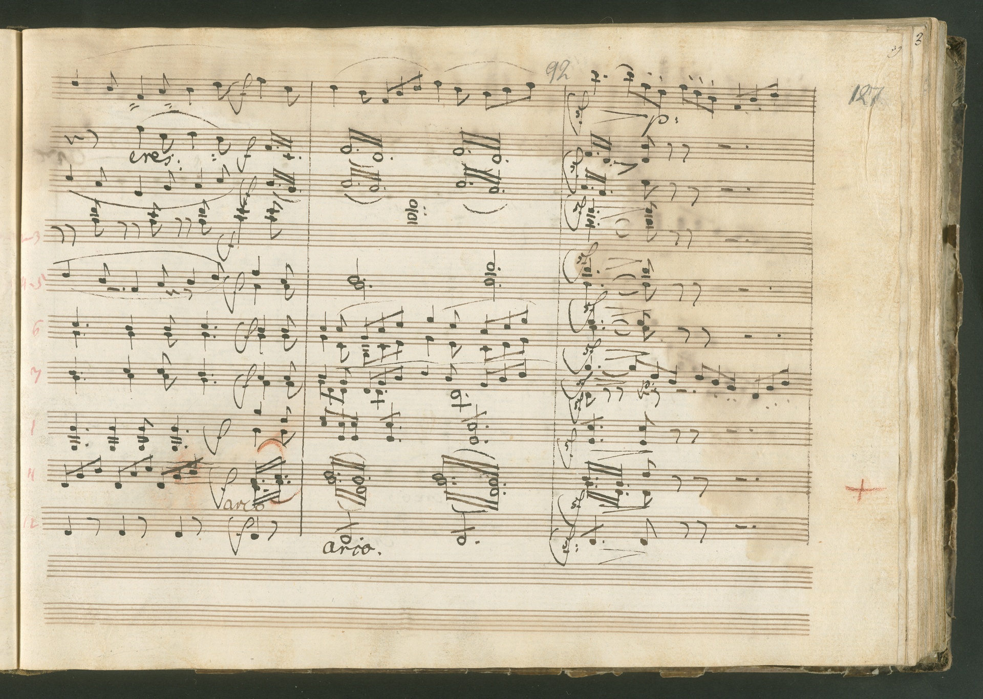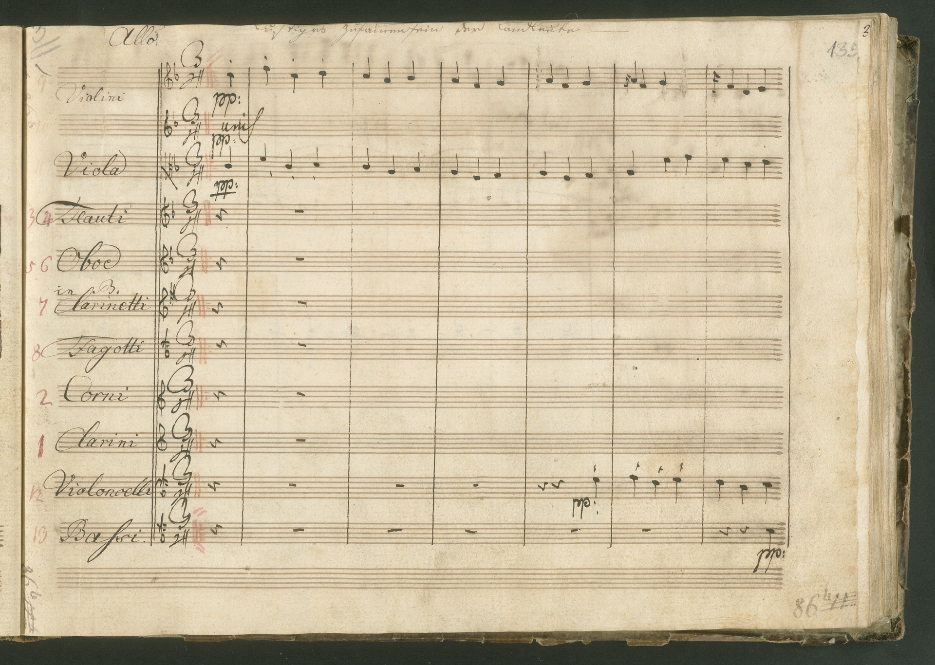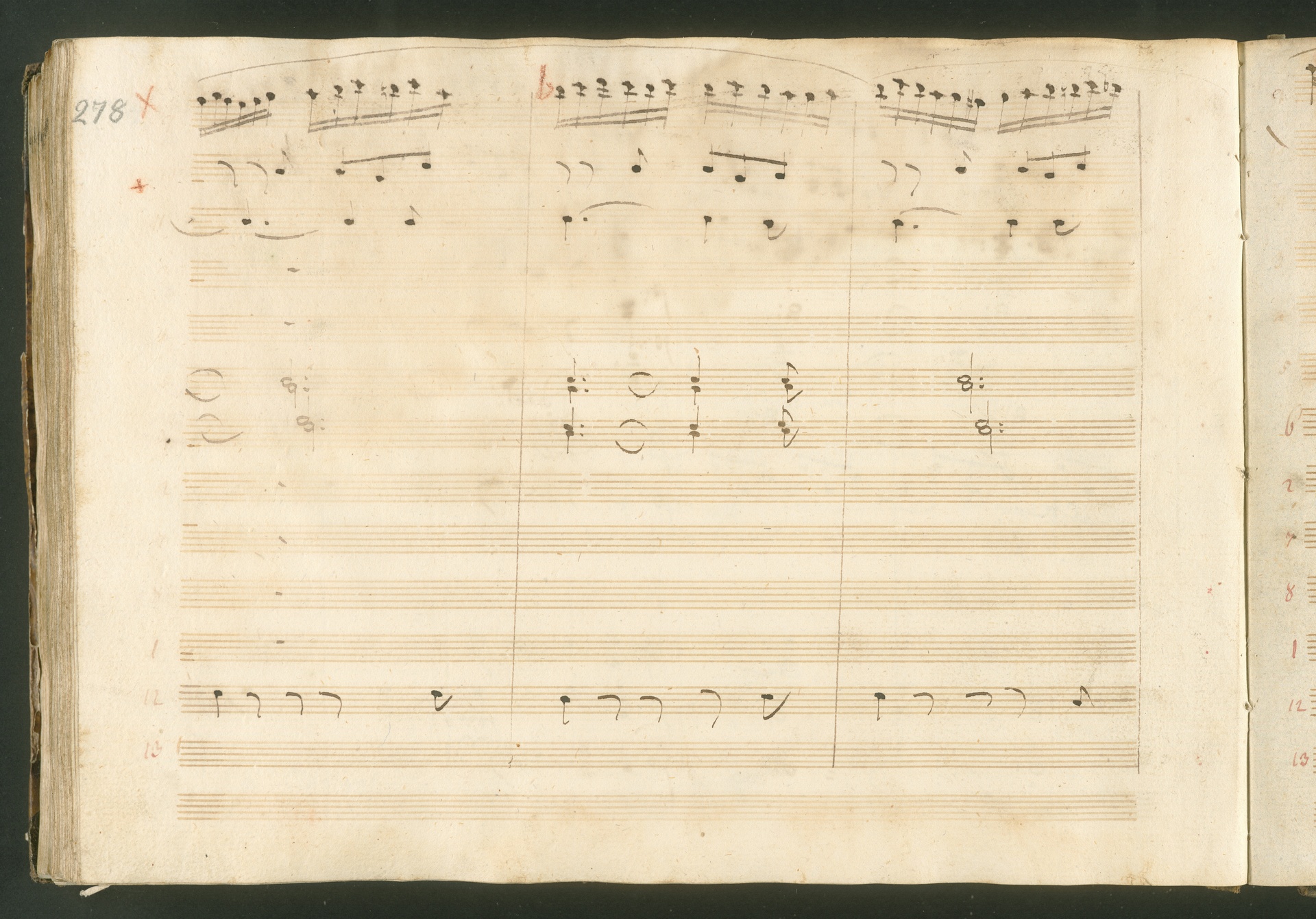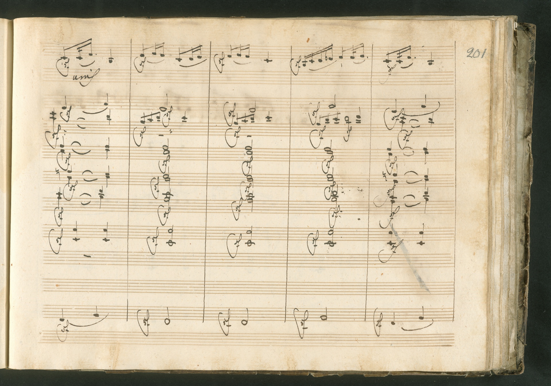 The manuscript shown here is a corrected copy of the Sixth Symphony, the "Pastoral". Beethoven sold the publisher Gottfried Christoph Härtel his Fifth and Sixth Symphonies (op. 67 und 68) in September 1808 on his visit to Vienna. The surviving correspondence shows that Beethoven did not give Härtel autograph scores but corrected copies as engraver's models for the original edition