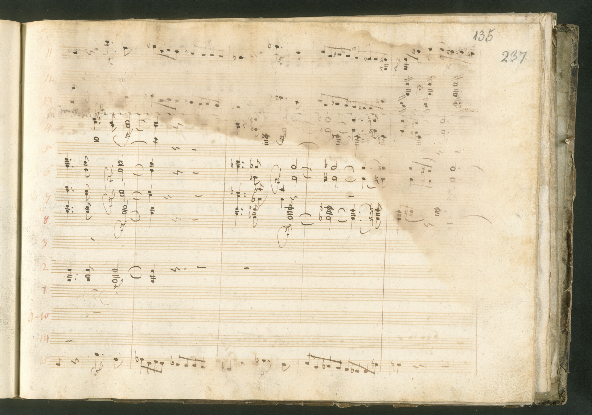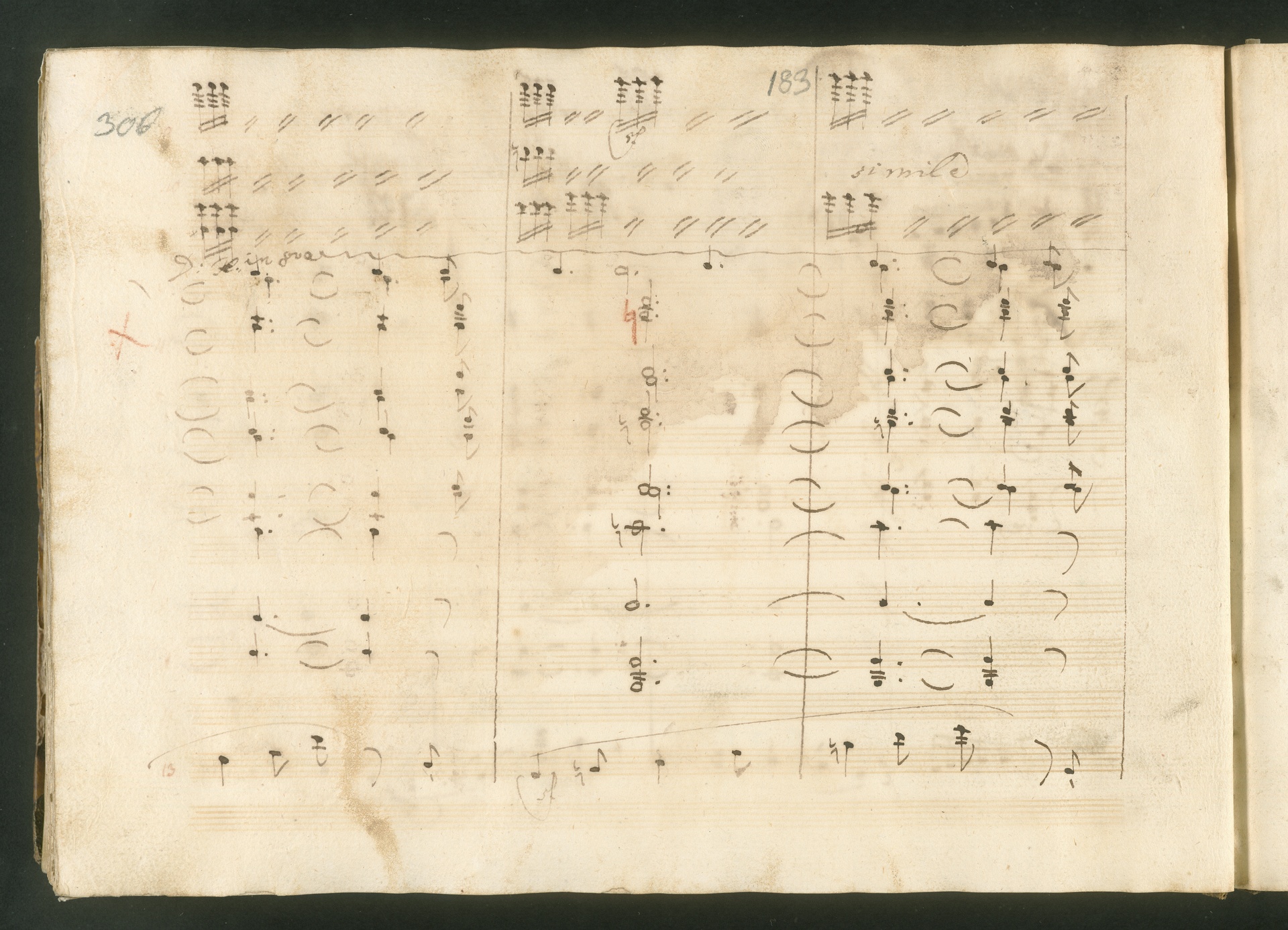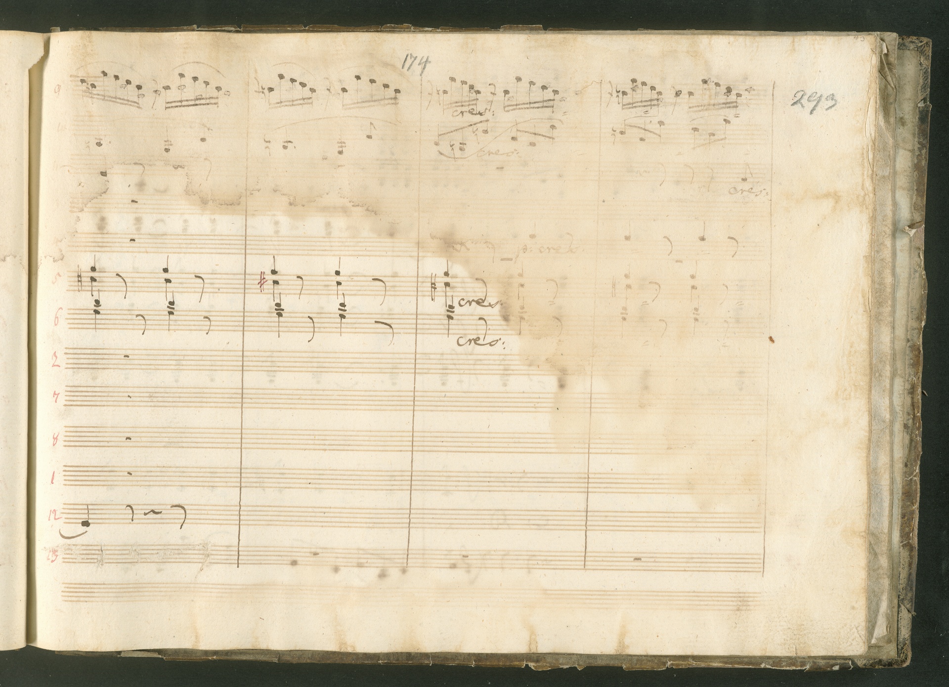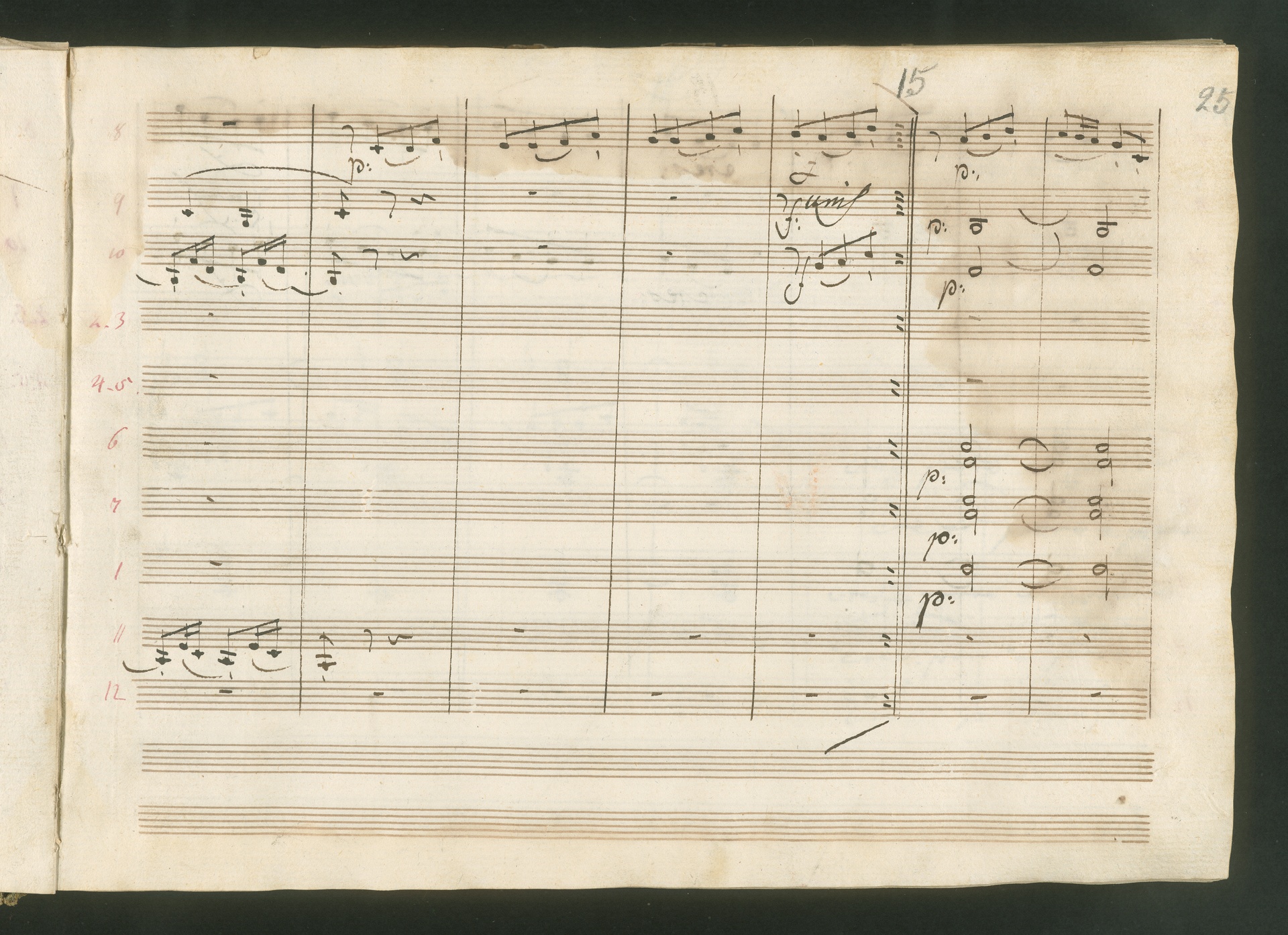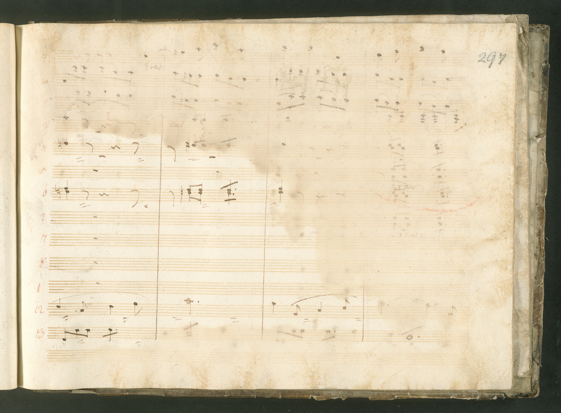 This copy of the score of the Sixth Symphony was removed from Breitkopf & Härtel's archives in the 1830s and was considered lost for a very long time. Even in the 1970s its whereabouts was still unknown. The copy only re-emerged in the 1980s and was acquired by the Beethoven-Haus. With its many corrections, which Beethoven made in a reddish-brown crayon and which the copyist partially went over in ink, it is a valuable document for research. Sadly the manuscript is in a very bad condition having been badly damaged by water; many pages in the last two movements are completely washed out and hardly legible anymore. (J.R.)