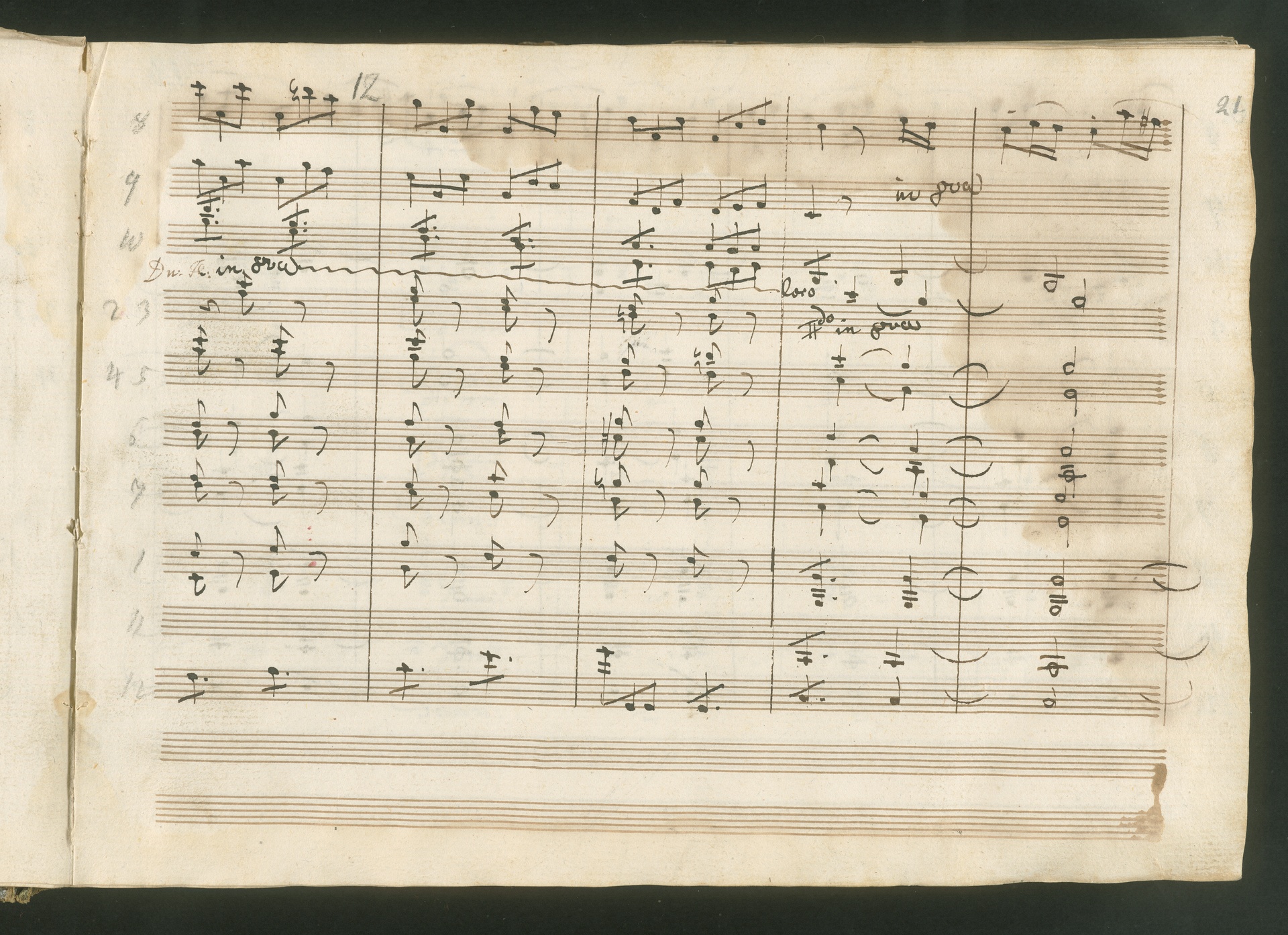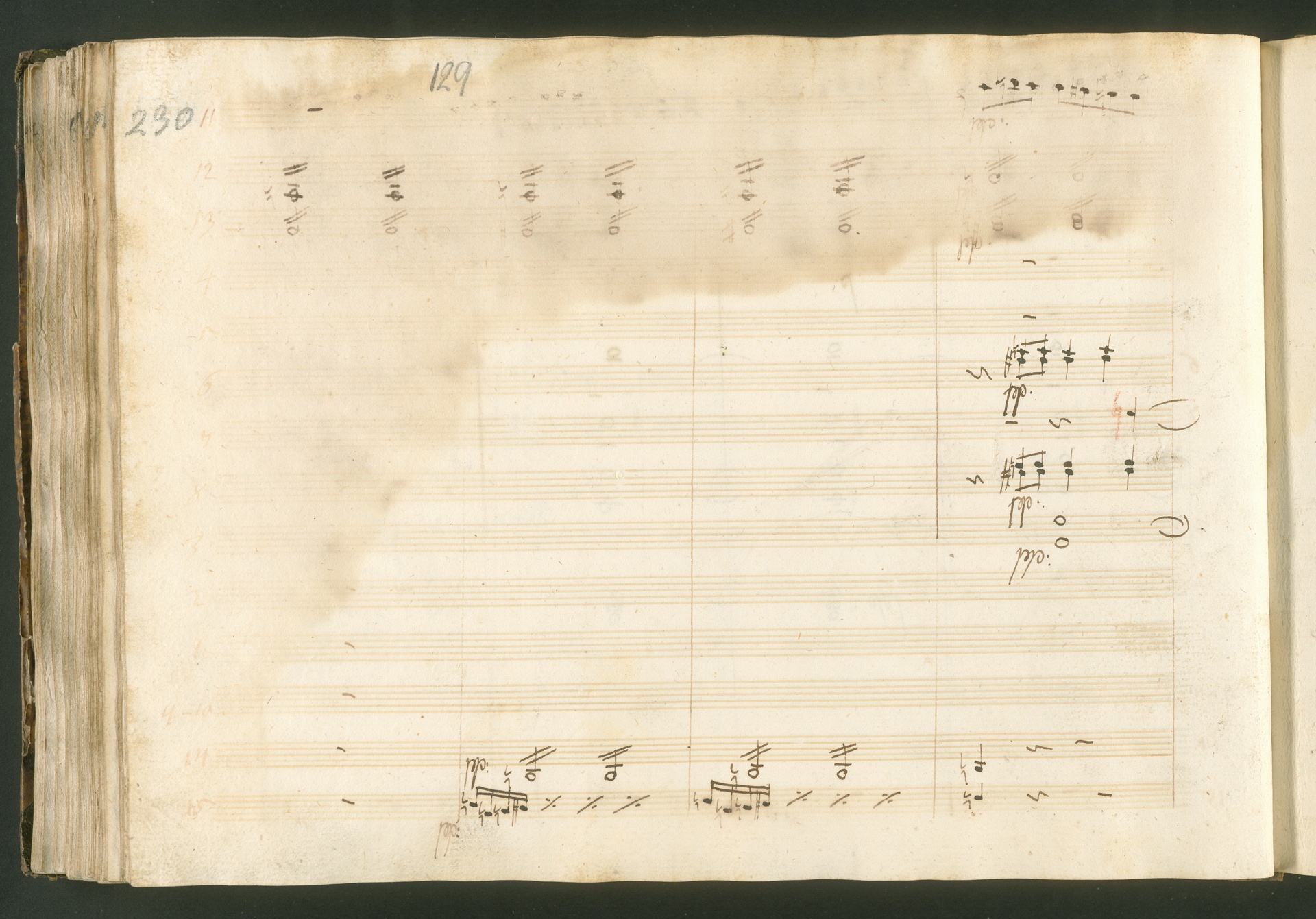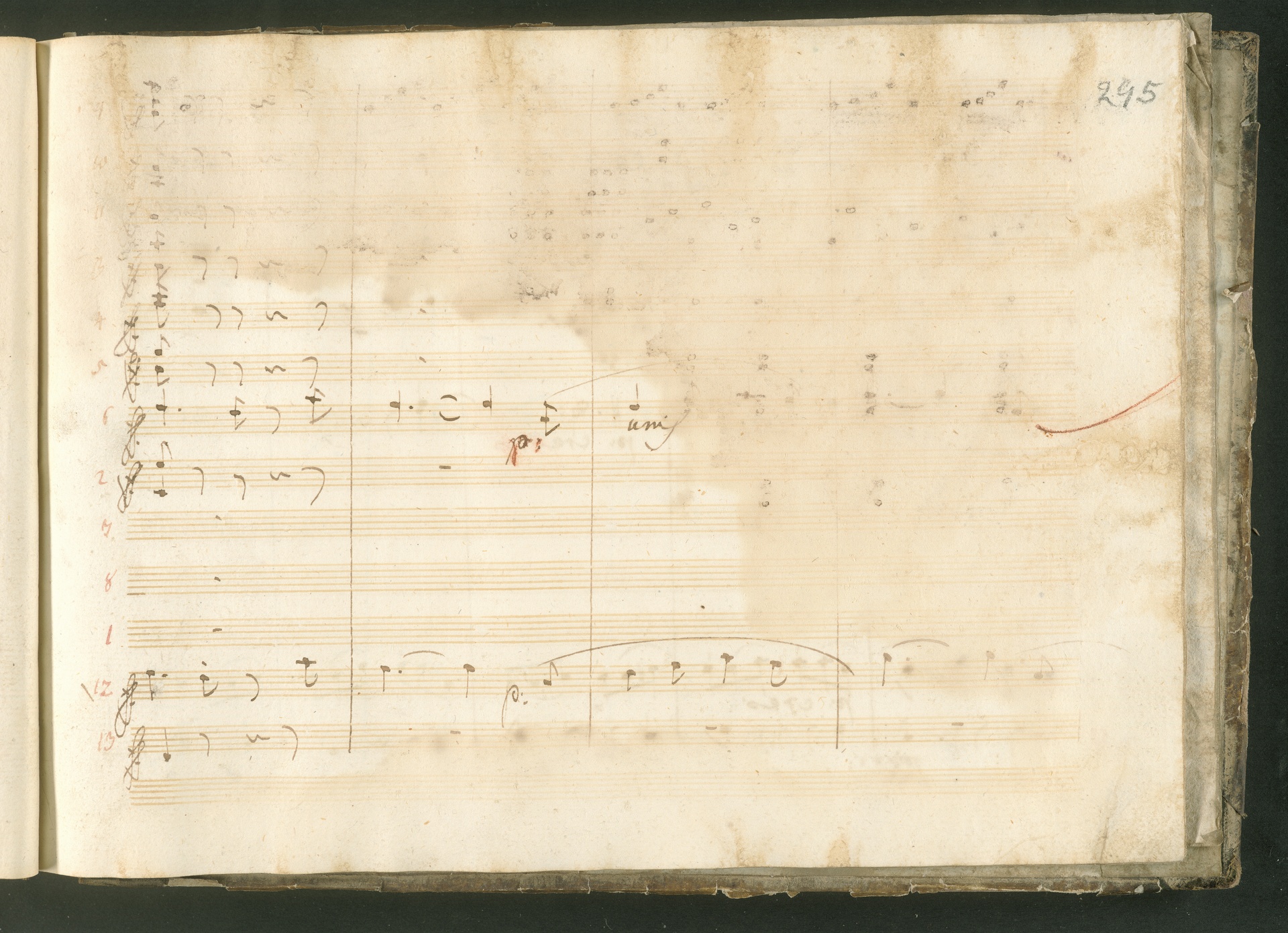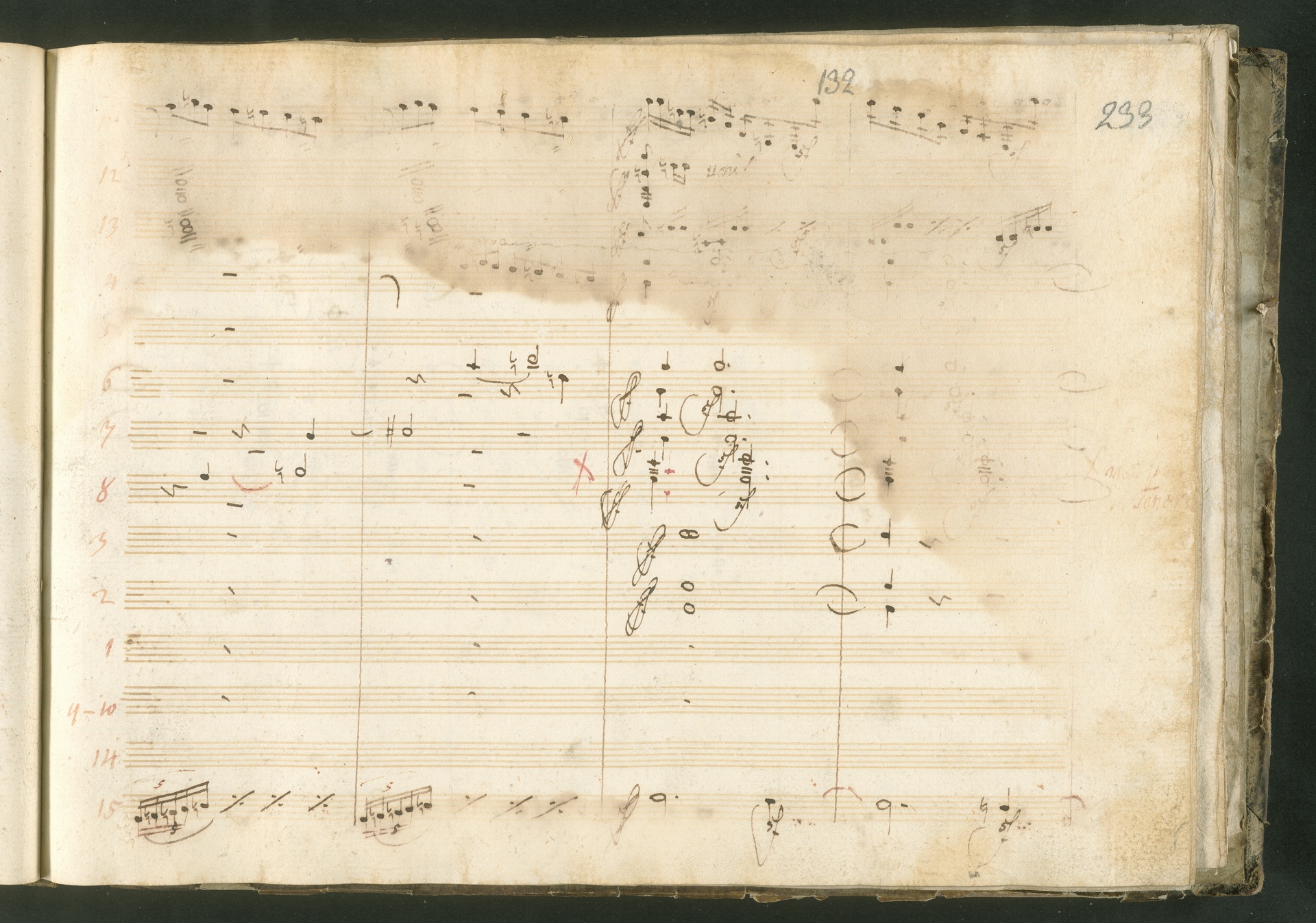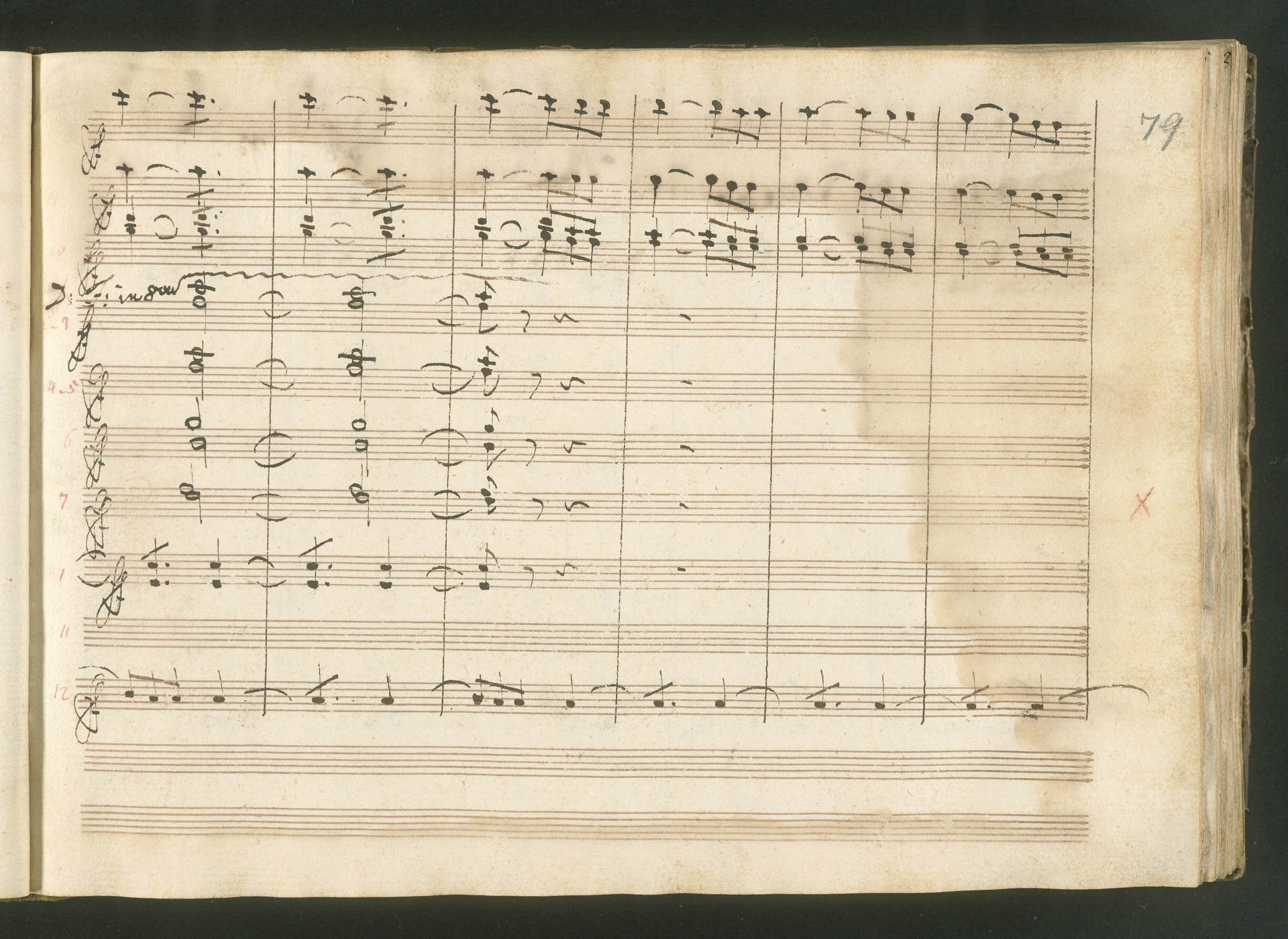 This copy of the score of the Sixth Symphony was removed from Breitkopf & Härtel's archives in the 1830s and was considered lost for a very long time. Even in the 1970s its whereabouts was still unknown. The copy only re-emerged in the 1980s and was acquired by the Beethoven-Haus. With its many corrections, which Beethoven made in a reddish-brown crayon and which the copyist partially went over in ink, it is a valuable document for research. Sadly the manuscript is in a very bad condition having been badly damaged by water; many pages in the last two movements are completely washed out and hardly legible anymore. (J.R.)