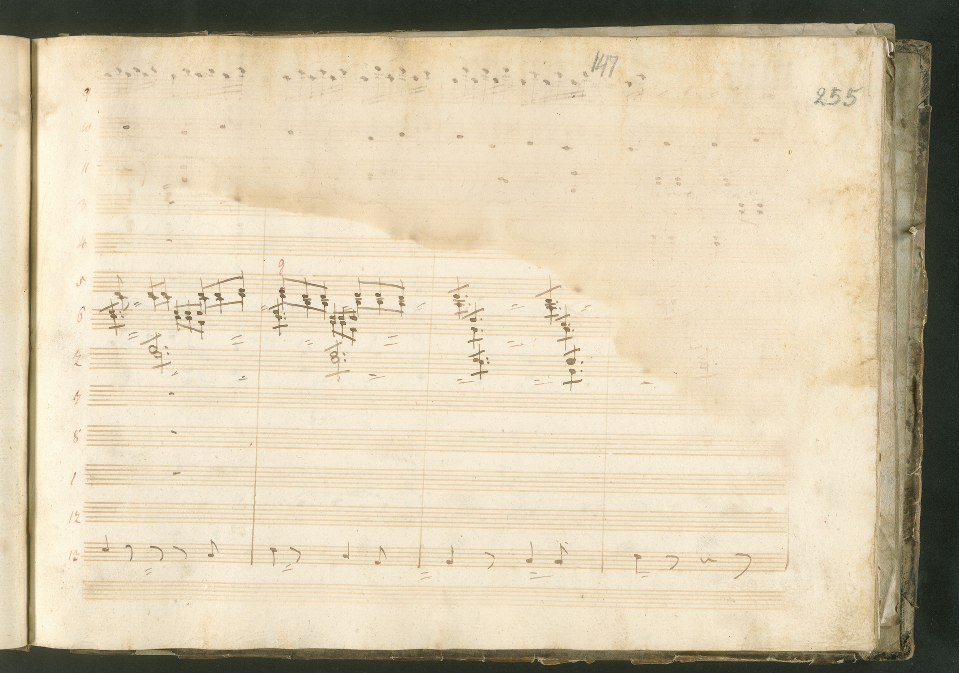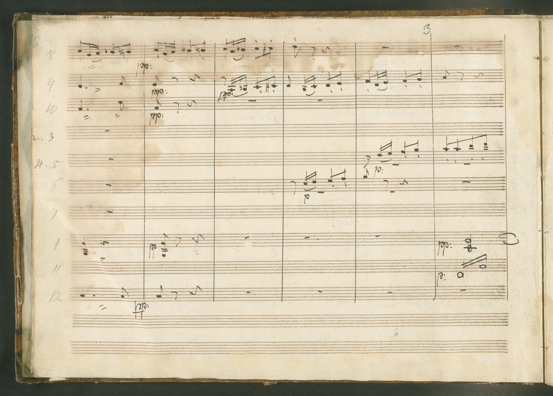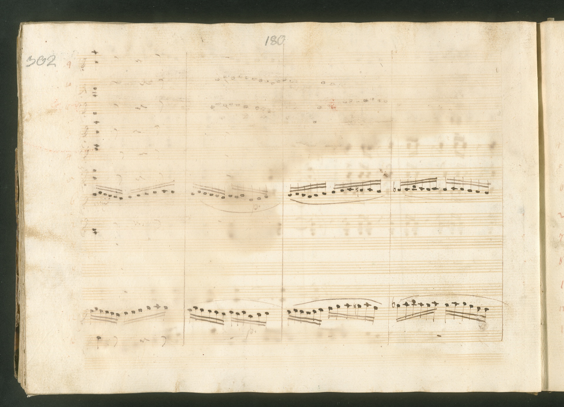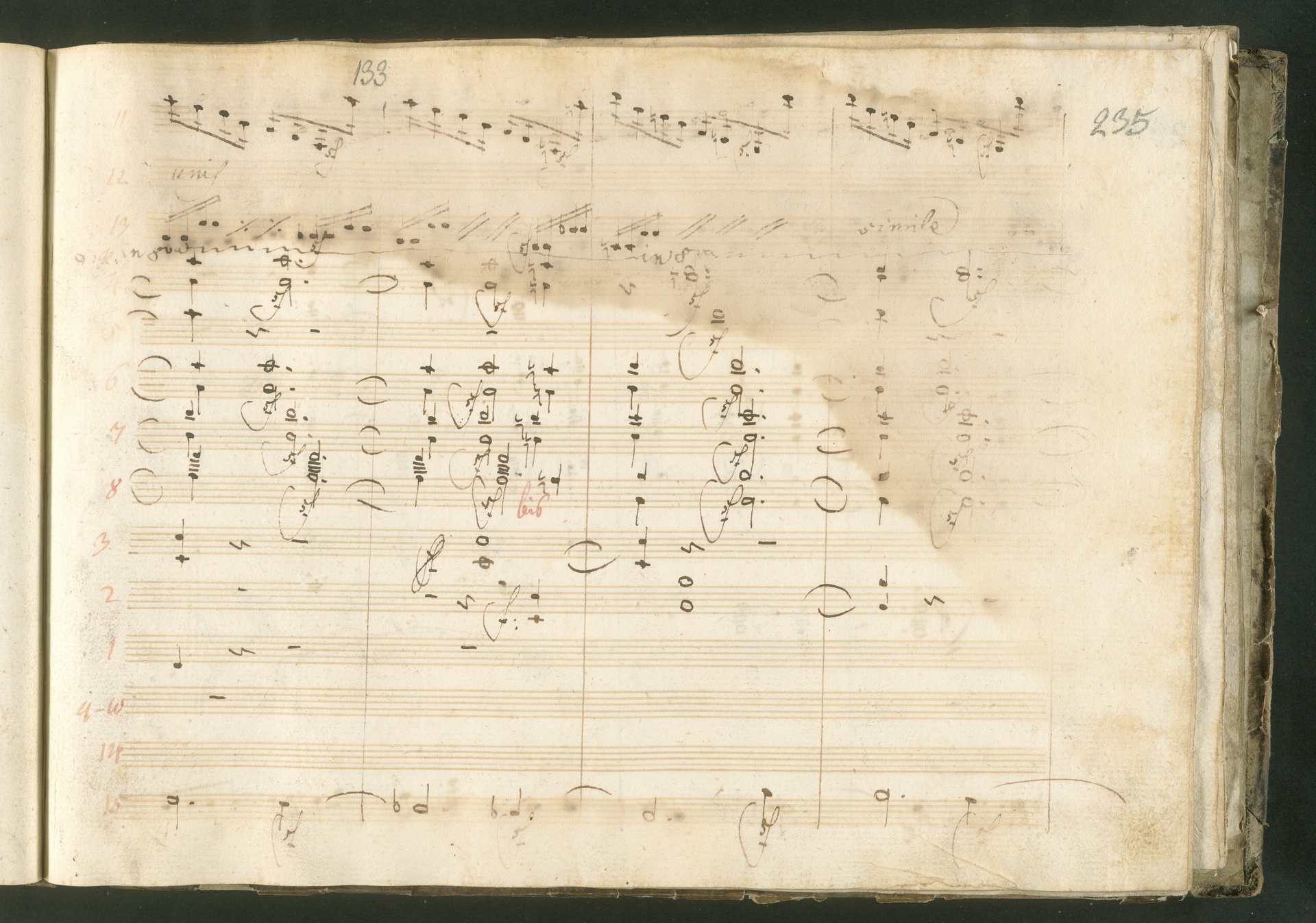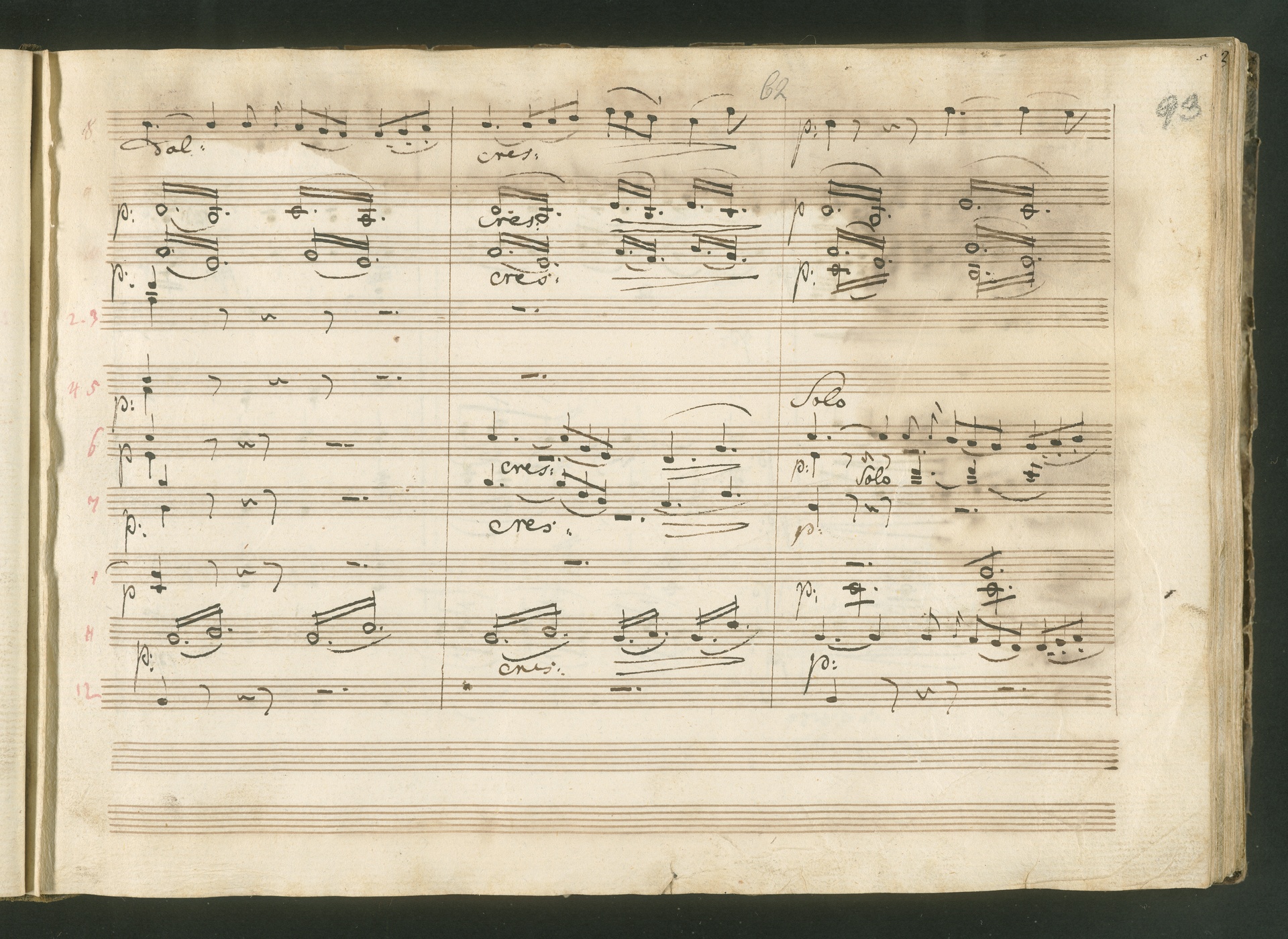 This copy of the score of the Sixth Symphony was removed from Breitkopf & Härtel's archives in the 1830s and was considered lost for a very long time. Even in the 1970s its whereabouts was still unknown. The copy only re-emerged in the 1980s and was acquired by the Beethoven-Haus. With its many corrections, which Beethoven made in a reddish-brown crayon and which the copyist partially went over in ink, it is a valuable document for research. Sadly the manuscript is in a very bad condition having been badly damaged by water; many pages in the last two movements are completely washed out and hardly legible anymore. (J.R.)