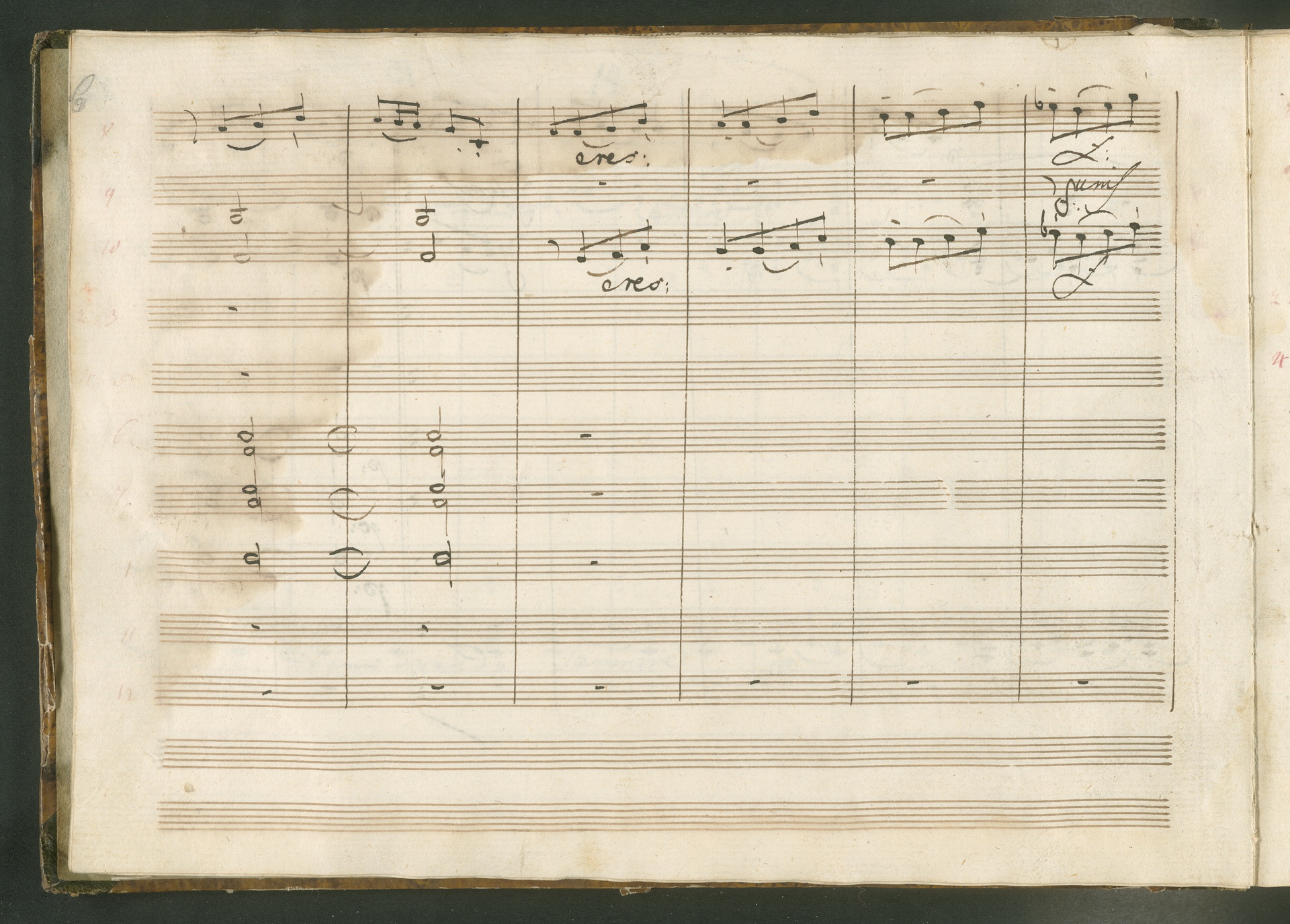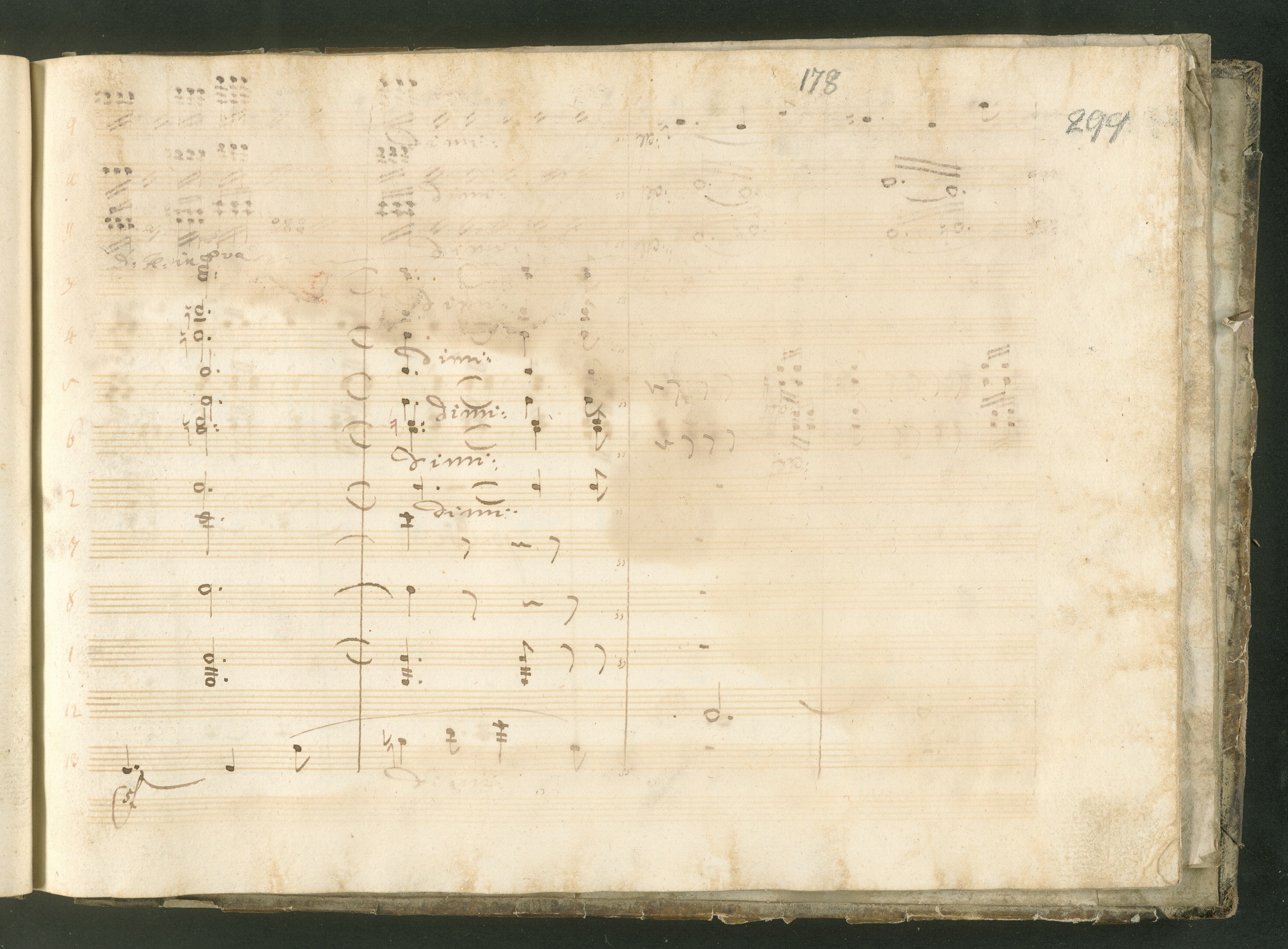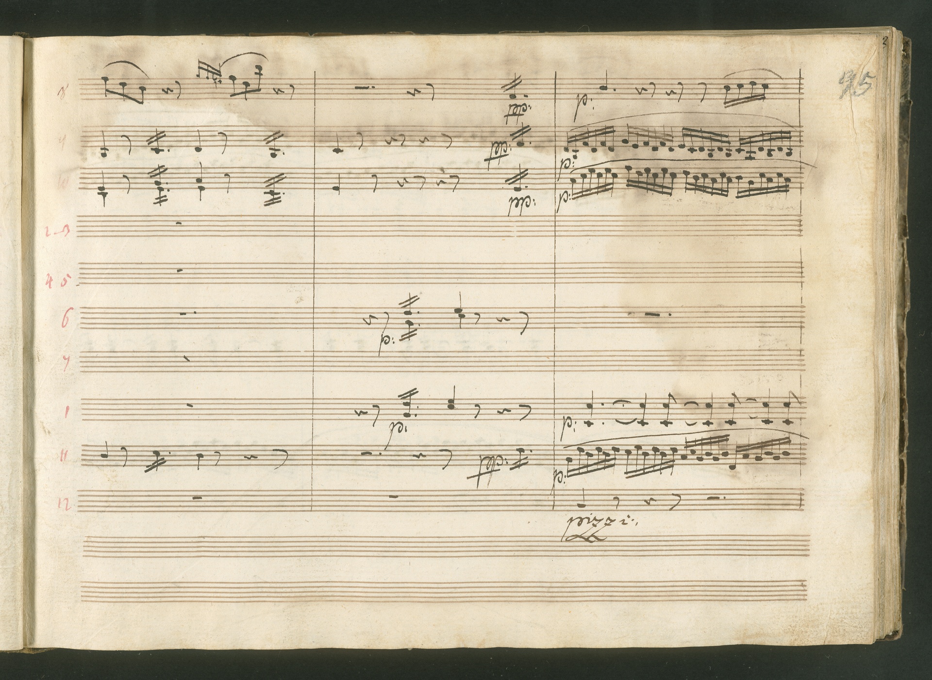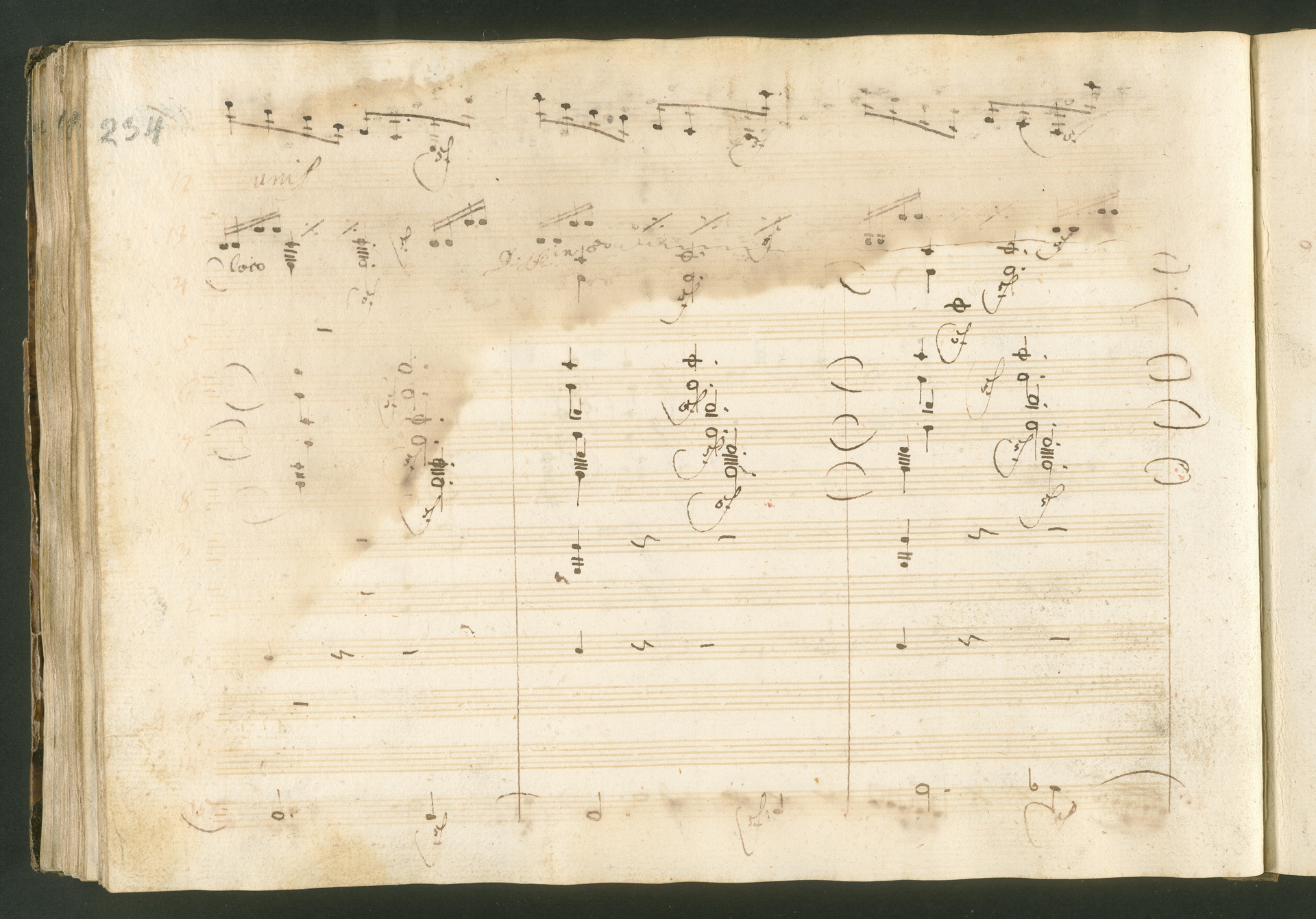 This copy of the score of the Sixth Symphony was removed from Breitkopf & Härtel's archives in the 1830s and was considered lost for a very long time. Even in the 1970s its whereabouts was still unknown. The copy only re-emerged in the 1980s and was acquired by the Beethoven-Haus. With its many corrections, which Beethoven made in a reddish-brown crayon and which the copyist partially went over in ink, it is a valuable document for research. Sadly the manuscript is in a very bad condition having been badly damaged by water; many pages in the last two movements are completely washed out and hardly legible anymore. (J.R.)