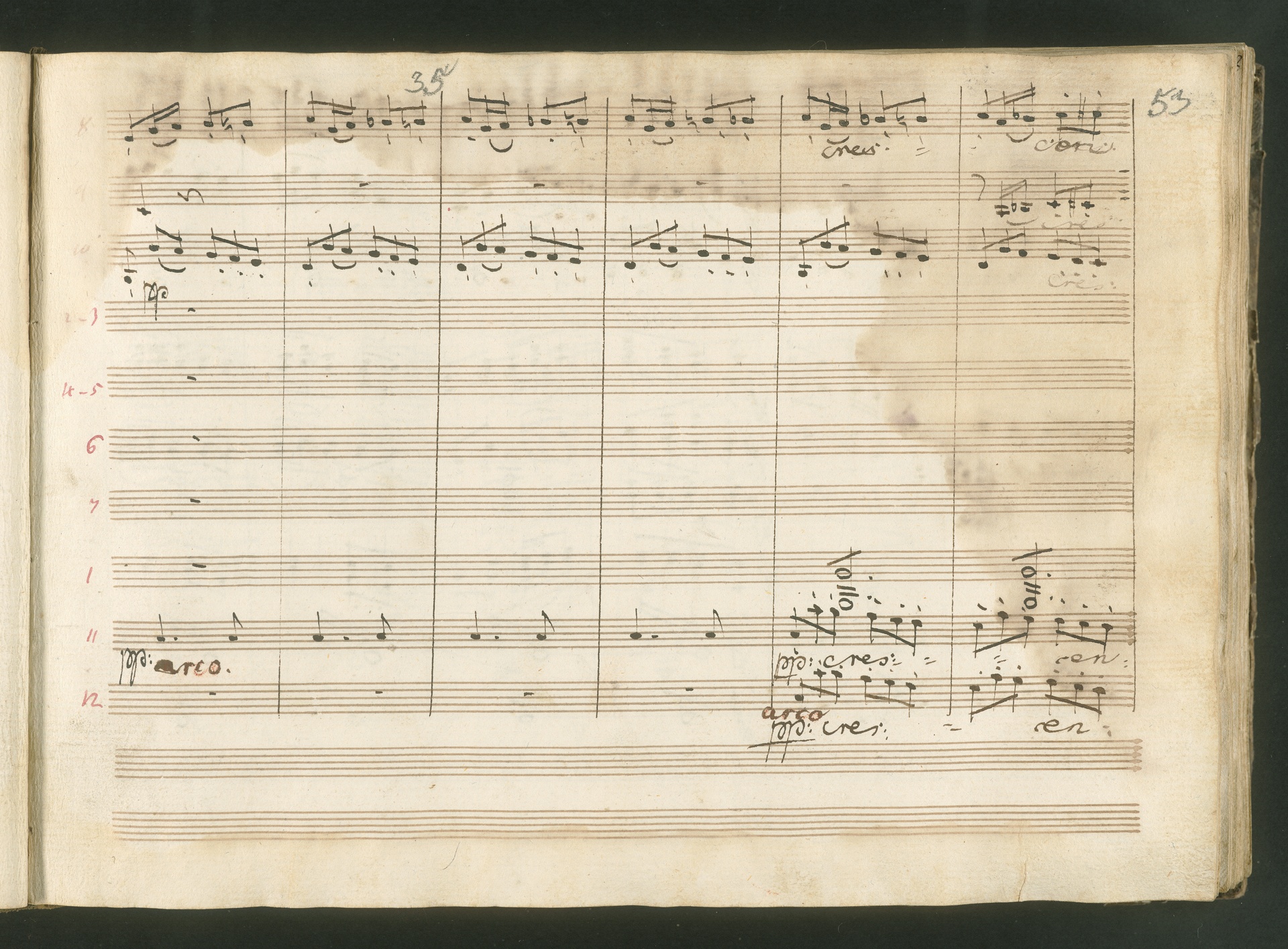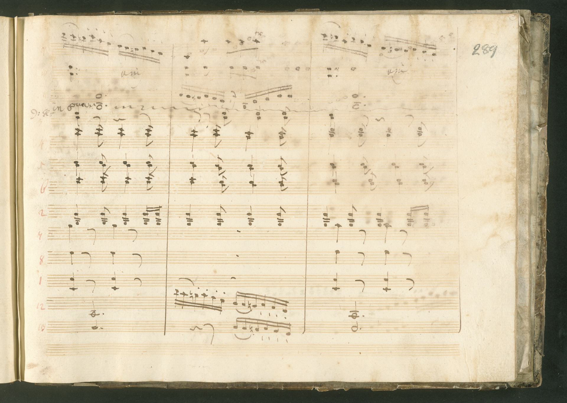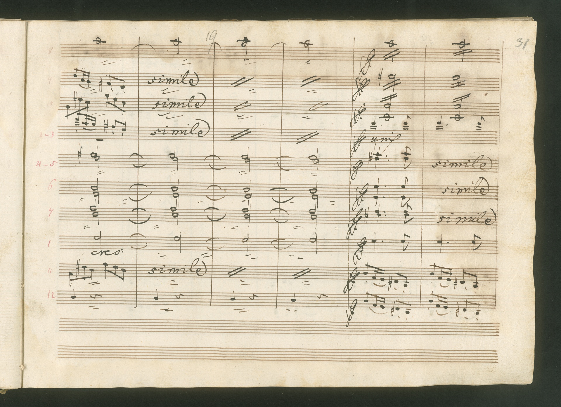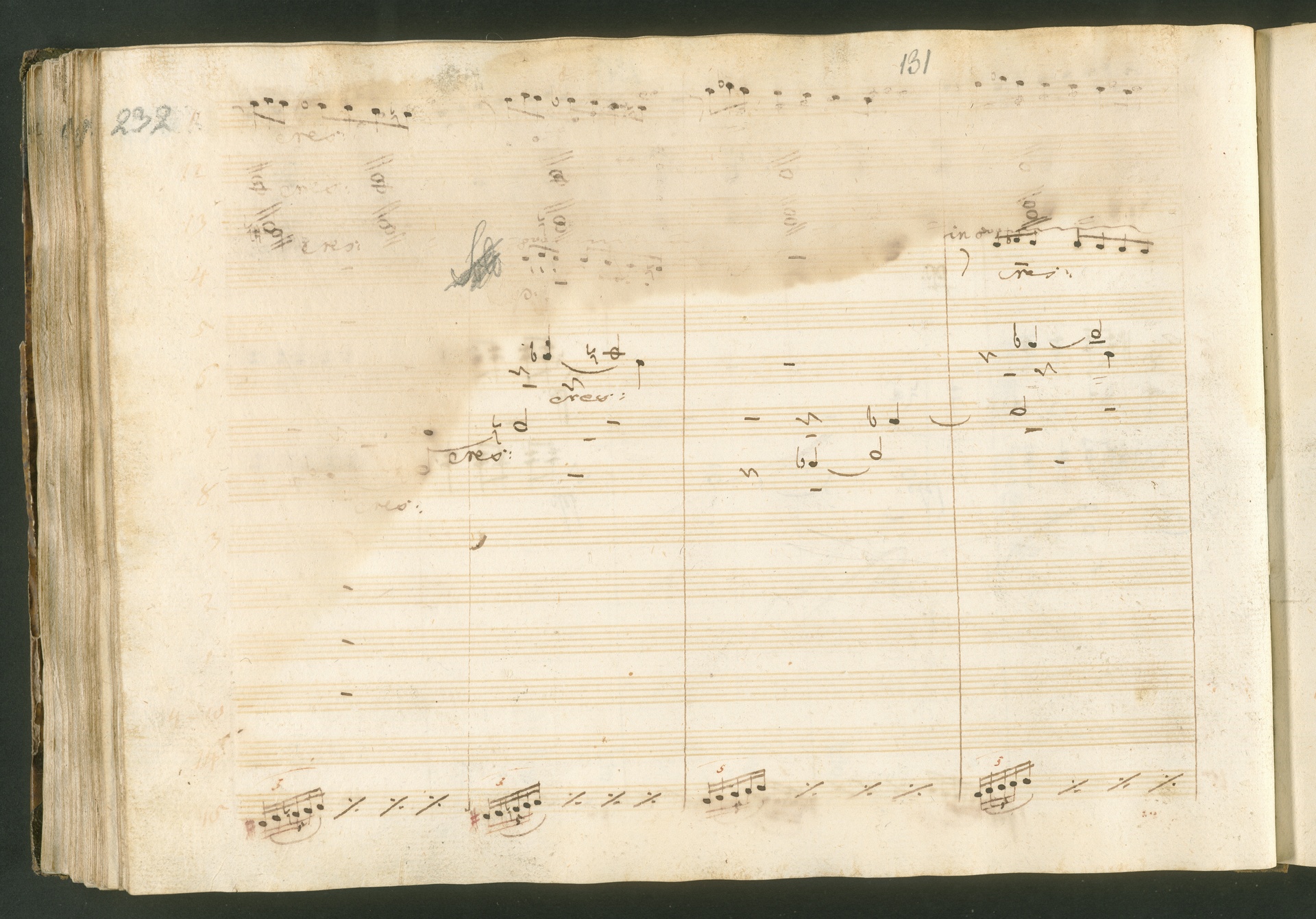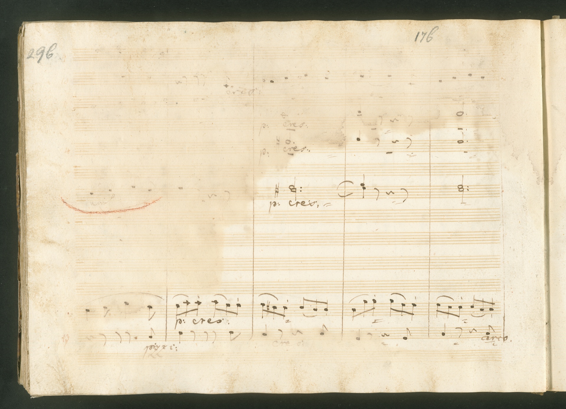 This copy of the score of the Sixth Symphony was removed from Breitkopf & Härtel's archives in the 1830s and was considered lost for a very long time. Even in the 1970s its whereabouts was still unknown. The copy only re-emerged in the 1980s and was acquired by the Beethoven-Haus. With its many corrections, which Beethoven made in a reddish-brown crayon and which the copyist partially went over in ink, it is a valuable document for research. Sadly the manuscript is in a very bad condition having been badly damaged by water; many pages in the last two movements are completely washed out and hardly legible anymore. (J.R.)