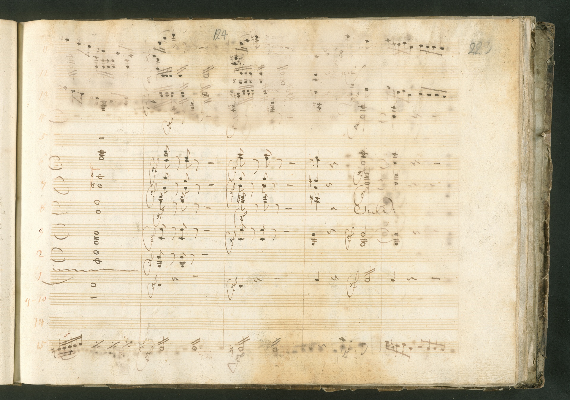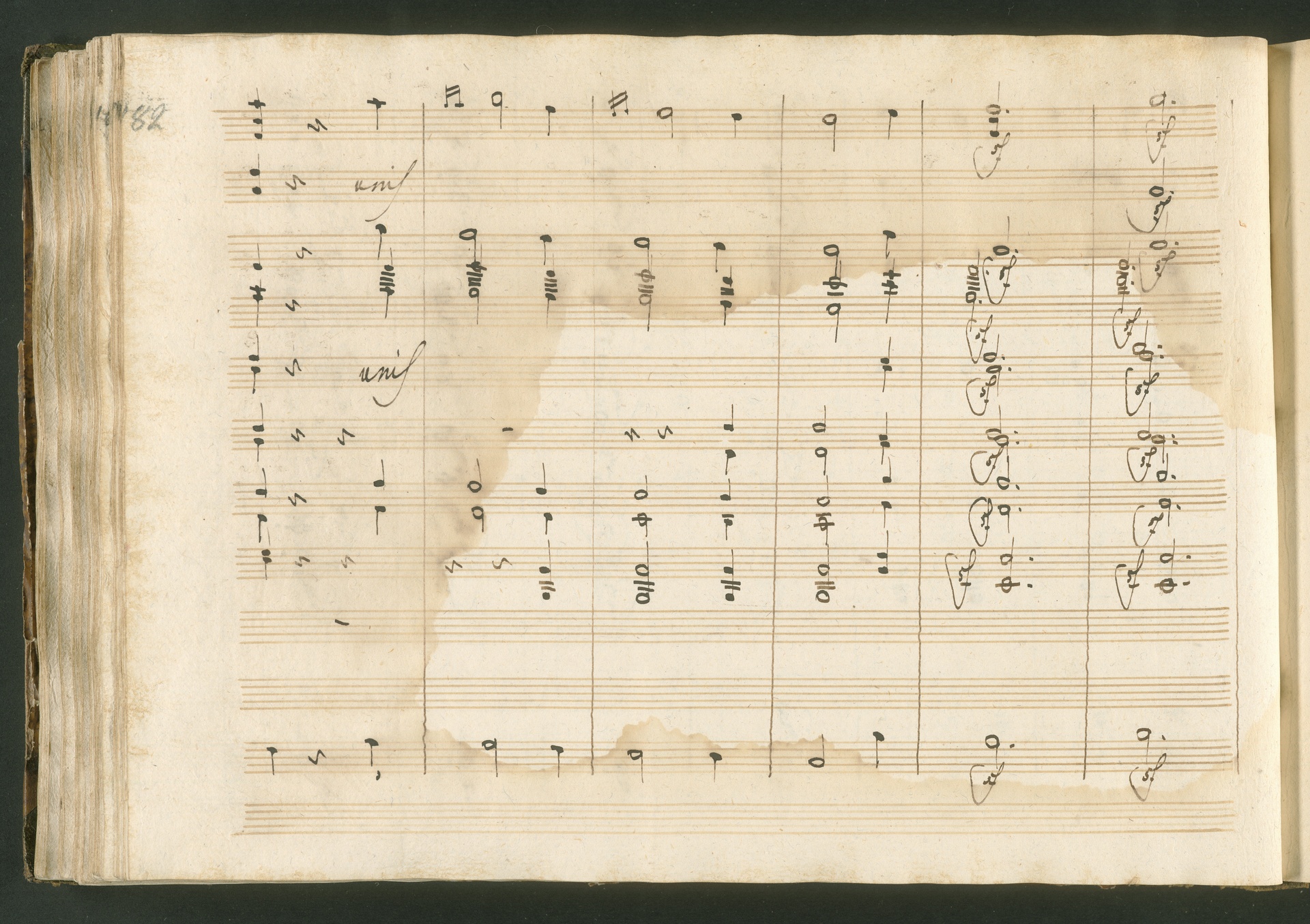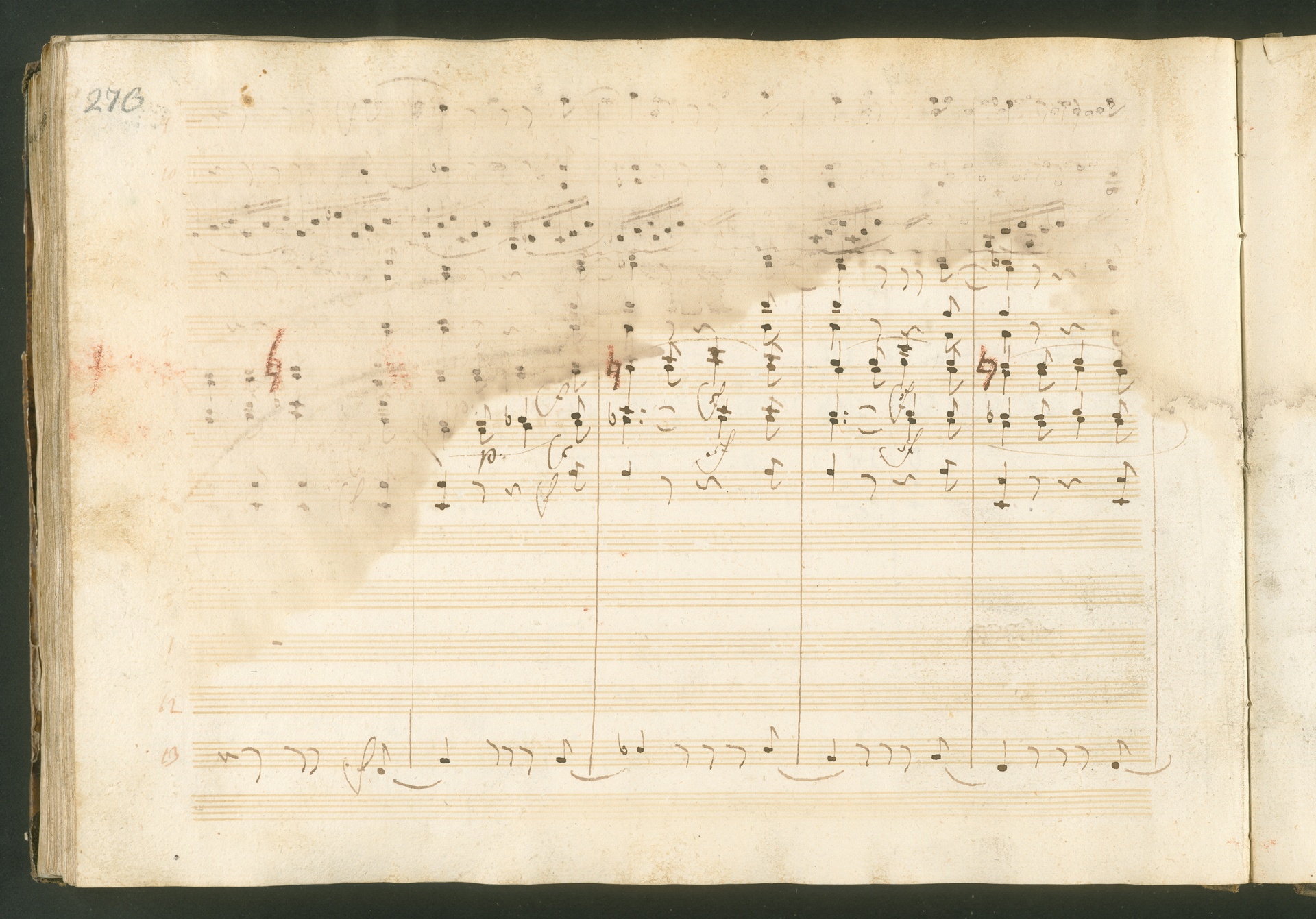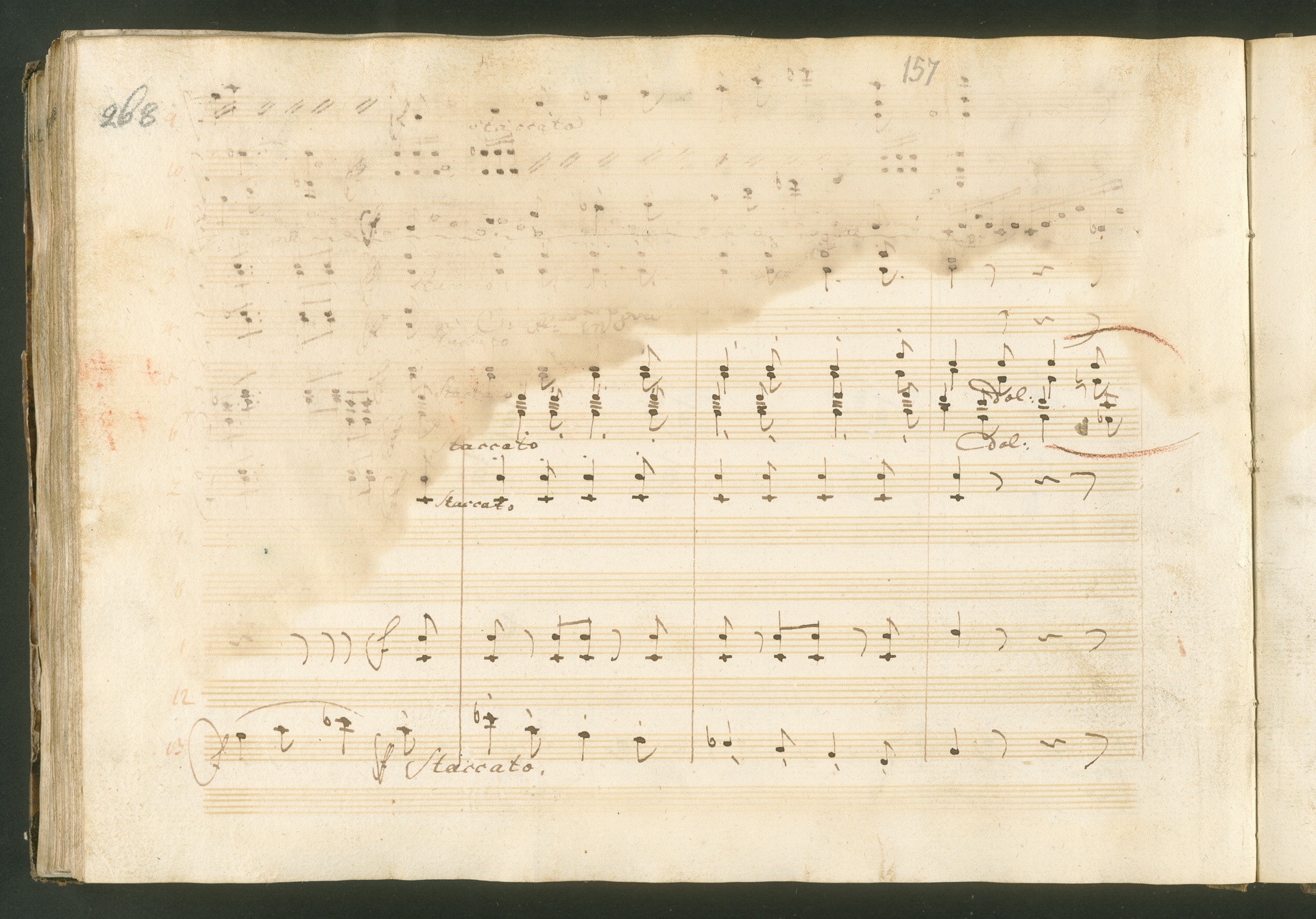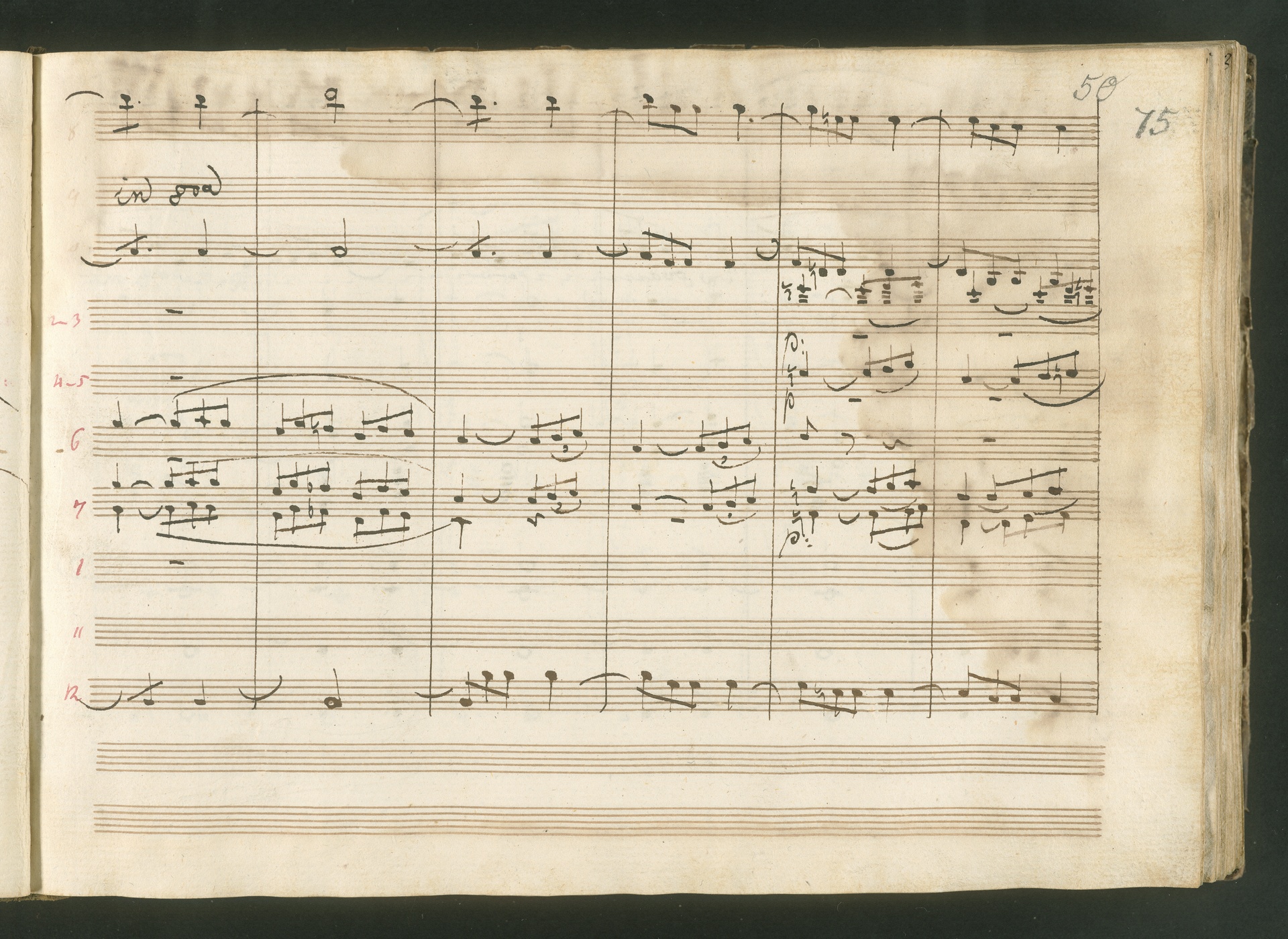This copy of the score of the Sixth Symphony was removed from Breitkopf & Härtel's archives in the 1830s and was considered lost for a very long time. Even in the 1970s its whereabouts was still unknown. The copy only re-emerged in the 1980s and was acquired by the Beethoven-Haus. With its many corrections, which Beethoven made in a reddish-brown crayon and which the copyist partially went over in ink, it is a valuable document for research. Sadly the manuscript is in a very bad condition having been badly damaged by water; many pages in the last two movements are completely washed out and hardly legible anymore. (J.R.)